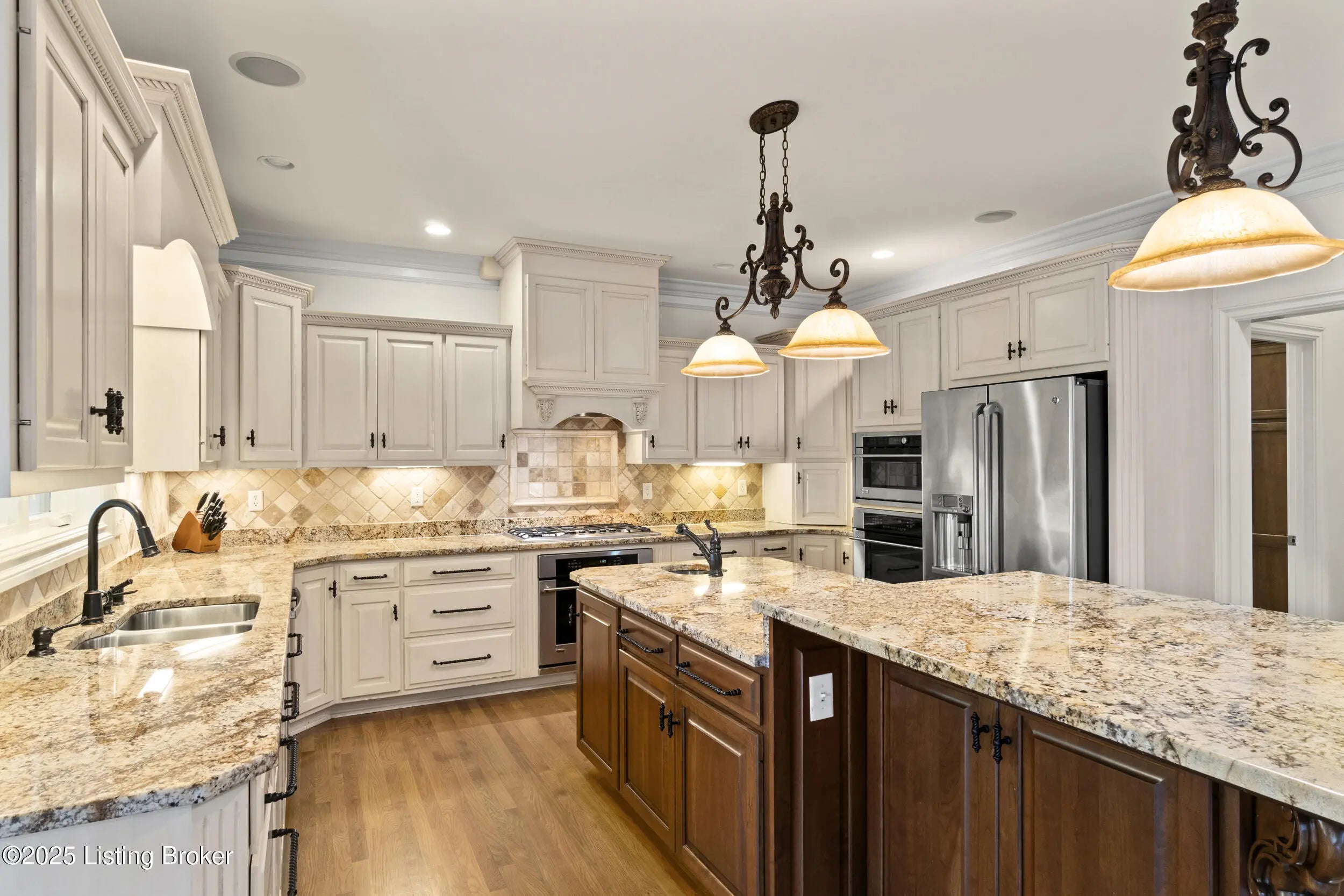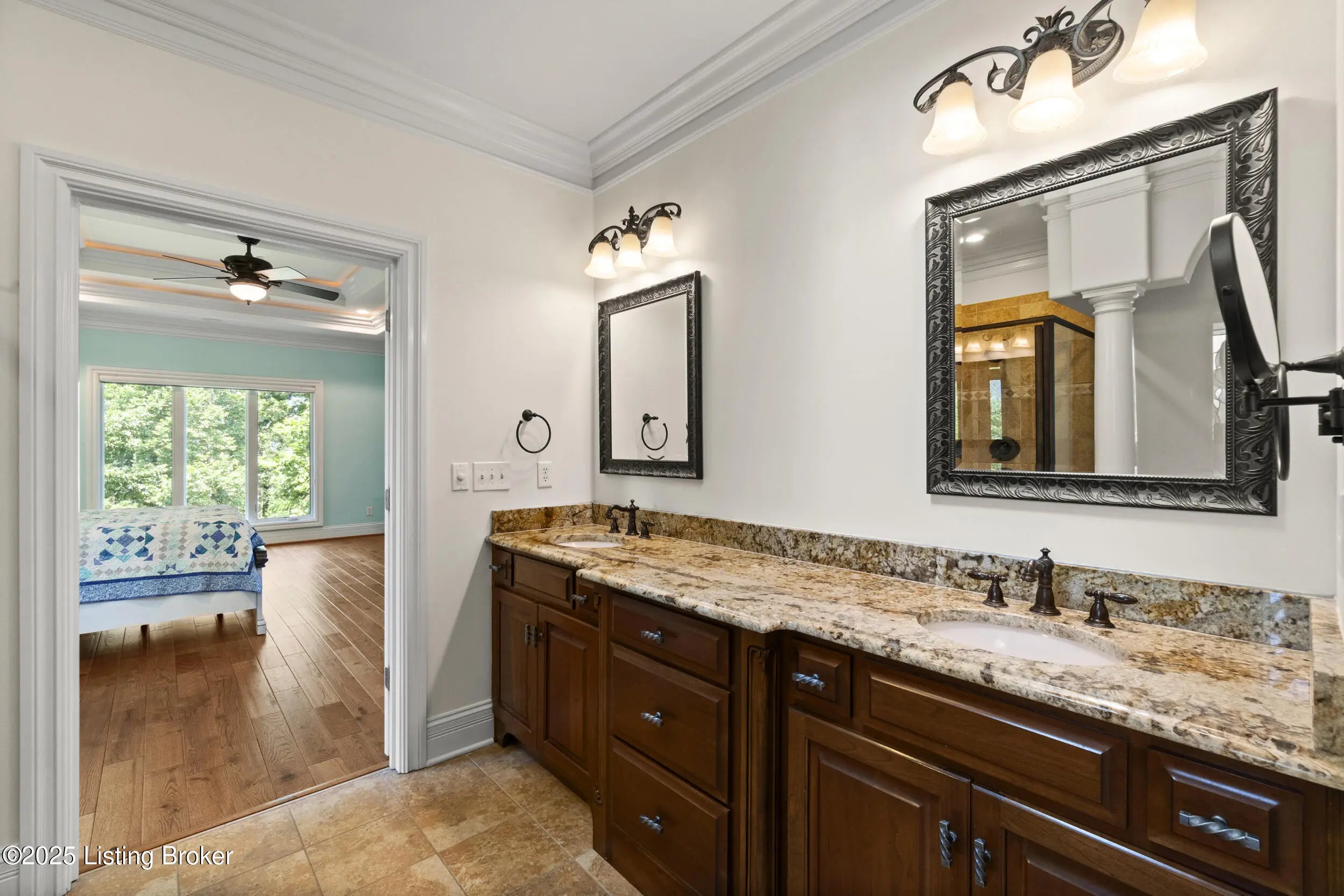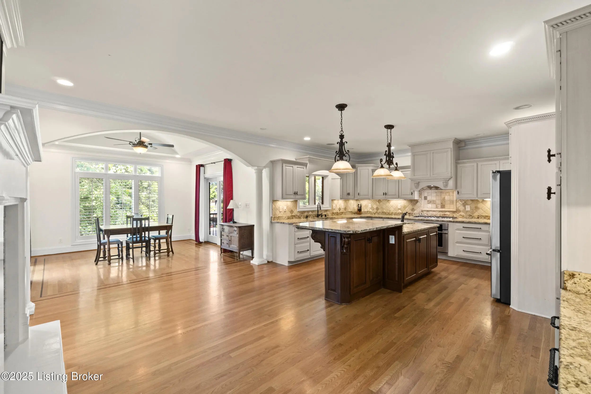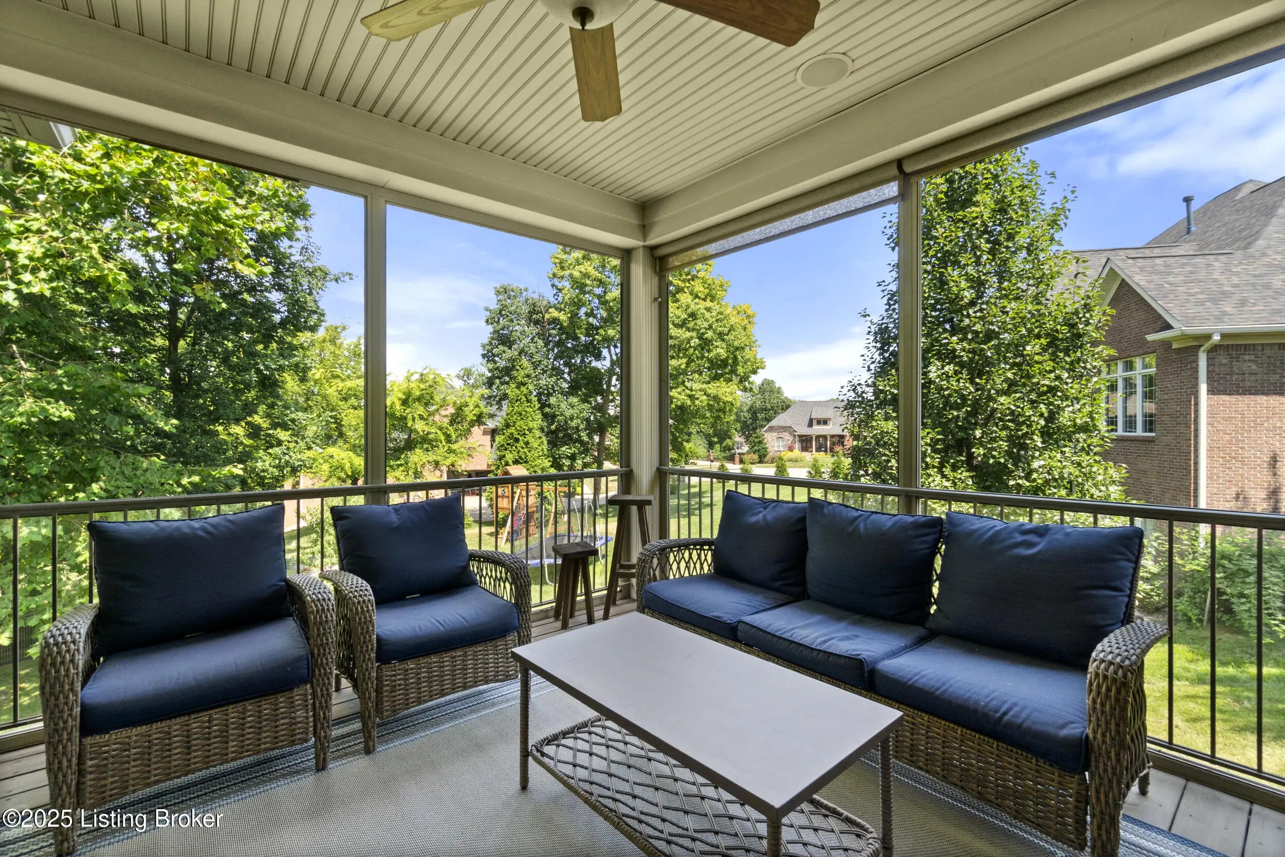 FIRST FLOOR FRESHLY PAINTED! Welcome to luxury living in Goshen, KY—with a brand new roof! This stunning 6-bedroom, 5.5-bath home sits on a beautifully landscaped 0.69-acre corner lot just minutes from the award-winning North Oldham school campus, the new Goshen Library, Creasey Mahan Nature Preserve, and Prospect shopping and dining. Step into the grand two-story foyer where gleaming hardwood floors with intricate inlays, soaring ceilings, and a dramatic arched window make a striking first impression. Elegant crown molding and custom trim continue throughout the home, elevating every space with timeless style. The living room is bathed in natural light thanks to oversized windows and features a dual-sided fireplace, vaulted ceilings, and built-in shelving—perfect for both quiet evenings and entertaining guests. This space flows seamlessly into the gourmet kitchen, where you'll find custom cabinetry, granite countertops, a massive island with seating, stainless steel appliances, an ornate tile backsplash, and gorgeous pendant lighting. The adjacent breakfast room, with arched vaulted ceilings and windows on three sides, opens directly to both decks for an ideal indoor/outdoor dining experience. Enjoy formal meals in the dedicated dining room, which boasts wainscoting, crown molding, and an abundance of natural light. A nearby laundry room offers built-in cabinetry, a utility sink, and ceramic tile flooring, while a half bath adds convenience with rich wood finishes. The main-level primary suite is a luxurious retreat with a double tray ceiling, private deck access, and a spa-like ensuite bathroom featuring a soaking tub framed by columns, a walk-in tiled shower, dual vanities, and a beautiful stained-glass window. A spacious walk-in closet with built-ins completes this restful haven. Nearby, a beautiful office showcases custom built-ins, a second fireplace, and a stunning stained-glass windowideal for a home office, library, or formal sitting room. Also on the main level is a guest bedroom with its own ensuite bath, perfect for multigenerational living or overnight visitors. Upstairs, you'll find three additional bedrooms and a bonus room: one with a private ensuite, two connected by a stylish Jack-and-Jill bathroom, and the bonus room perfect for a playroom, studio, or private retreat. The finished basement offers even more living space, including an expansive entertainment area with a third fireplace, custom built-ins, a wet bar, and a full bathroom. It also includes an additional bedroom, making it a perfect space for guests, extended stays, or even a home gym or hobby room. Whether you're hosting game nights, movie marathons, or weekend visitors, this level offers endless possibilities. Exterior features are just as impressive, including a 3-car attached garage with a man door, a "John Deere garage" for storing lawn equipment with direct backyard access, a spacious U-shaped driveway, a screened-in porch, and a deck perfect for relaxing or grilling. A covered patio beneath the deck provides shaded outdoor space, while a dedicated landscape garage/storage area offers practical storage for tools and equipment. The home also boasts a fully fenced-in backyard, ideal for pets, play, or private enjoyment of your outdoor oasis. This extraordinary home truly offers the perfect blend of elegance, comfort, and functioninside and out. Schedule your private showing today and experience all that 13203 Hampton Circle has to offer!