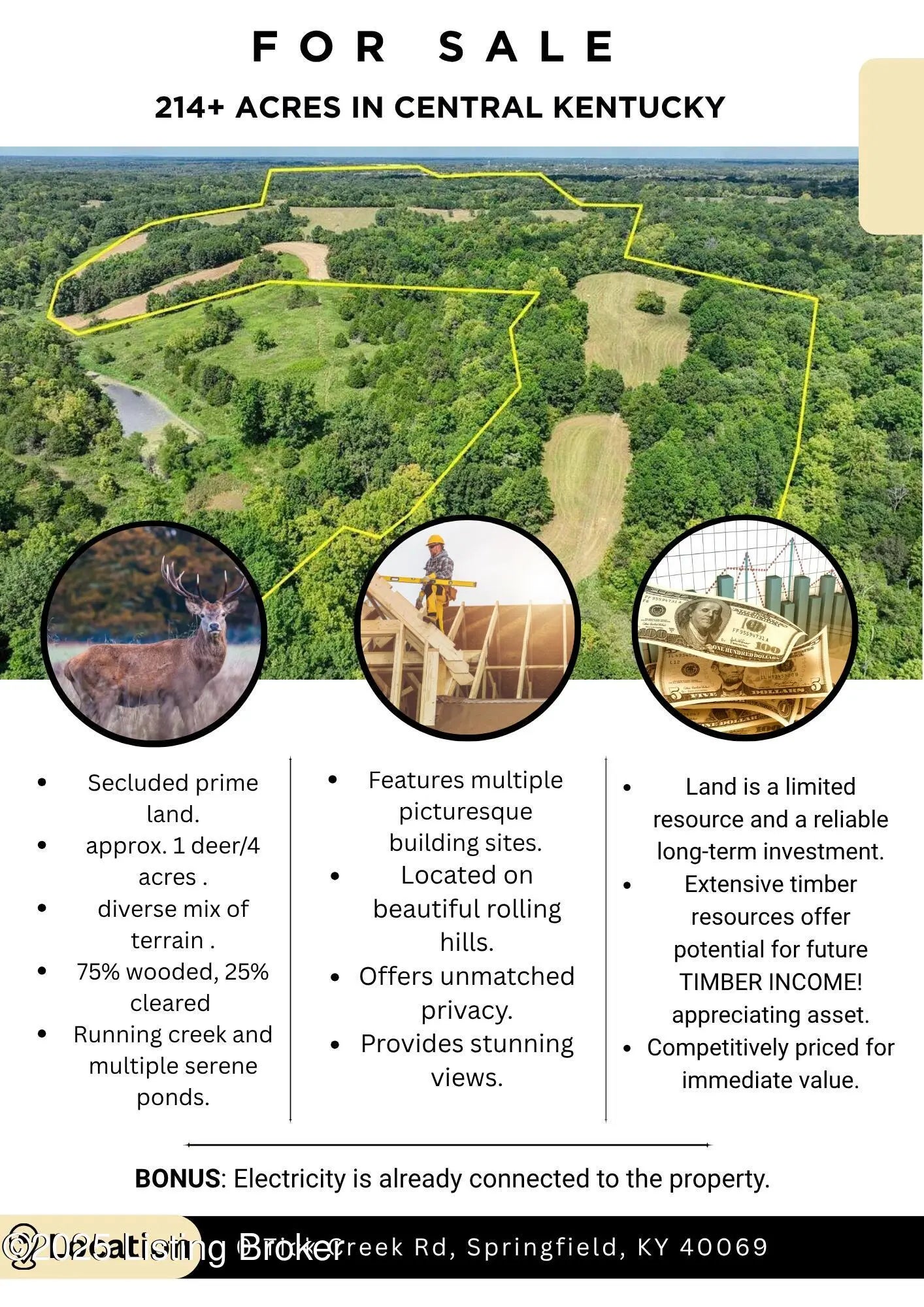 Welcome to Tick Creek Road in Washington County, Kentucky. Feast your eyes upon 214+ acres of serene, secluded, beautiful Kentucky land. They don't make more land, owning property can be one of the best generational wealth building opportunities that you can get involved with. Whether you are an investor, a homeowner, or someone that loves to hunt, you will not want to miss the chance to get this! With a mix of rolling hills, multiple ponds, a creek that runs through the property, tons of wooded areas and some cleared land on ridges, this property has it all! In addition to the perfect mix of cleared ridges and plenty of Kentucky woods, according to a recent government estimation, there is approximately 1 deer per 4 Acres, an excellent ratio for hunting. While this may be a hunter's paradise, It is a great site to build your dream home or family compound, with some electric already ran to an older building on the property. Come see this land for yourself and reach out with any questions! Let's talk about the value, a similar property with 150+ acres, not far from this location recently sold at $7,900 an acre, we are priced $1,000 less an acre than that comparable property. Check the math, we are priced at an incredible value waiting for the perfect buyer! Don't wait, grab your keys and check out this slice of paradise right in Central Kentucky!