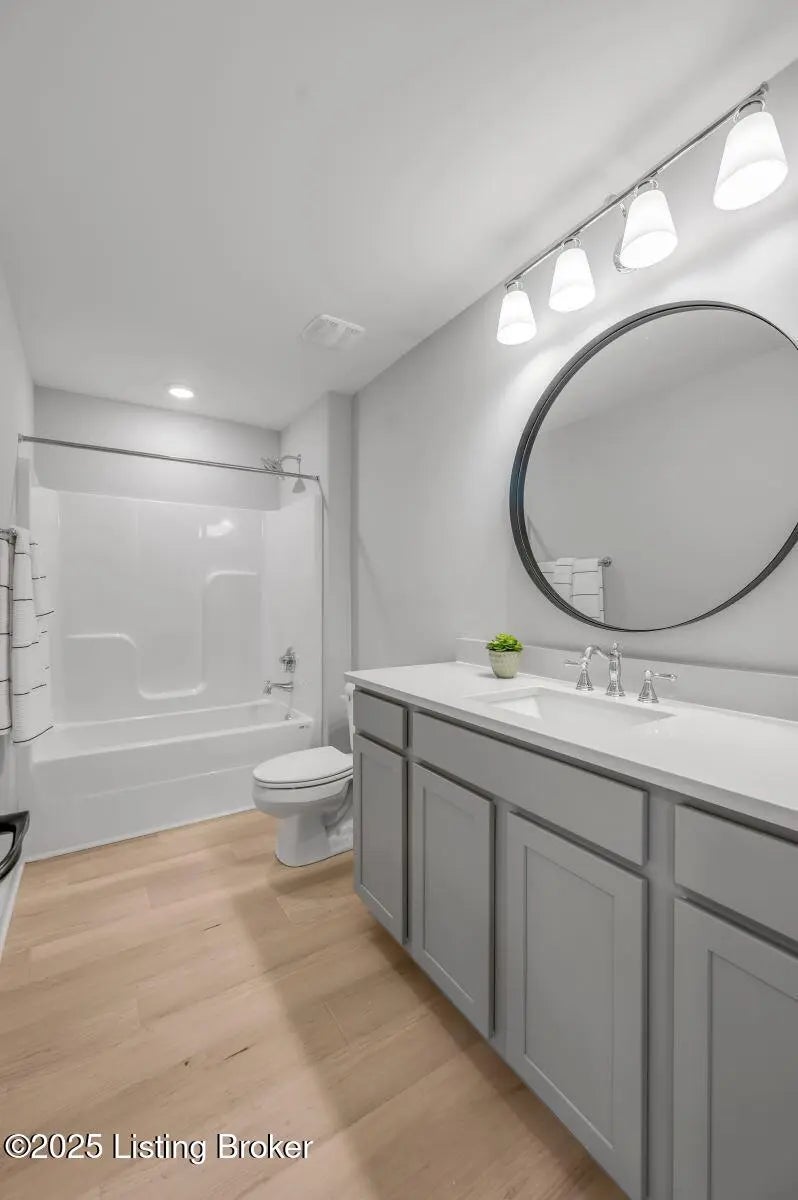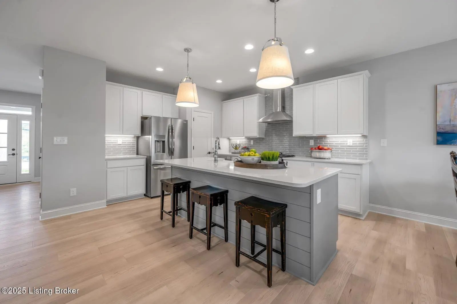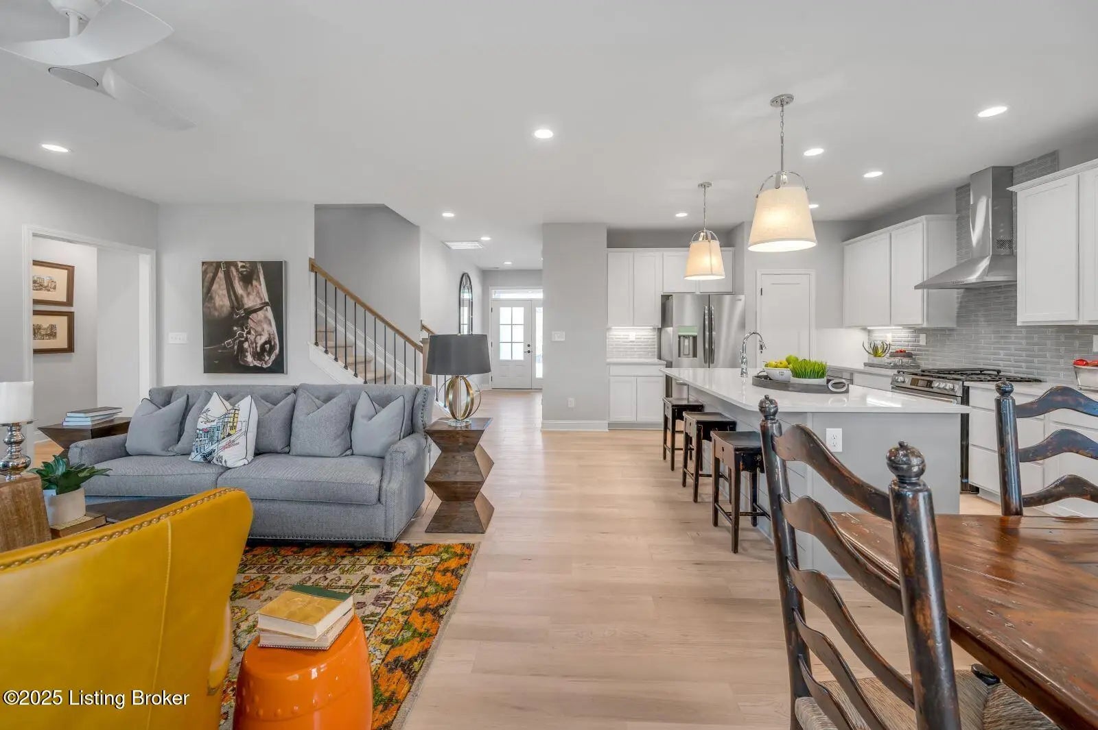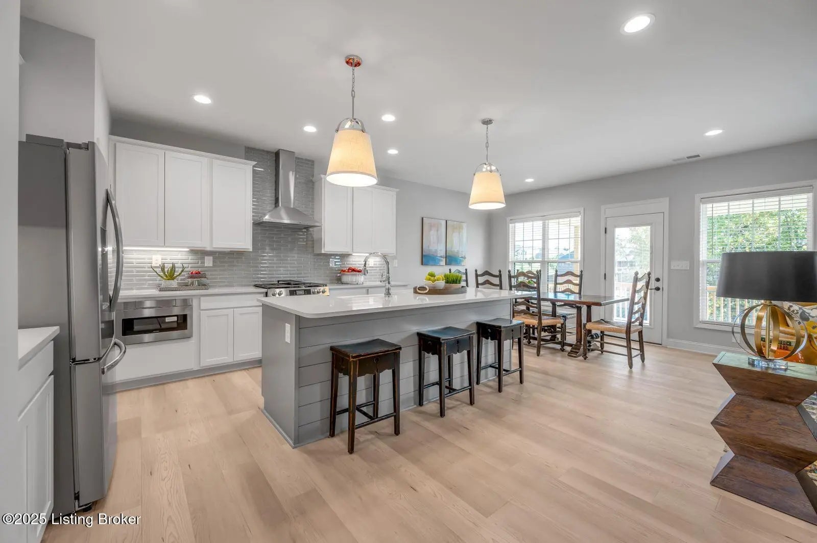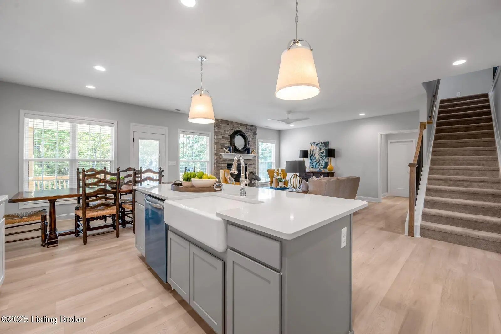 Welcome to this former Model and HomeArama Home! Beautifully designed home with flexible spaces and thoughtful upgrades throughout! The first floor offers a flex room with a feature wall, guest bedroom, and full bath with a tiled shower. Wide-plank LVP flooring flows into the open kitchen, featuring white cabinets with a gray island, quartz countertops, a full-wall tile backsplash, and stainless steel appliances including a gas range with vent hood, French door refrigerator, and dishwasher. A large island with seating and a bright breakfast area adjoin the family room, highlighted by a stone-surround fireplace with raised hearth. Upstairs, enjoy a spacious loft, three bedrooms, and a laundry room with a folding counter. Baths showcase gray cabinetry with quartz tops, while the primary suite impresses with dual vanities, a freestanding soaking tub, and a tiled shower. Upgraded lighting throughout the home adds modern elegance. Relax outdoors on the covered deckperfect for entertaining!