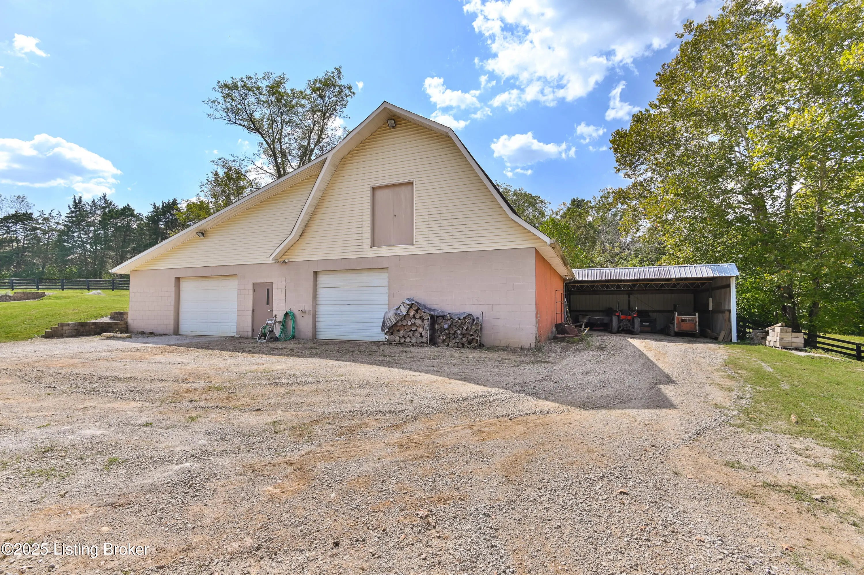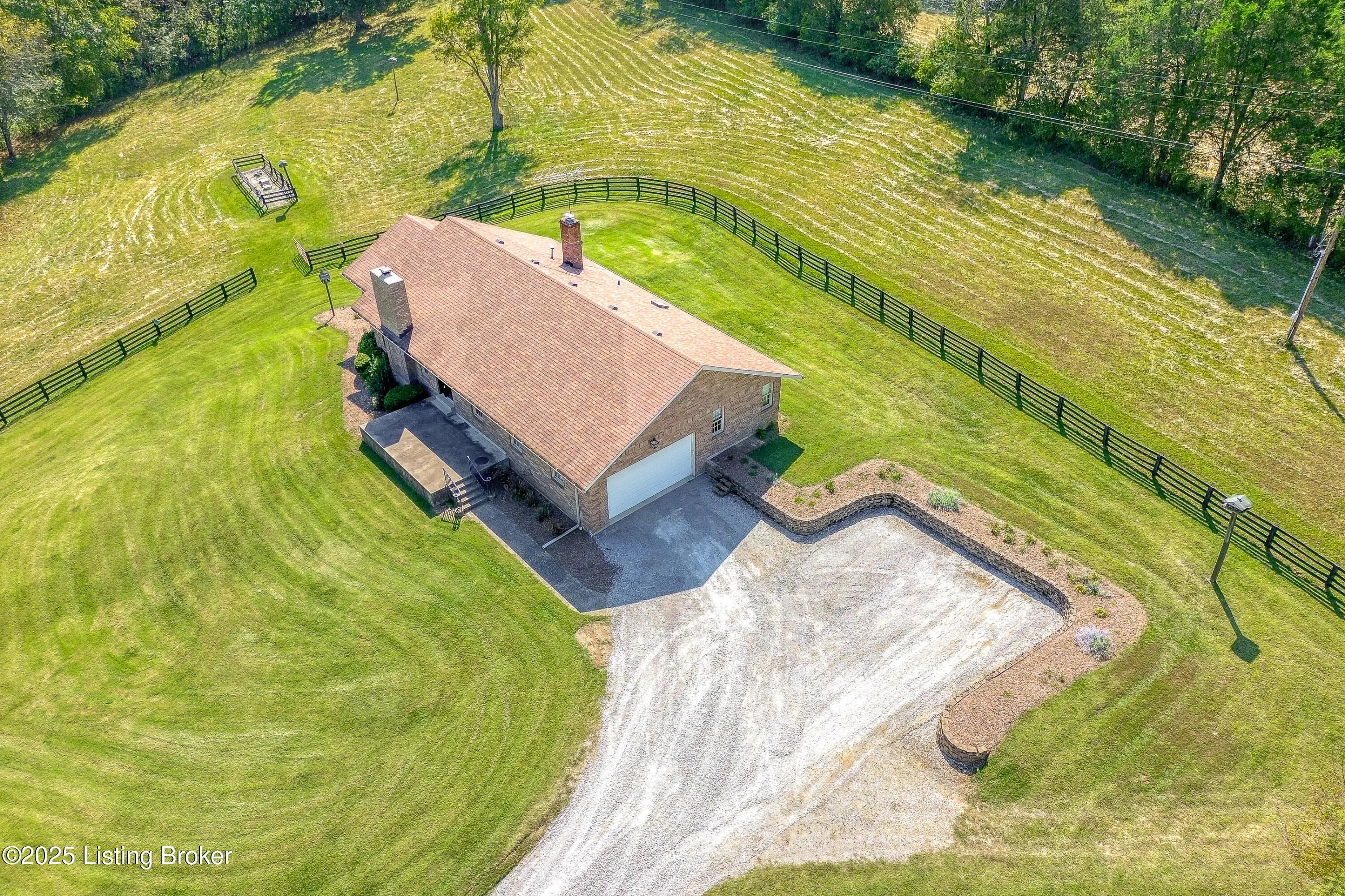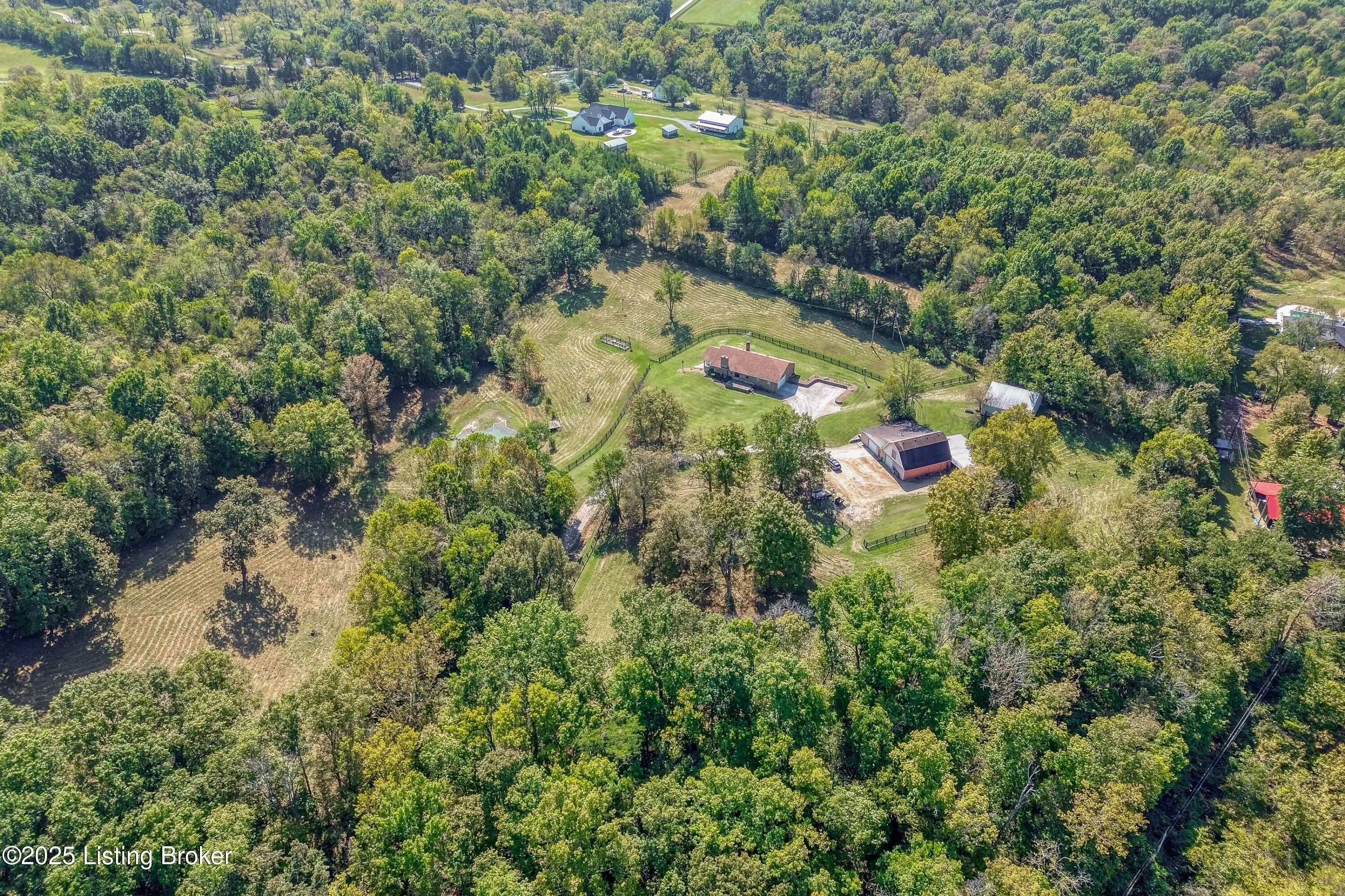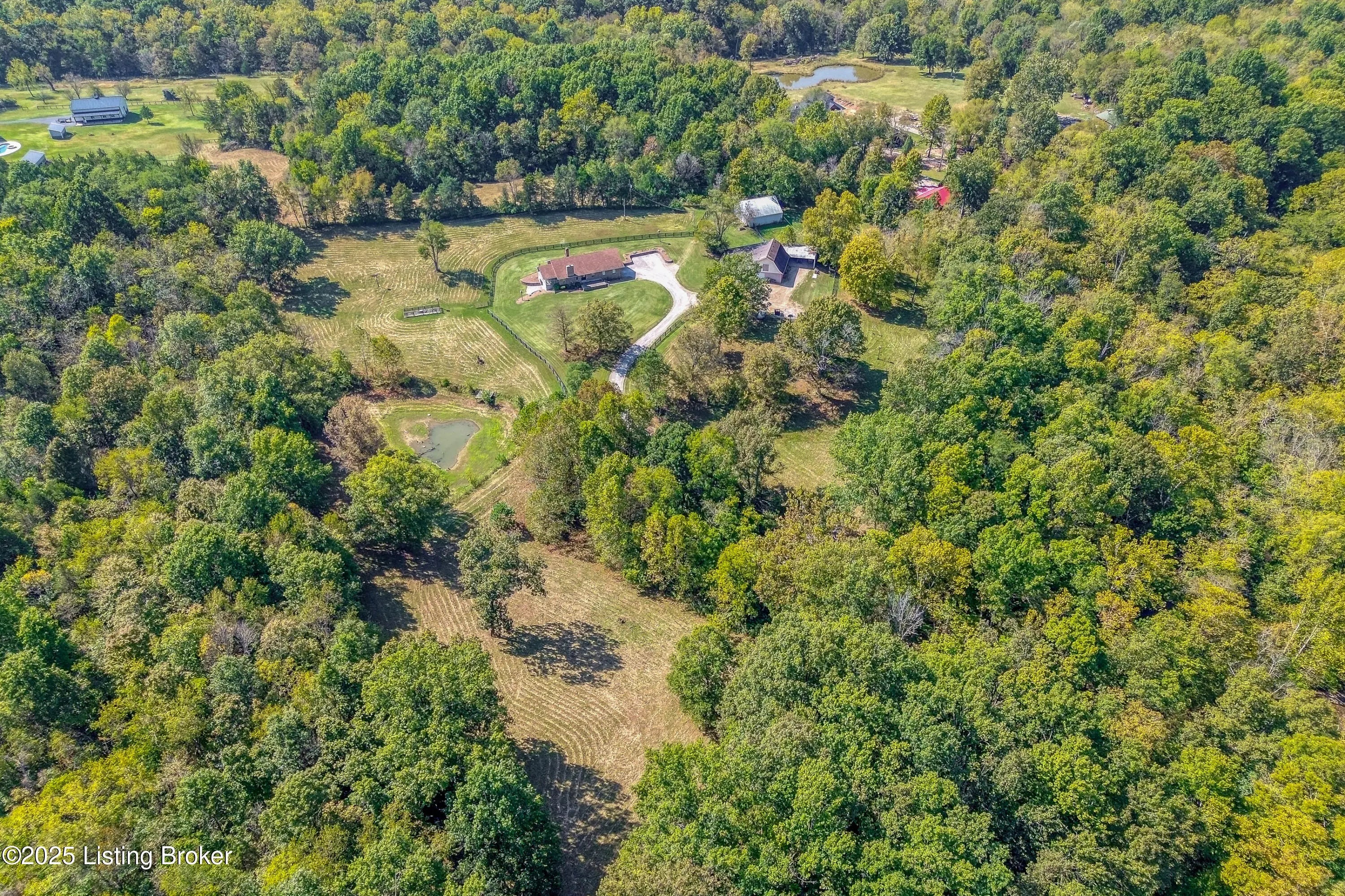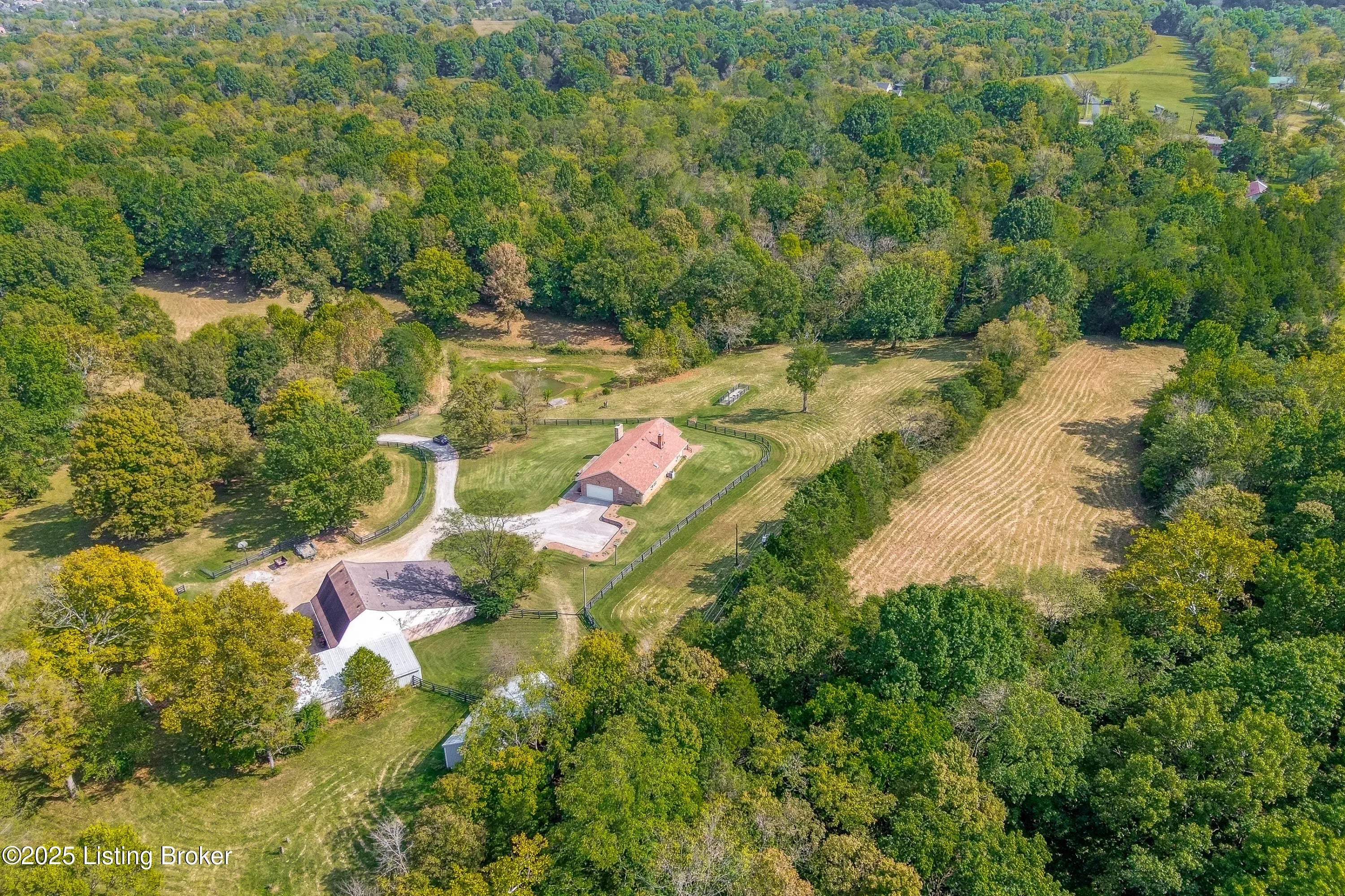 Imagine waking up on 22 acres of rolling countryside, coffee in hand, watching your horses graze just outside the window. This property is more than a home — it's a lifestyle. The 36×36 horse stable with 5 oversized 12×12 stalls and a tack room is ready for your equestrian dreams, with wood-fenced pastures stretching out around you. A second 40×60 outbuilding with loft includes a vehicle lift and compressor that stay — perfect for the hobbyist, collector, or anyone ready to turn their passion into a business. Add in a huge carport and equipment storage, and you'll never run out of space for tools, toys, or tractors. Inside, the ranch-style design makes life easy with everything on one level — 3 bedrooms, 2 baths, a vaulted living room with a cozy fireplace, and an open kitchen-dining flow perfect for gathering. The sunroom is your morning retreat, where deer and wildlife wander by. Downstairs, a partially finished basement expands your options with a 3rd full bath, two offices, and plenty of extra living space. Multiple garages and laundry hookups on both levels add everyday convenience. And the best part? You get peace, privacy, and fresh air while being just 5 miles from the Gene Snyder and minutes to The Parklands. Country calm meets city convenience. Don't just dream it come walk the land, tour the barns, and see what life could look like here. Schedule your private showing today!