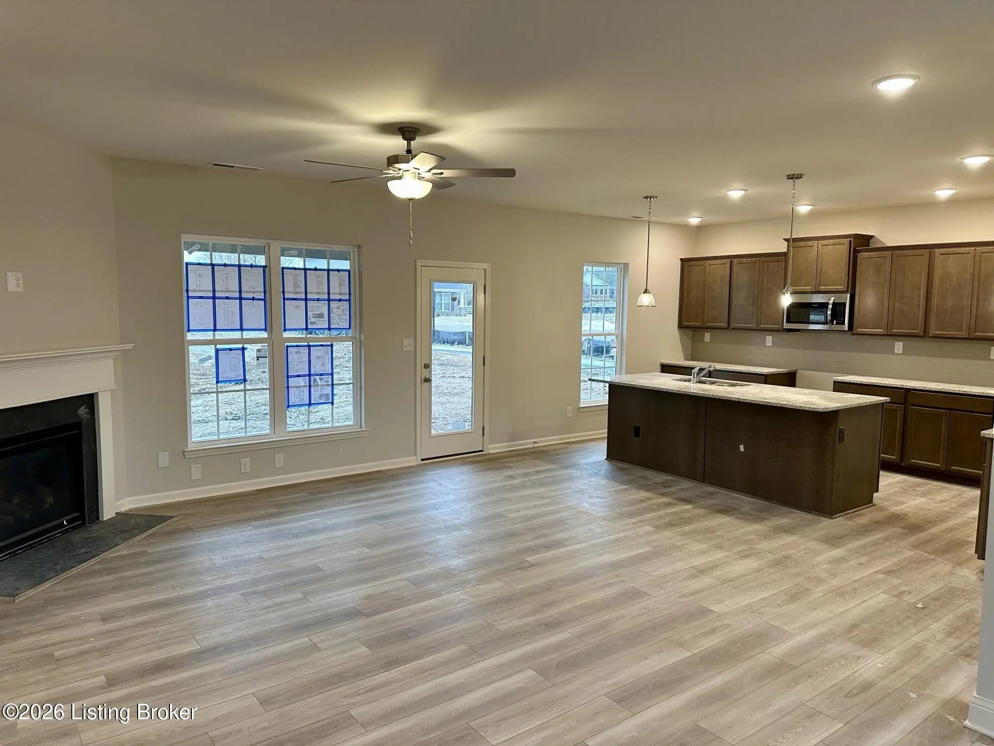 The Preston Mill, part of the Elan Collection by Ball Homes, is a four-bedroom, two-story plan including a first-floor guest bedroom. The plan offers a versatile flex room off the entry and an open kitchen and family room at the rear of the home with a gas fireplace. The spacious island kitchen is complete with stainless appliances including a gas range, microwave, dishwasher and side by side refrigerator, granite countertops, full wall backsplash, breakfast area and pantry. LVP flooring throughout main living areas of first floor and quartz countertops in all bathrooms. Upstairs are the primary bedroom suite, two bedrooms, a loft and a hall bath. The primary bedroom suite includes a bedroom with a vaulted ceiling, huge walk-in closet, spacious bath with 60''x34'' fiberglass shower w/ bypass glass door, double vanities, window, and linen storage. Family room walks out to large 14'x10' covered patio.