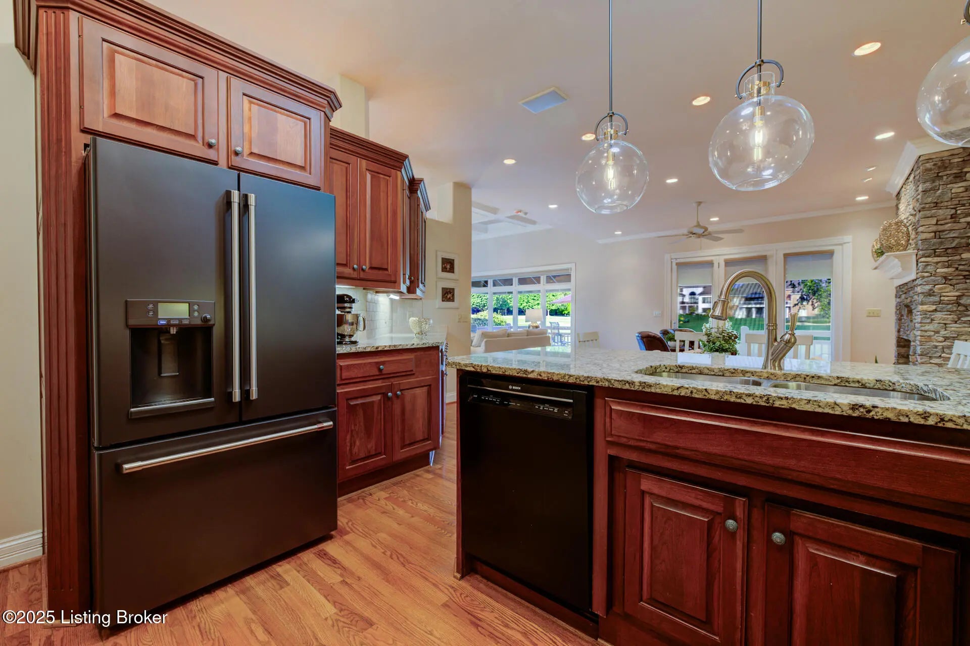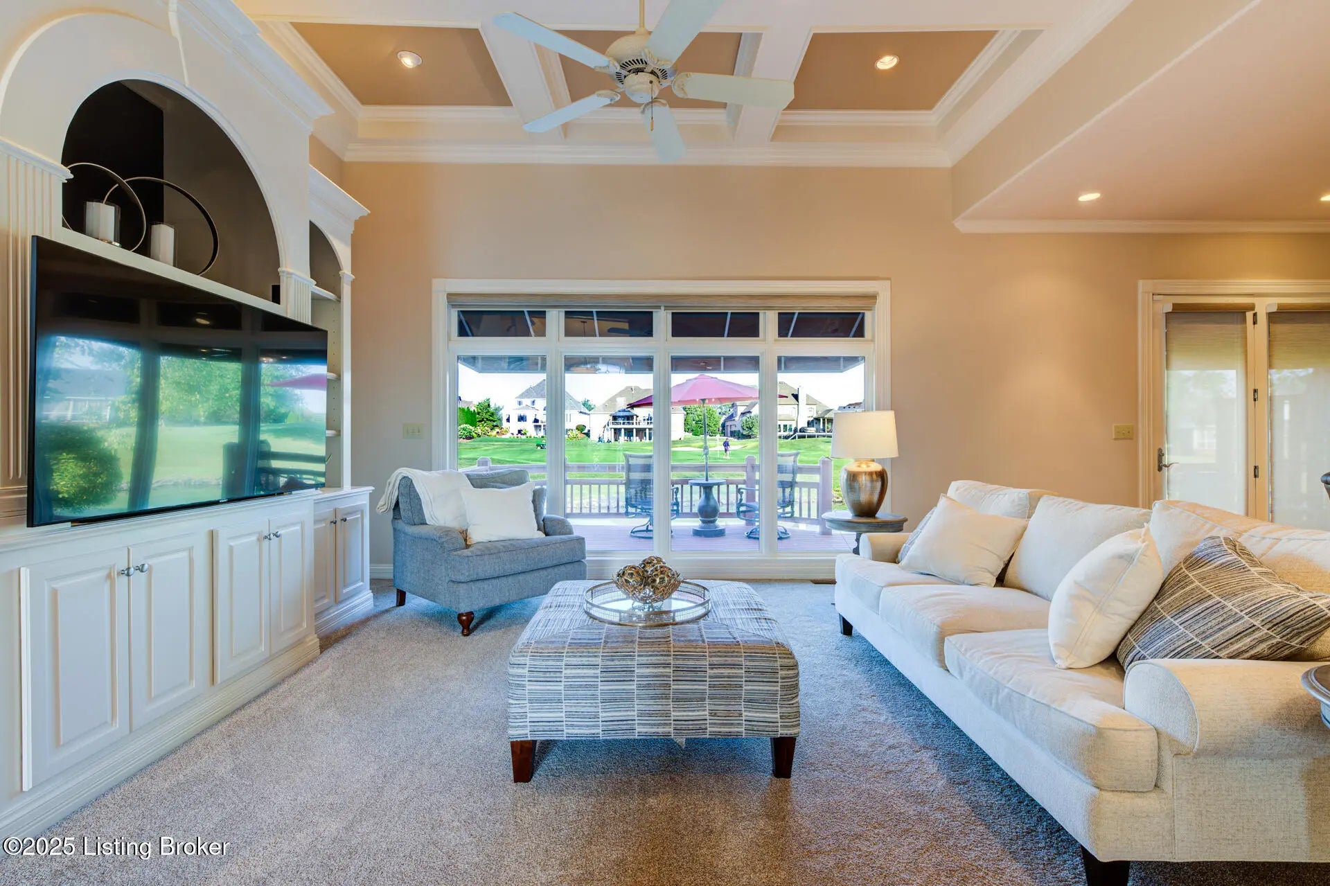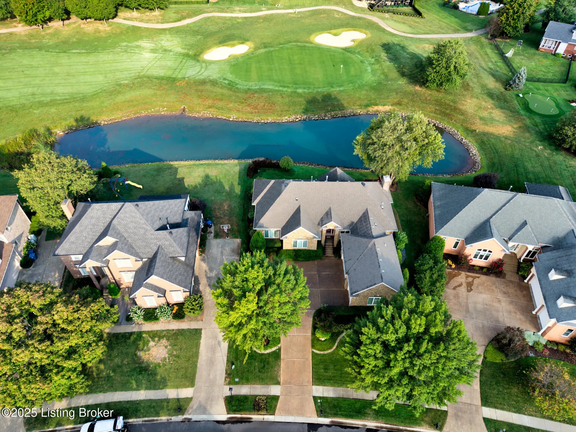 Rare Opportunity - Will Not Last! Meticulously maintained and absolutely gorgeous, this 4-bedroom (one in basement), 3.5-bath ranch-style home sits on the golf course in prestigious Lake Forest. Offering 4,471 sq. ft. of finished living space plus 949 sq. ft. of unfinished basement, this home is designed for comfort and entertaining. The open floor plan seamlessly connects the formal dining room, great room, and hearth room. The dining room features hardwood inlay, recessed lighting, and custom trim. The great room impresses with golf course views, a coffered ceiling, and built-in entertainment center, while the hearth room's stone fireplace provides a cozy retreat. The eat-in kitchen shines with granite countertops (extended for seating), travertine backsplash, new cafe designer double ovens, gas cooktop, designer lighting, and abundant cabinetry. The luxurious primary suite boasts a double tray ceiling and spa-inspired bath with dual vanities, oversized walk-in shower, jetted tub, and ornate picture window. Two additional main-floor bedrooms share a Jack-and-Jill bath (one currently an office). A half bath and spacious laundry room complete this level. Downstairs, the finished lower level offers a family room, entertainment area, workout room, 4th bedroom, and full bath, plus a huge unfinished space perfect for storage or hobbies. Step outside to the deck overlooking hole #4 and the pondthe perfect spot for morning coffee or evening relaxation. Lake Forest is one of Louisville's most sought-after communities, offering pools, clubhouse, tennis, walking trails, award-winning schools, shopping, and dining. A magnificent home on one of Lake Forest's premier lots