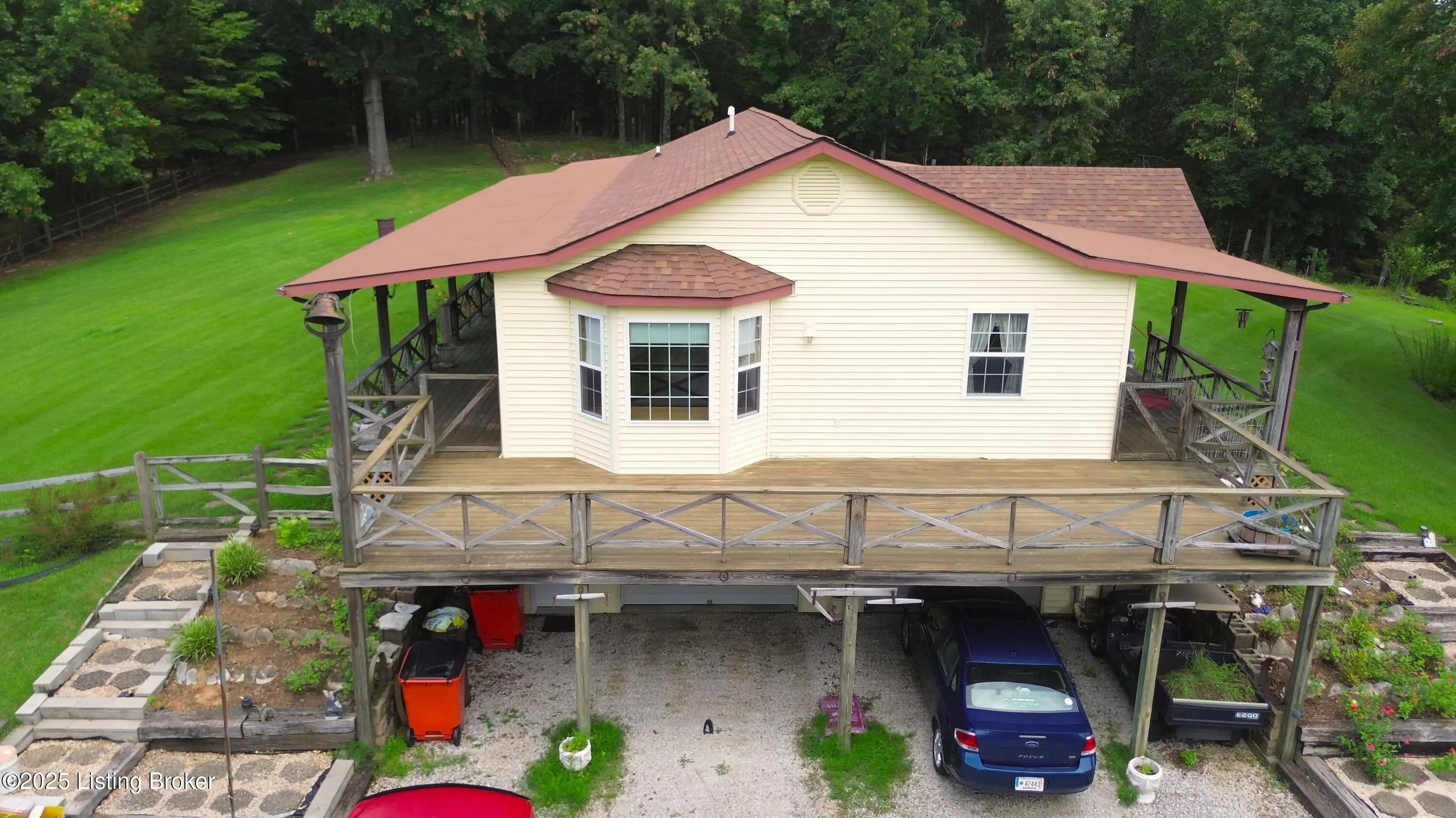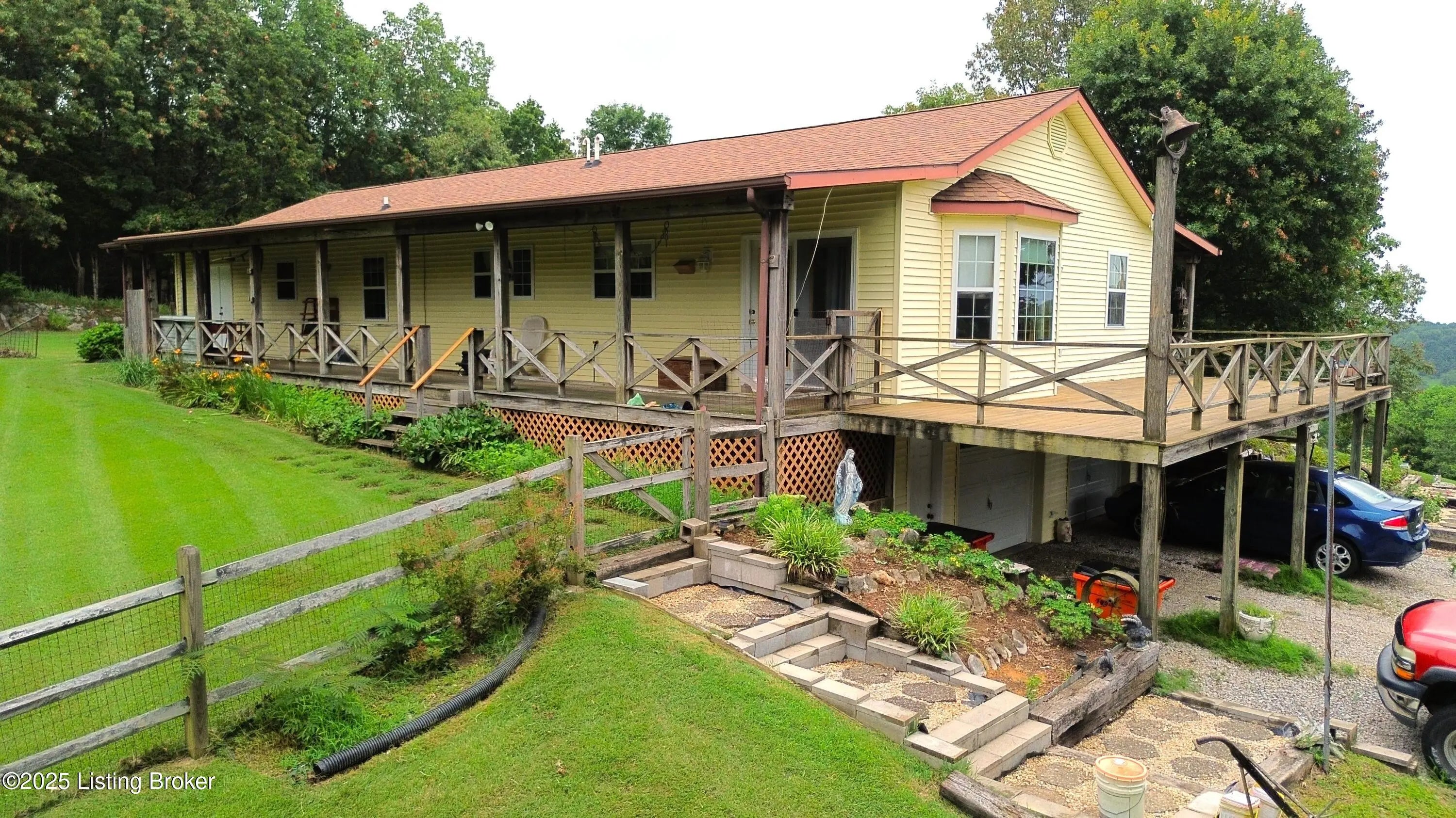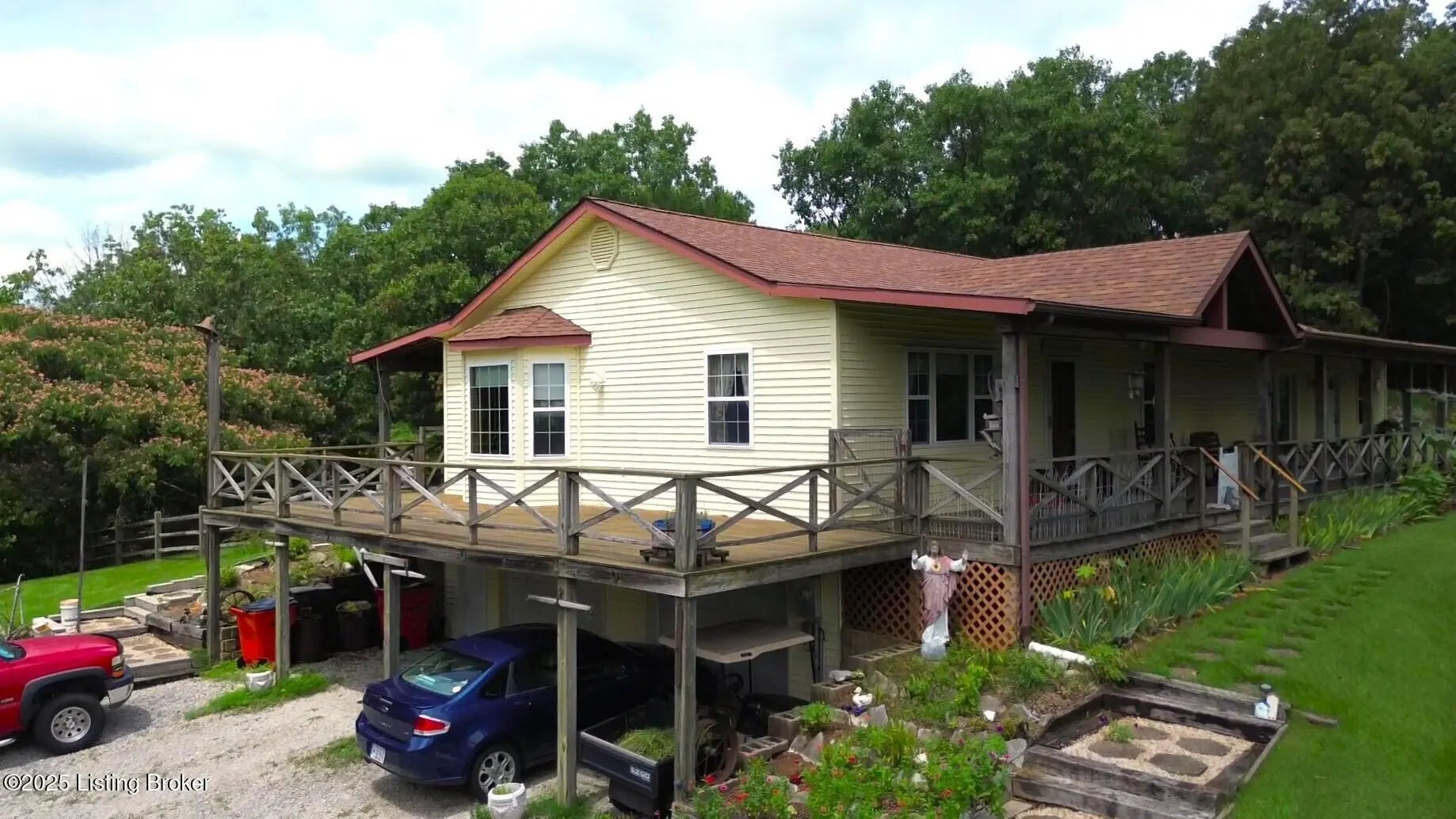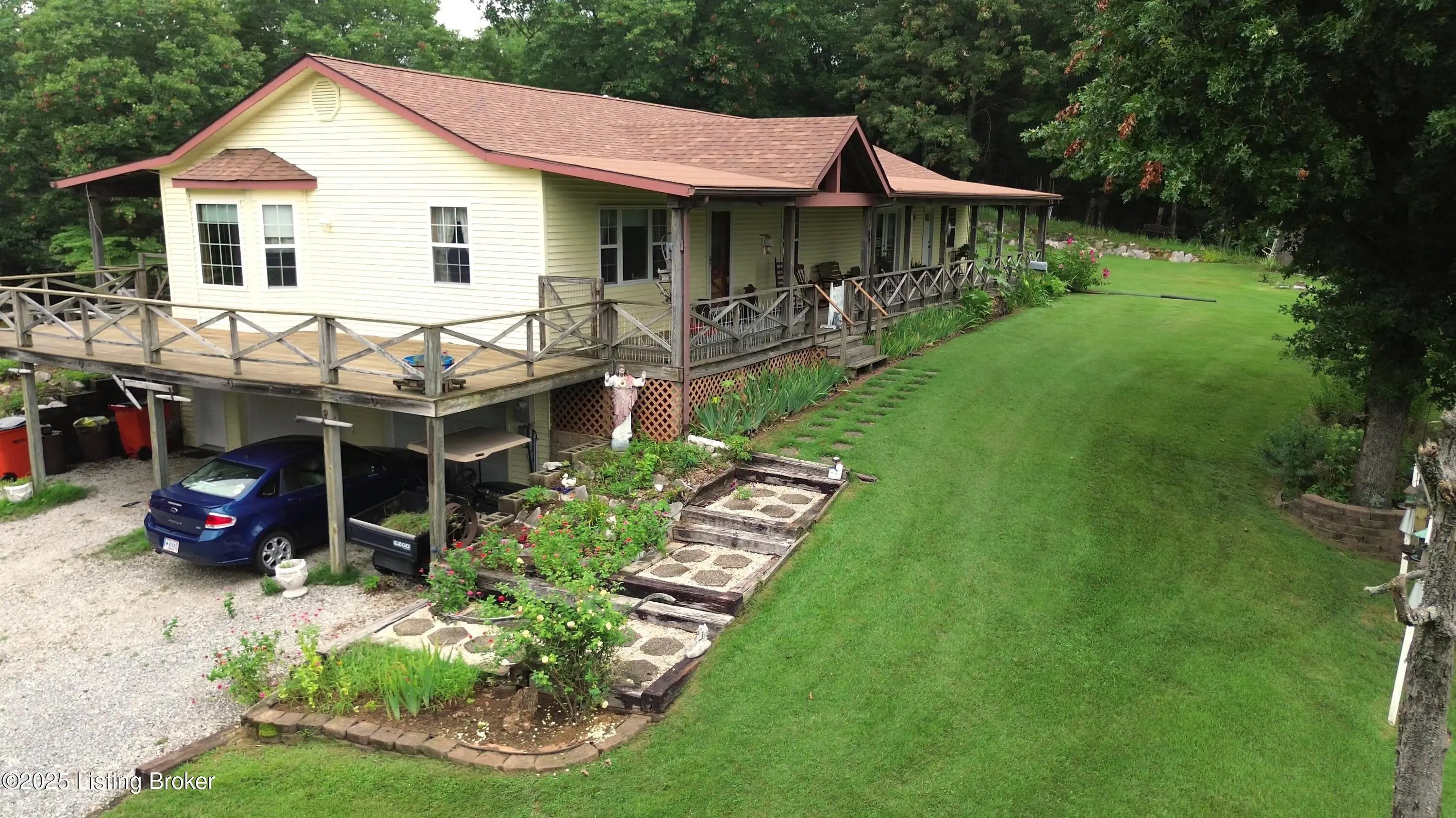 Escape to your private sanctuary at 1020 Yates Chapel Rd in Cecilia, KY. This custom-built 3-bedroom, 2.5-bath, 2,610 sq ft home offers the perfect blend of comfort, privacy, and craftsmanship. Enjoy peaceful country living from the covered front and rear porches that wrap three sides of the home and capture scenic rural views. An oversized two-car garage with automatic overhead doors, accessible from the basement, provides excellent storage and convenience. Situated on 45.3 acres, the property features abundant wildlife, panoramic views, and marketable timber—ideal for outdoor enthusiasts and those seeking space and seclusion. Inside, the open-concept living, dining, and kitchen areas showcase vaulted ceilings with exposed beams, creating a warm and inviting atmosphere. A gas fireplace and gas stove offer comfort and reliability during power outages. The primary suite serves as a true retreat with a double vanity, walk-in shower, and jetted tub. Double bay doors lead directly to the covered porches, perfect for relaxing or entertaining. Additional highlights include a finished basement with a large entertaining area, half bath, and utility sink; an attached heated and cooled concrete-floor workshop with hot and cold water; an 840 sq ft equipment shed and multiple outbuildings; insulation in all interior walls; and a non-smoking, one-owner history with detailed maintenance records. Despite its private setting, this exceptional property is just 13 miles from Elizabethtown, offering easy access to shopping, dining, and employment opportunities.