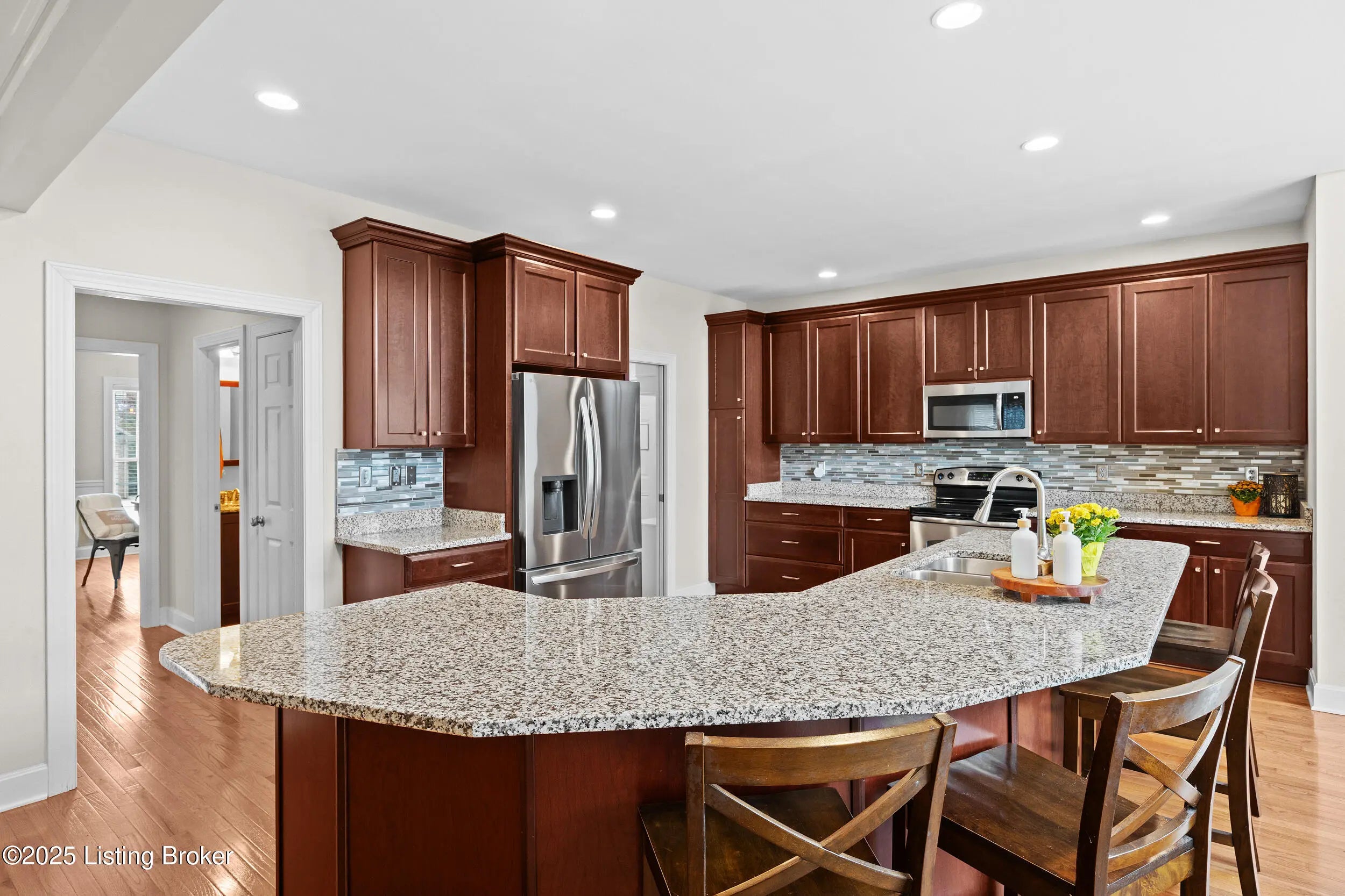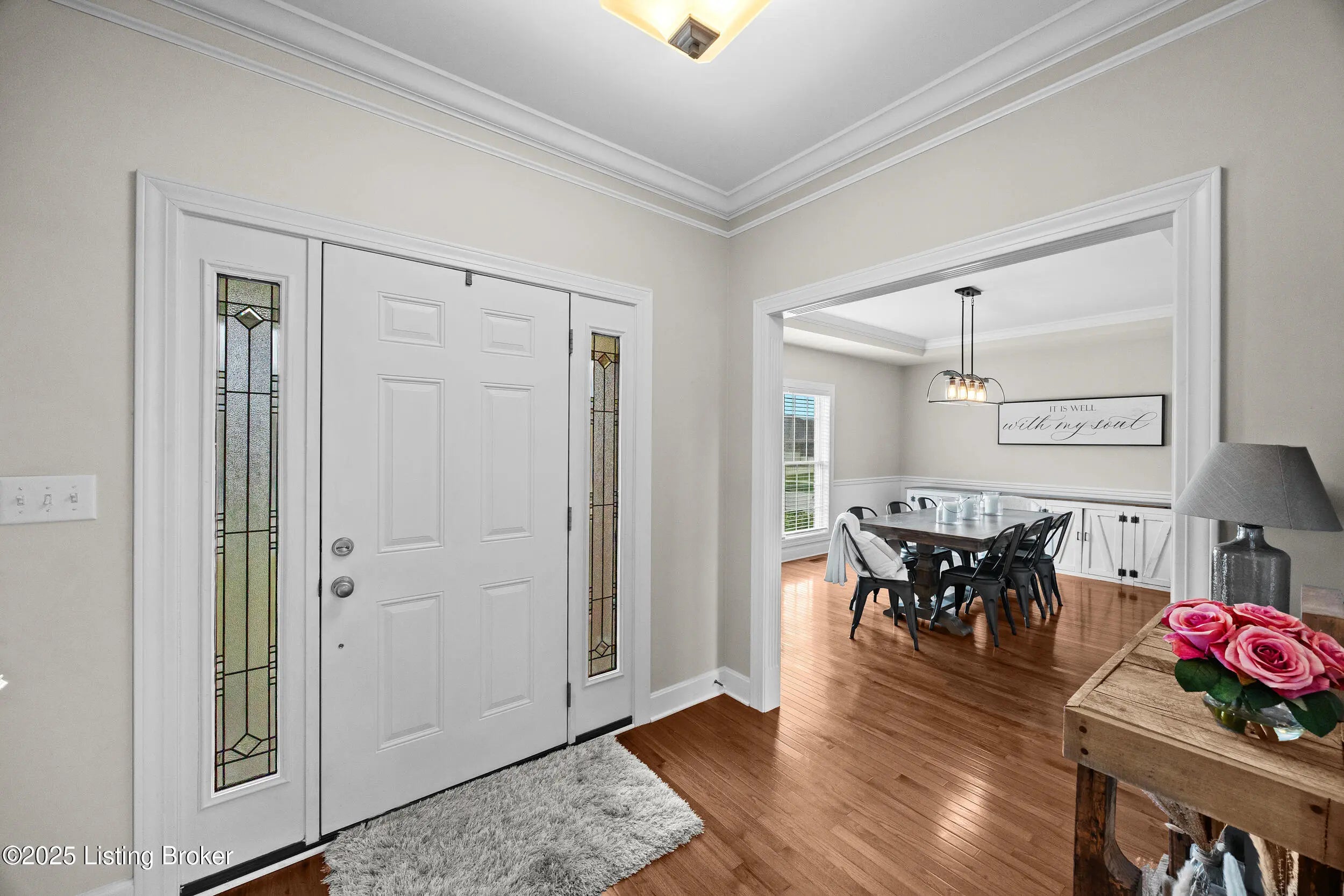 Welcome home to this stunning two-story brick residence in desirable Goshen, featuring timeless curb appeal with a charming front porch and a spacious three-car garage. Step inside to a welcoming foyer that leads into a large living room, seamlessly open to the kitchen—the perfect layout for entertaining or everyday living. The kitchen is beautifully appointed with granite countertops, stainless steel appliances, and an inviting eat-in area with a huge window that fills the space with natural light. A laundry room conveniently located off the kitchen and a formal dining room provide both functionality and elegance, while a half bath completes the main level. Upstairs, the primary bedroom suite impresses with double closets and a spa-like ensuite featuring a double vanity, separate tub, and shower. Three additional generous bedrooms and a full bathroom offer plenty of space for family or guests. The finished basement provides a large bonus area that can be used as a recreation room, home office, or guest suite, complemented by an additional full bathroom. As an added bonus, the home features a sump pump and water filtration system, offering peace of mind and enhanced water quality. Enjoy the outdoors on the covered patio overlooking the beautiful backyardperfect for relaxing or entertaining. This home combines style, space, and comfort in a fantastic location,don't miss it!