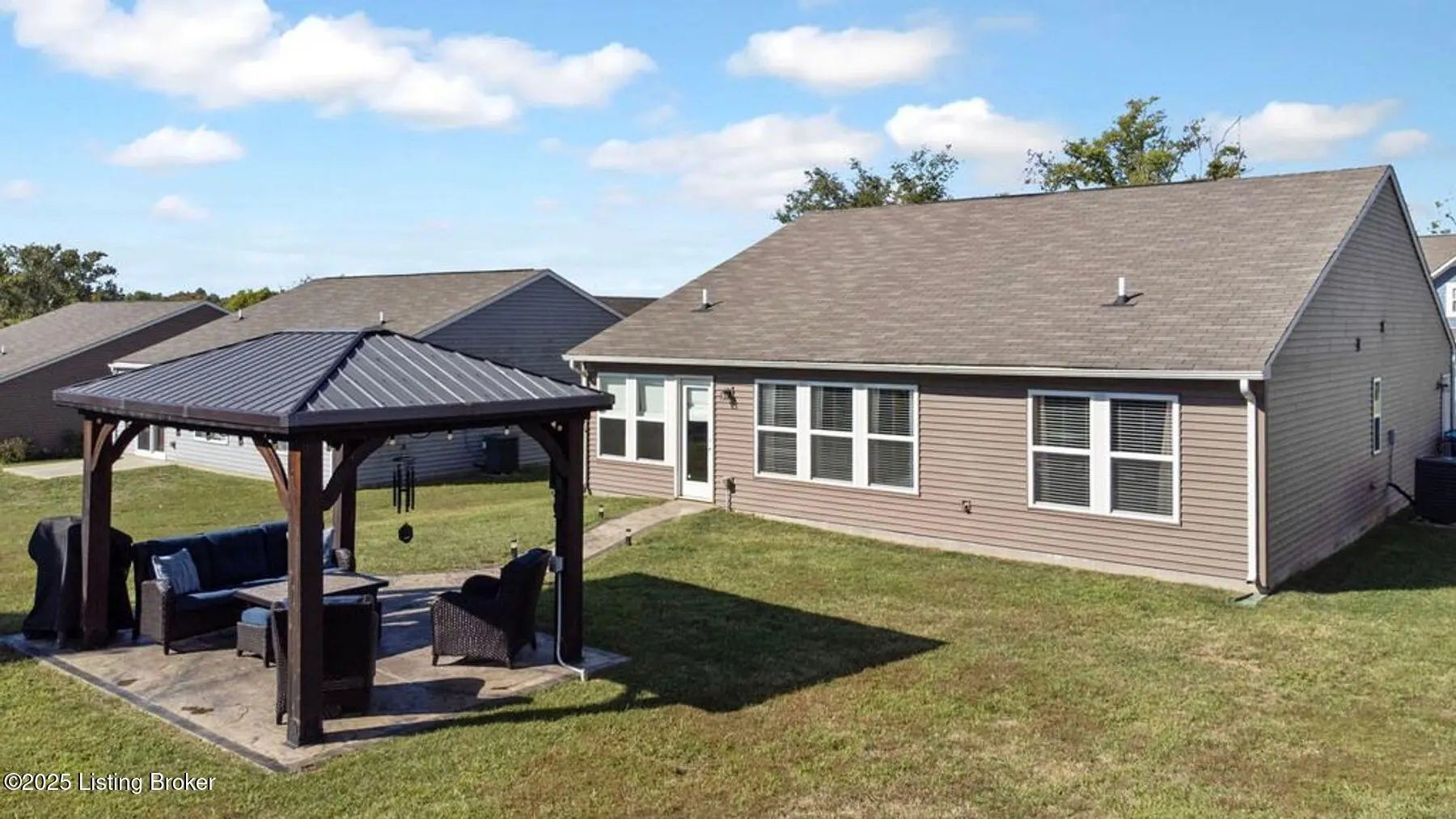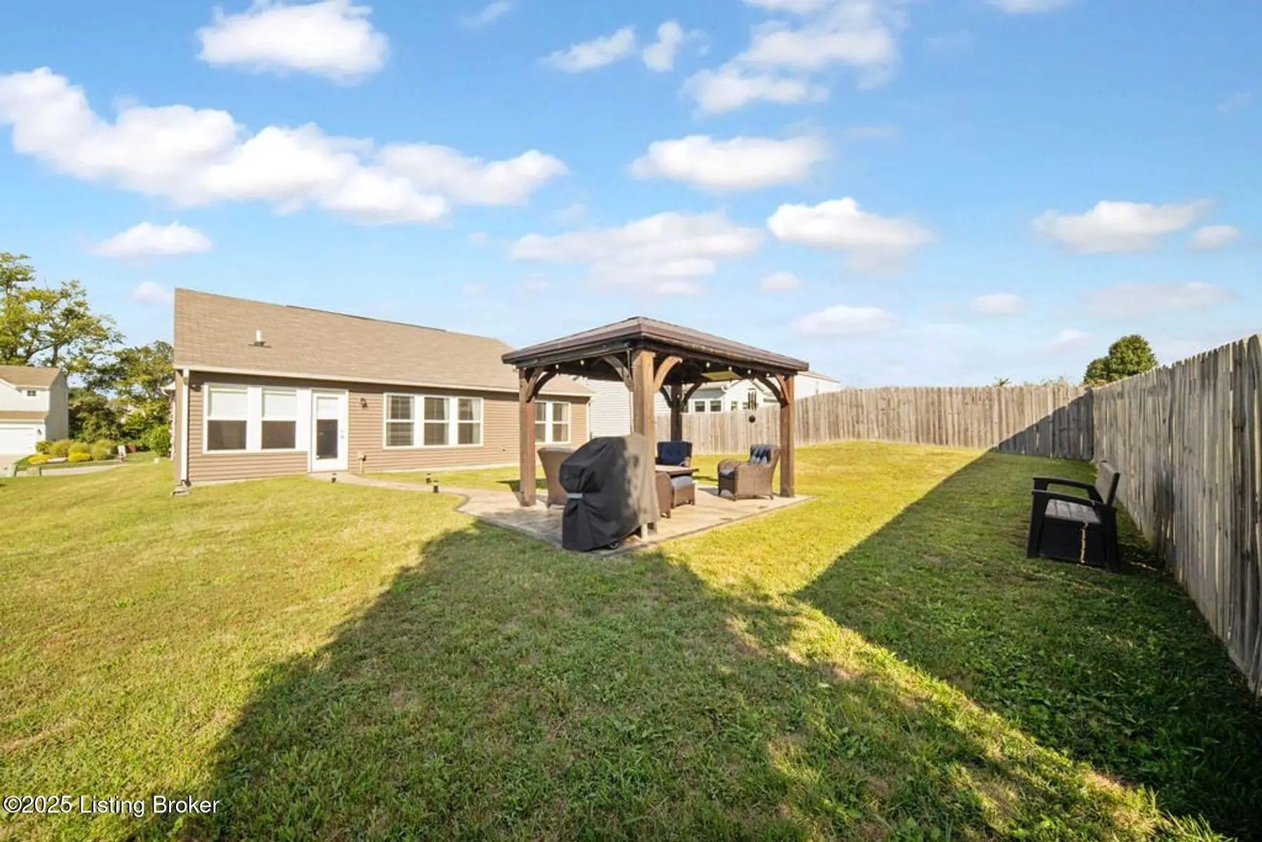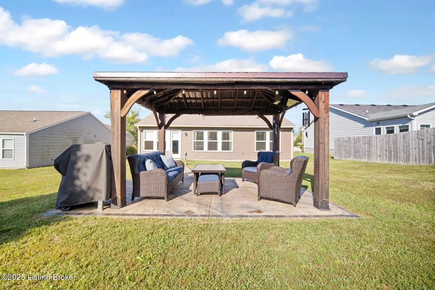 Like new, less than 5 year old home 3 bedroom, 2 bath, home in the desirable Summersfield Place subdivision. Convenient one-level living, and a split floor plan with primary being on one side of the house, while the other 2 bedrooms are on the other side, everyone has a place to call their own. The spacious kitchen with island, features stainless steel appliances which remain, granite countertops, tiled backsplash, and LVP flooring, which extends through the kitchen, dining area, bathrooms, and hallways for easy living. The real show stopper? You will get to enjoy your own private outdoor retreat with a custom-built gazebo complete with electrical hookups for lighting and TV (which remain), plus a gorgeous & stylish stamped concrete sidewalk leading to the patio. With the right offer, the patio furniture can also be negotiated to stay...giving you a ready-made space for entertaining, grilling, and watching your favorite game! Additional features include a 2-car garage with side entry door, and convenient access to popular Shelby County dining, shopping, and attractions. This property combines comfort, style, and location, ready for its next owners!