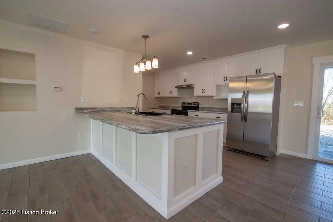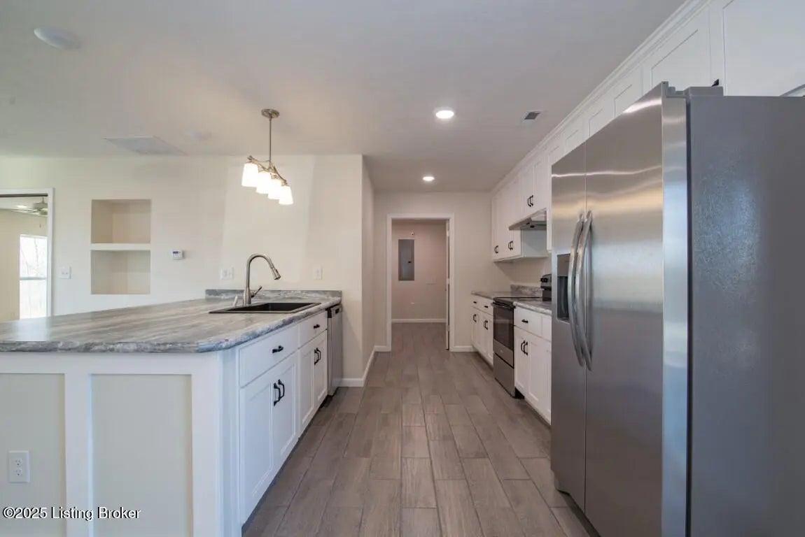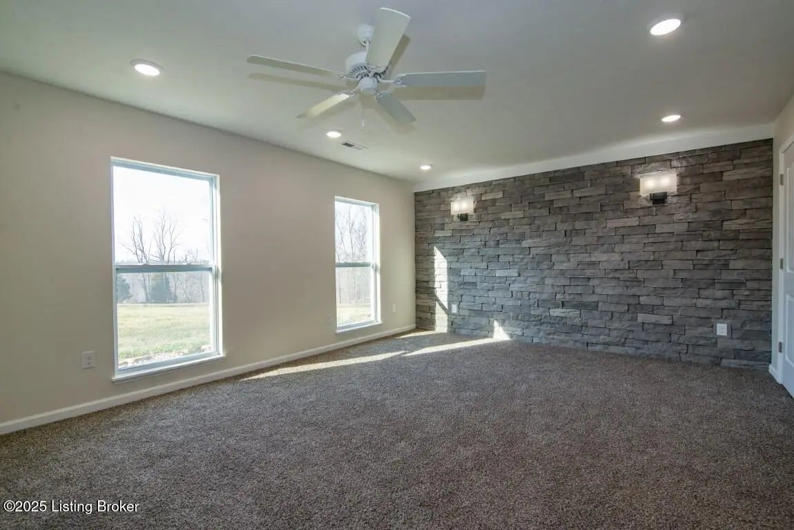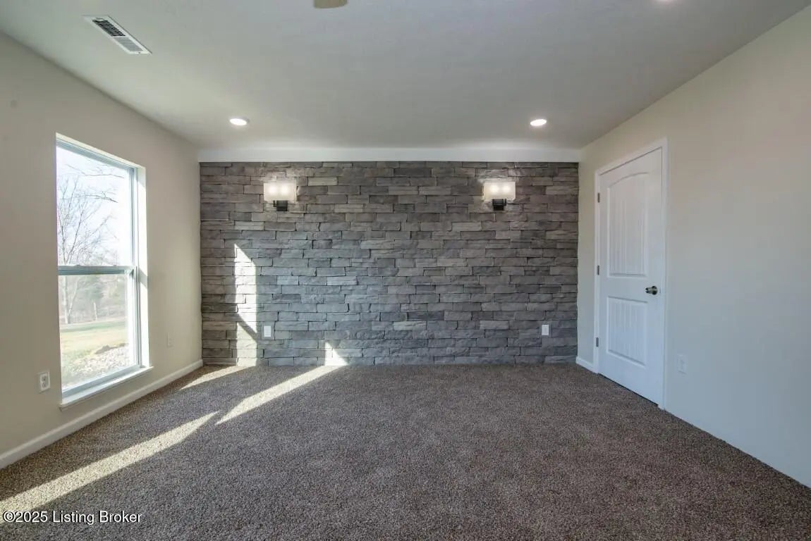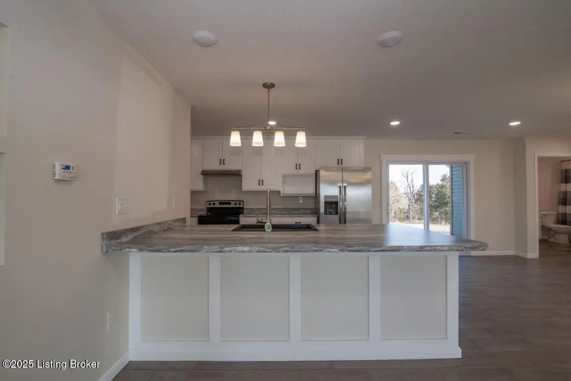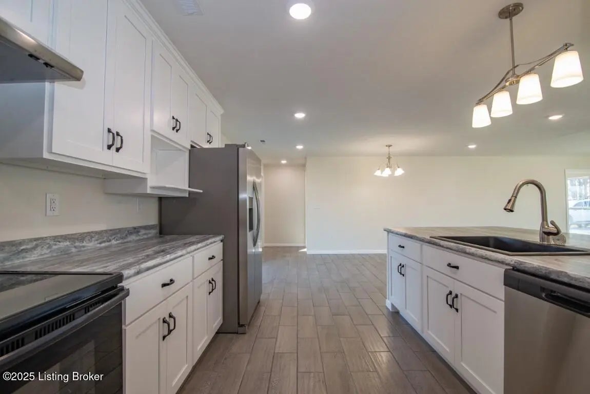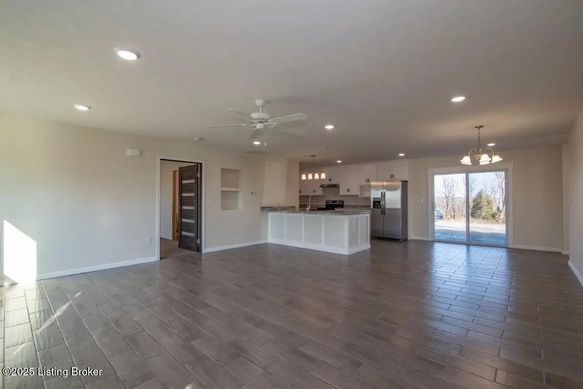 Welcome Home to 1,748 sq. ft. of beautifully designed, detail-oriented living space, this HOME is sure to IMPRESS!** Step into the huge and inviting open-concept living, dining, and kitchen areas are warm, spacious, and perfect for gatherings. Enjoy the built-in nook, oversized gourmet kitchen island, stainless steel appliances (about 2 year old), custom soft-close cabinets/drawers, and stunning granite-look countertops. Beautiful tile flooring runs through most of the home, with plush carpet in the bedrooms for comfort. Split bedroom design with each carpeted, with ceiling fans, TV-mount-ready outlets and walk in closets. The guest bath is generously sized with abundant cabinetry, counter space, tile flooring, and a convenient access door to water lines. The master suite is truly a showstopper-featuring a custom stone accent wall with built-in sconces, lush carpet, ceiling fan, and a lighted walk-in closet with sturdy custom shelving. The spa-like master bath offers a double vanity, great lighting, and a walk-in tiled shower with built-in nooks, in-shower bench, and **one rainfall shower head plus two regular shower heads**. Accessibility features include no steps, slab foundation, 36-inch-wide doors, alternating light switches, level lot/drive, tall custom windows, and all ceiling vents for flexible furniture placement. Additional highlights include recessed lighting throughout, dimmer switches, accent lighting in the primary, motion security lights, and attic storage. Outside, enjoy the front and huge rear patios. Approximately ¾ fencing (treated cedar wood & woven wire), a barn with workshop potential, and mature trees. Water is supplied via a shared well(agreement recorded) with neighbors and owners alternate paying \$25/month for six months each year for the pump. **Peace of mind includedthis home is still under American Home Warranty until April 2028.**Located on 2+ acres in a rural setting within Meade County, this property blends modern comfort, thoughtful design, and country charmready to welcome you home!
