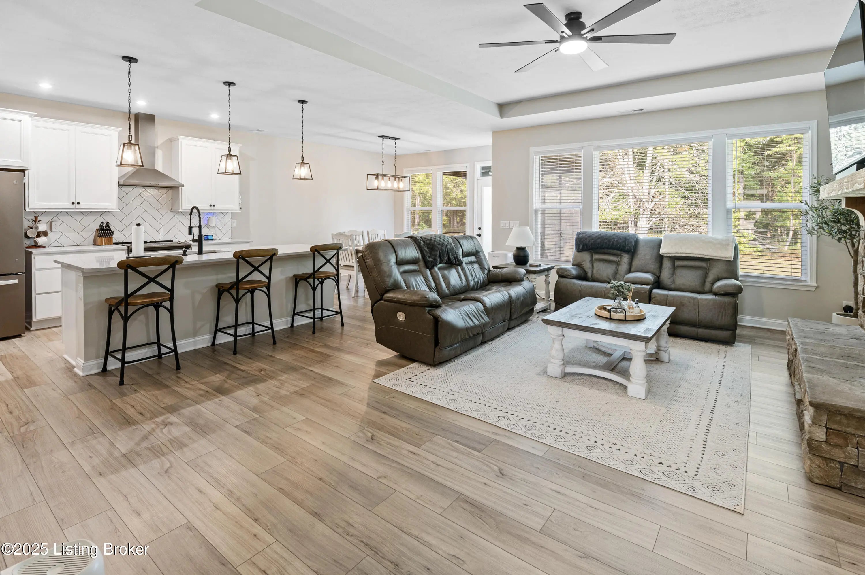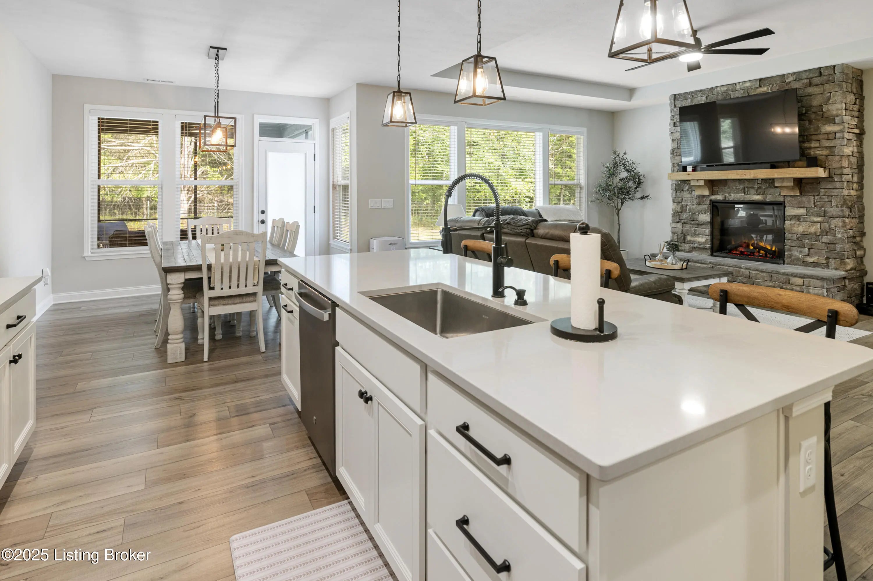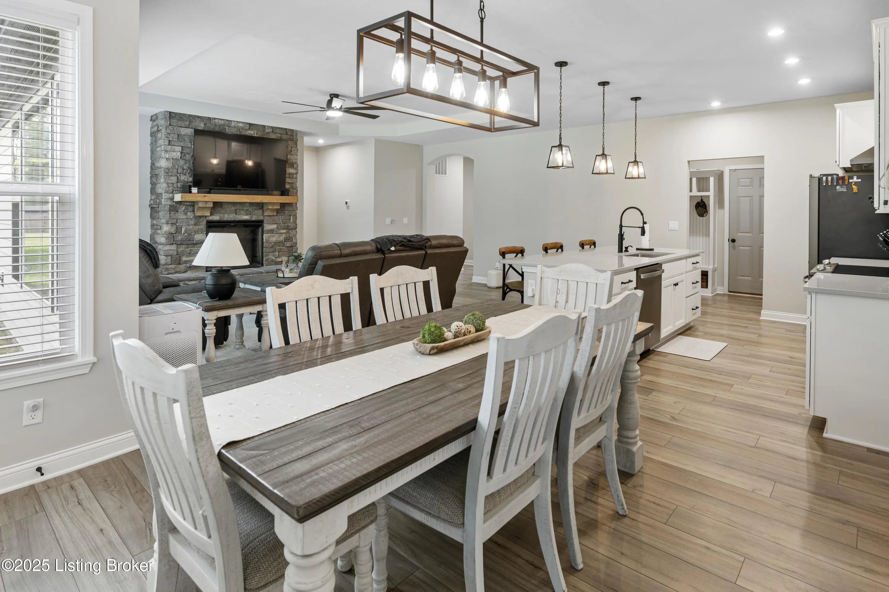 Built just two years ago, this beautiful 3-bedroom, 2-bath home is packed with top-notch builder upgrades.The open-concept features a spacious great room with stone fireplace that flows seamlessly into the kitchen and morning room. Chef's dream kitchen with quartz countertops, center island, and pantry, while the breakfast nook/morning room offers natural light and opens to a screened-in patio—perfect for relaxing or entertaining. The primary suite is a retreat, boasting a spa-like bath with dual vanities, large tiled shower with four shower heads, and walk-in closet with upgraded shelving system. Additional details include custom-built cubbies by garage entry, convenient laundry room, Hardie board siding, 80-gallon hot water tank, and plumbing for water filtration and softener systems