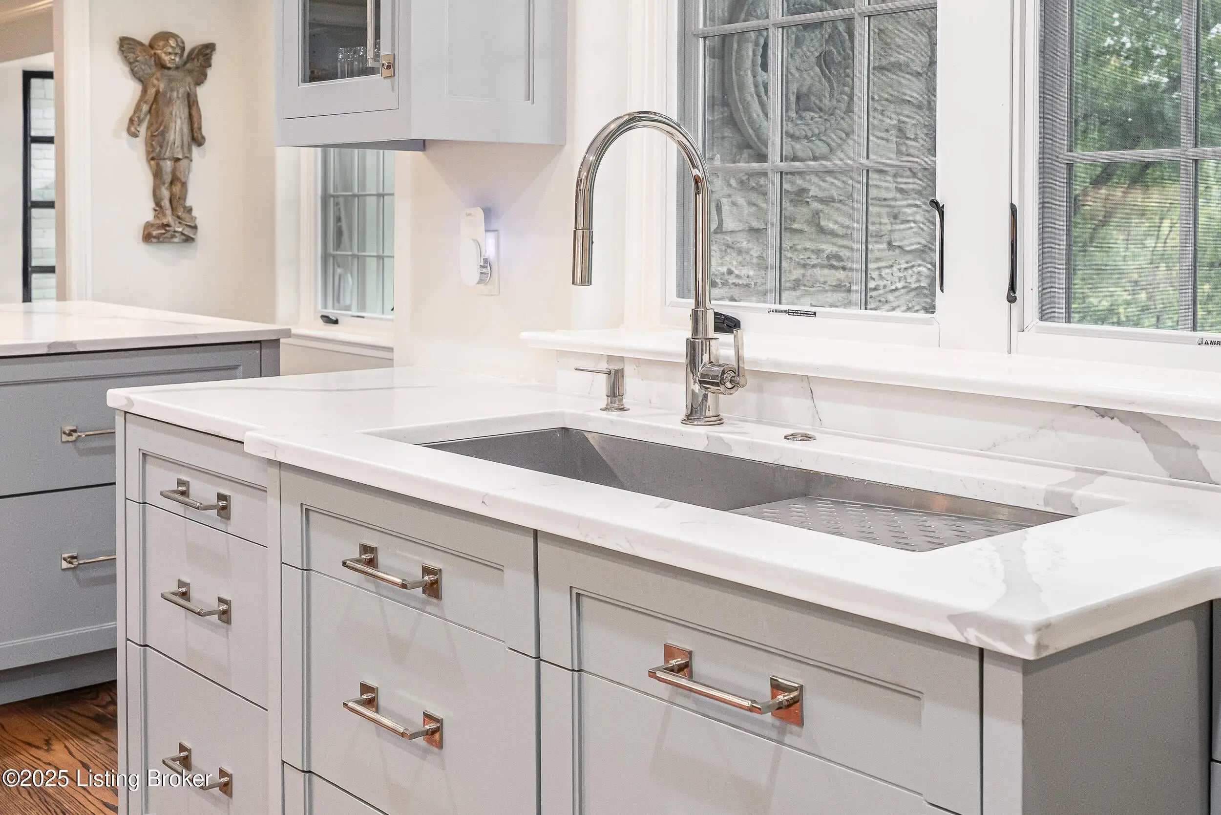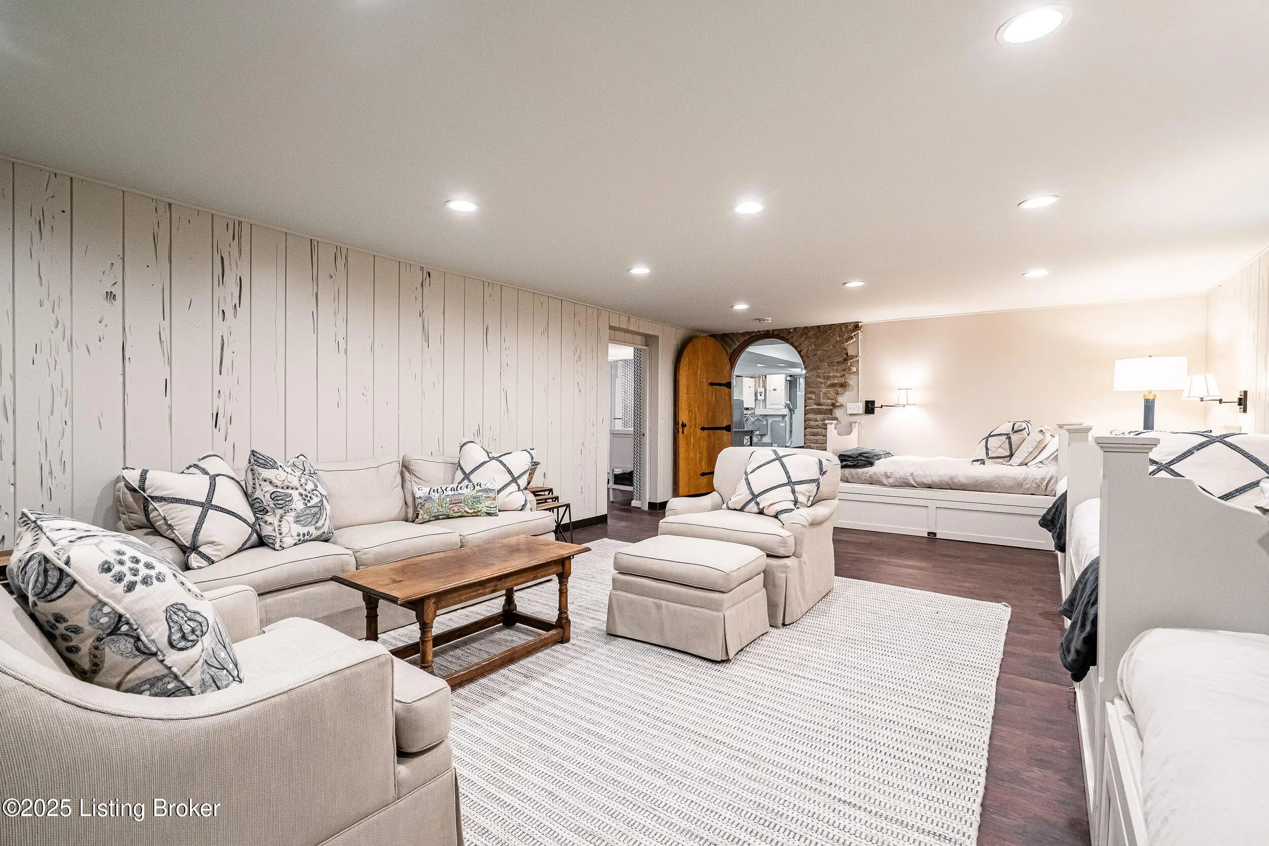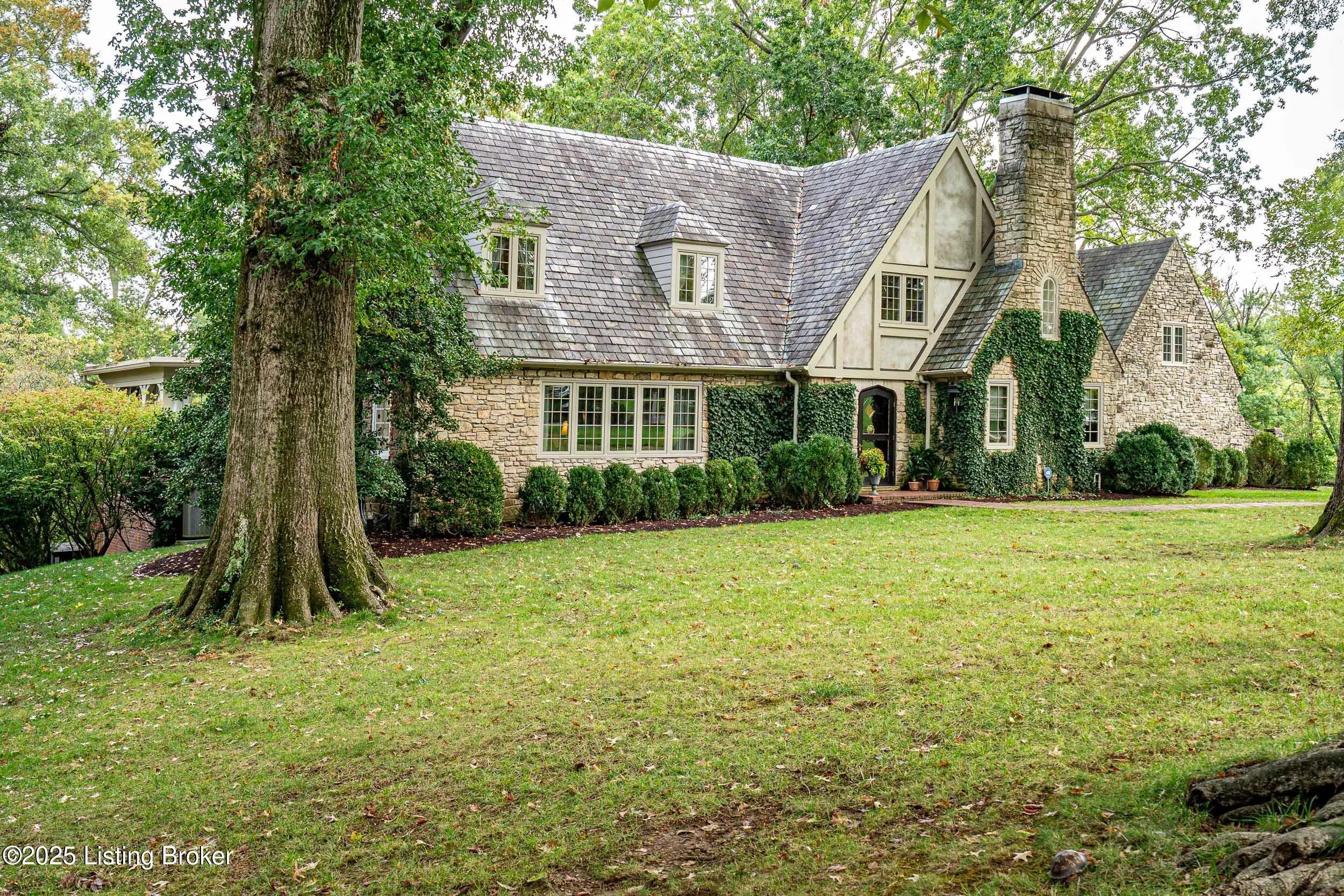 Stratton Hammon Masterpiece in Indian Hills | Timeless Elegance Nestled on 2.39 lush, meticulously landscaped acres in the heart of Indian Hills, this extraordinary 1937 creekstone Tudor is a rare opportunity to own a piece of Louisville's architectural history. Designed by the renowned local architect Stratton Hammon, this timeless residence combines historic charm with thoughtful modern updates, creating a one-of-a-kind estate perfect for refined living and entertaining. The home's stunning creekstone exterior, adorned with English ivy, is crowned by a slate roof and accented by classic statement windows, a picture of enduring beauty and craftsmanship. Step into the welcoming foyer, flanked by two charming closets, and ascend into the central hall, where a beautifully detailed staircase provides a warm introduction to the home's sophisticated interiors. At the heart of the home lies the central dining room, perfectly situated between the renovated chef's kitchen, complete with top-of-the-line Sub-Zero appliances, quartz countertops, a spacious island, refrigerated drawers, and icemaker, and the cozy, bookcase-lined family room with a wood-burning fireplace. To the left of the foyer, the grand living room impresses with tall ceilings, a gas fireplace, and dual openings that flow seamlessly into the adjacent family room, offering an effortless layout for hosting gatherings both large and intimate. Just beyond the family room, two sets of French doors open to an expansive veranda, a true entertainer's dream. This outdoor retreat features a wood-burning fireplace, hanging daybed, and multiple sitting and dining areas, all overlooking the stunning rear yard and formal parterre gardens. Inside, additional first-floor highlights include a cozy den with wood-paneled walls and a fireplace, an attached sitting room/wet bar, a formal half bath, and a versatile gym or office with an adjacent full bath and walk-in pantry. The second level, accessible by both the main and kitchen staircases, offers a spacious guest suite with en suite bath, two large bedrooms with a shared hall bath (dual vanities), a laundry closet, and a showstopping primary suite. The primary suite features custom built-in closets, window nooks, and a luxurious bath finished in white marble, with a soaking tub, glass shower, and dual vanities. The lower level continues to impress with a large recreational bunk room, anchored by a creekstone fireplace, ideal for movie nights, sleepovers, or a general play space. A unique bathroom on this level includes dual vanities and three individual showers, providing flexibility and function for guests or family. Additional property features include: A rear shed with a brick rooftop terrace/ grill space, a full house generator, plans for a 2-car garage with an elegant porte cochère and motor court, and a custom-designed guest carriage house & office This rare offering blends timeless elegance, architectural pedigree, and modern comfort in one of Louisville's most prestigious neighborhoods. For more information or to schedule a private showing, please contact the listing agents.