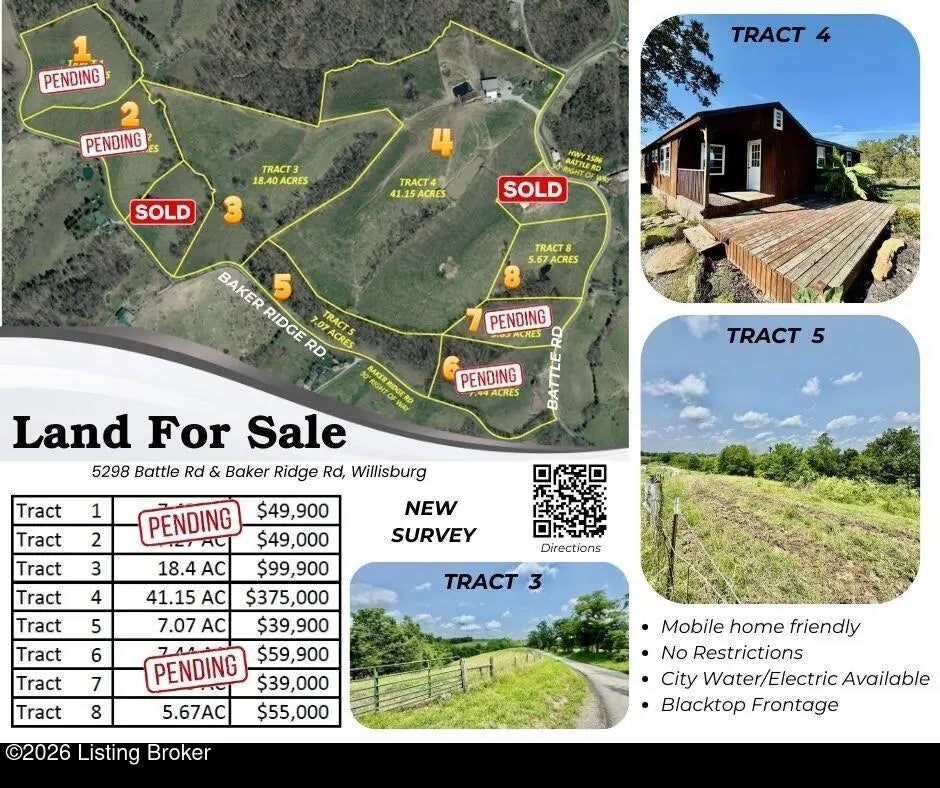 Brand New Survey! Tract 2 (7.27ac) of this 105+/- acre farm currently being surveyed into 10 tracts offers numerous build sites agreeable ridges, some scattered woods, and a few ponds, as well as low lying creeks. The farm has frontage on Battle Rd as well as Baker Ridge Rd with city water and electricity available at the roads. The land has predominantly been used for livestock grazing, but also offers great hunting with some native grasses for a hay crop. Located within an hour drive of Louisville & Lexington and minutes of the Bluegrass Parkway! Call today to explore the options that the different tracts have to offer!