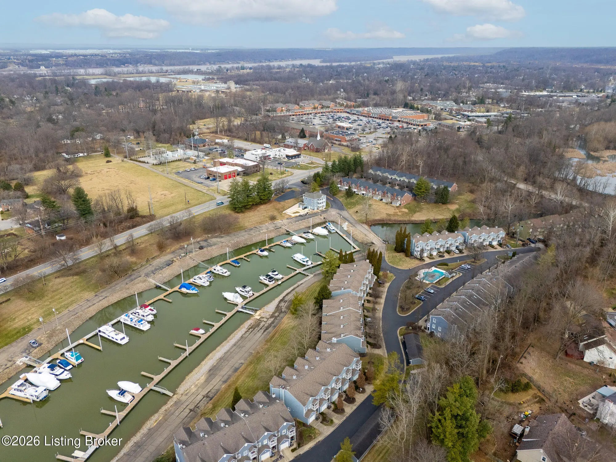 Welcome to 5002 Harrods Landing Drive, where convenience meets low-maintenance living! This 2 bedroom, 3.5 bath townhome is conveniently located just off US-42. The community maintains well-kept grounds that create strong curb appeal from the moment you arrive. Enter through either the front door or the attached garage to find a welcoming entry with a convenient half bath and storage closet. The kitchen offers a thoughtful layout with stainless steel appliances, ample cabinet and counter space, and room for a small dining table, perfect for casual meals. A serving window opens to the living area, creating an easy flow for everyday living and entertaining. The living space has a cozy gas fireplace and offers plenty of room for a large seating area and full size dining table. Double doors lead to the first level deck with views of Harrods Creek Marina, an ideal spot to enjoy morning coffee or watch the boats go by in the warmer months. Tucked discreetly off the living area, the walkout basement provides flexible space for a second living area, home office, playroom, or guest suite. This level walks out to a private patio with green space beyond and ground-level marina views, and includes a full bath, laundry area, and additional storage. Upstairs, both bedrooms feature en-suite bathrooms and high ceilings throughout. The primary suite is located at the rear of the home and offers a private second-floor deck overlooking the marina. The en-suite bath includes a double vanity, large jetted tub, separate walk-in shower, and walk-in closet. The hallway provides exceptional storage with three large closets, one including additional laundry hookups for added convenience. The second bedroom is generously sized with its own walkout deck facing the front of the home and an en-suite bath with a large vanity and jetted tub/shower combo. This townhome offers privacy, versatile living spaces, and access to a community pool, all while being conveniently located across from Prospect Kroger, restaurants, and more!