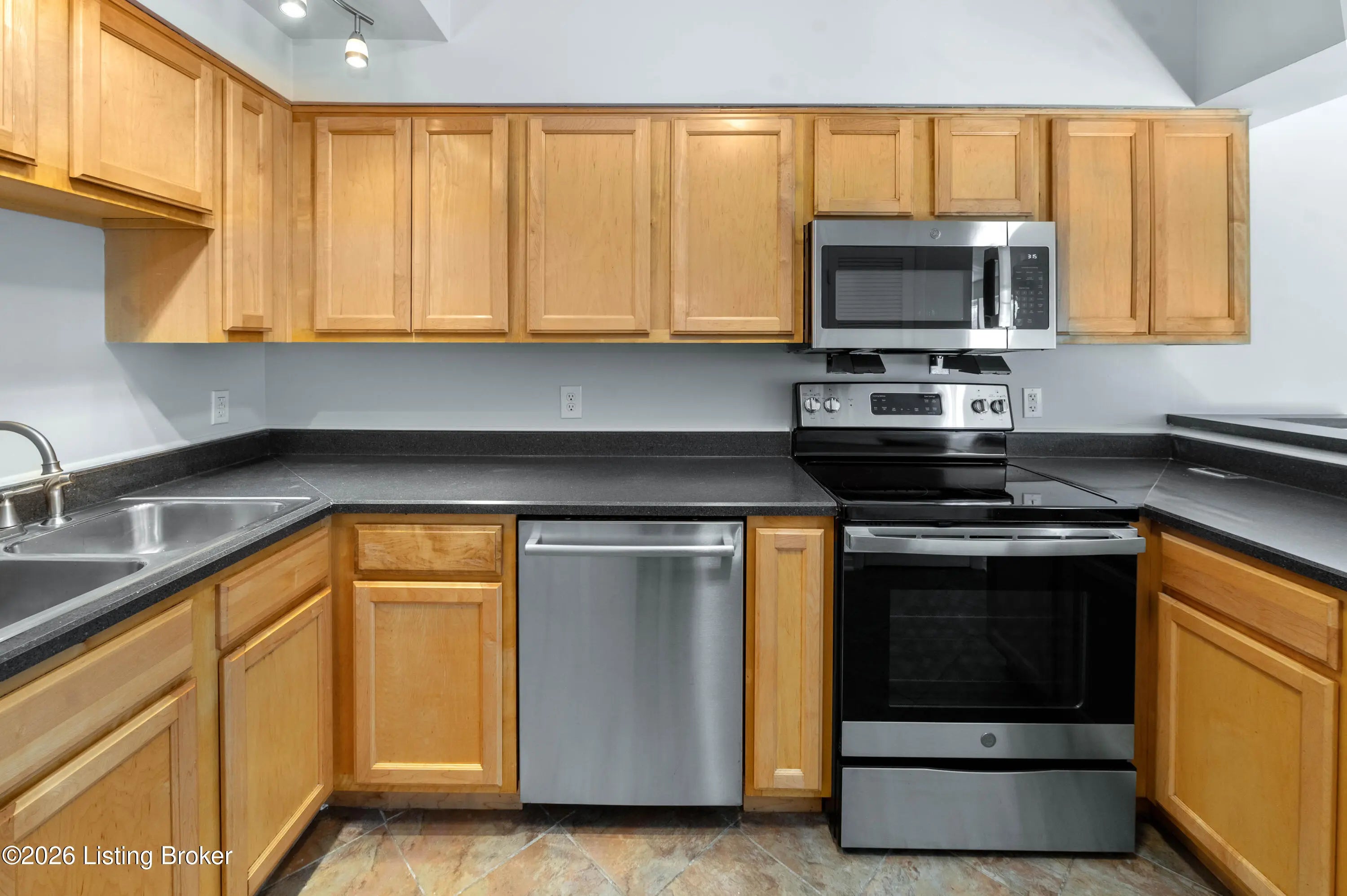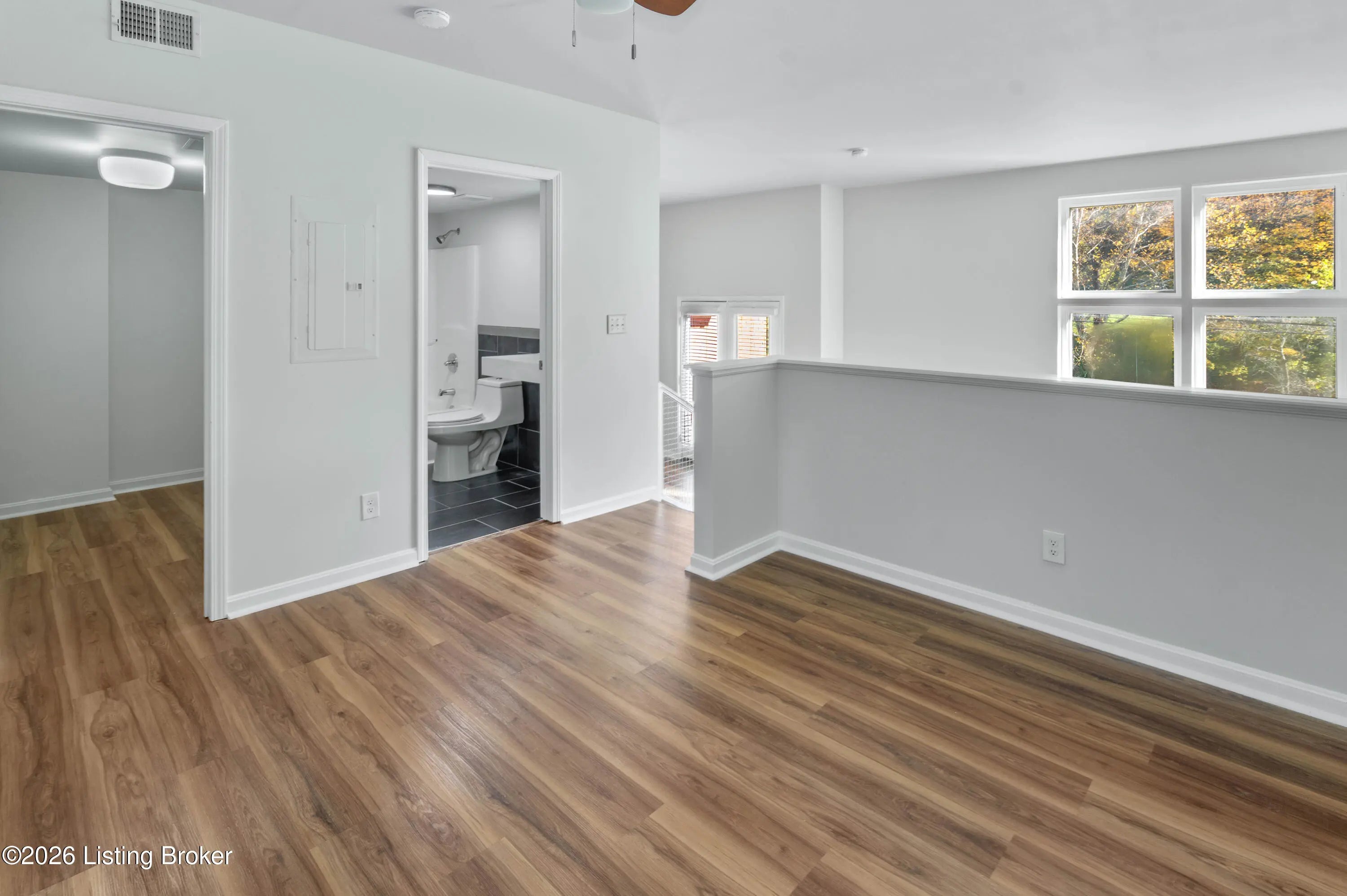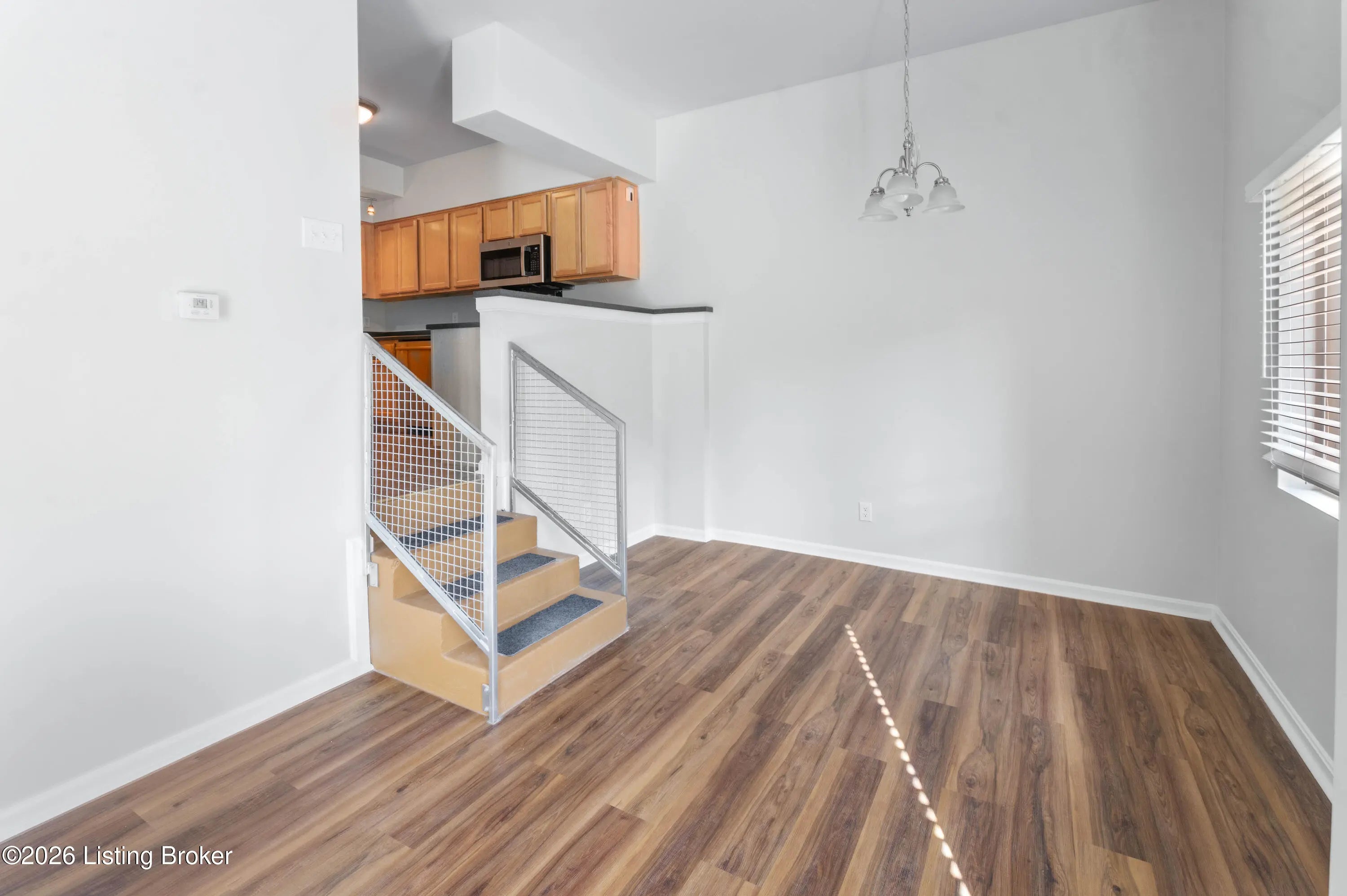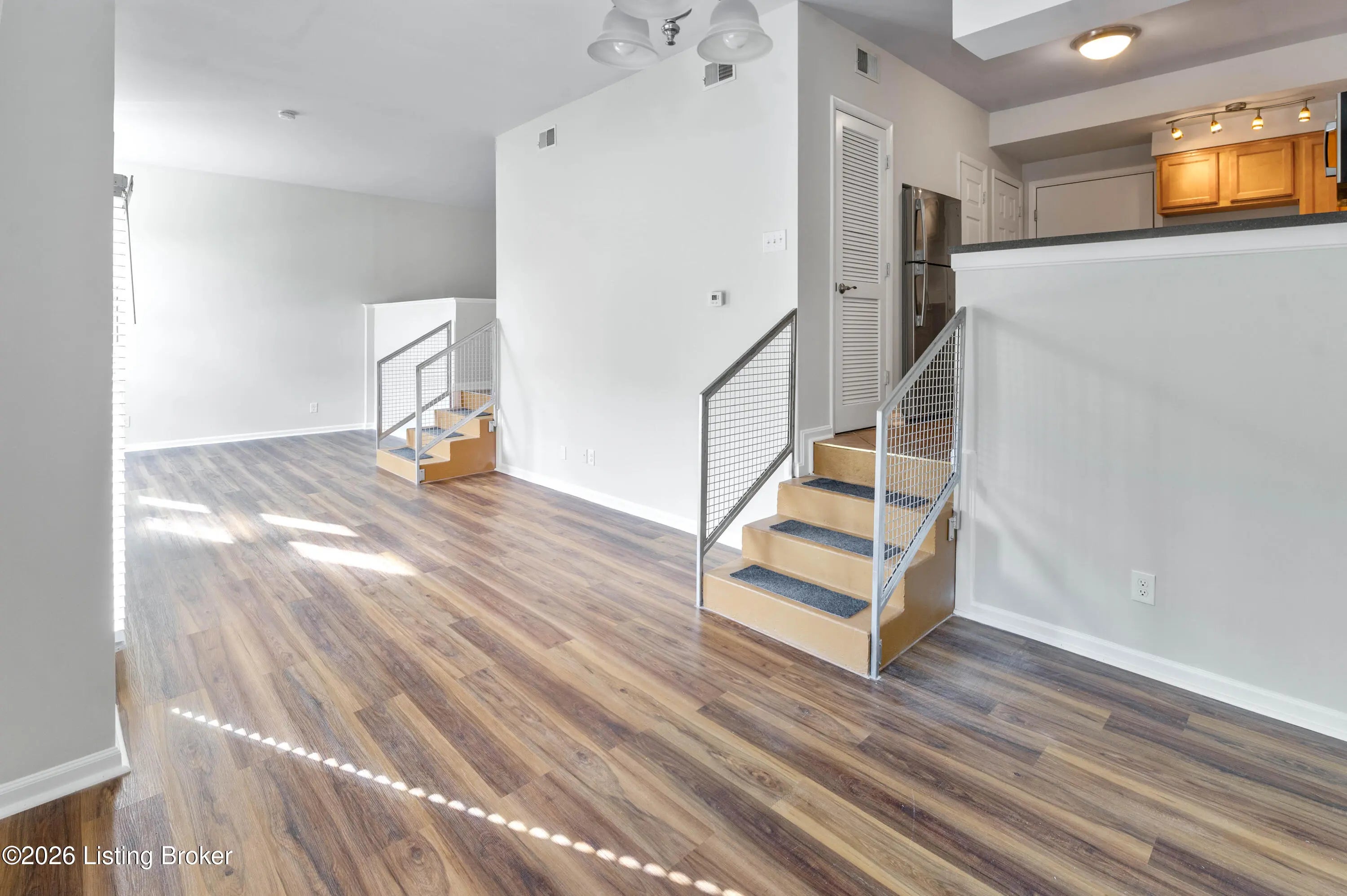 This bright, modern apartment features an open-concept with a stylish kitchen, showcasing warm wood cabinetry, dark countertops, and stainless steel appliances. Updated vinyl plank flooring runs throughout the living spaces, complemented by abundant natural light. The multi-level design adds architectural interest and functional separation, enhanced by contemporary railings and clean, neutral finishes. The renovated bathroom offers updated fixtures and a fresh, modern feel. Situated in the desirable Crescent Hill neighborhood, known for its tree-lined streets and historic charm, this location offers convenient access to Frankfort Ave, local dining, parks, and downtown Louisville, combining a walkable lifestyle with everyday convenience. Move in ready - check it out today!
