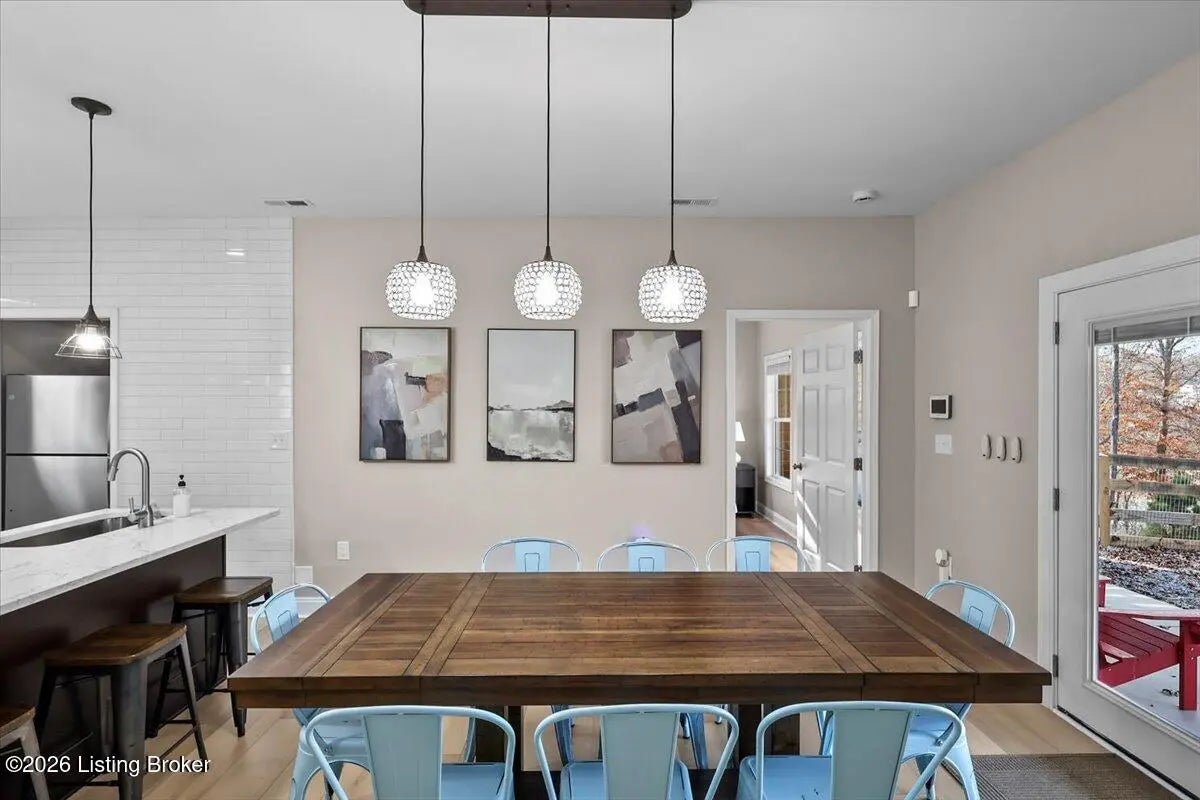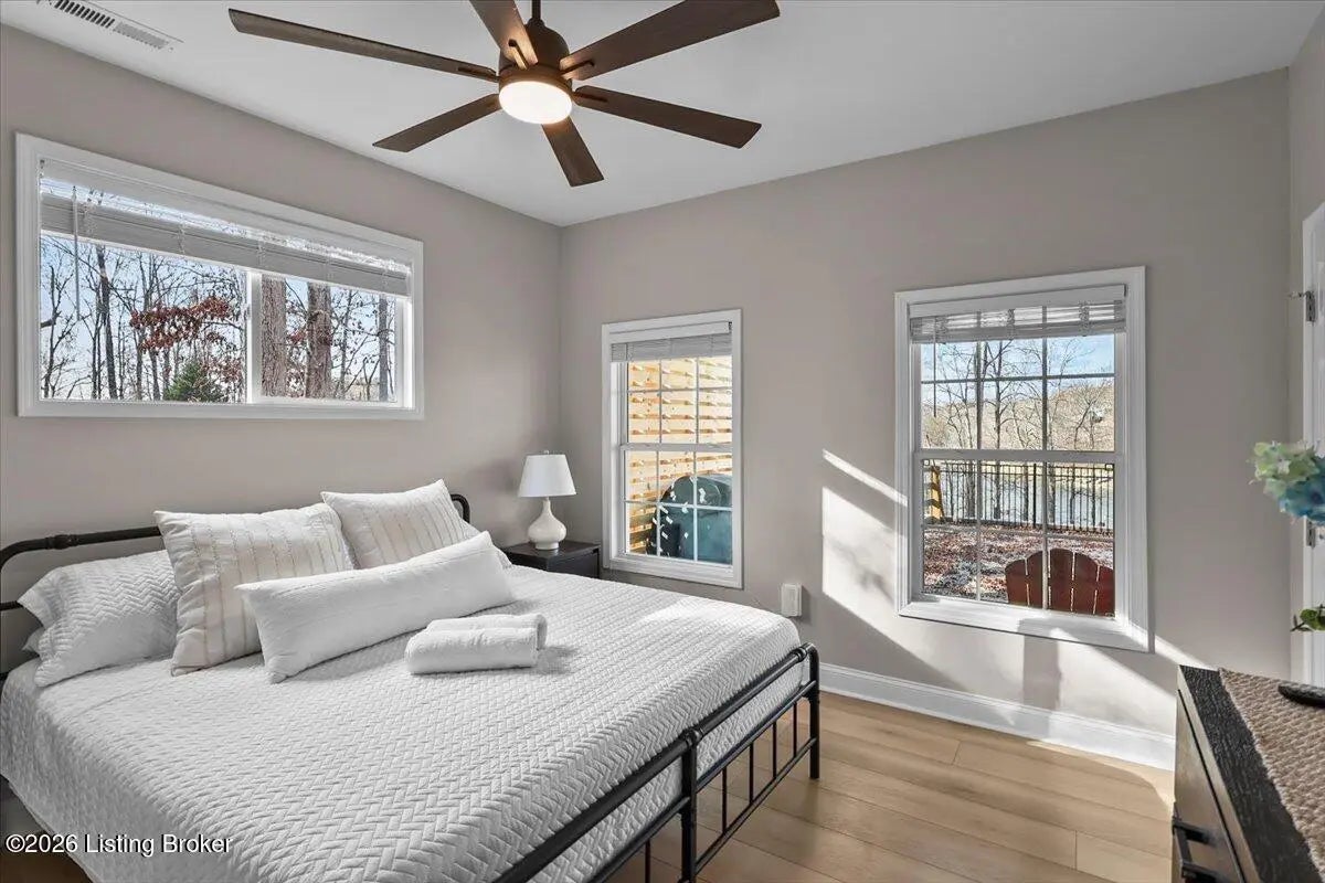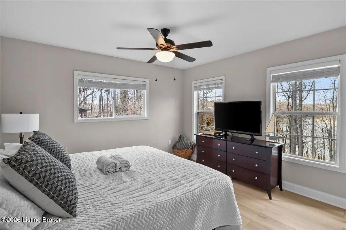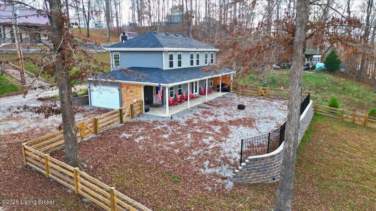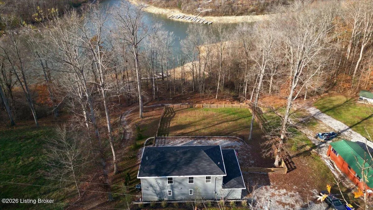 True Waterfront Living on Nolin Lake! This rare double lakefront lot offers direct water access and breathtaking lake views, making it an exceptional find. This 4-bedroom, 2.5-bath home is designed for effortless lake living. The main level features an open-concept living and kitchen area with major appliances, plus a private primary suite with its own bath. Upstairs includes three additional bedrooms, a full bathroom, and a second living area with a desk—perfect for hosting guests or remote work. Outdoors, enjoy a fenced backyard, a relaxing fire pit area, and your own private dock just steps from the home (dock transfer available with COE approval). Wake up to the water, spend your days on the lake, and unwind by the fire. This is Nolin Lake at its best.