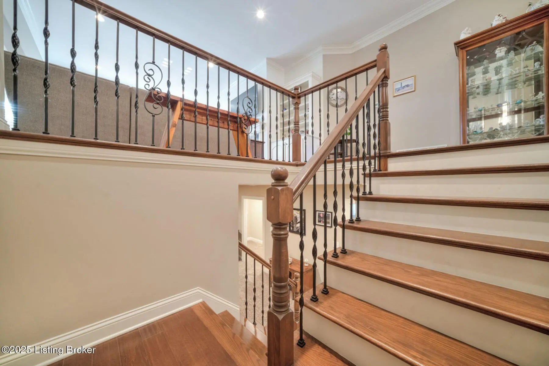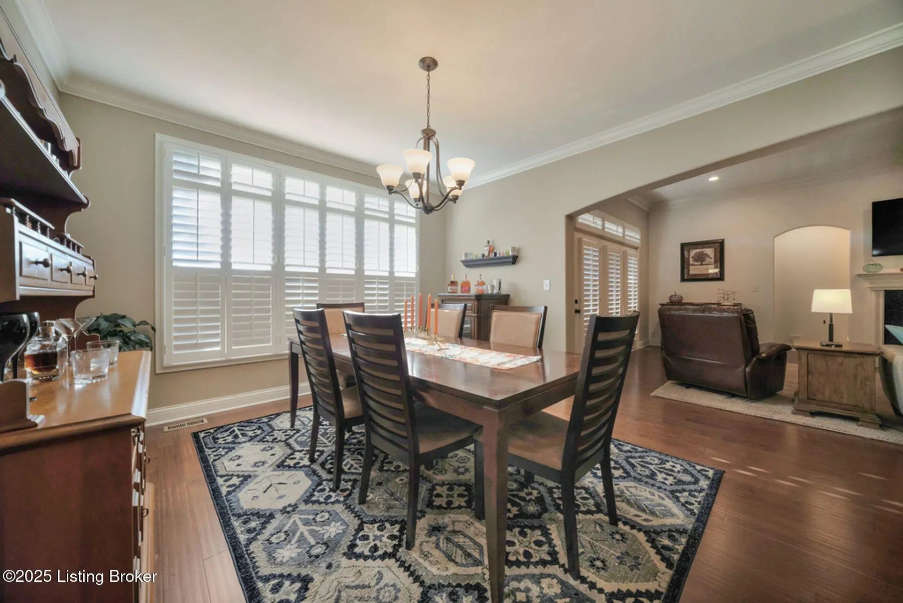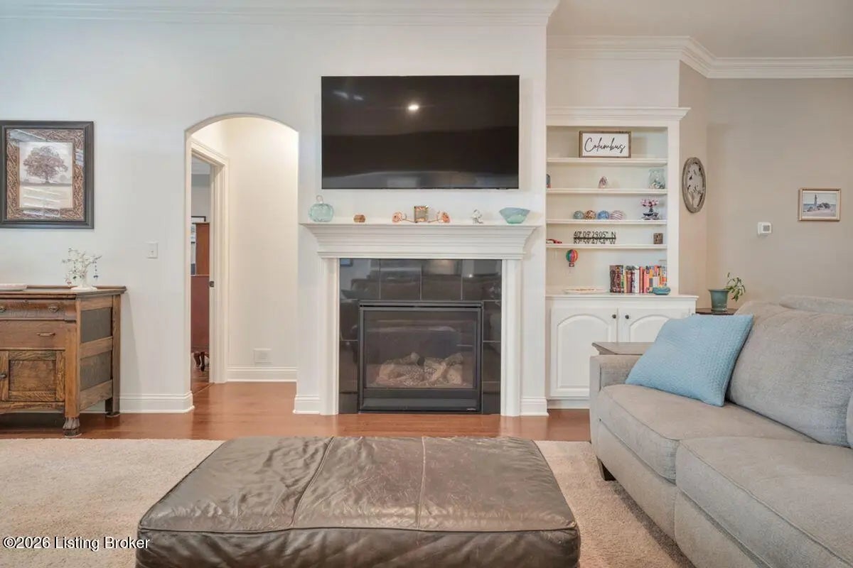 Custom-built home designed for comfortable living and effortless entertaining in the desirable Rock Springs community, offering 5 bedrooms, 3 full baths, and a finished lower level. A covered front porch and striking two-story elevation provide excellent curb appeal. The open, light-filled main level showcases rich architectural details, engineered hardwood floors, and a great room with 10' ceilings, custom built-ins, and a gas fireplace, flowing seamlessly into the dining area and gourmet kitchen featuring a large island, granite countertops, stainless steel appliances, gas cooktop, under-cabinet lighting, and custom cabinetry. The private primary suite offers a tray ceiling and spa-style bath with dual vanities, soaking tub, tiled walk-in shower, and custom walk-in closet. Two additional main-level bedrooms and a full bath with quartz countertops provide flexible living options. The finished lower level includes a spacious family or media room, two bedrooms with egress windows, a full bath, and ample storage. Enjoy outdoor living on the covered rear patio overlooking a fenced, landscaped backyard. Additional highlights include plantation shutters, crown molding, an epoxy-coated oversized two-car garage, and security system. Conveniently located minutes from Springhurst, Norton Commons, dining, shopping, and entertainment.