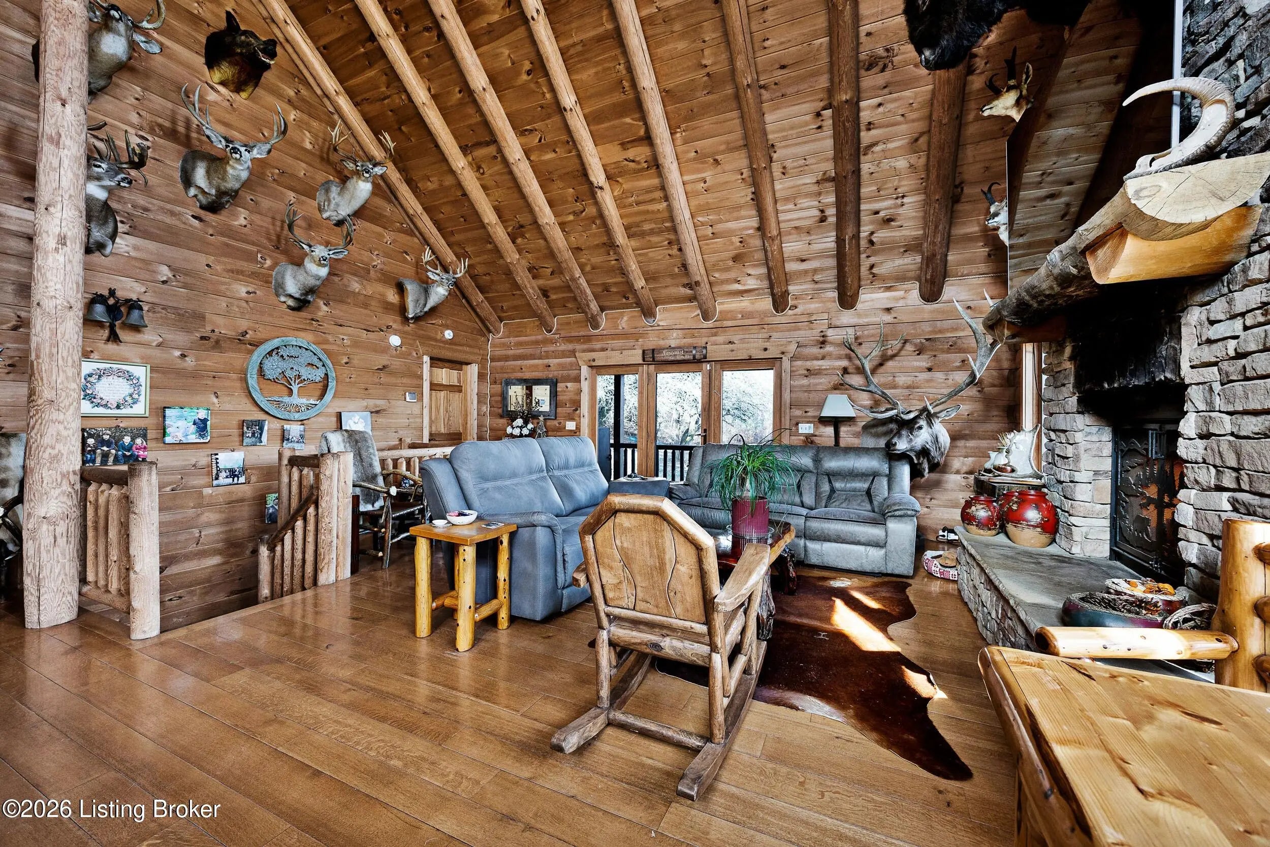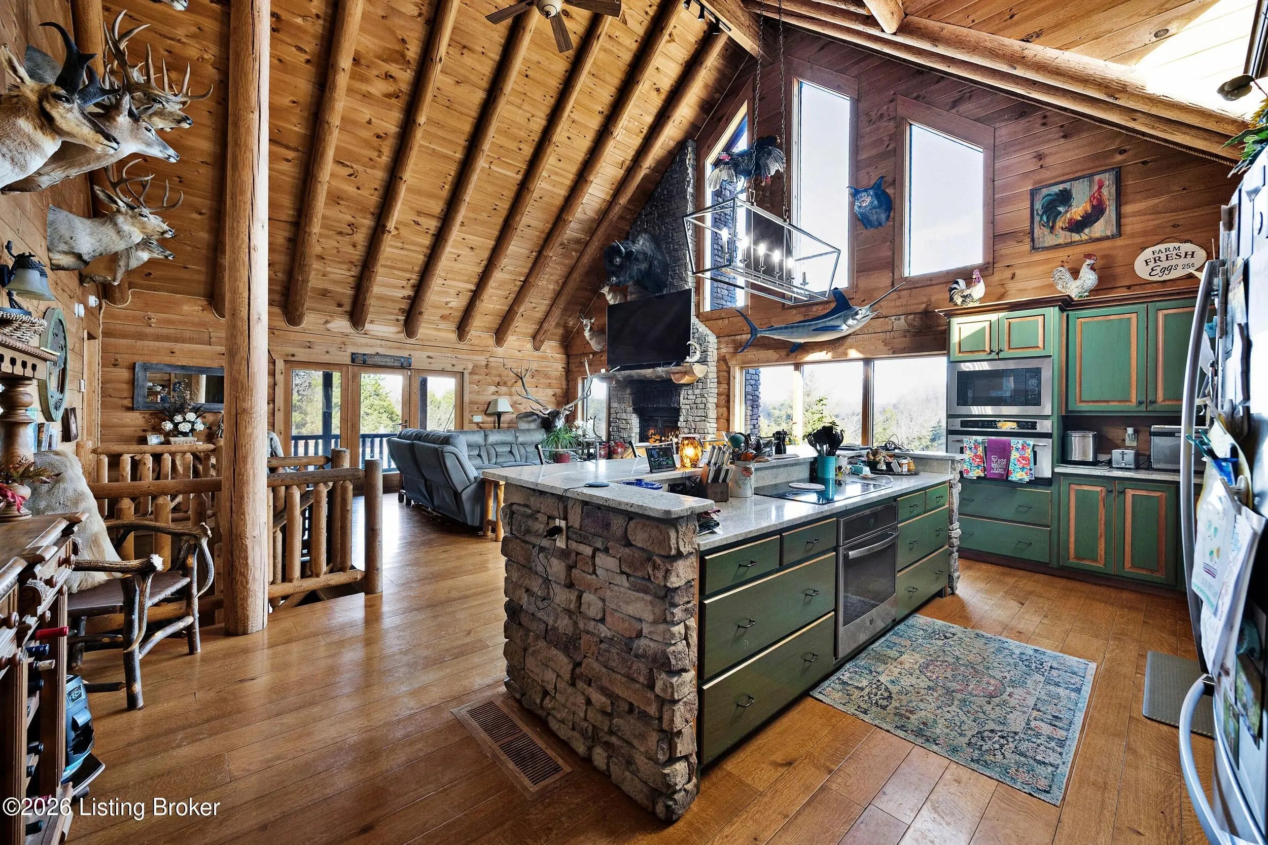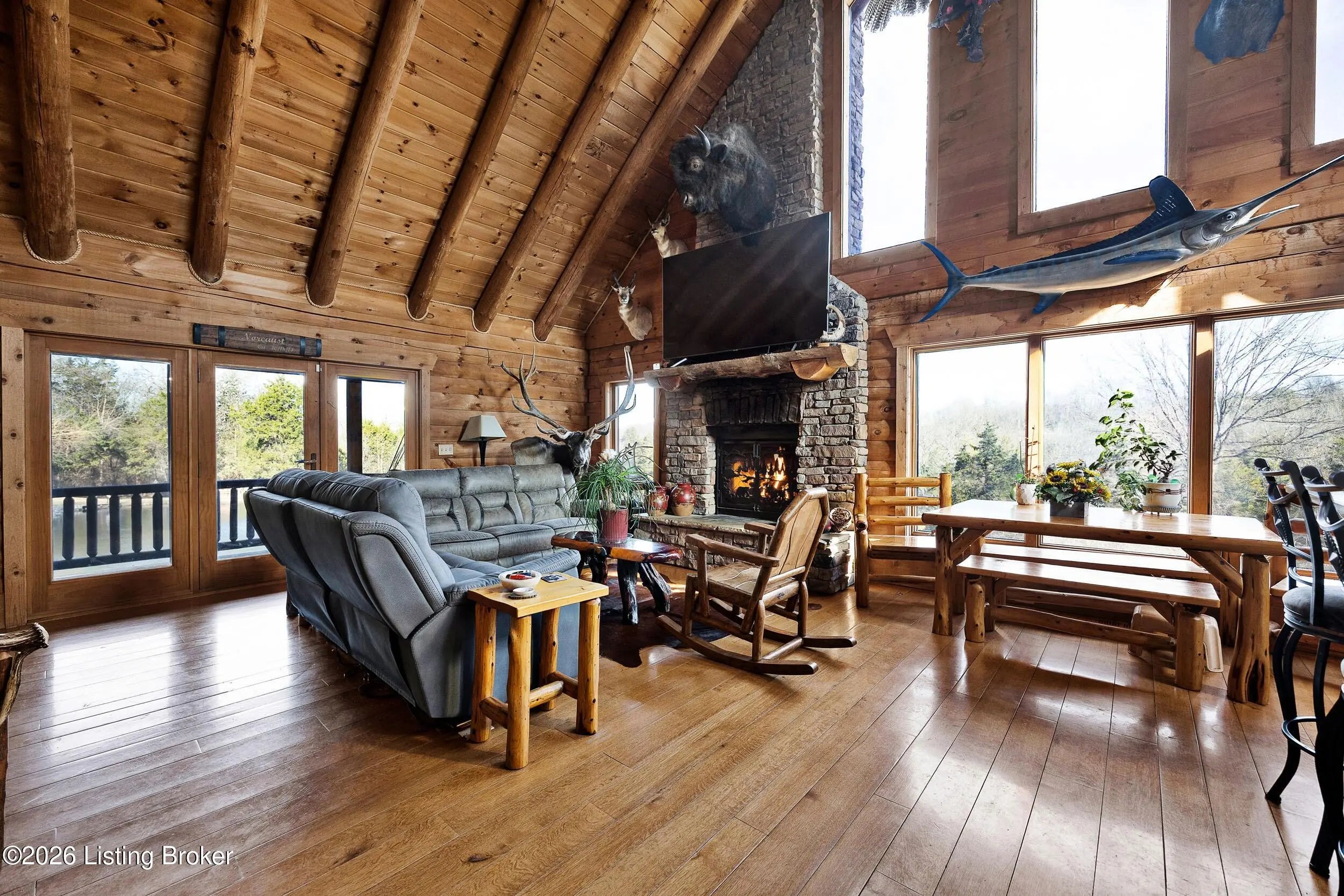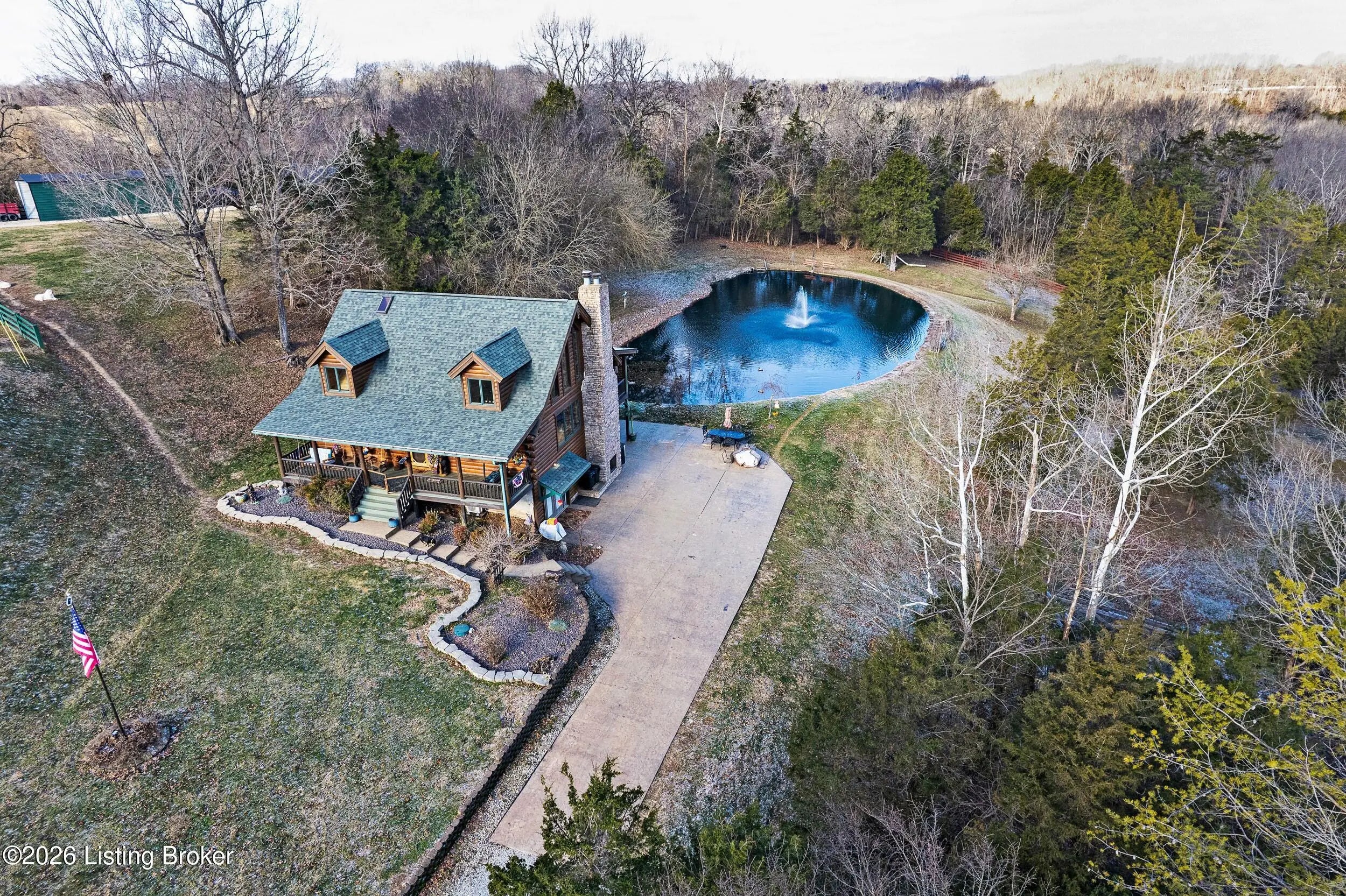 Tucked away on 10.11 acres of sprawling countryside and located just miles from town, this property offers truly one-of-a-kind views and privacy. This beautiful rustic log home offers an open floor plan that boasts a spacious two story living room, vaulted ceilings and a beautiful stone fireplace for those cozy winter days. The kitchen is well-appointed with custom cabinetry and a full suite of stainless-steel appliances. The main level is completed by a primary en suite, a guest powder room, and a convenient laundry room. The walkout basement provides additional living space with a large family room, a second full kitchen, two generously sized bedrooms, and a custom full bath featuring a large tiled walk-in shower. This finished lower level is ideal for accommodating guests, extended family, or holiday gatherings. Outside, the beautifully landscaped grounds include section fencing, perfectly suited for livestock or a hobby farm setup. A scenic fully stocked lake visible from multiple views at the rear of the home. The property also offers two metal shop buildings, a covered canopy, and additional storage buildings-providing ample space for equipment, hobbies, or storage needs. A large outdoor fireplace creates an inviting space for entertaining or relaxing with family and friends. This peaceful and scenic retreat offers a rare combination of privacy, functionality, and natural beauty and must be seen to be fully appreciated.