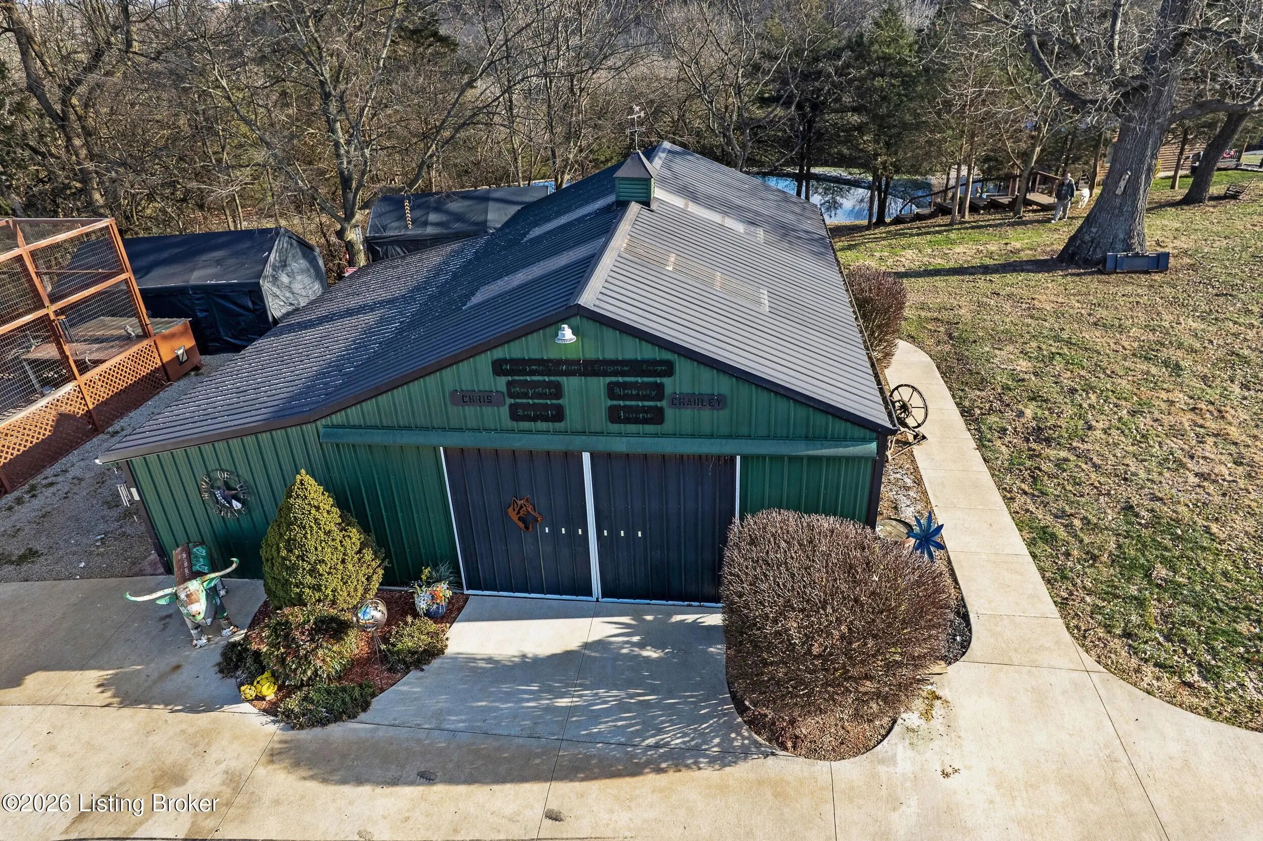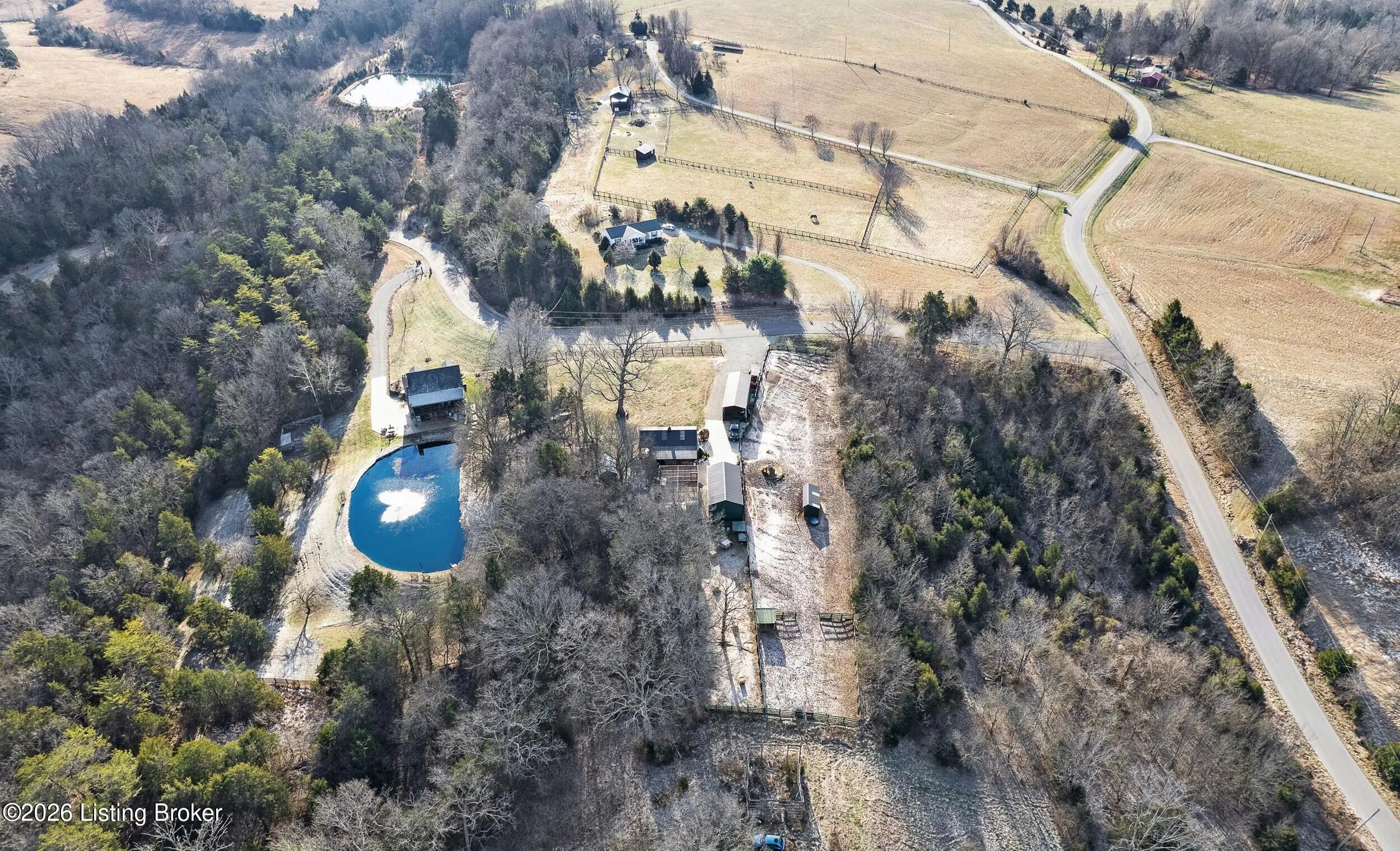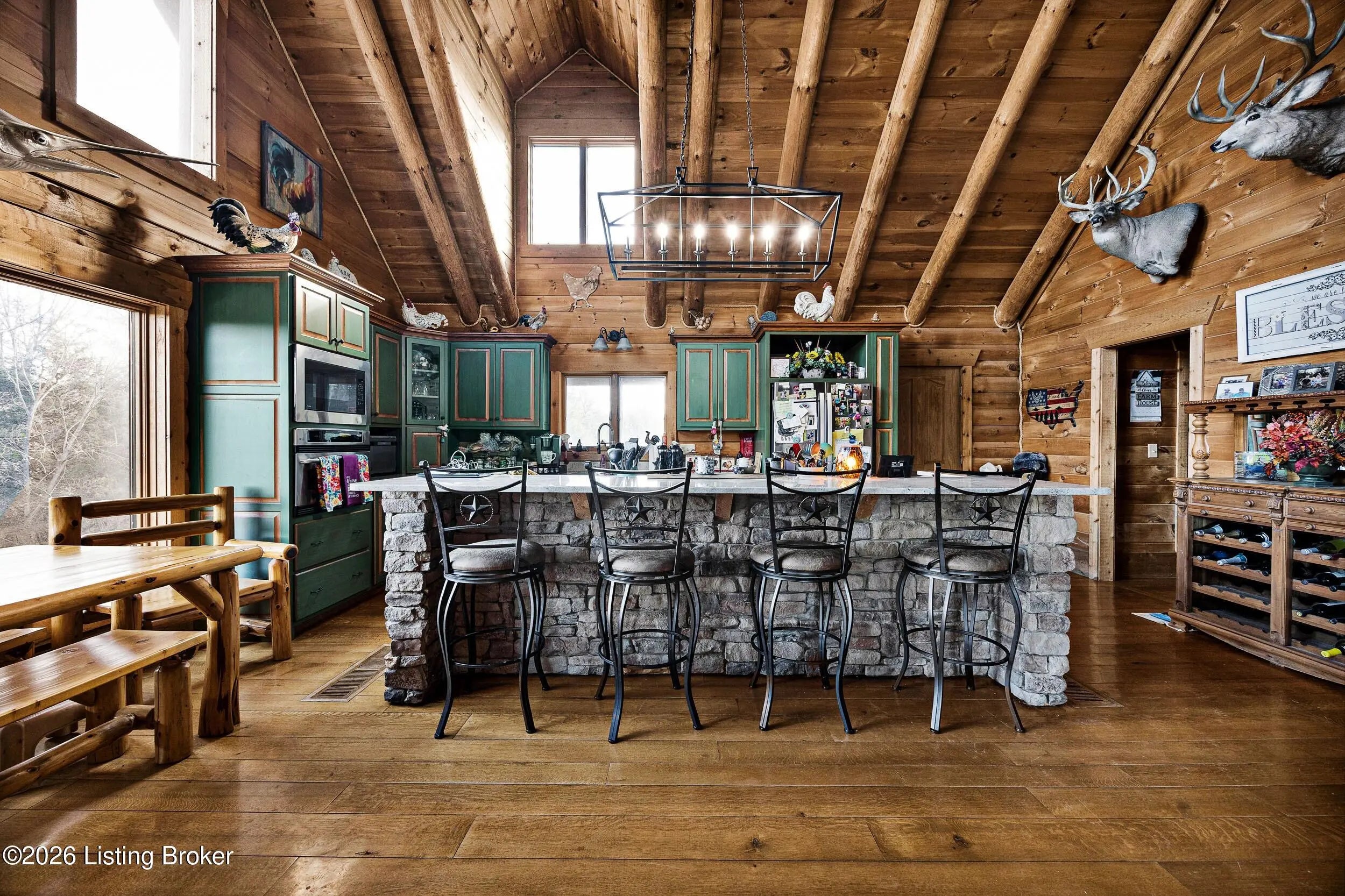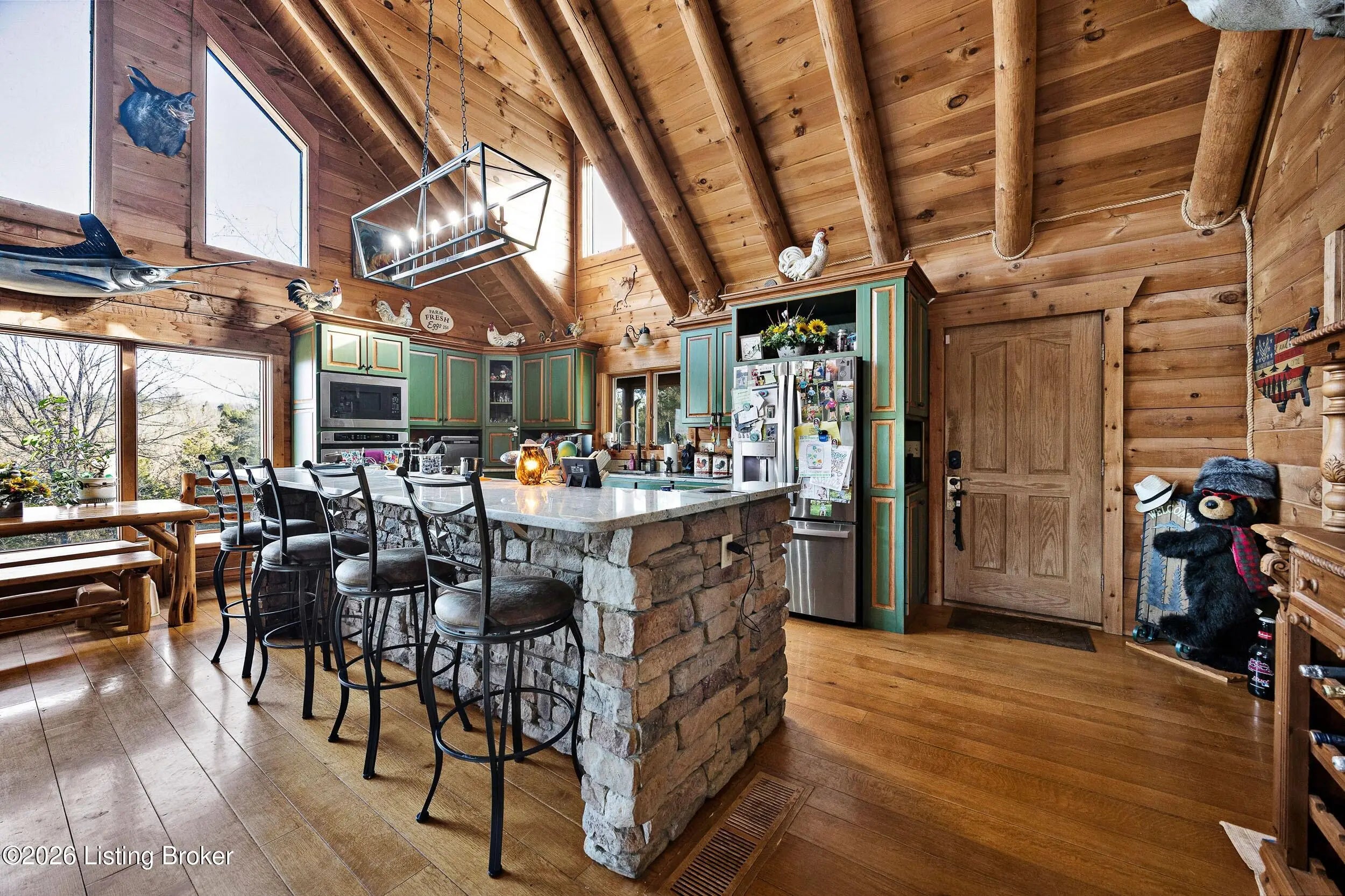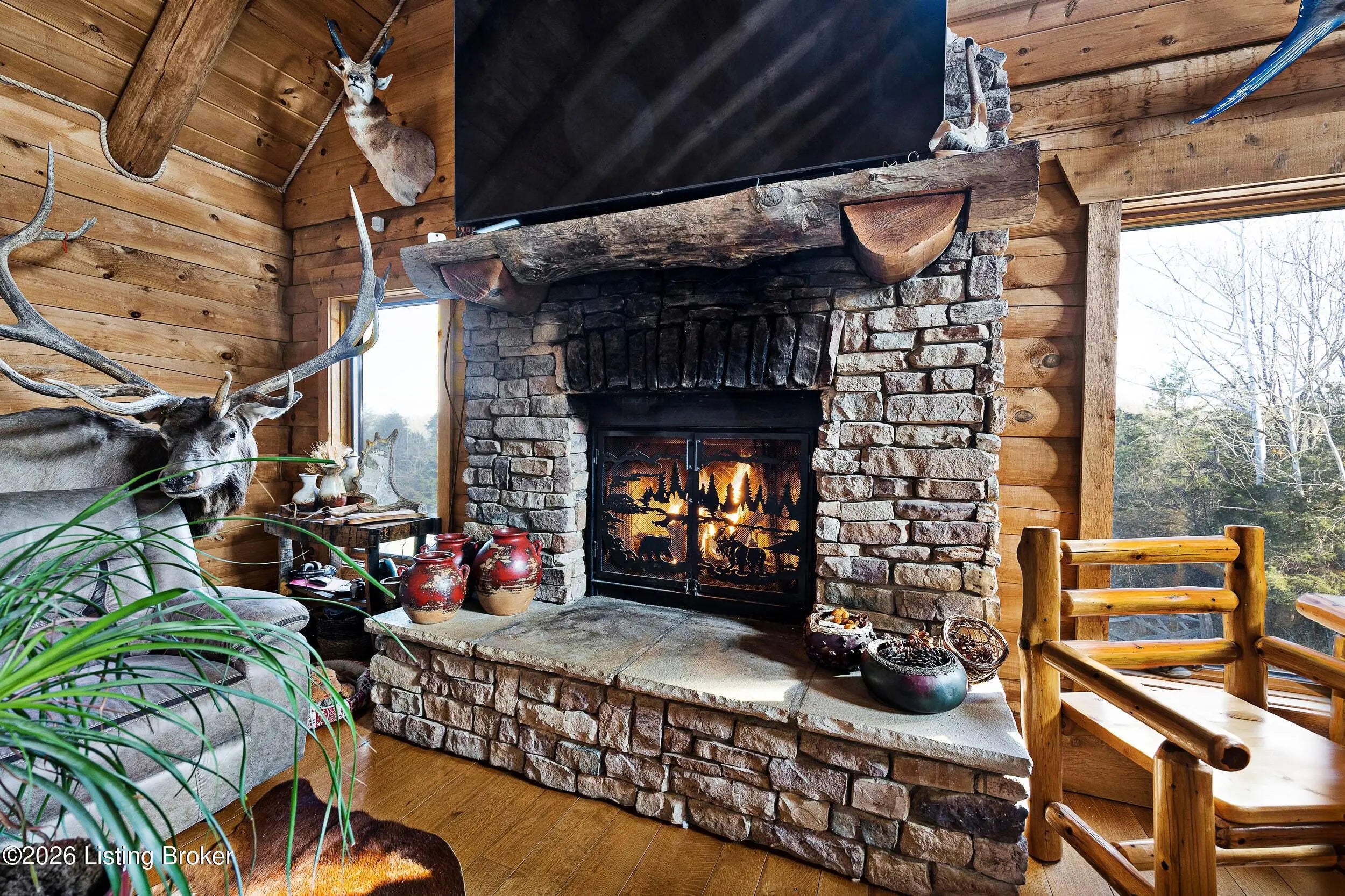 Tucked away on 10.11 acres of sprawling countryside and located just miles from town, this property offers truly one-of-a-kind views and privacy. This beautiful rustic log home offers an open floor plan that boasts a spacious two story living room, vaulted ceilings and a beautiful stone fireplace for those cozy winter days. The kitchen is well-appointed with custom cabinetry and a full suite of stainless-steel appliances. The main level is completed by a primary en suite, a guest powder room, and a convenient laundry room. The walkout basement provides additional living space with a large family room, a second full kitchen, two generously sized bedrooms, and a custom full bath featuring a large tiled walk-in shower. This finished lower level is ideal for accommodating guests, extended family, or holiday gatherings. Outside, the beautifully landscaped grounds include section fencing, perfectly suited for livestock or a hobby farm setup. A scenic fully stocked lake visible from multiple views at the rear of the home. The property also offers two metal shop buildings, a covered canopy, and additional storage buildings-providing ample space for equipment, hobbies, or storage needs. A large outdoor fireplace creates an inviting space for entertaining or relaxing with family and friends. This peaceful and scenic retreat offers a rare combination of privacy, functionality, and natural beauty and must be seen to be fully appreciated.