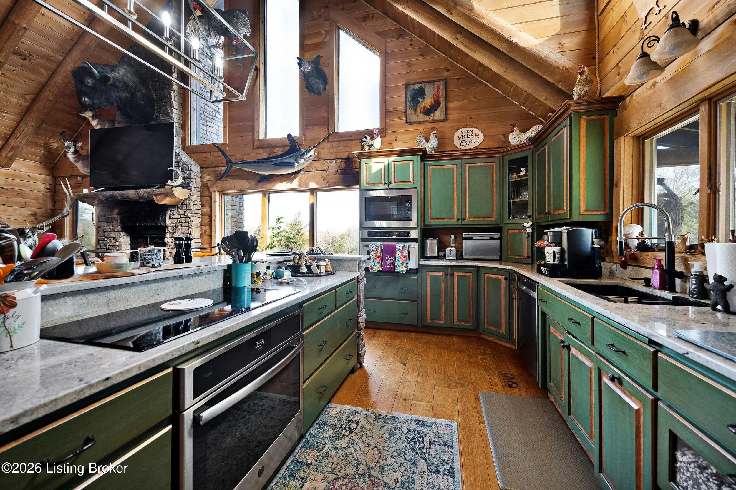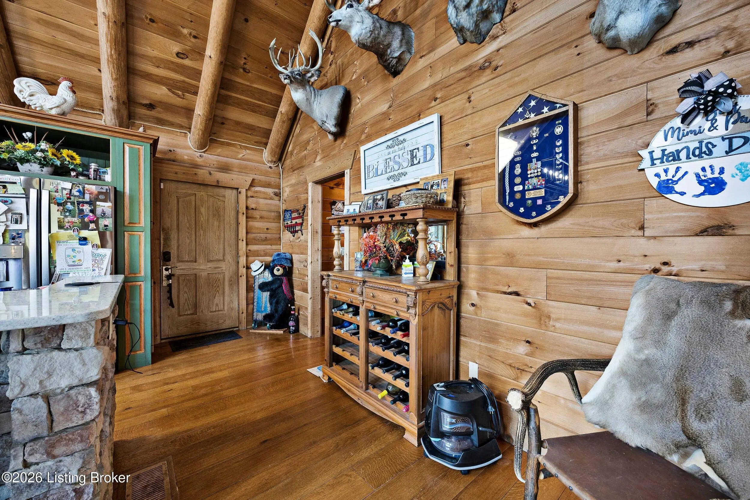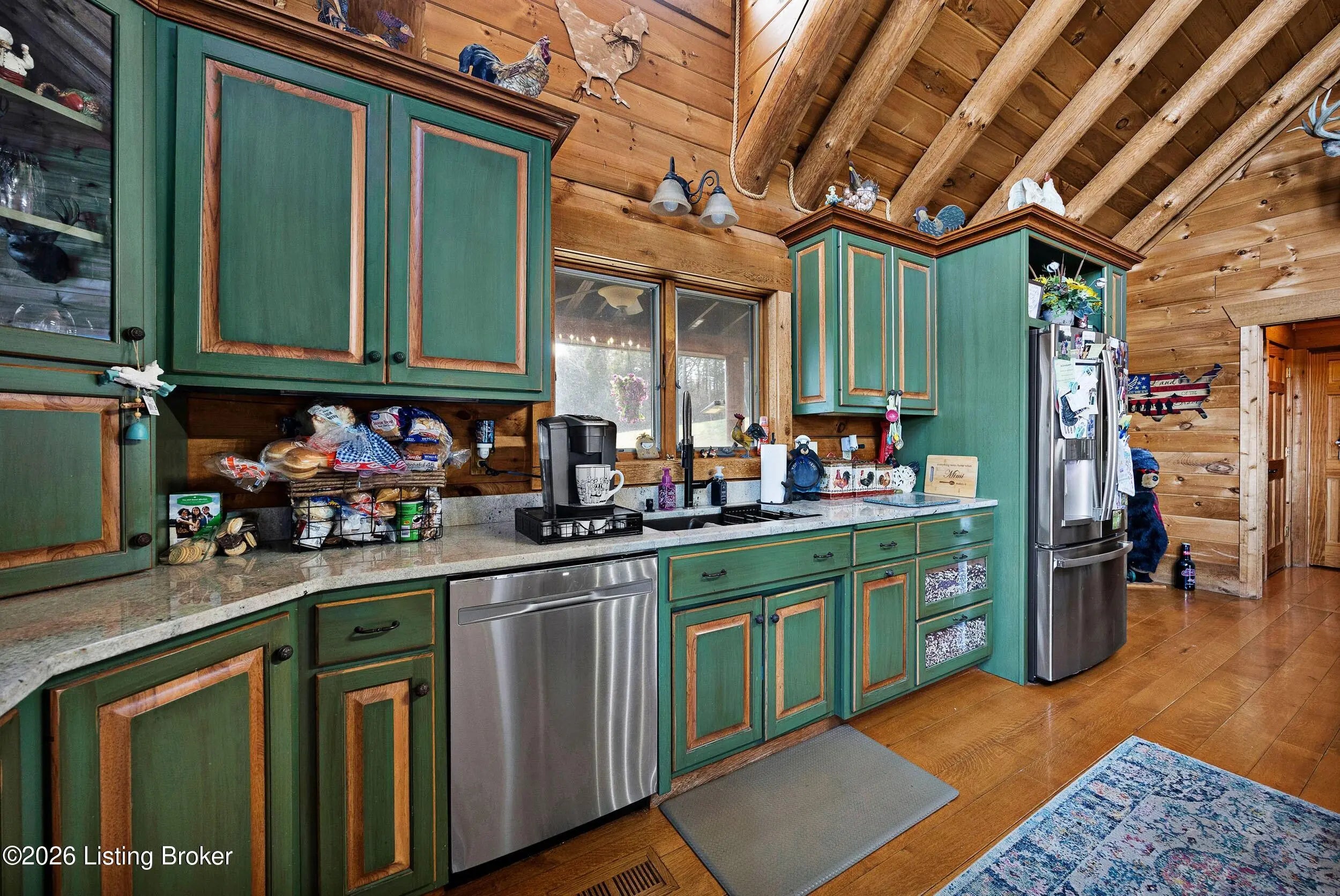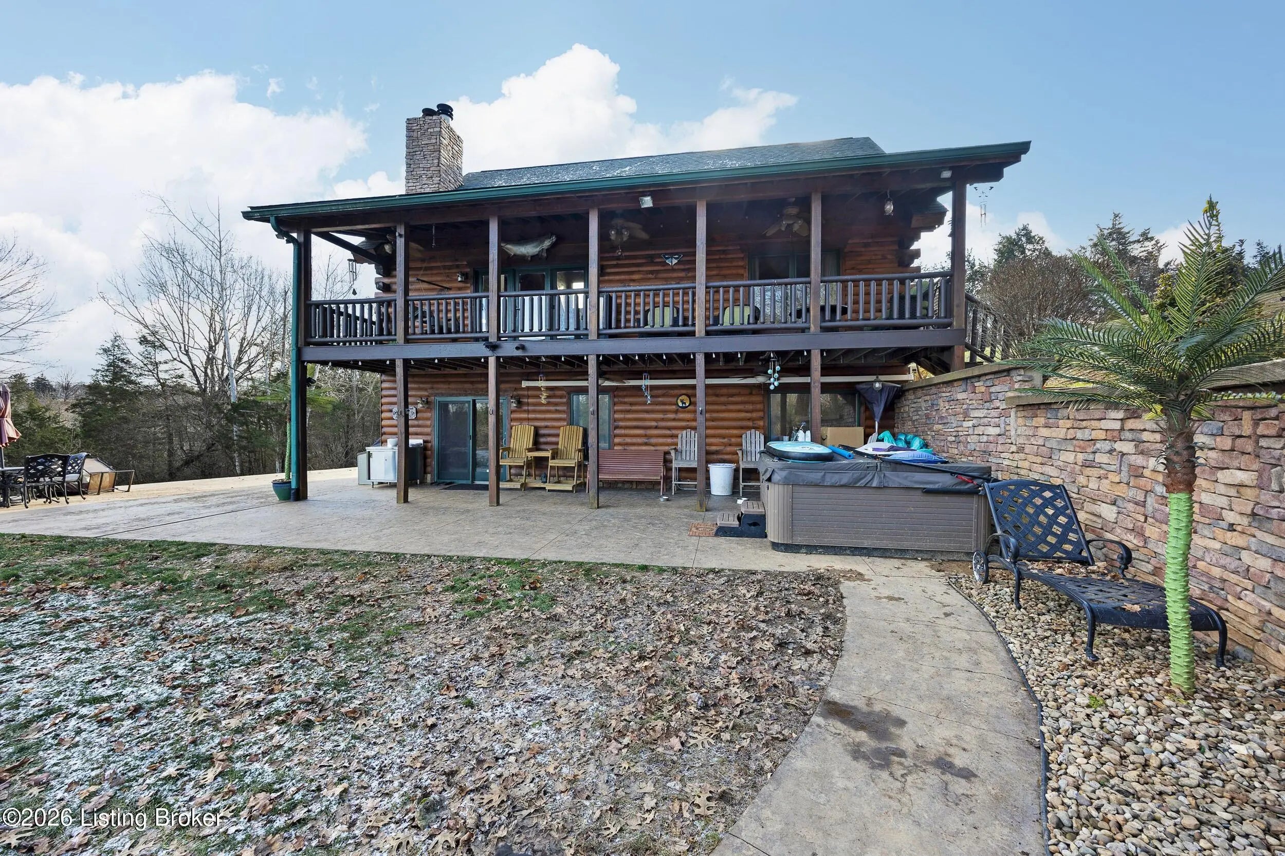 Tucked away on 10.11 acres of sprawling countryside and located just miles from town, this property offers truly one-of-a-kind views and privacy. This beautiful rustic log home offers an open floor plan that boasts a spacious two story living room, vaulted ceilings and a beautiful stone fireplace for those cozy winter days. The kitchen is well-appointed with custom cabinetry and a full suite of stainless-steel appliances. The main level is completed by a primary en suite, a guest powder room, and a convenient laundry room. The walkout basement provides additional living space with a large family room, a second full kitchen, two generously sized bedrooms, and a custom full bath featuring a large tiled walk-in shower. This finished lower level is ideal for accommodating guests, extended family, or holiday gatherings. Outside, the beautifully landscaped grounds include section fencing, perfectly suited for livestock or a hobby farm setup. A scenic fully stocked lake visible from multiple views at the rear of the home. The property also offers two metal shop buildings, a covered canopy, and additional storage buildings-providing ample space for equipment, hobbies, or storage needs. A large outdoor fireplace creates an inviting space for entertaining or relaxing with family and friends. This peaceful and scenic retreat offers a rare combination of privacy, functionality, and natural beauty and must be seen to be fully appreciated.