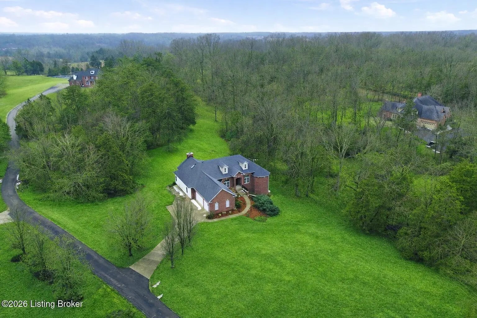 Welcome to a private, 4.75 acre property offering exceptional privacy, superior craftsmanship, and refined design. A tree-lined approach provides a striking sense of arrival, immediately setting the tone for the residence, while established perennial beds in the front yard add vibrant color from spring through fall. Inside, an inviting foyer opens to a formal sitting room with expansive views of the grounds and a distinguished dining room suited for both casual and formal gatherings. The kitchen features cherry cabinetry, newer Taj Mahal Quartzite countertops, newer appliances including a Bosch quiet dishwasher, Frigidaire Gallery microwave and oven, and a GE Café cooktop, along with counter-height seating and a generous pantry. The kitchen overlooks the great rooman impressive space highlighted by floor-to-ceiling windows that bring in abundant natural light and warmth, a wood-burning fireplace surrounded by polished stone with a gas starter, and direct access to the screened porch and adjoining deck. Together, these spaces support everyday living and create an effortless indoor-outdoor connection. The primary suite occupies its own wing and includes a tray ceiling, custom built in cabinets, a private entertainment section, a gas fireplace, direct deck access, and a well-appointed ensuite bath. The ensuite bath consists of dual sinks, a tub, separate shower, private water closet, and a large walk-in closet. Nearby, an office with double French doors and a half bath provides a convenient and private workspace. On the opposite side of the main level, two additional bedrooms each offer ensuite baths. They are connected by a centrally located sitting area finished in slate flooring, along with a sizable laundry room featuring a utility sink and access to the attached three-car garage. The walkout lower level, renovated in June 2021, significantly expands the home's living and entertaining spaces. Finished with porcelain herringbone-style tile flooring, this level offers multiple recreation zones, including a spacious family room and adjacent sitting area anchored by a third gas fireplace. A well-appointed wet bar located alongside the home theater features a sink, refrigerator, and bar seatingideal for effortless entertaining. A built-in premium 7-point surround sound system and direct access to the pool terrace create a seamless indoor-outdoor experience suited for both relaxation and gatherings. This level is further complemented by an additional large bedroom with an ensuite bath, along with substantial storage throughout Outdoors, the rear grounds are equally compelling.The inground pool with an expansive pool deck, provides ample room for seating, entertaining, and warm-weather enjoyment, and is supported by a new pool pump for added efficiency. Expansive lawn areas extend beyond the pool, offering a meaningful outdoor space framed by mature landscaping and wildlife to include deer, wild turkeys, squirrels, and a large variety of bird species.The grounds offer privacy and natural beauty, well-suited for peaceful relaxation and recreation. Additional features include an upgraded remote-controlled security system and exterior Ring cameras that offer enhanced security, modern convenience, and peace of mind. Located in a quiet, scenic setting with easy access to East Louisville amenities and major corridors, this property combines privacy, acreage, and everyday convenience.