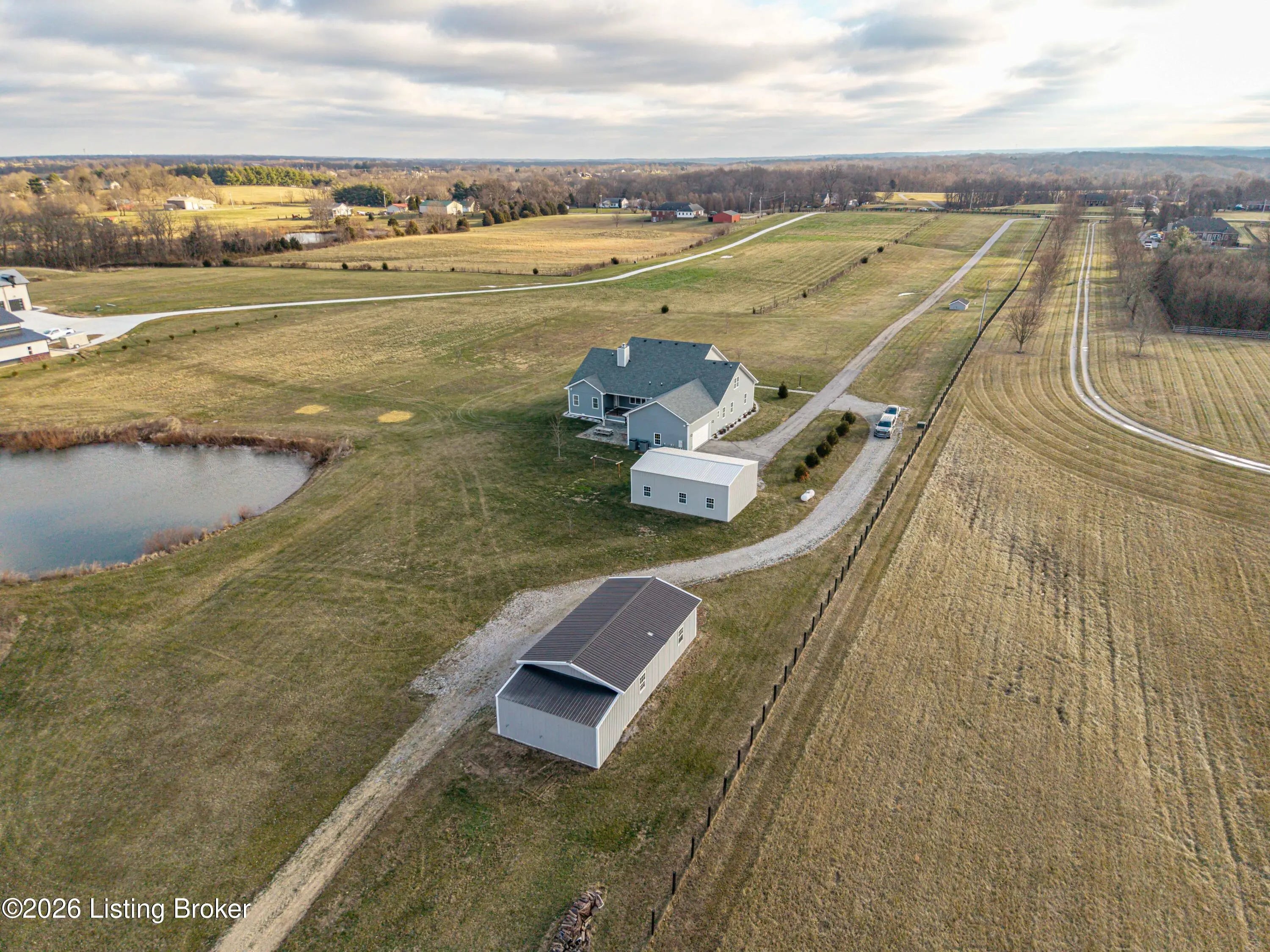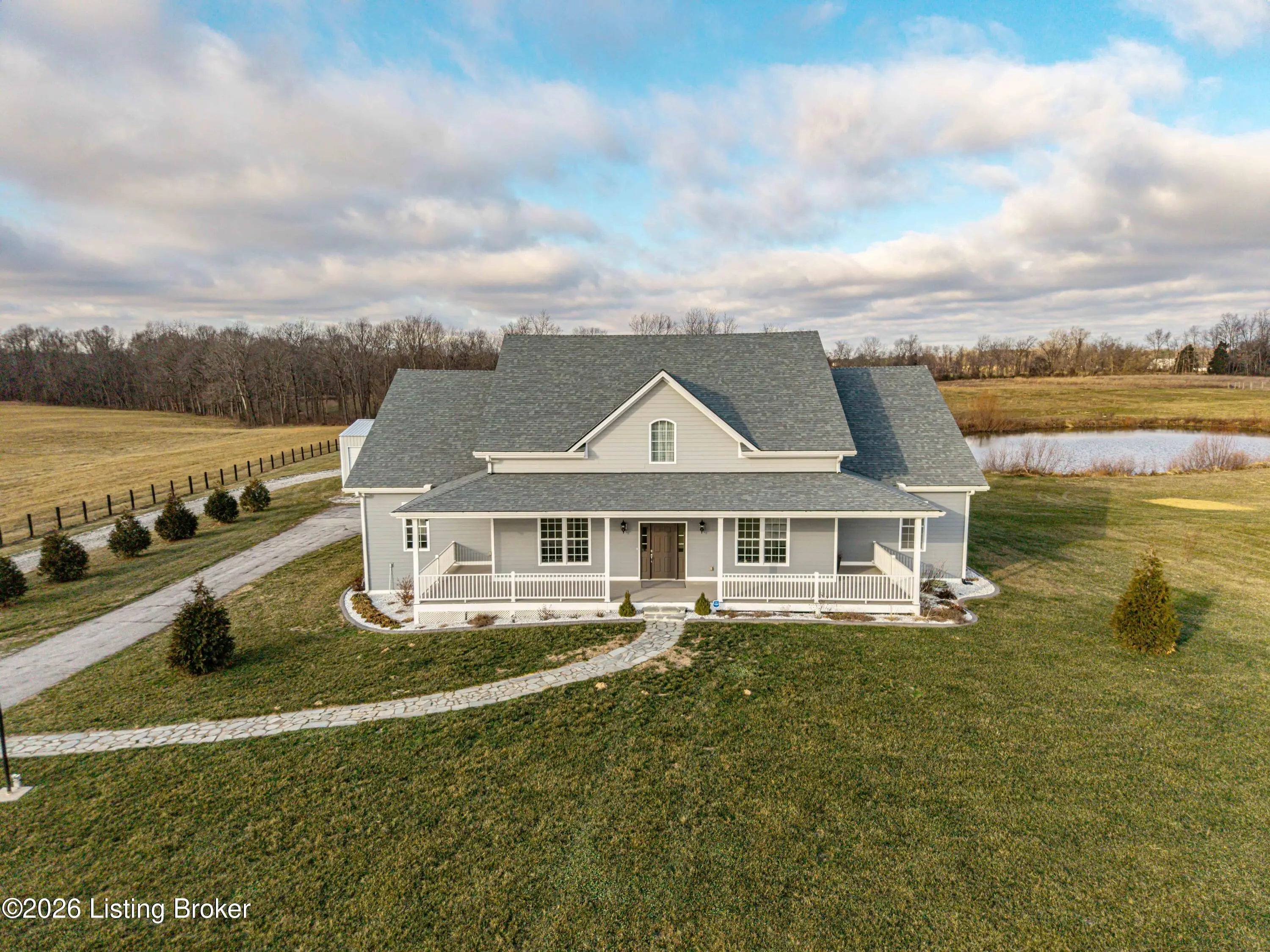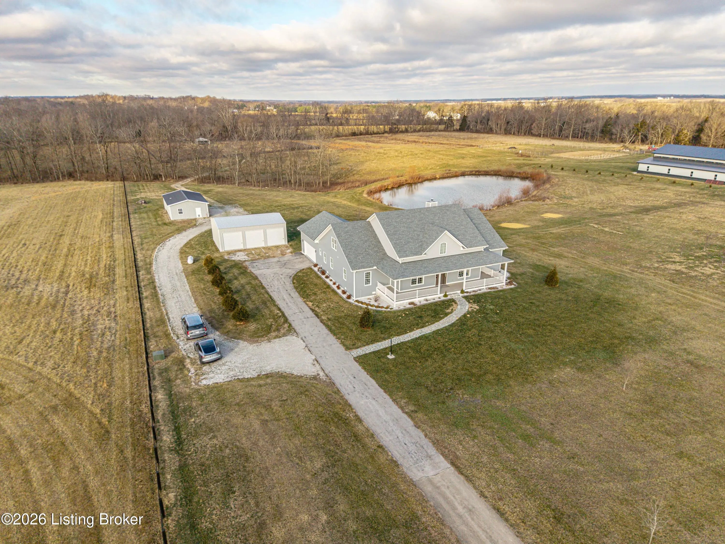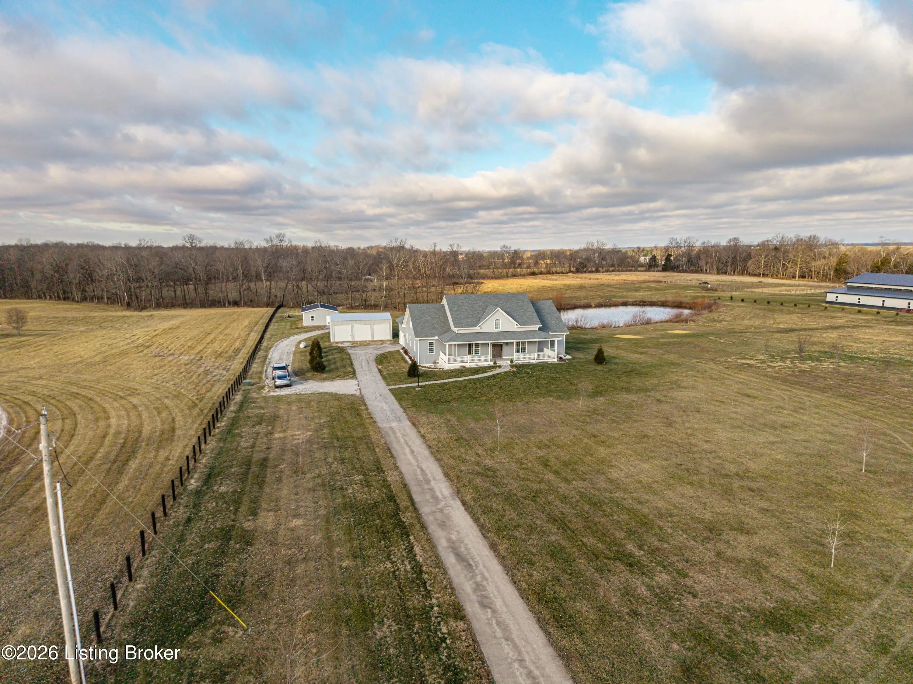 Welcome home to an extraordinary estate where refined living meets the serenity of some of the best land Shelby County has to offer. Spanning over 6,000 square feet of living space, this remarkable residence offers lifestyle very few properties can match - a grand design both inside and out worthy of a magazine spread. Situated down a long country driveway and nestled close to your own fishing pond, this home is truly special. You're welcome by the covered front porch that looks out over several acres of front yard space. From the entryway, the formal dining room is to the left which leads into the chef's kitchen. An abundance of cabinets and counter space, the wall oven and microwave plus a gas cooktop makes this kitchen a dream. There is even plenty of space for a breakfast table as well. The kitchen opens up to the family living room adorned with a wall of windows to capture the pond at sunset plus a wood burning stove to keep the whole space cozy. The main level offers a split floor plan with the primary bedroom suite and office or bedroom on one side of the family room and 2 additional bedrooms, bathrooms and big laundry room on the other side. The primary bedroom has a wonderful walk in closet, its own personal door to the covered back patio and lavish bathroom equipped with instant hot water, thanks to a water heater upgrade. Upstairs is a newly finished gigantic loft that has brand new carpet, many storage closets and even plumbed for a private bathroom upstairs - making this an option for a really cool teenager suite or huge game room. But even more fun space continues in the finished basement. Also newly finished, the basement has over 1100 square space that could be an incredible entertainment zone. This home was completely painted both inside and out just 5 years ago. Not many homes can be described as strong as this one. The foundation and exterior walls are over a foot thick and double insulated with foam panels. Additional extras include a whole house water filter system, a reinforced safe room in the basement complete with its own vault door and a brand new roof in 2025. But wait, there's more. The list of amenities continue outdoors. A new 3 bay garage was added in 2021, plus there is a second outbuilding that will hold your farm and lawn equipment to maintain your 14+/- acres of land. (The actual number of acres is approximate until the final survey is delivered very soon) Come take a look at this gorgeous home so you can spend spring and summer taking in all of its beauty.