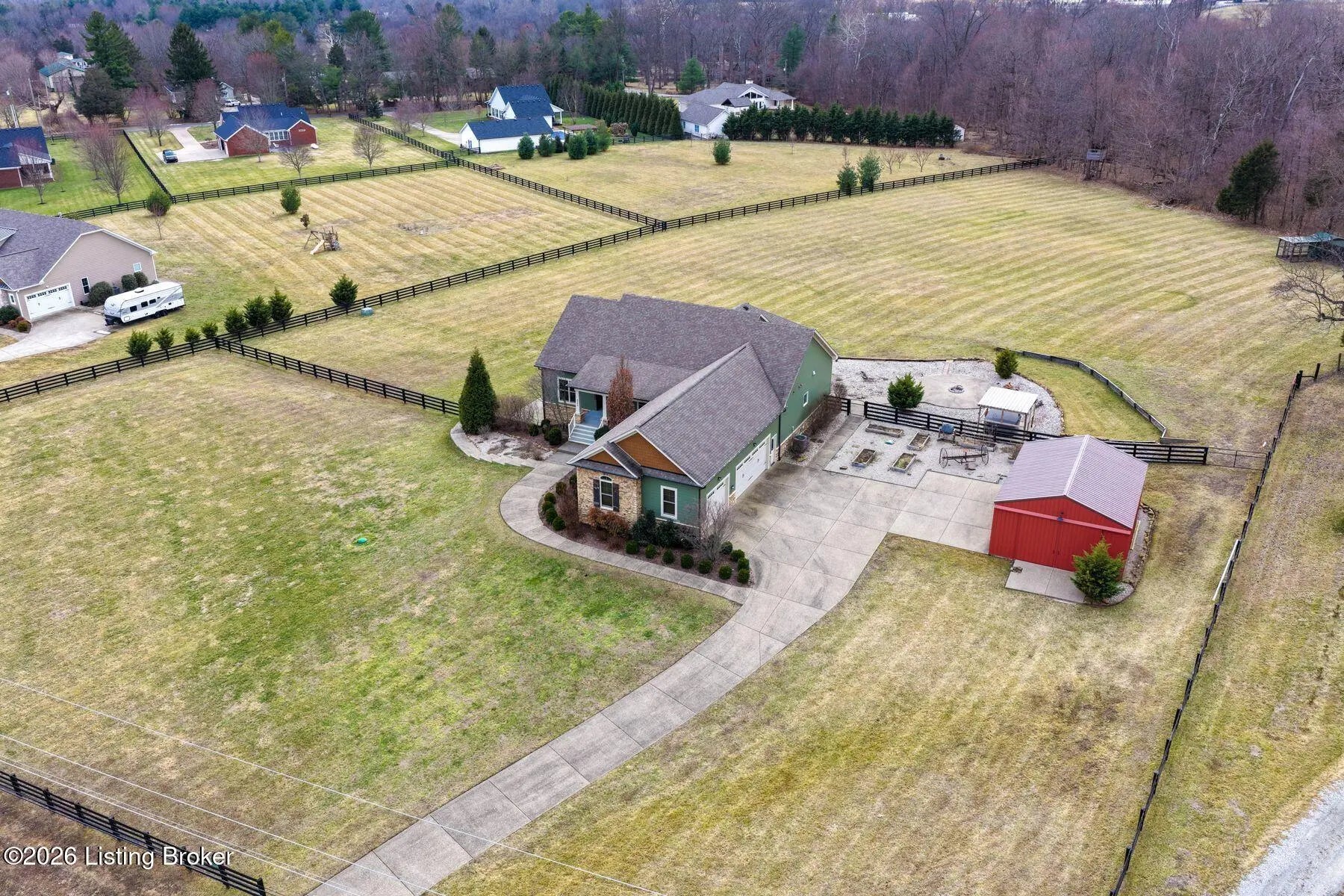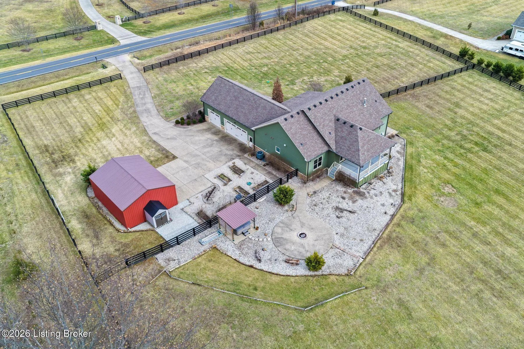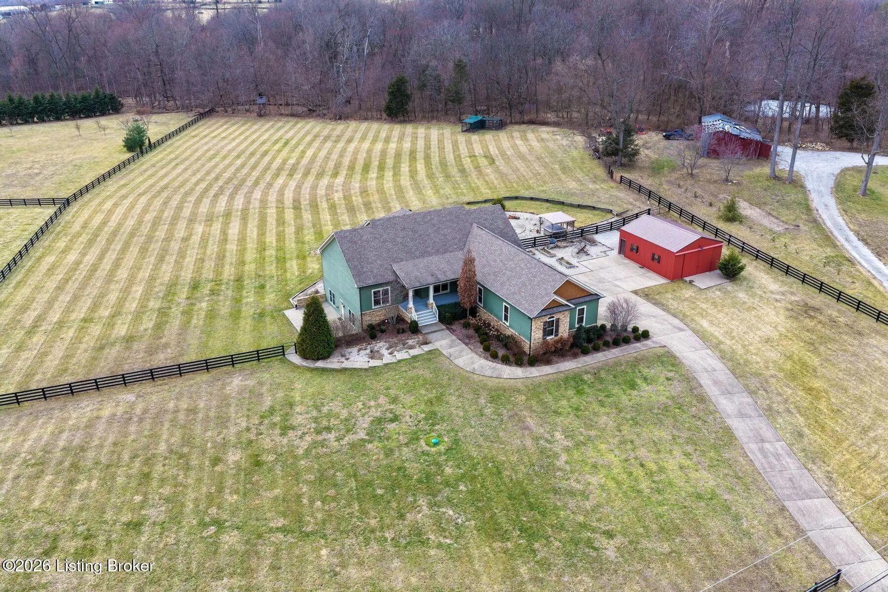 Presenting a quintessential Kentucky experience, this scenic estate offers the rare opportunity to own 3.24 acres of gently rolling Oldham County countryside, complete with newer construction 4+ bedroom ranch, 3+ car garage, scenic patio with hot tub & fire pit, and 24x30 metal barn. Whether looking to take advantage of Oldham County's sought after school system or simply looking for private land in a convenient location, this is the home to see! The 2017-built ranch offers a desirable open floor plan with bright windows, sleek hardwood floors, and soaring ceilings throughout the first floor, along with a separate walkout basement with second fully equipped kitchen, family room, and extra space for guests- perfect for separate living quarters or extended stays. An inviting covered front porch first welcomes guests into the foyer and formal dining room of the first floor before opening to the home's stunning great room with vaulted ceiling, exposed beams, towering fireplace, and built-in bookshelves. From the great room, guests are invited to enjoy the updated eat-in kitchen with stylish gray cabinetry, granite countertops, stainless steel appliances, breakfast bar, and pantry. The adjacent breakfast room offers a cozy space for sharing meals along with access to the home's rear covered deck with scenic countryside views. The first floor continues with a sizable primary suite with vaulted tray ceiling, walk-in closet, and luxurious primary bathroom with dual vanities, shower, and soaking tub. The opposite wing of the home features two spacious bedrooms and updated full bathroom. The first floor is complete with an oversize laundry/mud room and attached 3.5 car garage. Perfect for extended in-law stays or larger families, the walkout lower level features a second kitchen, dining area, family room, game area, bedroom, full bath, office (which could be used as a 5th bedroom), and additional room for storage with second laundry hookups. The home's incredible backyard offers an everyday getaway, featuring stunning views among mature trees and rolling acreage. Homeowners will enjoy use of the spacious deck, entertaining patio, and hot tub, while appreciating the investment of classic four-board fencing already in place. Perfect for additional storage, hobbies, or a large workshop, the home's newer metal barn is sure to impress. Located just minutes from I-71 and downtown La Grange, this home is not to be missed!