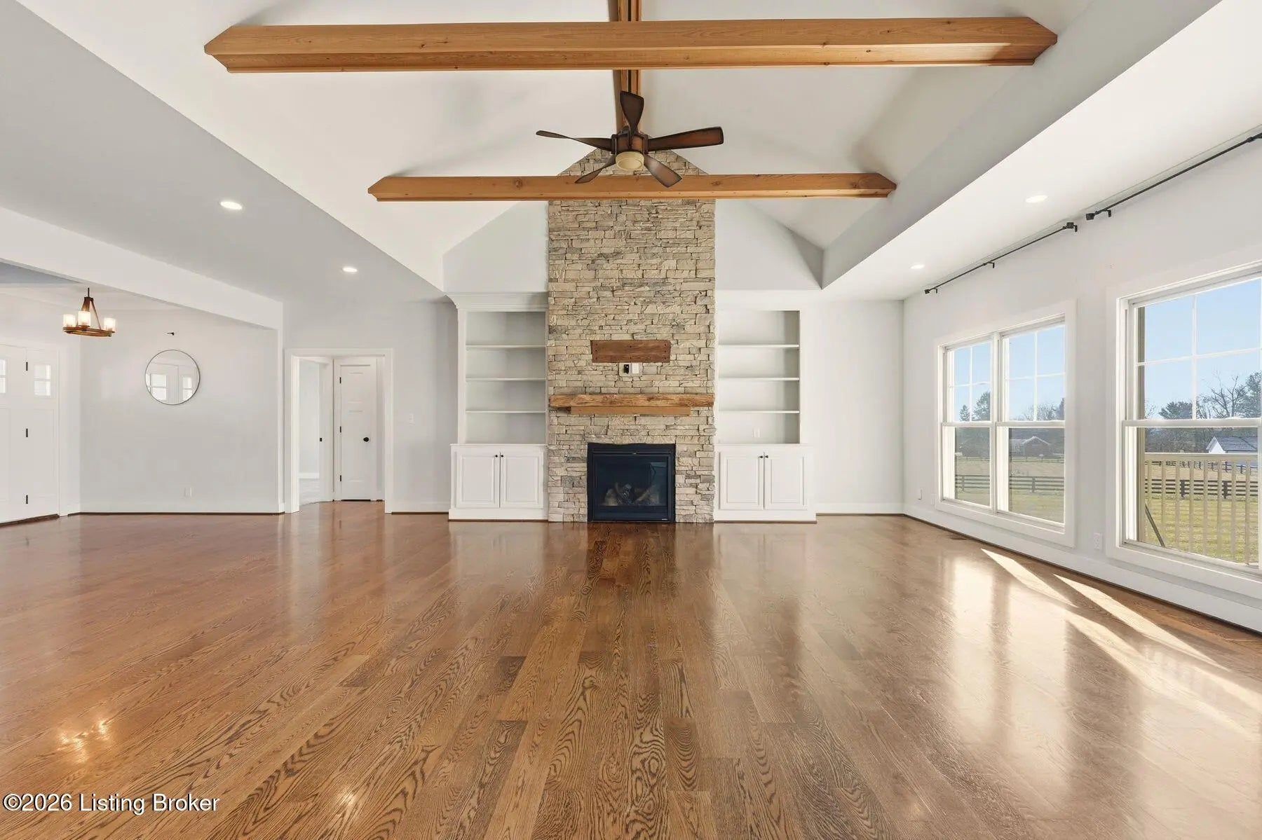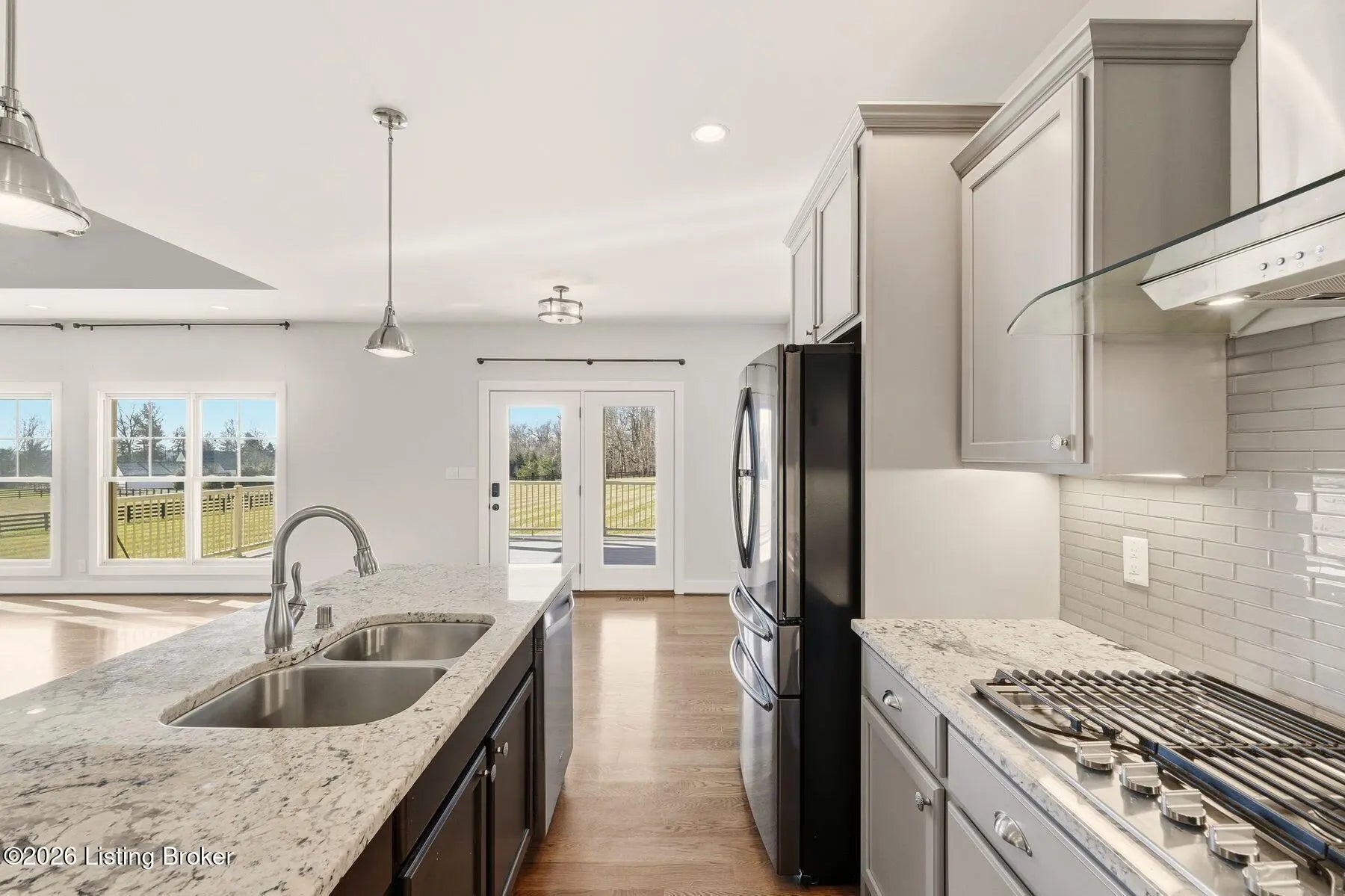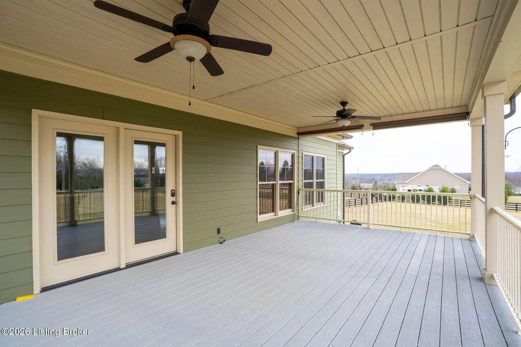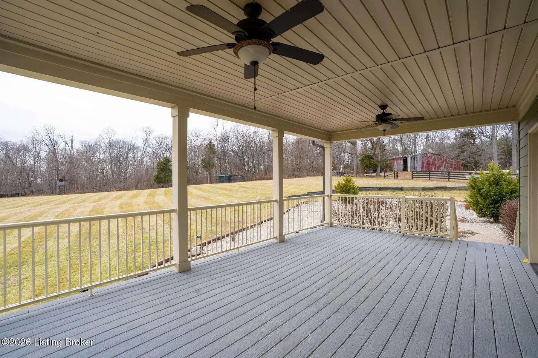 Presenting a quintessential Kentucky experience, this scenic estate offers the rare opportunity to own 3.24 acres of gently rolling Oldham County countryside, complete with newer construction 4+ bedroom ranch, 3+ car garage, scenic patio with hot tub & fire pit, and 24x30 metal barn. Whether looking to take advantage of Oldham County's sought after school system or simply looking for private land in a convenient location, this is the home to see! The 2017-built ranch offers a desirable open floor plan with bright windows, sleek hardwood floors, and soaring ceilings throughout the first floor, along with a separate walkout basement with second fully equipped kitchen, family room, and extra space for guests- perfect for separate living quarters or extended stays. An inviting covered front porch first welcomes guests into the foyer and formal dining room of the first floor before opening to the home's stunning great room with vaulted ceiling, exposed beams, towering fireplace, and built-in bookshelves. From the great room, guests are invited to enjoy the updated eat-in kitchen with stylish gray cabinetry, granite countertops, stainless steel appliances, breakfast bar, and pantry. The adjacent breakfast room offers a cozy space for sharing meals along with access to the home's rear covered deck with scenic countryside views. The first floor continues with a sizable primary suite with vaulted tray ceiling, walk-in closet, and luxurious primary bathroom with dual vanities, shower, and soaking tub. The opposite wing of the home features two spacious bedrooms and updated full bathroom. The first floor is complete with an oversize laundry/mud room and attached 3.5 car garage. Perfect for extended in-law stays or larger families, the walkout lower level features a second kitchen, dining area, family room, game area, bedroom, full bath, office (which could be used as a 5th bedroom), and additional room for storage with second laundry hookups. The home's incredible backyard offers an everyday getaway, featuring stunning views among mature trees and rolling acreage. Homeowners will enjoy use of the spacious deck, entertaining patio, and hot tub, while appreciating the investment of classic four-board fencing already in place. Perfect for additional storage, hobbies, or a large workshop, the home's newer metal barn is sure to impress. Located just minutes from I-71 and downtown La Grange, this home is not to be missed!
