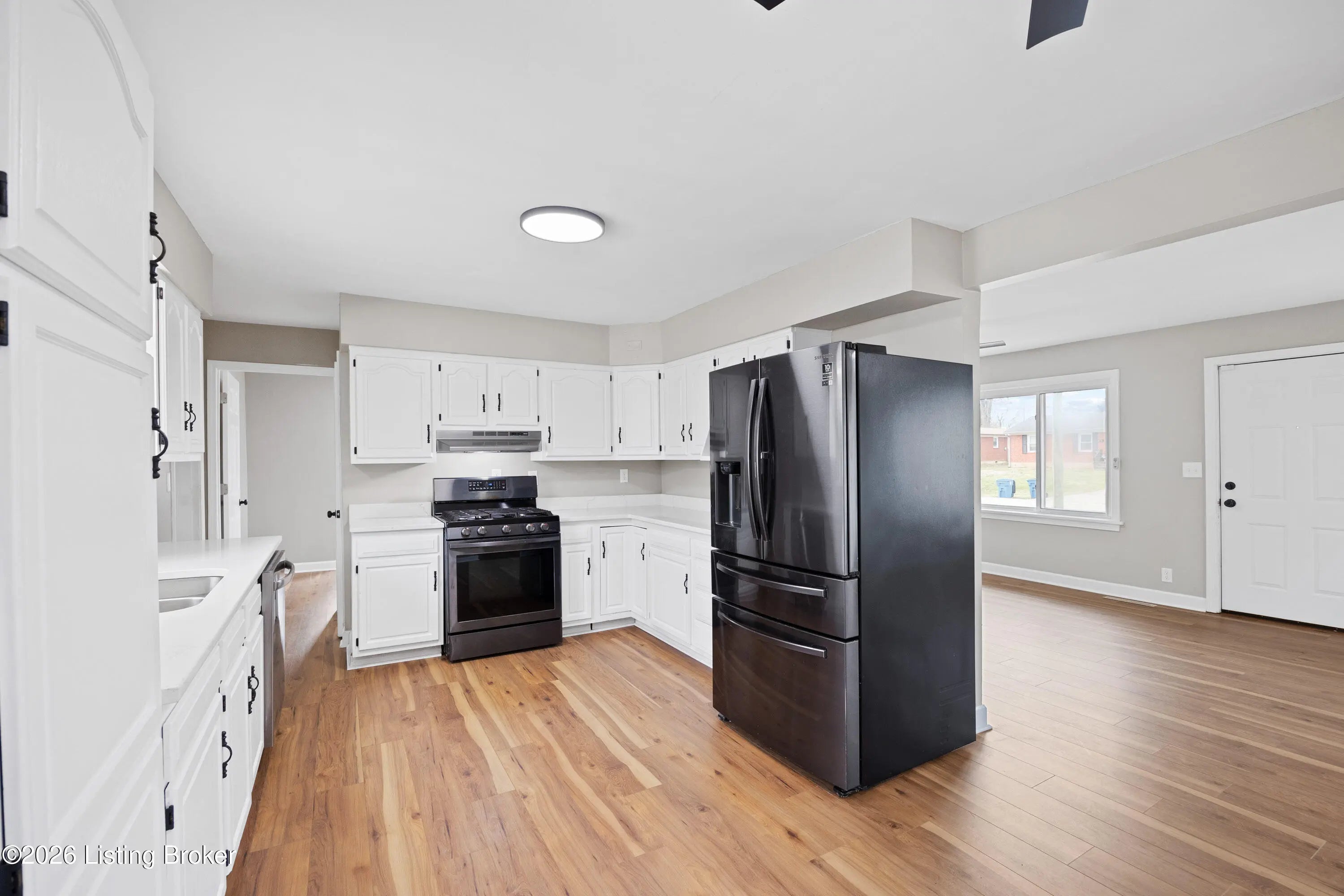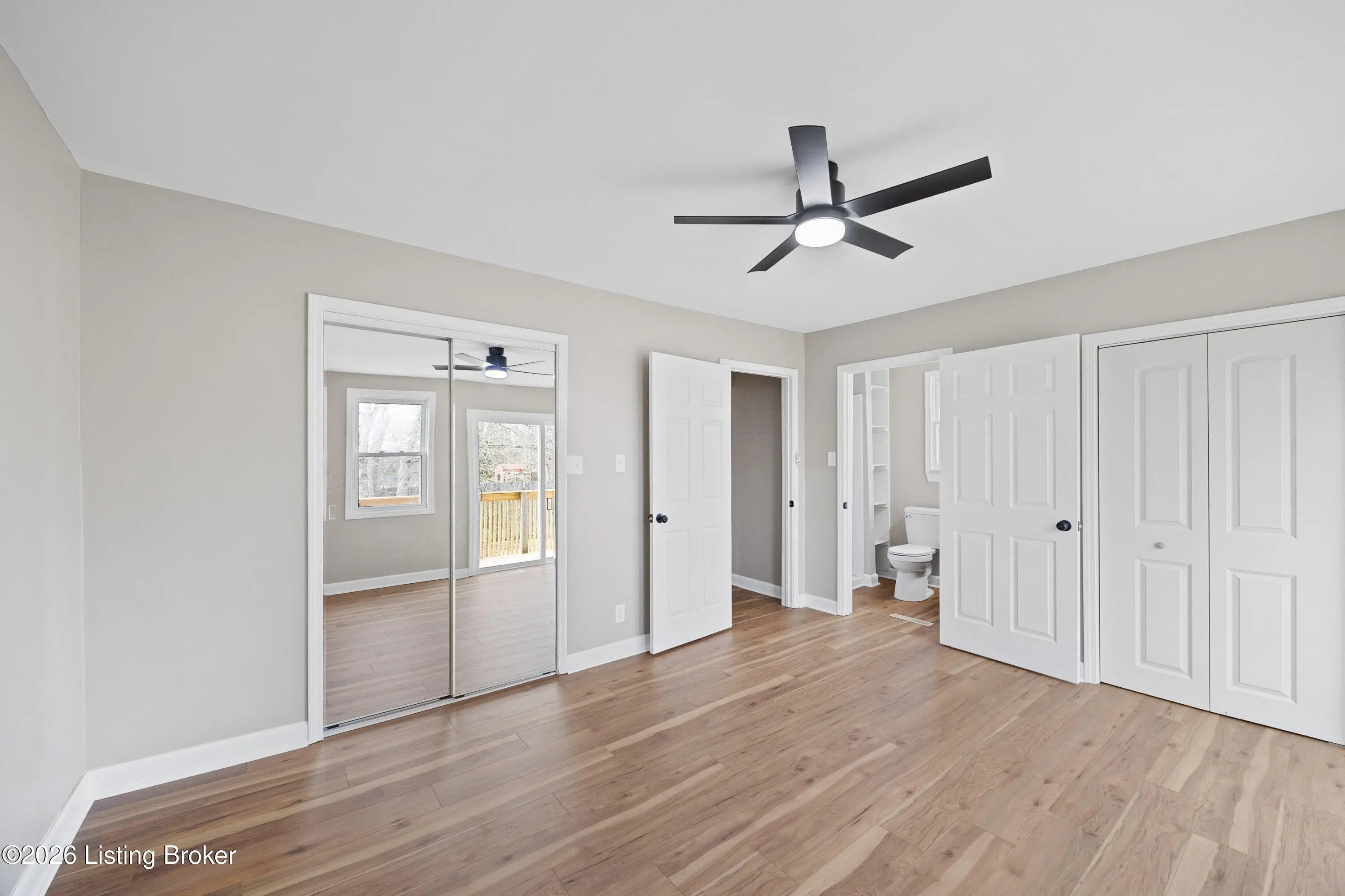 Welcome to this beautifully updated ranch home with approximately 1,560 square feet of first-floor living! All four bedrooms and two full baths are on the main level, including a primary suite with its own bath. A large living room opens to a spacious dining area, and the kitchen offers abundant cabinets and quartz countertops. Enjoy first-floor laundry, new flooring, fresh paint, and updated bathrooms. The basement has been waterproofed, freshly painted on floors, walls, and ceiling, with new ceiling lights, and is ready to finish. Sliding glass doors lead to a large new deck with fresh wood. Updates include replacement windows, new ceiling fans and light fixtures, all new panel doors and hardware, and a detached two-car garage with a brand-new garage door.