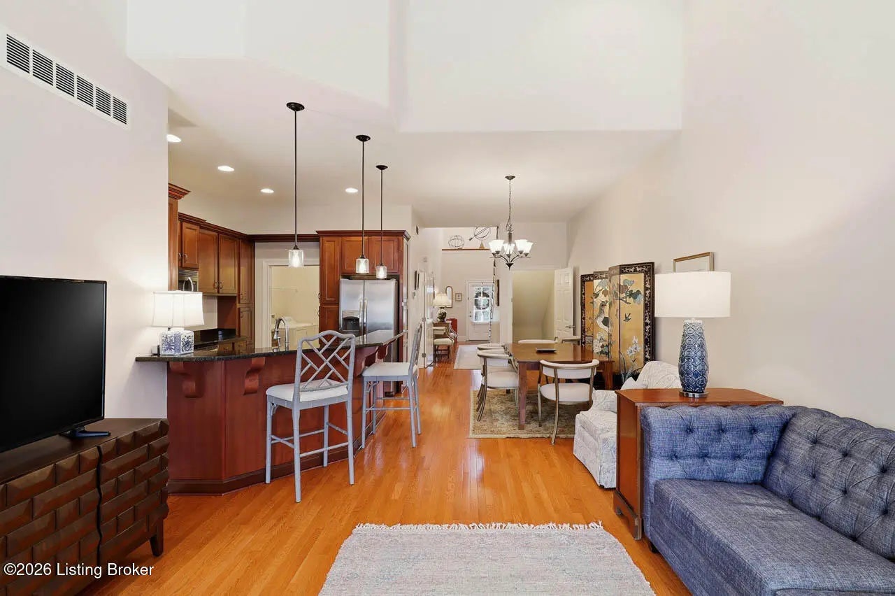 Prepare to fall in love with this open concept 3 bedroom, 3 full bath, 2 half bath townhome nestled in the Dorsey Pointe community offering an attached garage and finished basement, along with exceptional design, quality, and construction. From the moment you enter, you'll be impressed by the dramatic 15 foot ceilings in both the entry foyer and great room, creating an airy, light-filled space perfect for everyday living and entertaining. The beautifully appointed kitchen features custom cabinetry, granite countertops, and stainless steel appliances, flowing seamlessly into the great room. Step outside onto the extended Trex deck to enjoy peaceful views of lush green space, a serene creek, and natural foliage - a rare and tranquil setting. The main level primary suite is a private retreat complete with an en suite bathroom with a jetted tub, separate shower, and double sink vanity. The oversized walk-in closet provides ample space for storage. The laundry room/mud room has cabinets for storage and a sink for added convenience. Upstairs, you'll find a second living area and two generously sized bedrooms, each with walk-in closets and private ensuites - ensuring comfort and privacy for family or guests. The basement adds approximately 1,200 square feet of neat, clean living space with tall ceilings, a covered patio walkout, and a thoughtfully designed media cabinet to conceal cables and maintain a polished look. This building stands apart from the rest in the development - constructed with steel beam framing, raised foundations, and concrete walls between units for outstanding soundproofing. These are the only units in the community built to this superior standard, and this is the largest of them all. This home has a newer HVAC system with an integrated dehumidifier. Offering low-maintenance living in a prime location with exceptional privacy and quality construction, this is a rare opportunity you won't want to miss. Schedule a tour today!