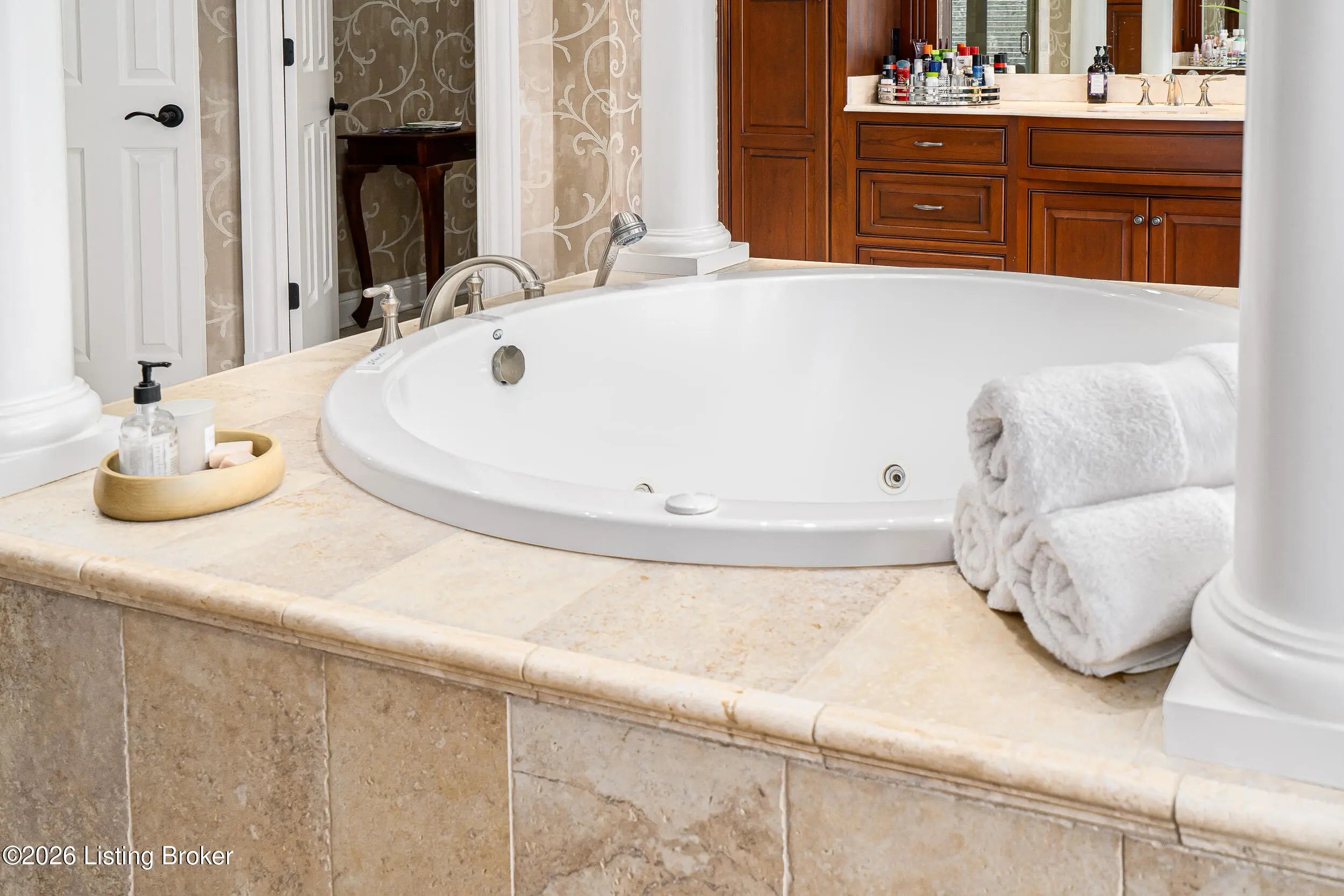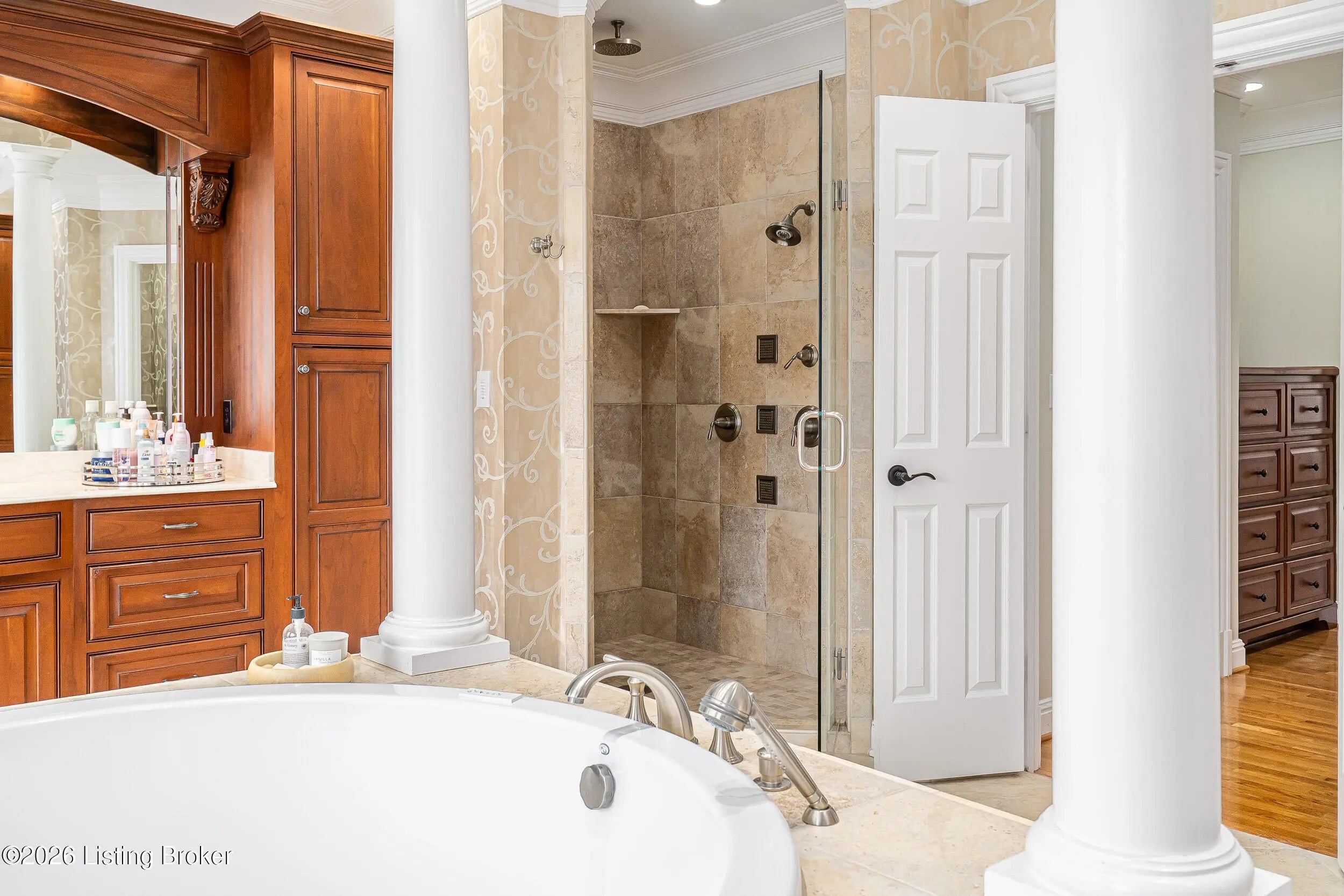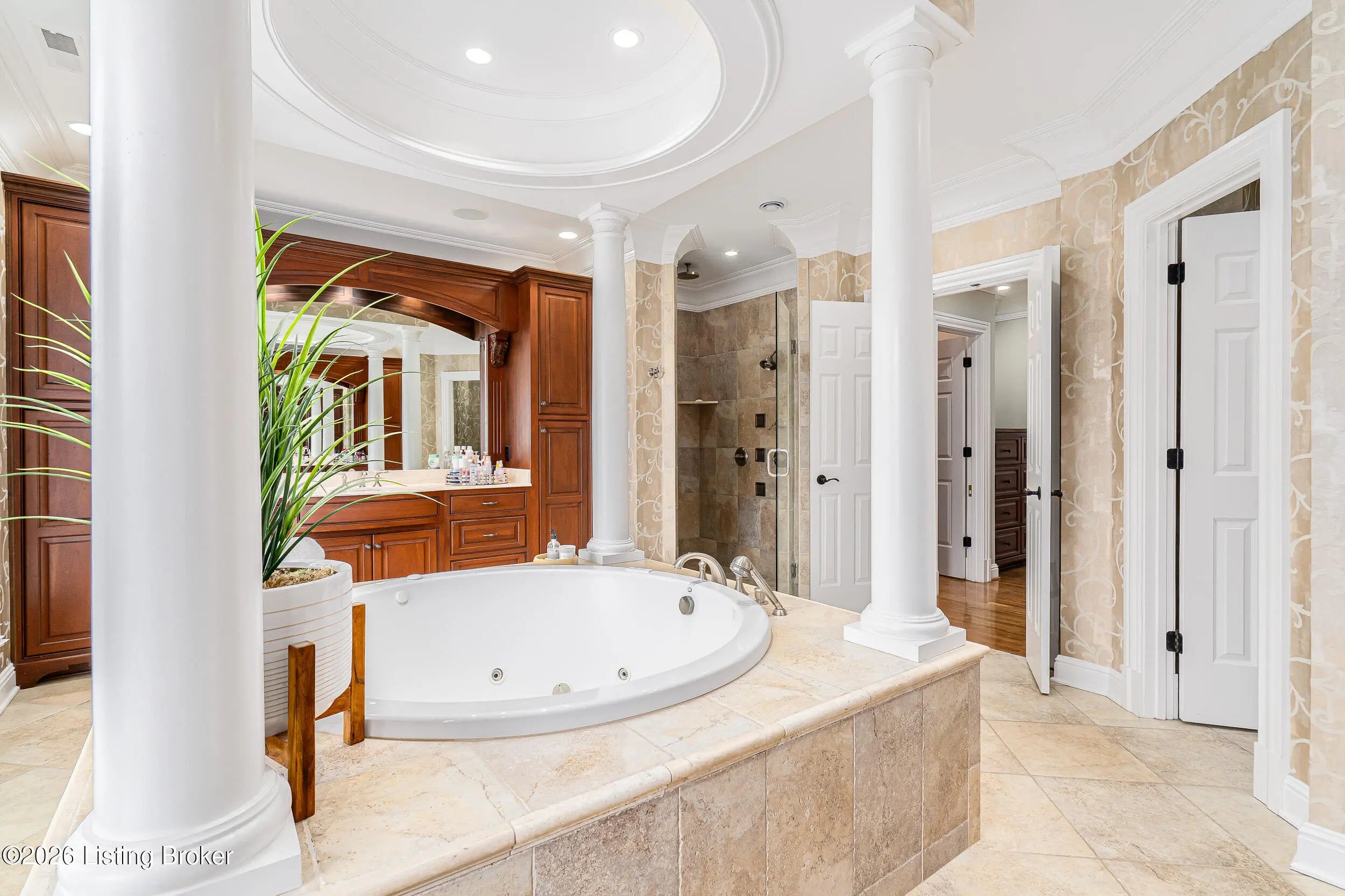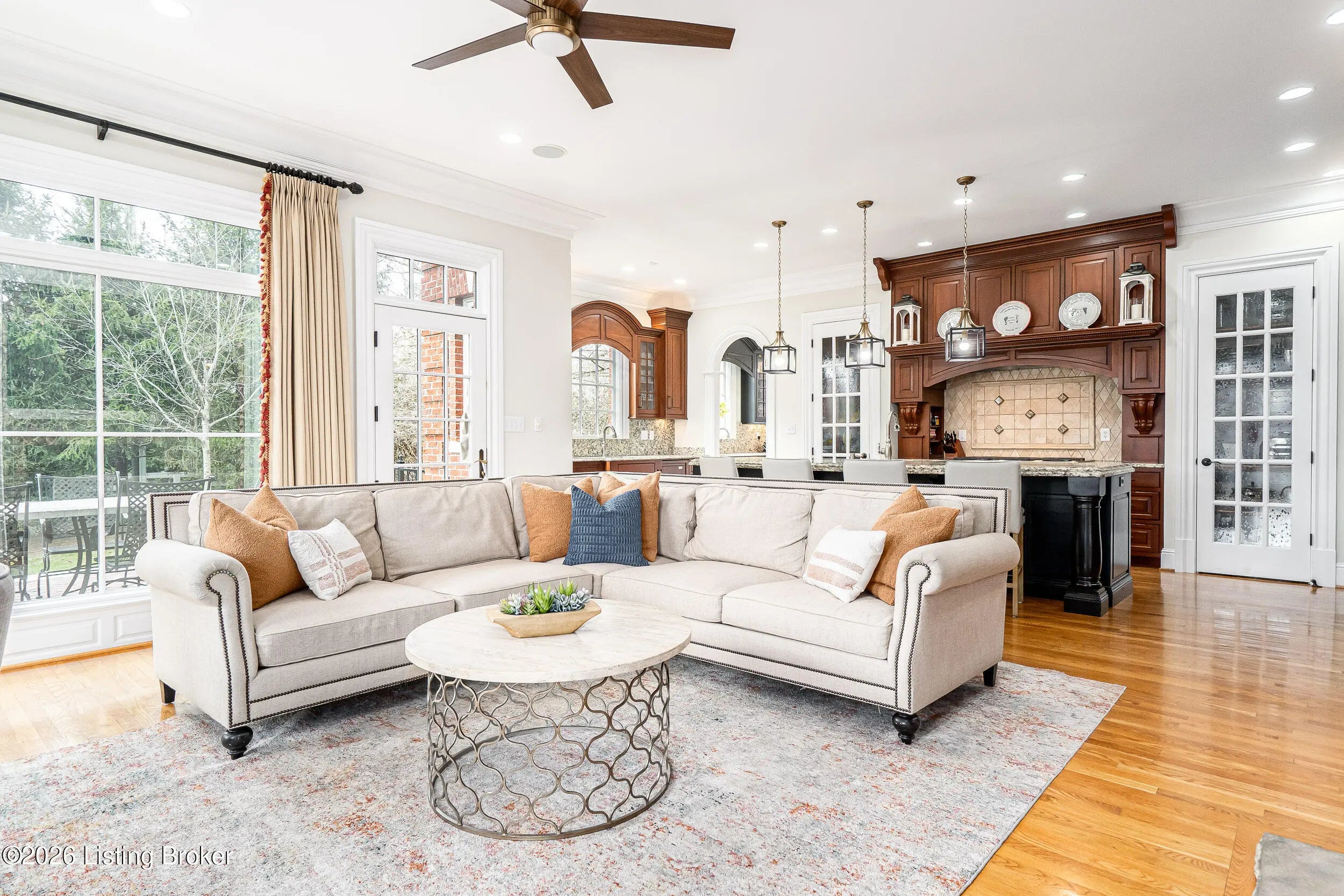 Custom-built in 2006 and ideally situated on over 1.7 acres in prestigious Indian Hills, this five-bedroom home offers quality construction, thoughtful design, and modern efficiency. Each bedroom features its own en-suite bathroom, along with multiple living spaces designed for comfort and entertaining. The home includes geothermal heating and cooling, a new roof installed in 2016, and an elevator servicing all three floors. The welcoming foyer introduces arched entryways, detailed millwork, hardwood flooring, and vaulted ceilings that continue across the main level. The great room features built-in bookcases, a gas fireplace, and expansive rear views from the balcony that spans the back of the residence. The gourmet kitchen offers an oversized island, custom cabinetry, high-end appliances, and a butler's pantry, with an adjacent formal dining room. A tucked-away office space with access to the rear patio has potential for a first-floor bedroom. Upstairs, three generous en-suites include a well-appointed primary bedroom with a sitting area, private balcony access, dual oversized closets, and a spacious bath with soaking tub and separate shower. The lower level expands the home's versatility with a large living area, full kitchen, theater room, hidden wine cellar, and additional bedroom suite. A three-car garage completes this exceptional Indian Hills property.