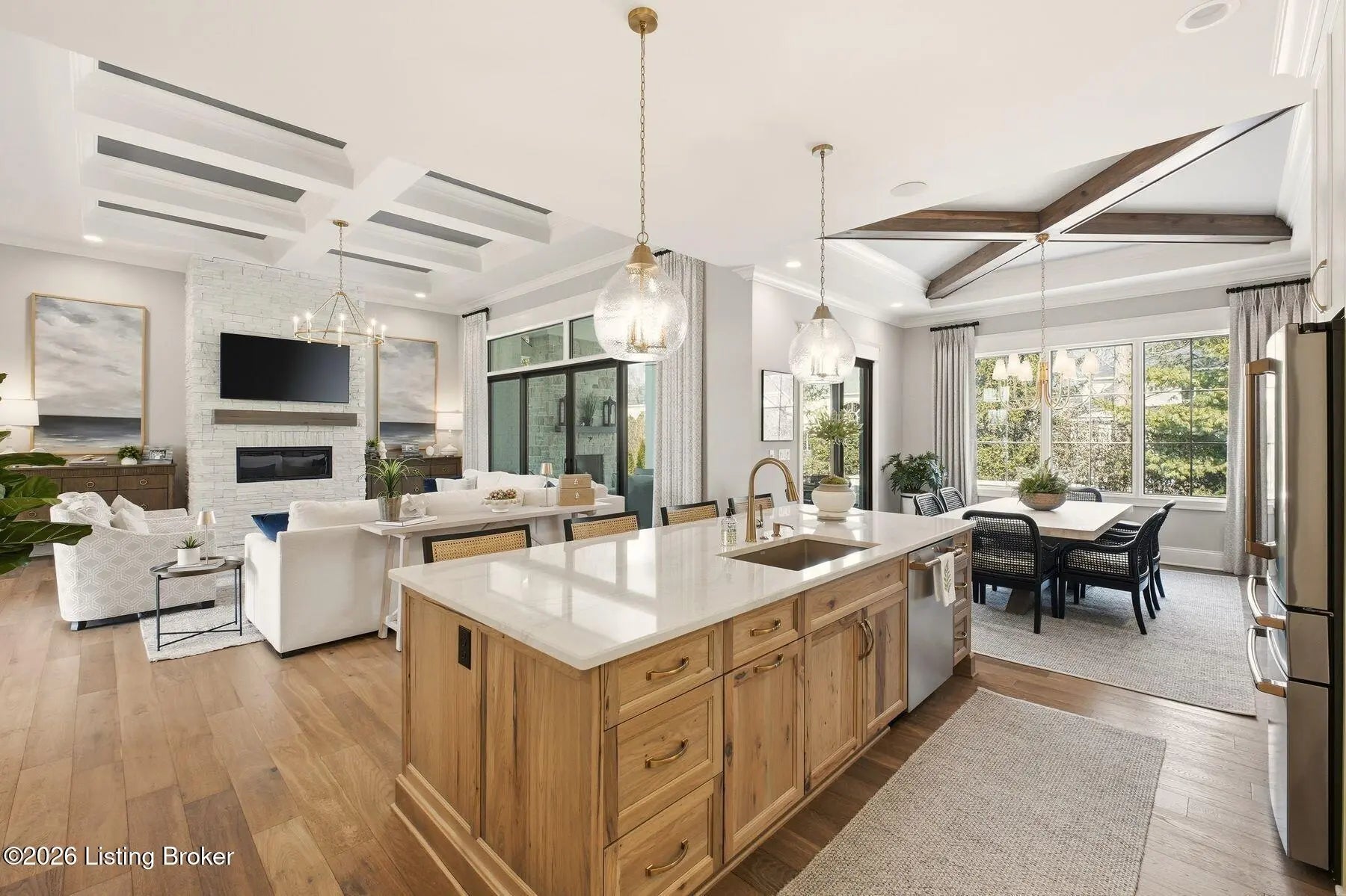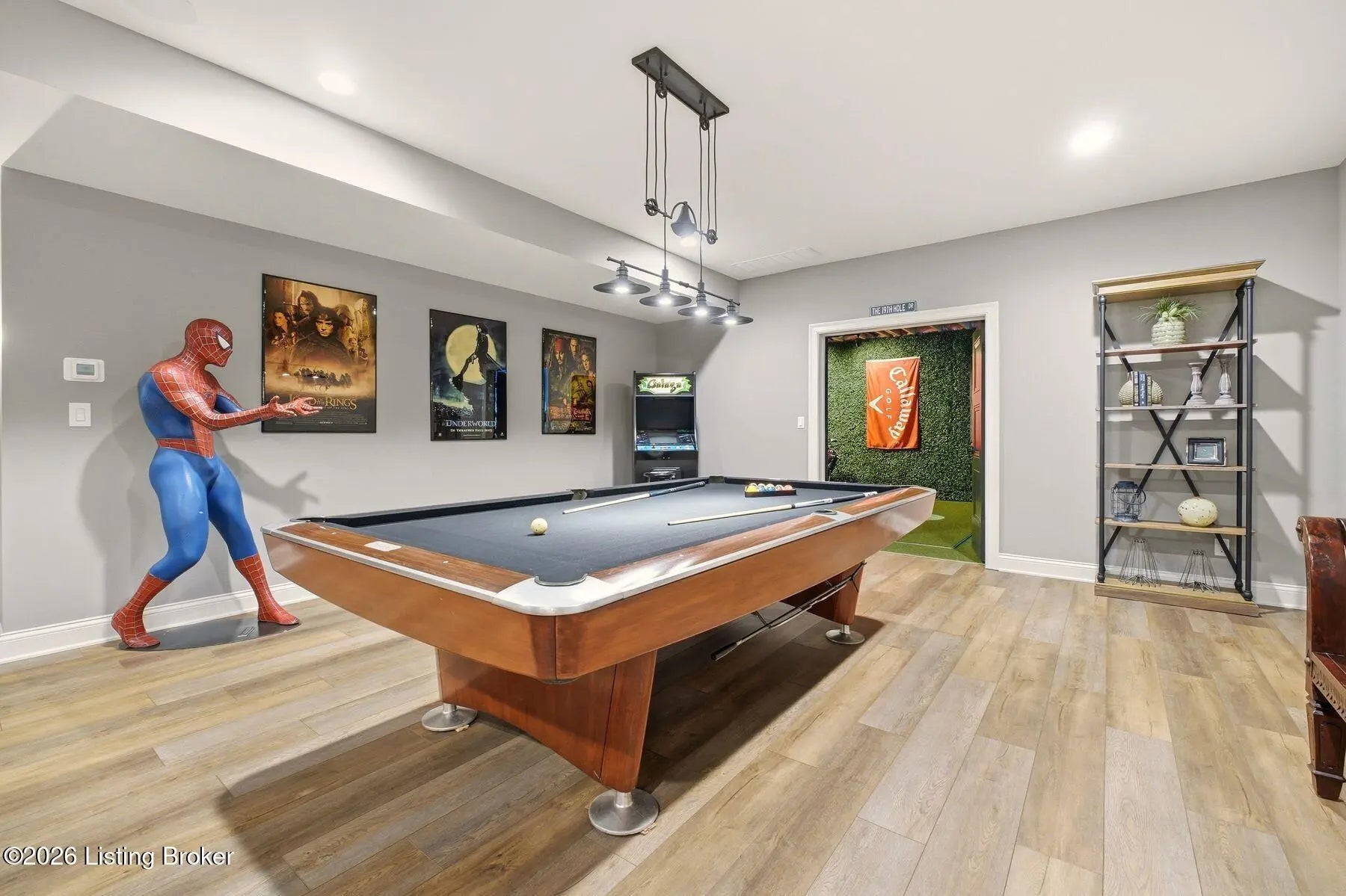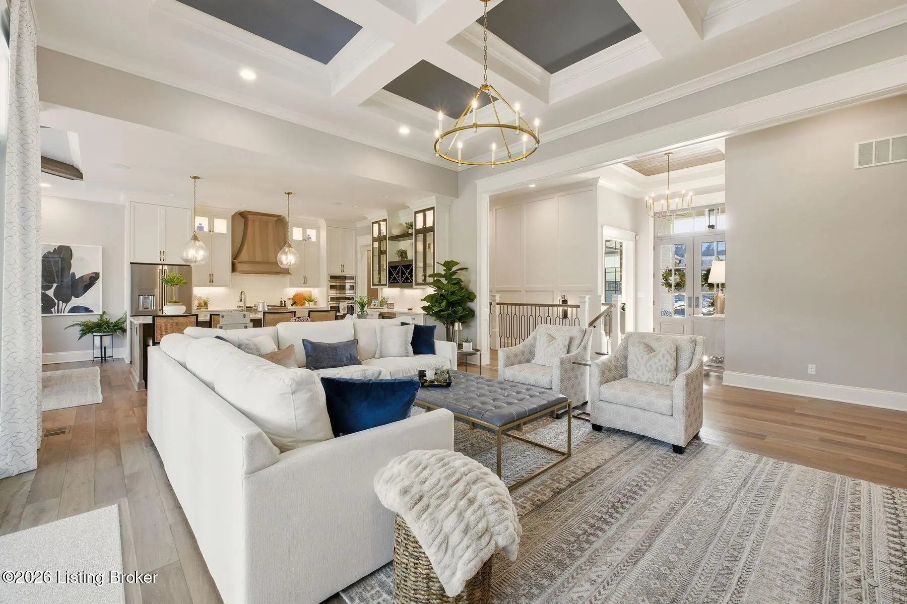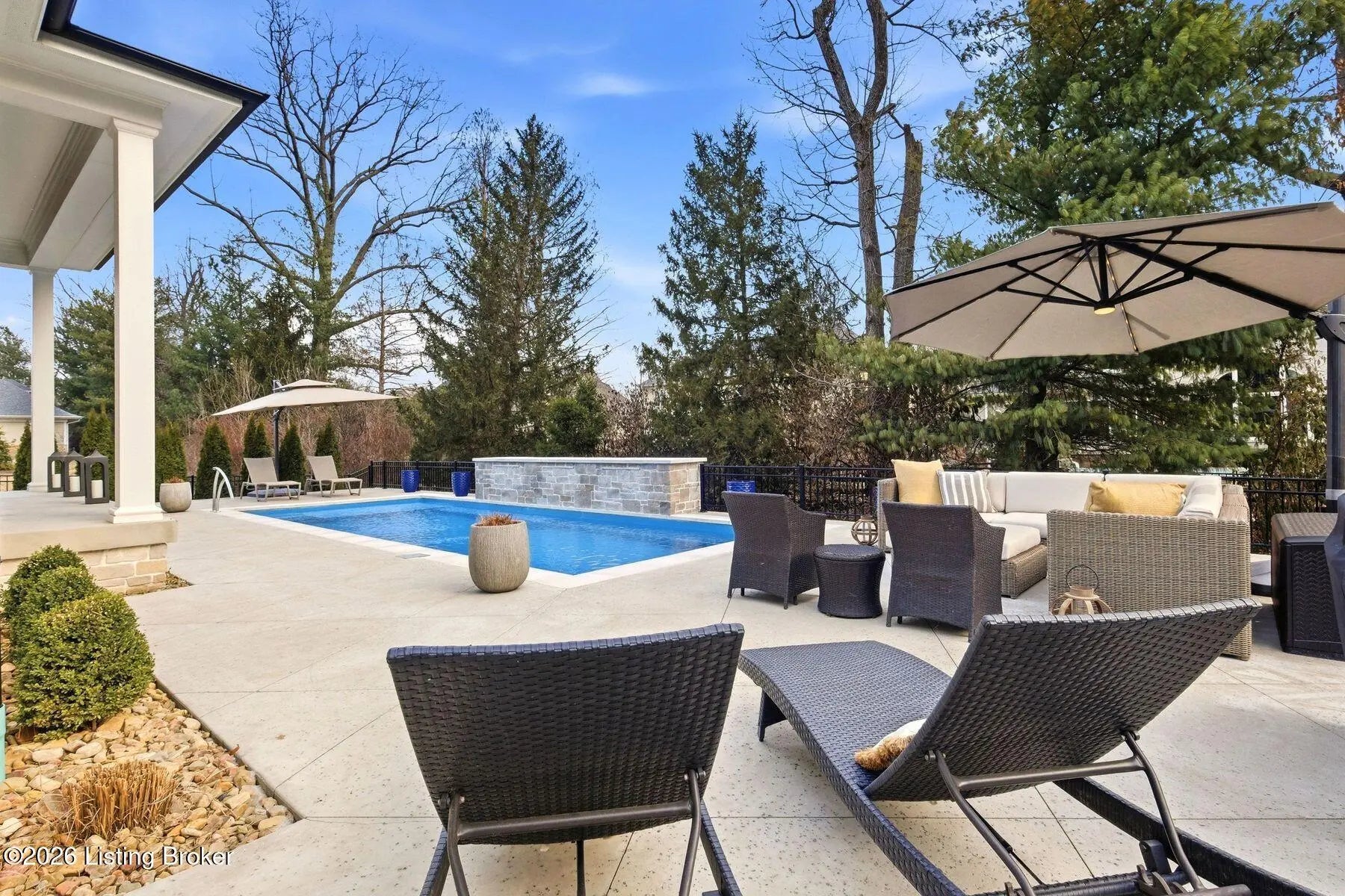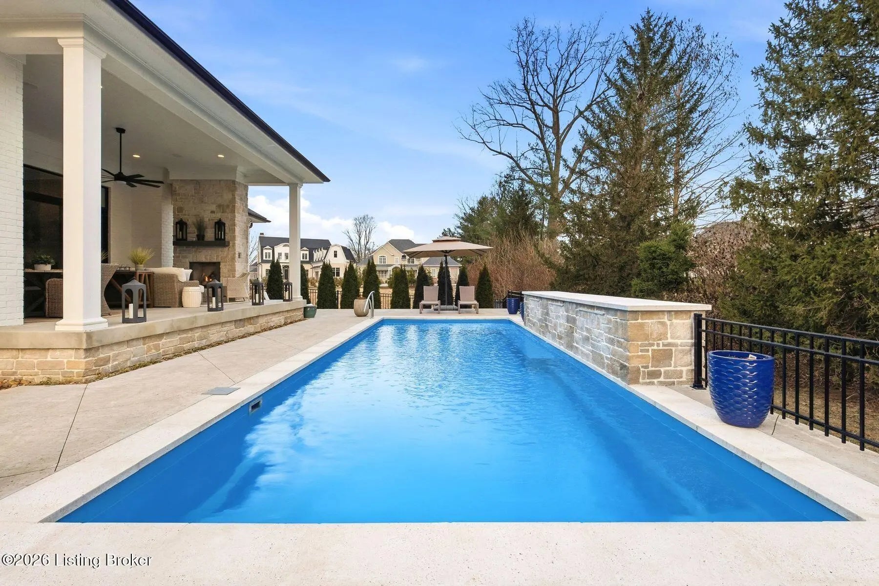 Experience refined luxury and effortless comfort in this exceptionally high-end custom ranch, where impeccable craftsmanship and designer details define every space. From the moment you enter, you're greeted by an expansive open-concept floor plan adorned with decorative wood ceilings, custom millwork, and stunning designer light fixtures that elevate each room with warmth and sophistication. A beautifully designed main-floor office adds both function and flair, perfect for working from home or serving as a refined flex room. The gourmet kitchen is a true showpiece, featuring custom cabinetry, premium Cambria countertops, and top-tier finishes that seamlessly blend beauty and functionality—ideal for both everyday living and elegant entertaining. The lavish primary suite is a private retreat, offering a spa-inspired en suite bath complete with dual vanities, double sinks, a deep soaking tub, an oversized walk-in shower, and a custom-designed walk-in closet tailored for luxury organization. Two additional spacious bedrooms each feature their own beautifully appointed en suite baths, ensuring comfort and privacy for family and guests alike. The main level is complete with a gorgeous powder bath and a conveniently located first-floor laundry, adding both style and everyday ease to this beautifully designed home. Step outside to your own resort-style oasis—an exquisite pool setting designed for relaxation and entertaining, surrounded by serene views and thoughtfully designed outdoor living space complete with outdoor fireplace. The fully finished lower level expands the home's exceptional lifestyle offerings. Enjoy a spacious family room, wet bar, dedicated game area, state-of-the-art golf simulator room, additional bedroom, full bath, and a private exercise room—creating the ultimate destination for recreation and wellness without ever leaving home. Every detail of this remarkable residence reflects uncompromising quality, sophisticated design, and timeless elegance. This is more than a home—it's a statement of luxury living at its finest.
