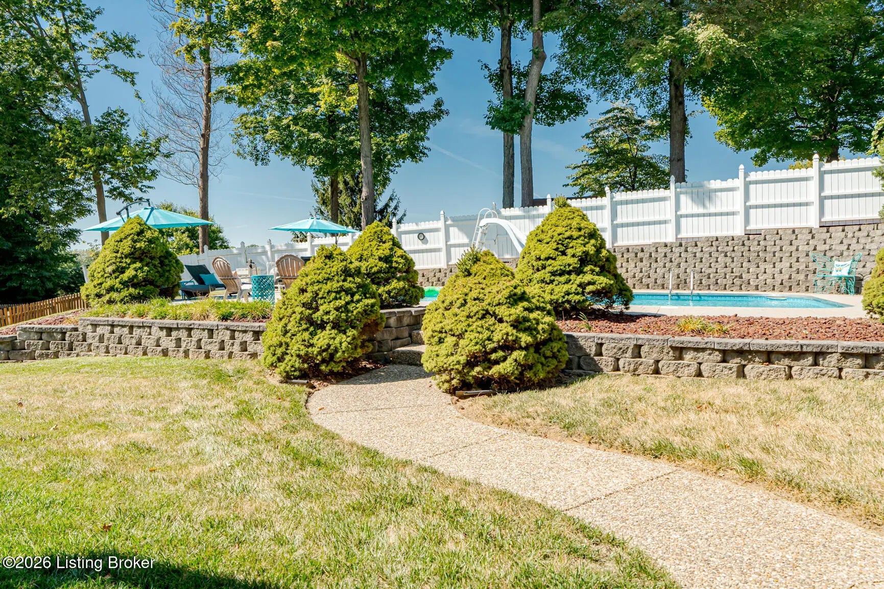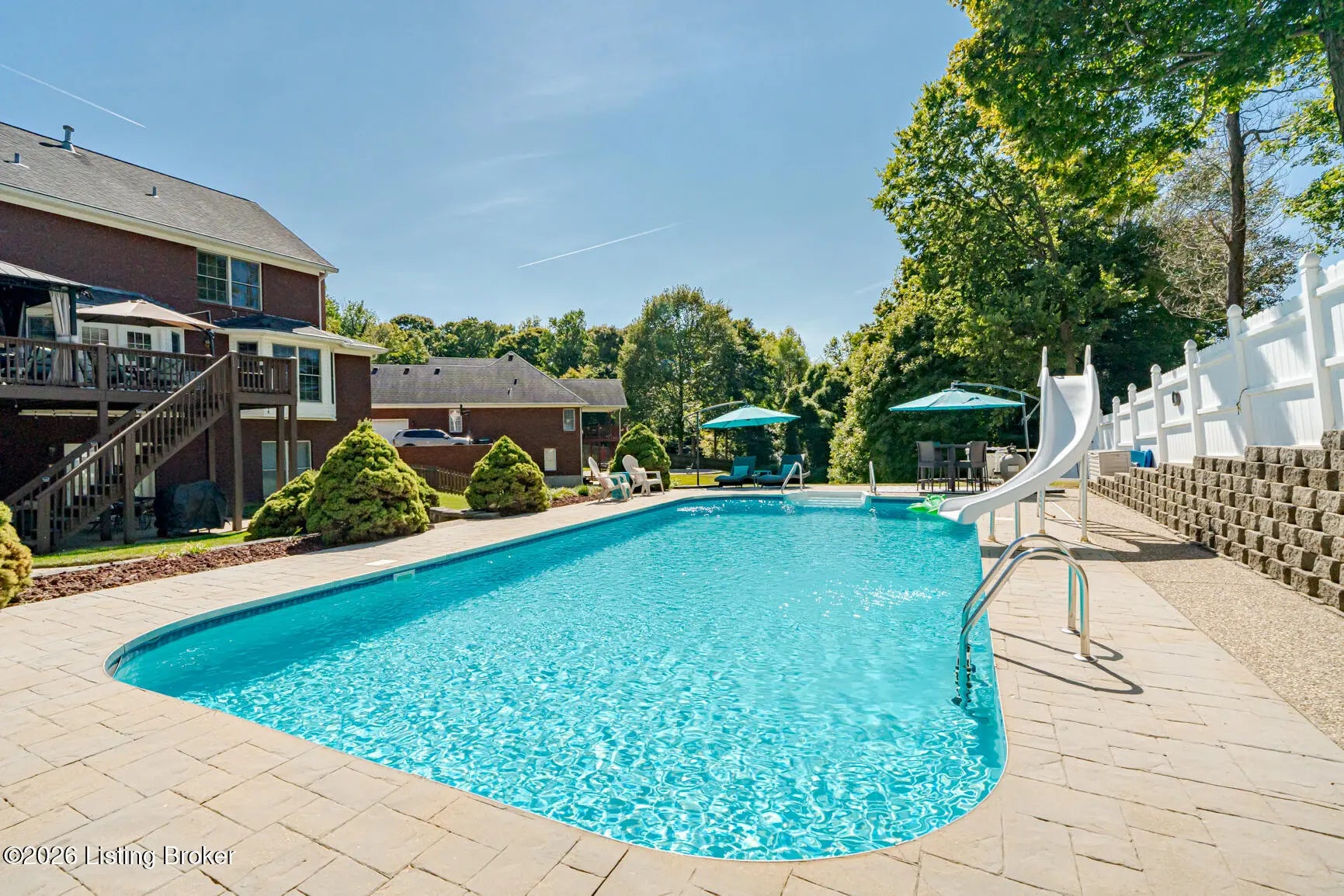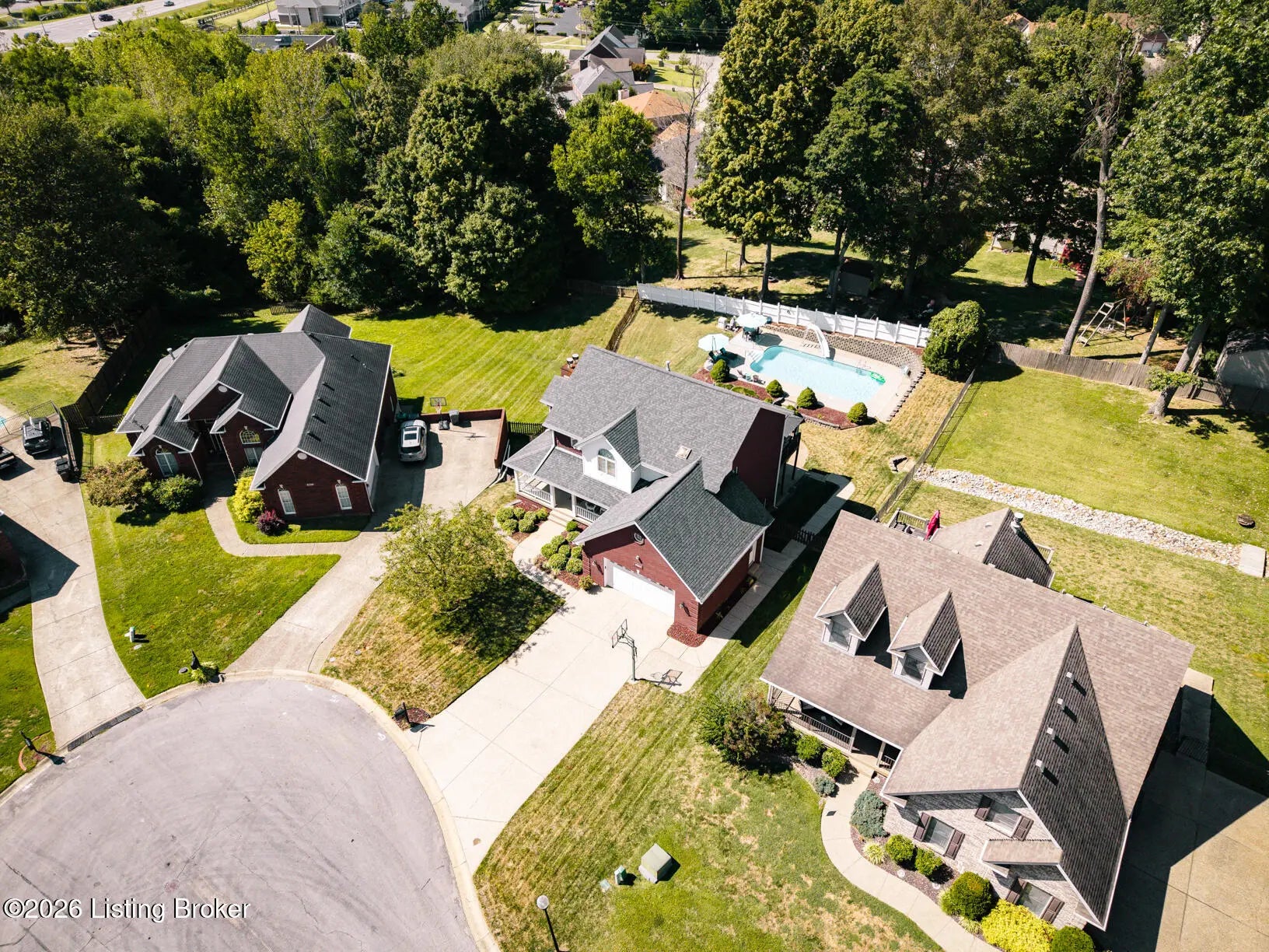 Welcome to this spacious and beautifully maintained two-story home located on a quiet cul-de-sac in the desirable StoneRidge Landing. As you enter from the spacious covered front porch, you're greeted by a grand two-story foyer that leads into a large living room with cozy fireplace that opens to a very spacious eat-in kitchen, complete with quartz countertops, a stylish tiled backsplash, tons of cabinetry, center island, and an oversized pantry. Convenience is key with a spacious laundry room and half bath just off the kitchen. Upstairs, you'll find three generous bedrooms, including a private primary suite with updated primary bath and an impressive 14-by-24 walk-in closet. There are two other Spacious bedrooms and full bath that even has a laundry chute. The finished walk-out basement features 10-foot ceilings, family room with cozy fireplace, full bath, and utility room with built in shelves. One could easily add a wall and door in finished area of basement for a 4th bedroom. Outside, is the dream oasis, perfect for entertaining and relaxing with friends and family featuring a heated 18-by-36 swimming pool with a sliding board, stamped cobblestone decking and fully fenced yard. There's also a deck with a covered area and a gas grill line and rear patio from walkout with sidewalk from front of home to pool. Some other features include, Gutter Guard, 220 outlet lower patio, waterlines and drain set up in basement for a bar, irrigation system, oversized 26 x 26 garage with side man door and double wide driveway. Great location with easy access to Gene Snyder and I-65. This one owner home is in excellent condition and truly shows pride of ownership. Don't miss the opportunity to make it yours!