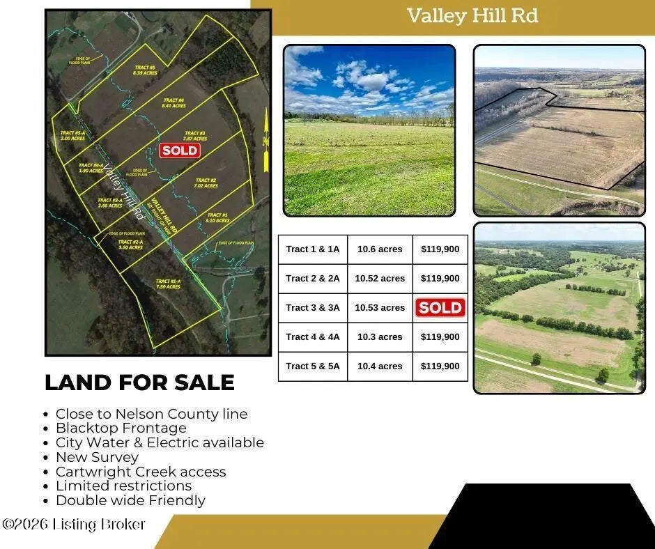 Check out this 10+acres located between Springfield & Bardstown (Burg Area) with city water & electric available! Blacktop frontage! Access to Cartwright Creek! New Survey! Make this your spot for your new home!