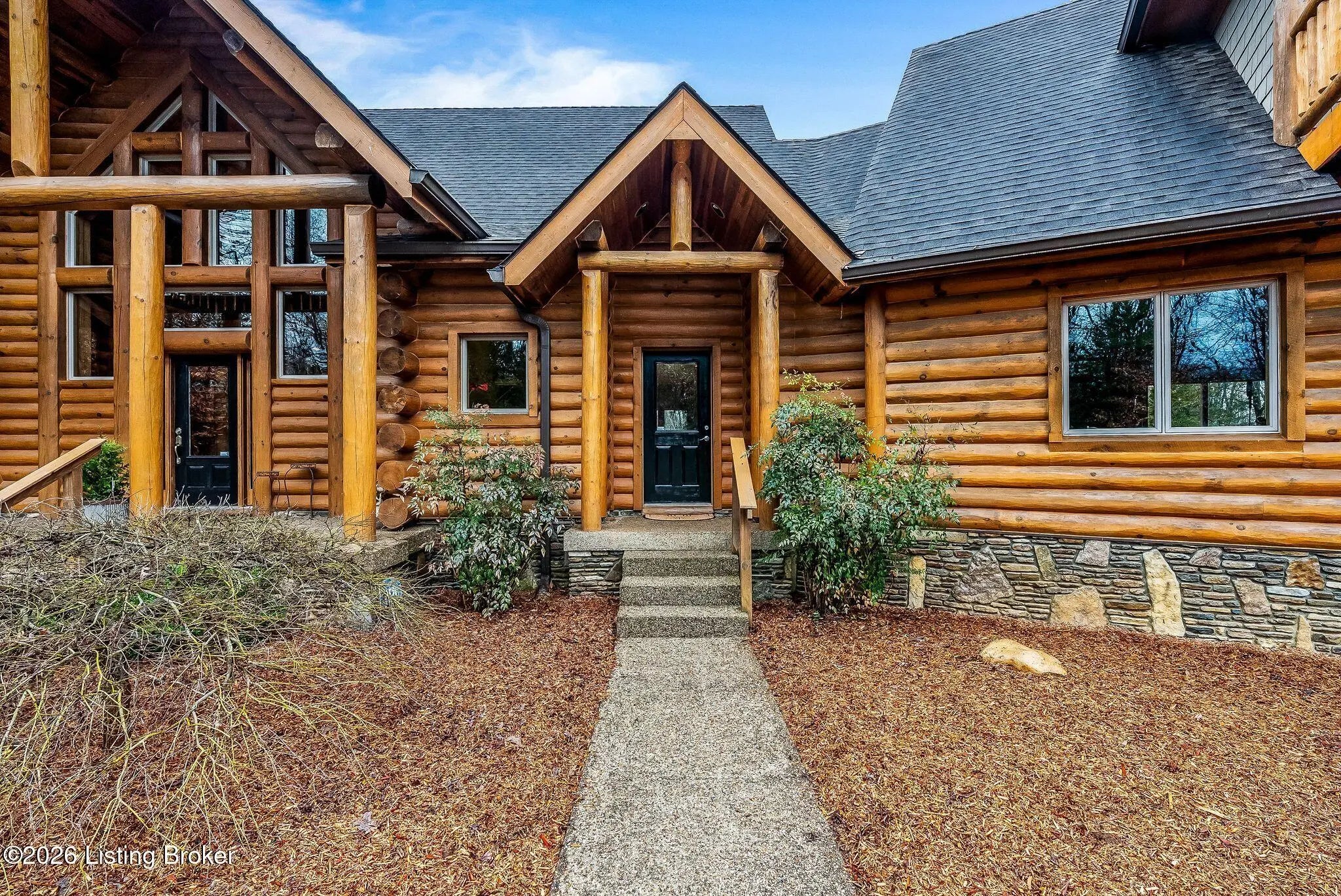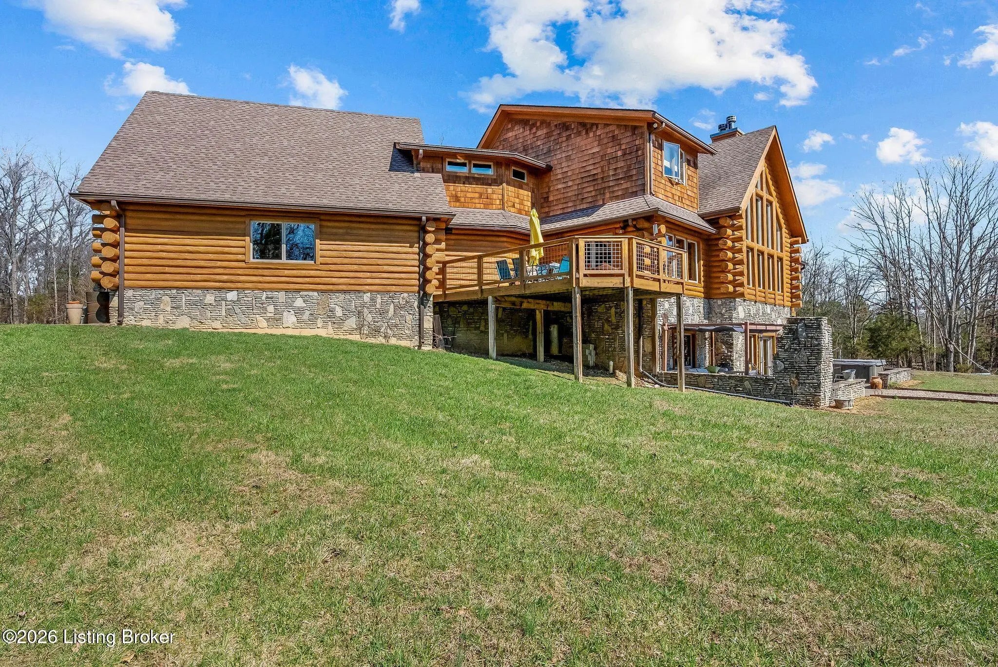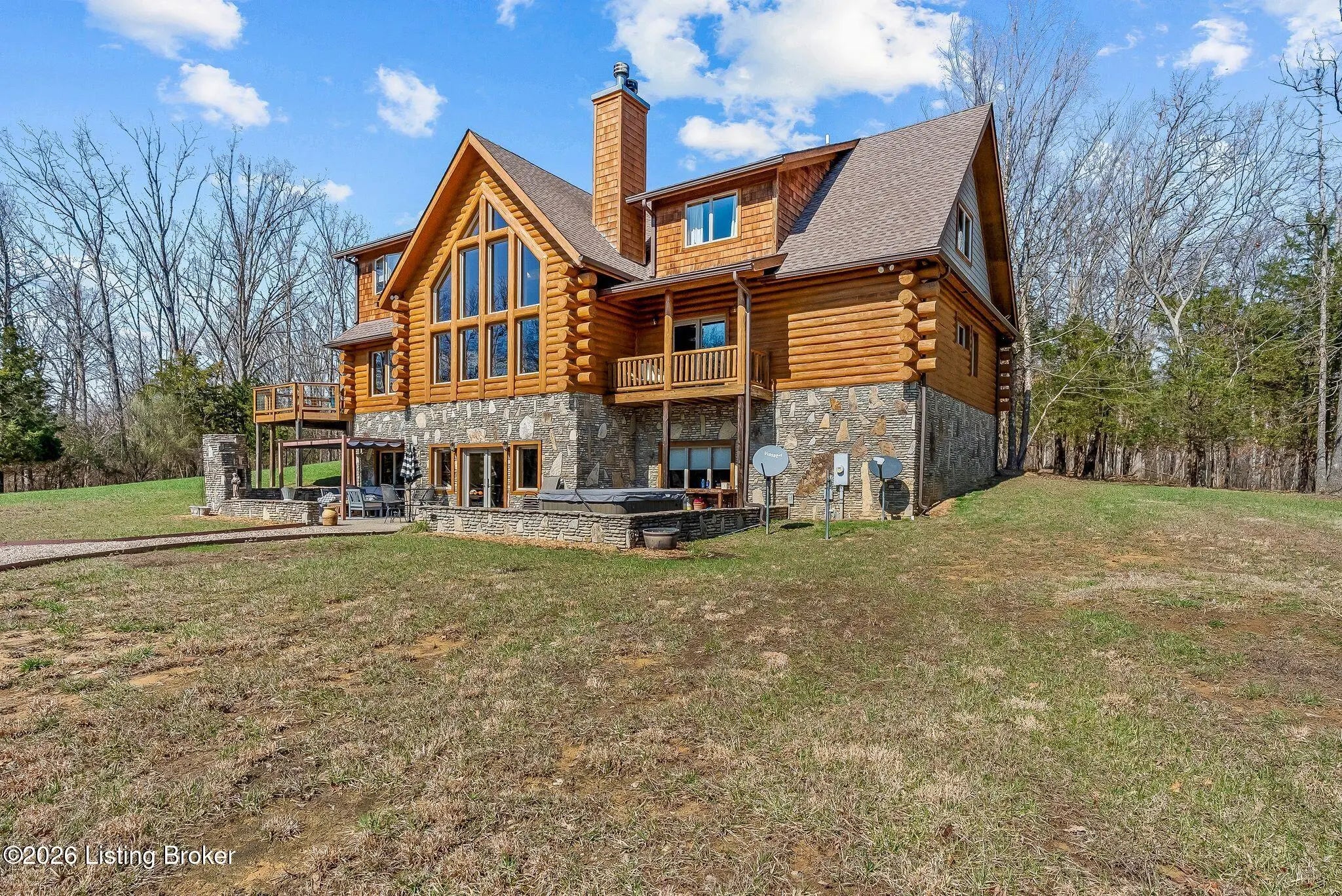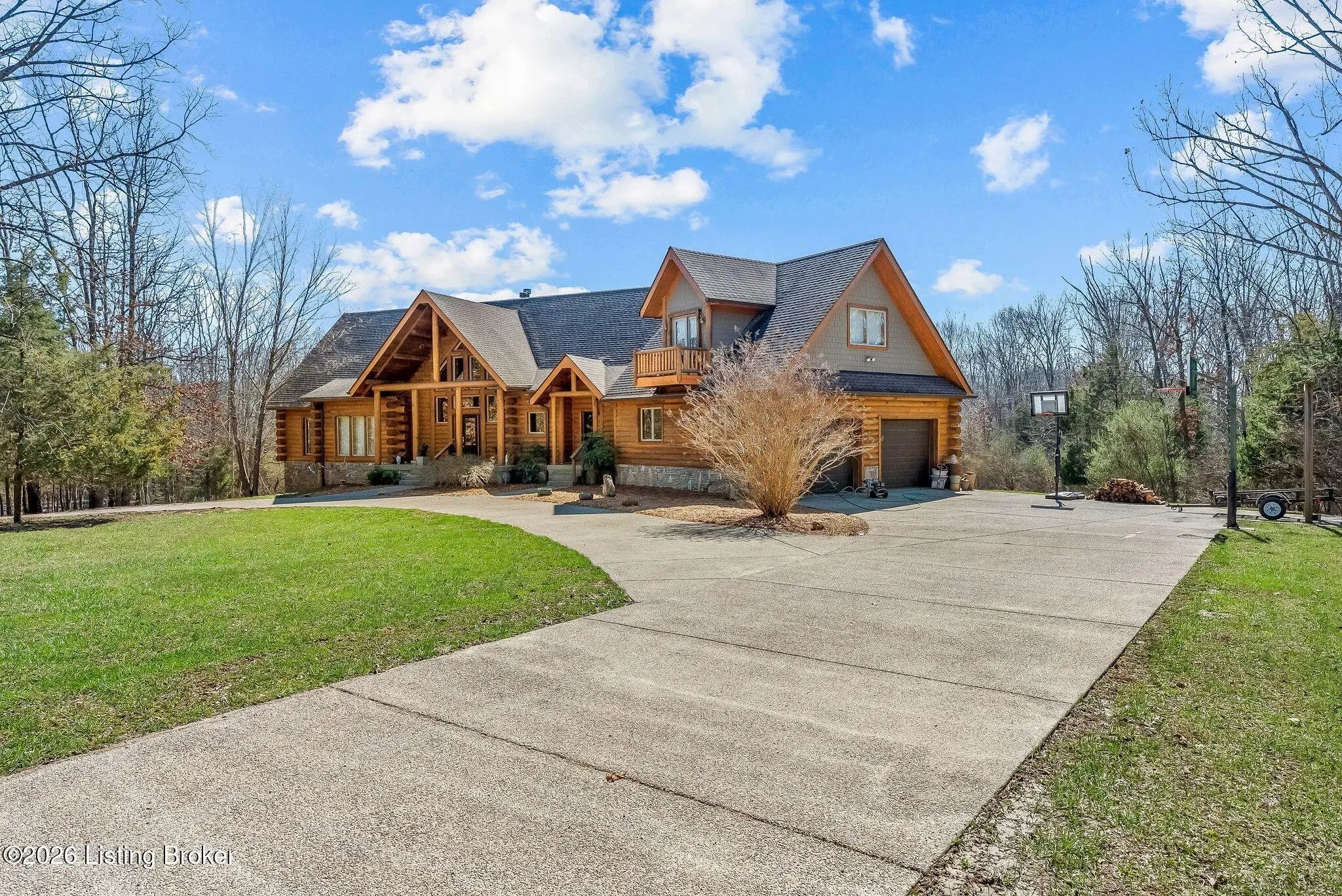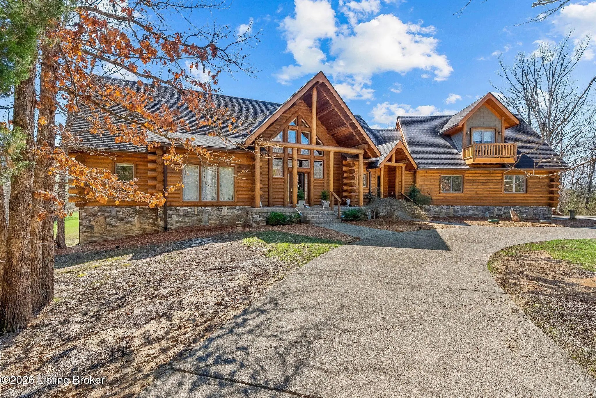 Welcome to 2212 Ballard School Rd in LaGrange, a spectacular custom-built log estate set on 16 private acres with breathtaking views of woods and pasture in every direction. Tucked ¼ mile off the main road, this property offers exceptional privacy while still being just minutes from LaGrange shopping, dining, and I-71. Step inside to a breathtaking great room defined by a dramatic 2.5-story vaulted ceiling and an expansive A-frame wall of windows that fills the space with sunlight and captures sweeping views of the peaceful surroundings. Extraordinary, handcrafted stone masonry anchors the room with a beautiful fireplace and continues throughout both the interior and exterior of the home, highlighting the craftsmanship of this one-of-a-kind property. Acacia wood floors run through the entry, great room, kitchen, and primary suite, adding warmth and character. The first-floor primary suite offers a relaxing retreat with a trey ceiling, sitting area, dual walk-in closets, and private deck overlooking the rear property. The spacious bath includes dual vanity, large tub and walk in shower creating a comfortable and functional layout. Designed for everyday living and entertaining, the kitchen opens to the dining and living areas and includes an oversized pantry, mudroom, and convenient laundry access with direct entry to the oversized two-car garage. Built-in speakers enhance both the kitchen and outdoor deck spaces. Off the dining area, a large deck provides the perfect setting for enjoying the surrounding countryside. Upstairs, you'll find four generously sized bedrooms, including one with a private balcony overlooking the front of the property and another with an en-suite bath. The upper level also features a loft and an additional full bathroom. The finished walkout lower level offers additional living and entertaining space, featuring a bar area and a beautifully crafted hearth with a wood stove, along with doors that open to the rear patio and outdoor gathering area. An additional 1,600+ square feet of unfinished basement provide excellent expansion potential, including two framed and electrically wired rooms ready to be finished and plumbing already installed for a future basement bathroom. Outdoor living is equally impressive with five patios and decks, including the private primary suite balcony. The property also features an outdoor firepit, stone pizza oven, outdoor grilling area, deer stands, dog kennels, and even an ATV included with the property, making the acreage a true outdoor playground. Recent improvements include newly stripped and resealed logs along the rear of the home and rebuilt balcony railings. The home is also equipped with dual geothermal heat pump systems and a whole-house Culligan water filtration system with separate drinking water filtration including a new water heater (2025). With 16 acres of rolling land, partial woods, expansive views, and unmatched privacy, this extraordinary property offers the perfect blend of rustic elegance, modern efficiency, and convenient location. A rare opportunity to own this one-of-a-kind property that offers privacy, character, and incredible craftsmanship while still being conveniently located near LaGrange amenities.