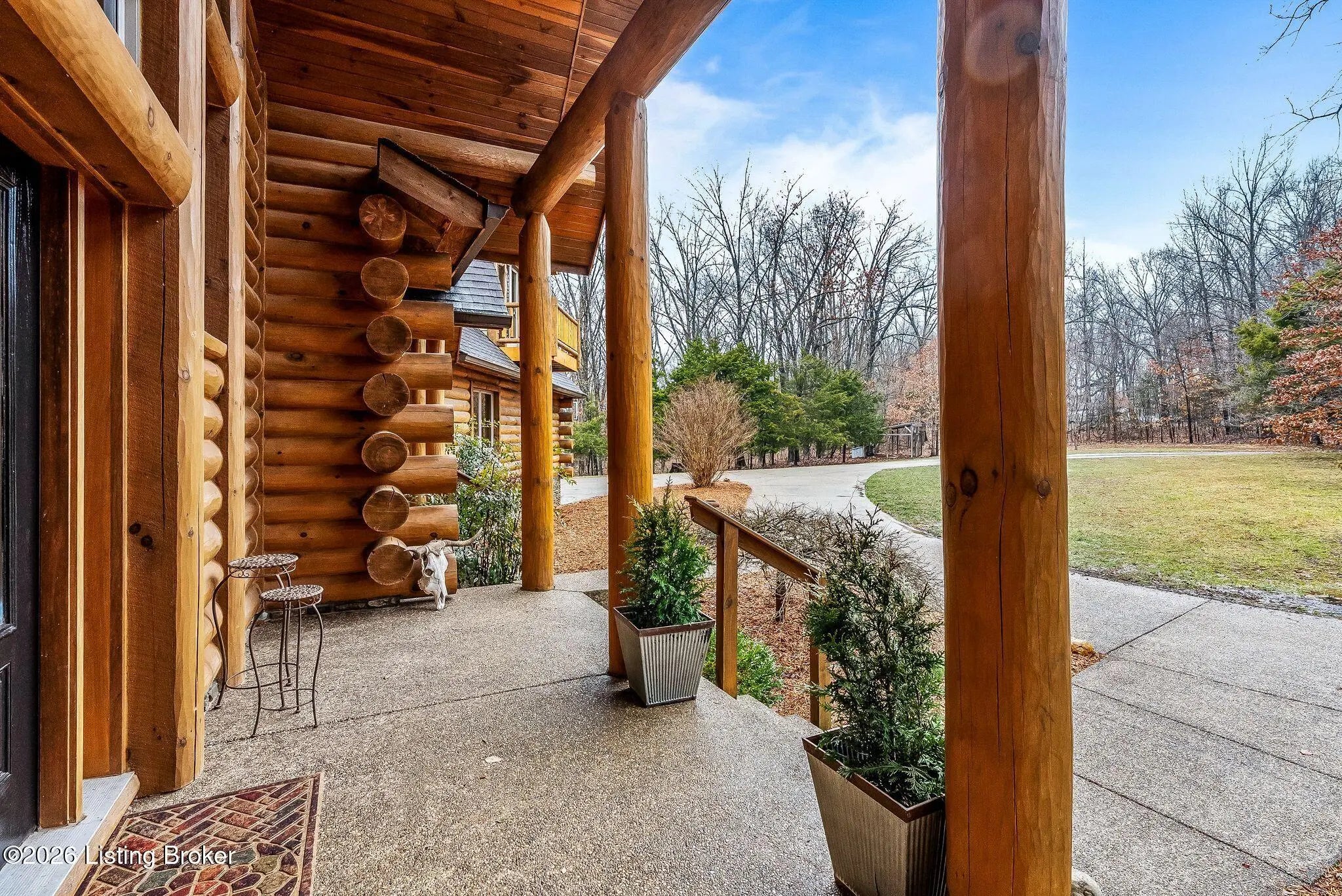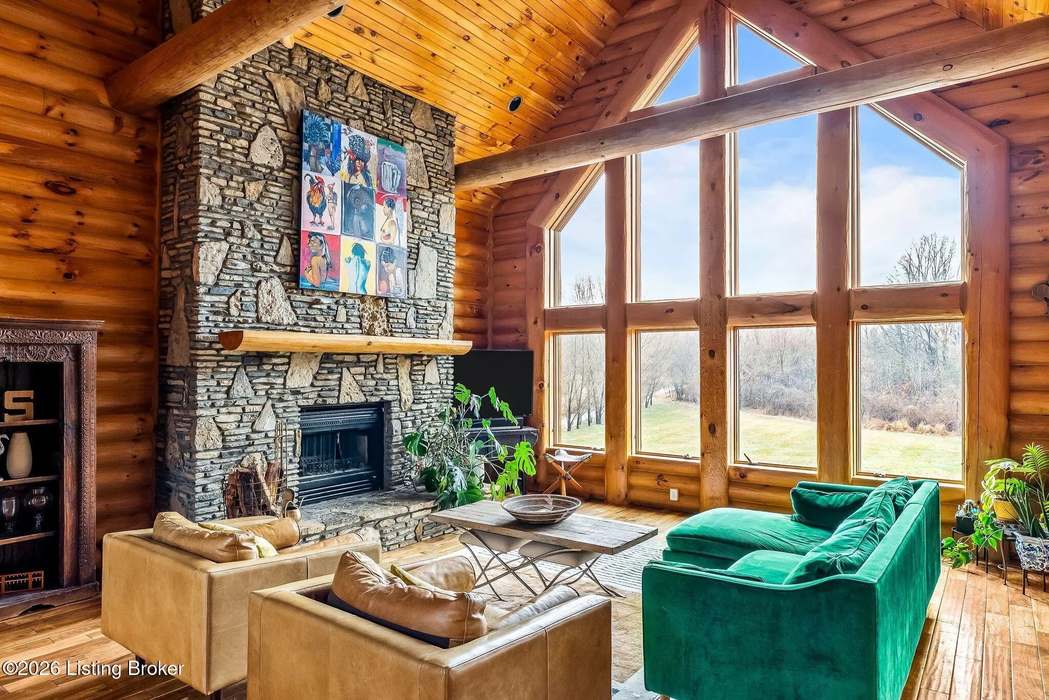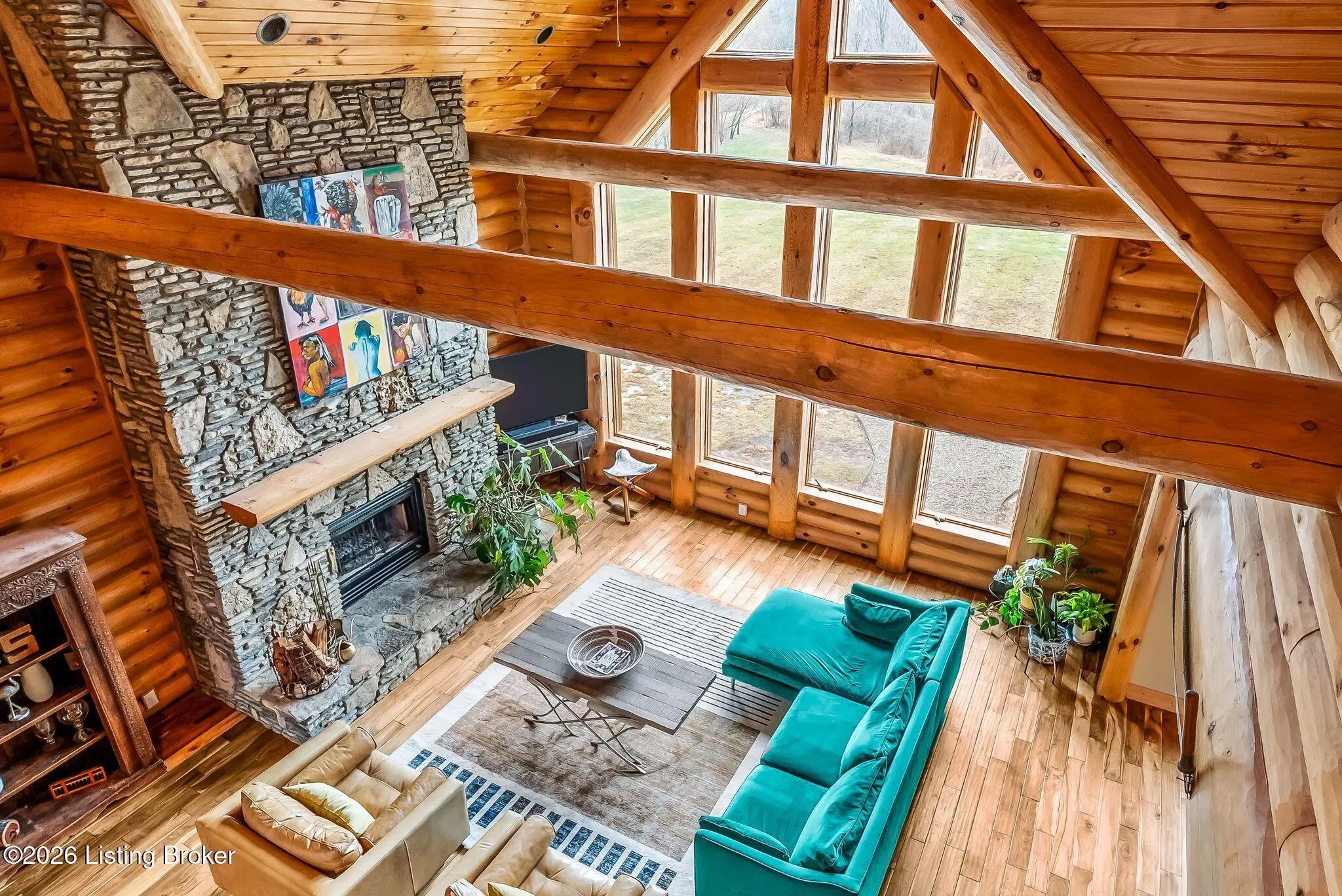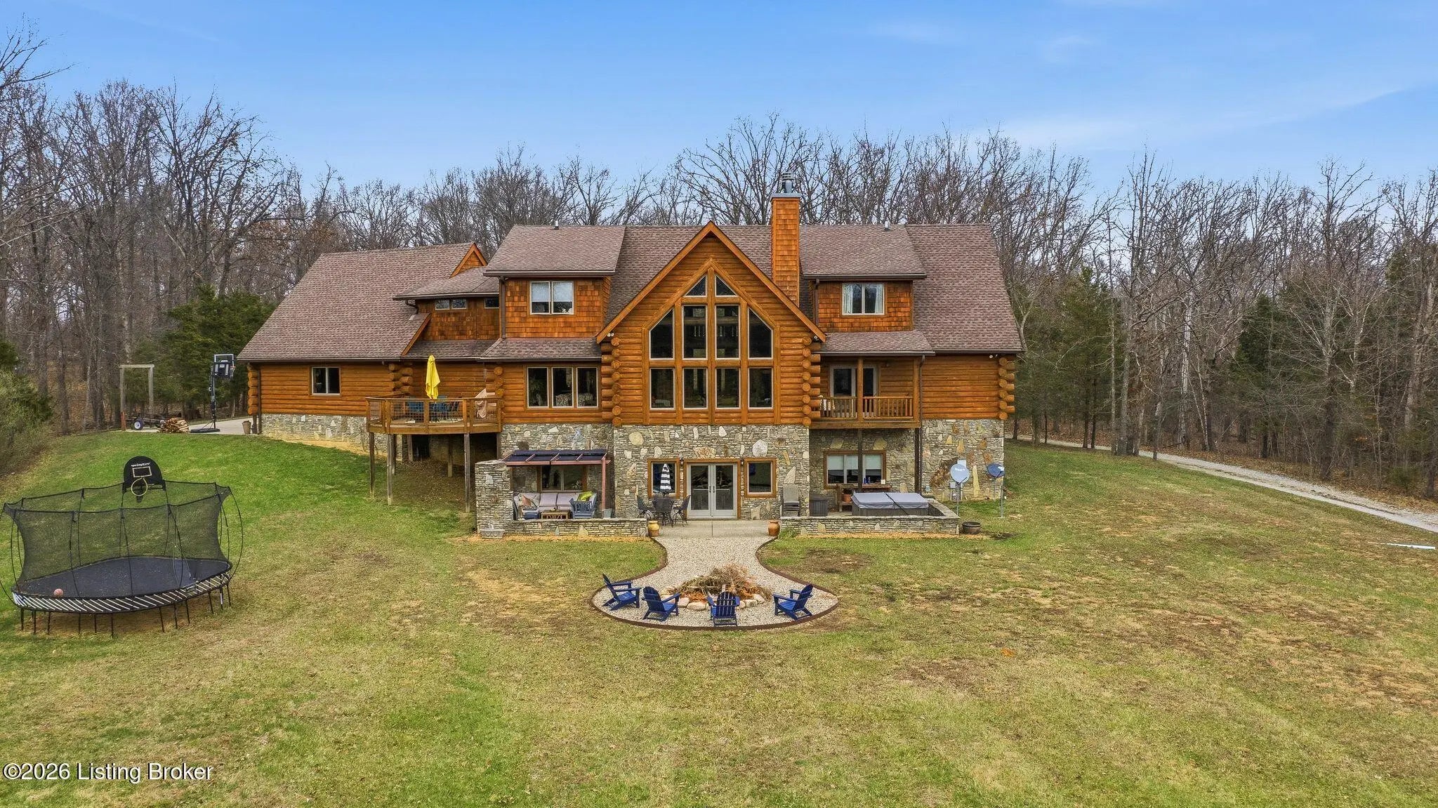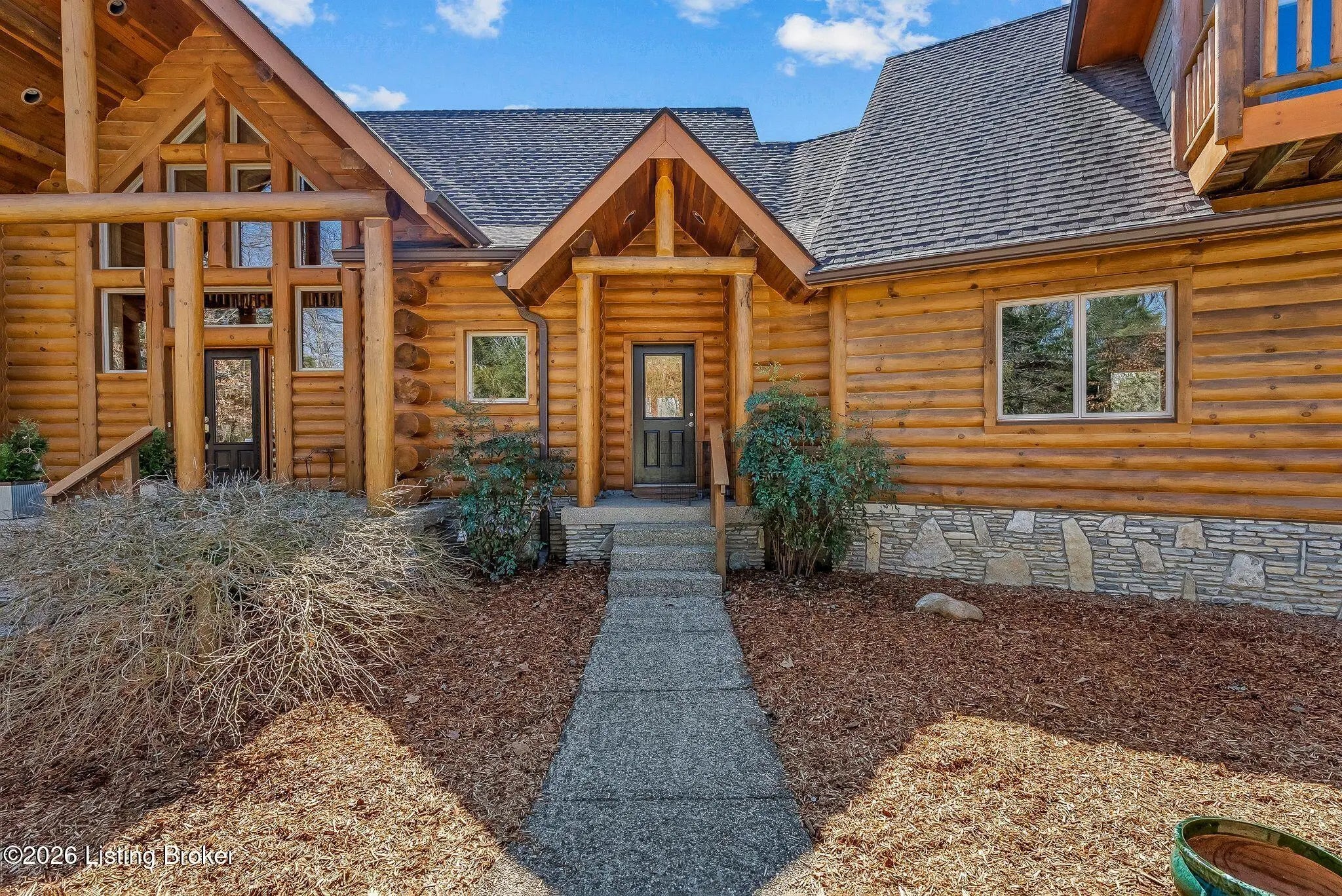 Welcome to 2212 Ballard School Rd in LaGrange, a spectacular custom-built log estate set on 16 private acres with breathtaking views of woods and pasture in every direction. Tucked ¼ mile off the main road, this property offers exceptional privacy while still being just minutes from LaGrange shopping, dining, and I-71. Step inside to a breathtaking great room defined by a dramatic 2.5-story vaulted ceiling and an expansive A-frame wall of windows that fills the space with sunlight and captures sweeping views of the peaceful surroundings. Extraordinary, handcrafted stone masonry anchors the room with a beautiful fireplace and continues throughout both the interior and exterior of the home, highlighting the craftsmanship of this one-of-a-kind property. Acacia wood floors run through the entry, great room, kitchen, and primary suite, adding warmth and character. The first-floor primary suite offers a relaxing retreat with a trey ceiling, sitting area, dual walk-in closets, and private deck overlooking the rear property. The spacious bath includes dual vanity, large tub and walk in shower creating a comfortable and functional layout. Designed for everyday living and entertaining, the kitchen opens to the dining and living areas and includes an oversized pantry, mudroom, and convenient laundry access with direct entry to the oversized two-car garage. Built-in speakers enhance both the kitchen and outdoor deck spaces. Off the dining area, a large deck provides the perfect setting for enjoying the surrounding countryside. Upstairs, you'll find four generously sized bedrooms, including one with a private balcony overlooking the front of the property and another with an en-suite bath. The upper level also features a loft and an additional full bathroom. The finished walkout lower level offers additional living and entertaining space, featuring a bar area and a beautifully crafted hearth with a wood stove, along with doors that open to the rear patio and outdoor gathering area. An additional 1,600+ square feet of unfinished basement provide excellent expansion potential, including two framed and electrically wired rooms ready to be finished and plumbing already installed for a future basement bathroom. Outdoor living is equally impressive with five patios and decks, including the private primary suite balcony. The property also features an outdoor firepit, stone pizza oven, outdoor grilling area, deer stands, dog kennels, and even an ATV included with the property, making the acreage a true outdoor playground. Recent improvements include newly stripped and resealed logs along the rear of the home and rebuilt balcony railings. The home is also equipped with dual geothermal heat pump systems and a whole-house Culligan water filtration system with separate drinking water filtration including a new water heater (2025). With 16 acres of rolling land, partial woods, expansive views, and unmatched privacy, this extraordinary property offers the perfect blend of rustic elegance, modern efficiency, and convenient location. A rare opportunity to own this one-of-a-kind property that offers privacy, character, and incredible craftsmanship while still being conveniently located near LaGrange amenities.