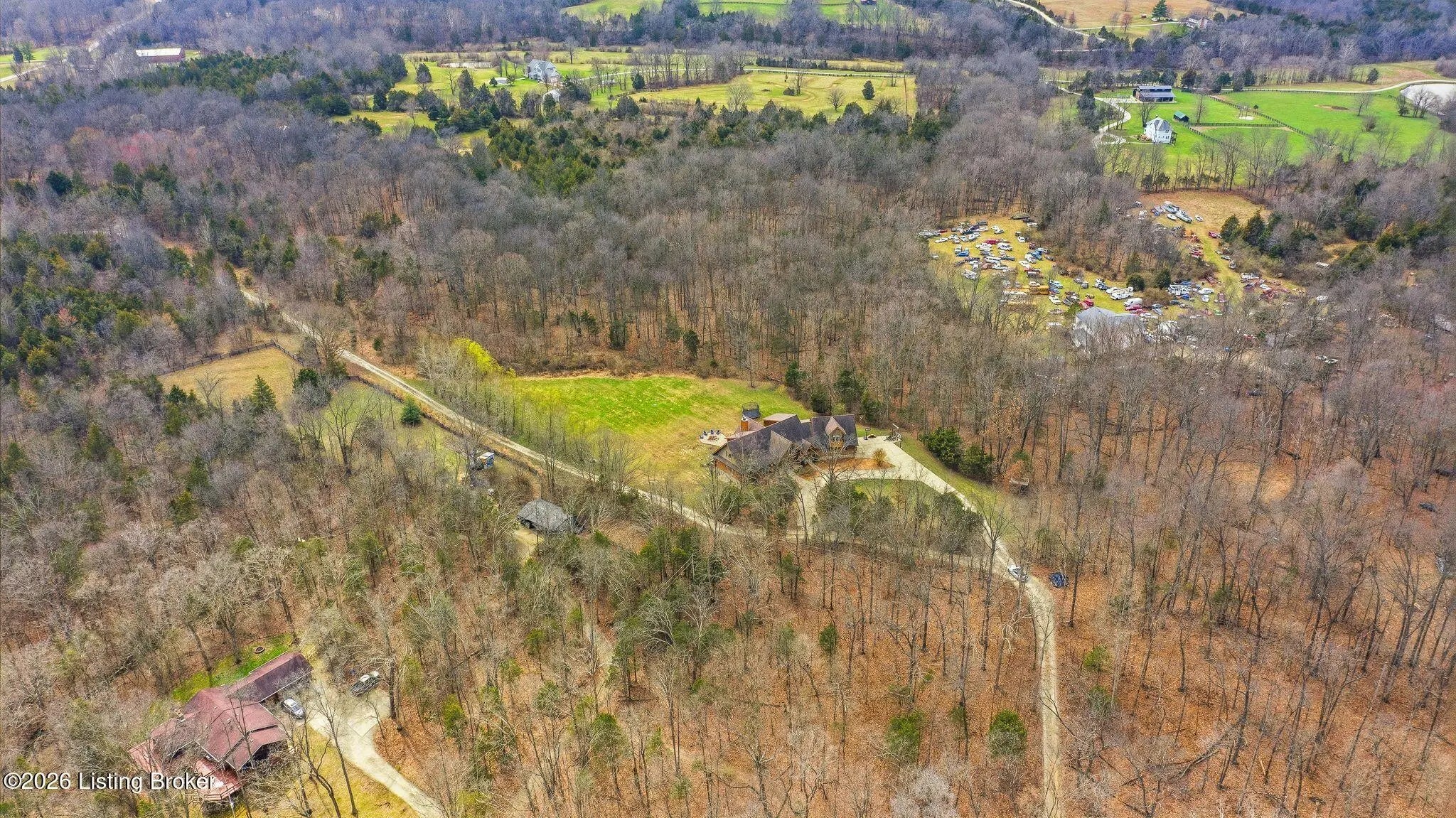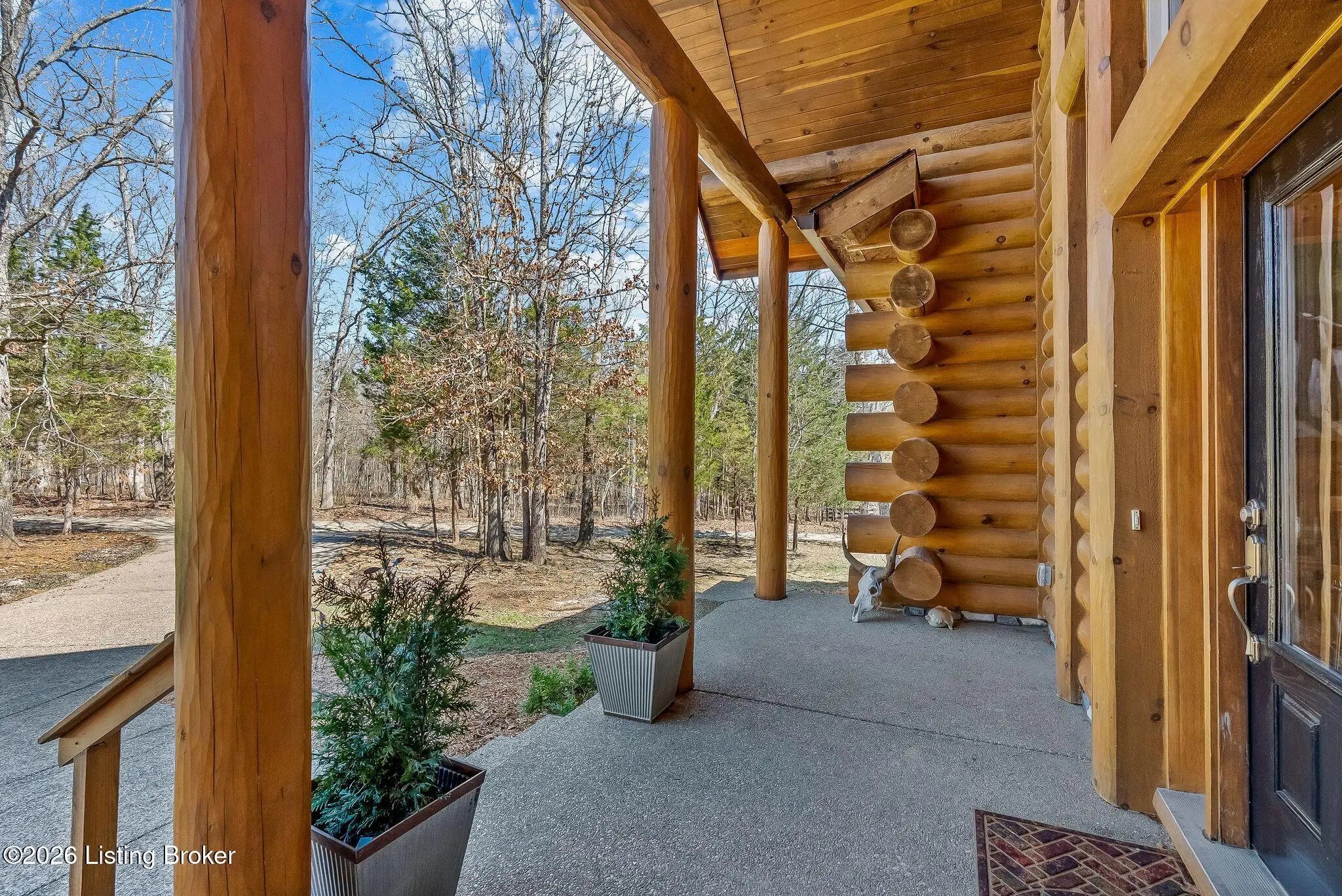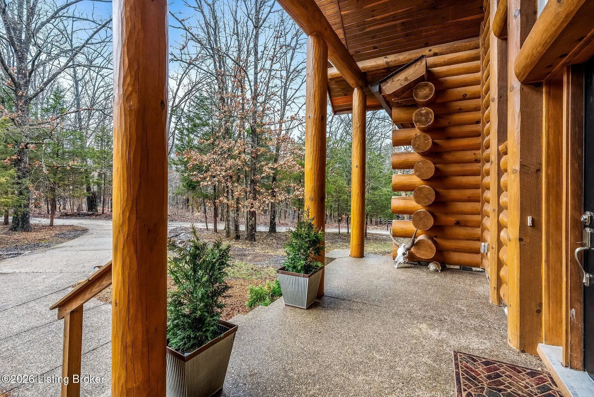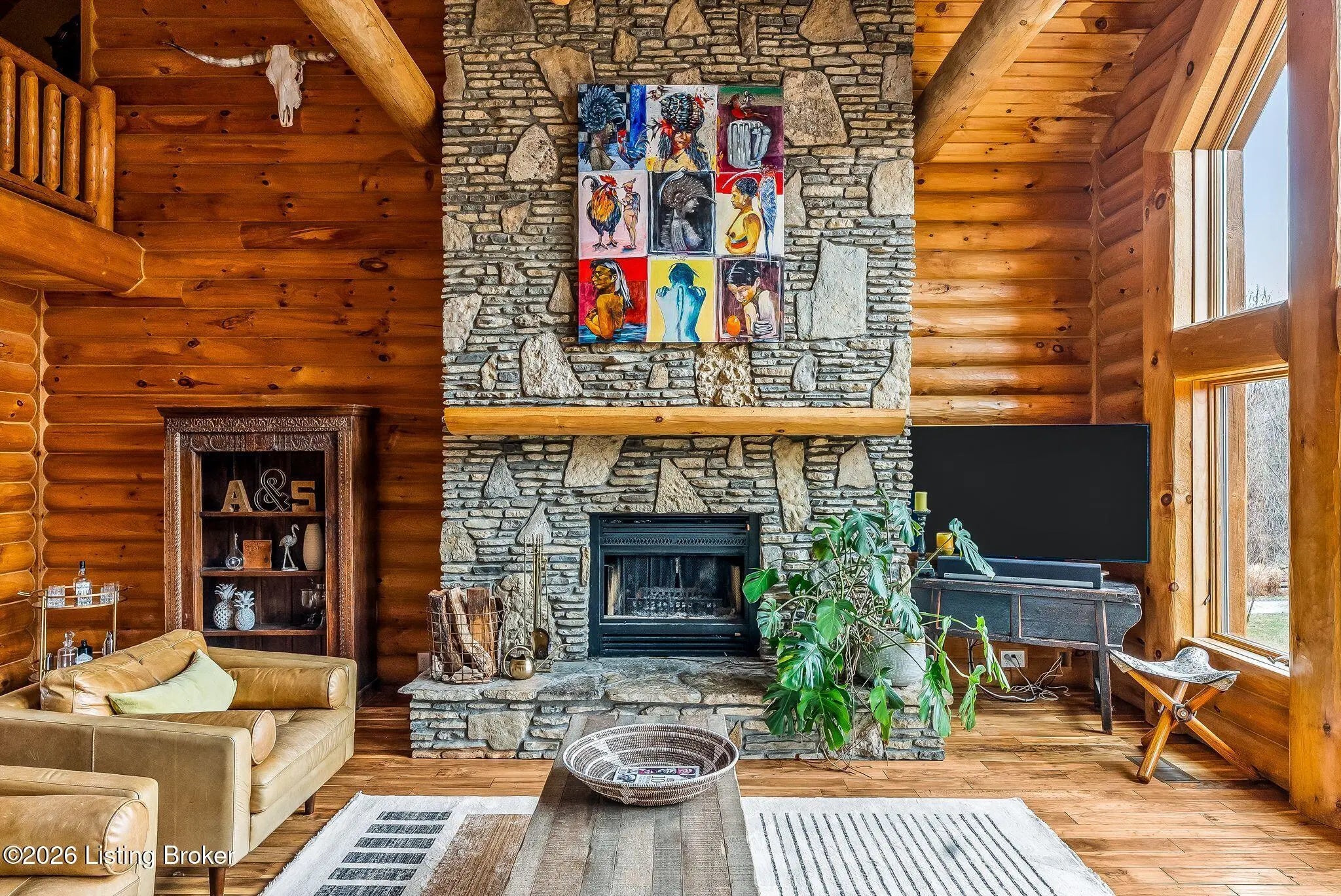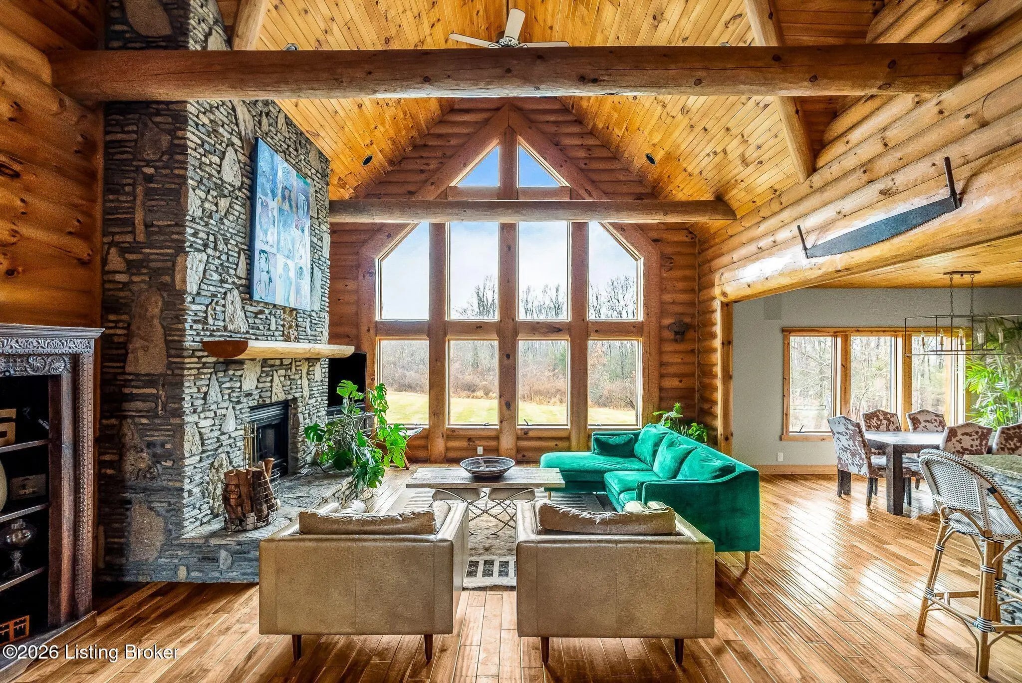 Welcome to 2212 Ballard School Rd in LaGrange, a spectacular custom-built log estate set on 16 private acres with breathtaking views of woods and pasture in every direction. Tucked ¼ mile off the main road, this property offers exceptional privacy while still being just minutes from LaGrange shopping, dining, and I-71. Step inside to a breathtaking great room defined by a dramatic 2.5-story vaulted ceiling and an expansive A-frame wall of windows that fills the space with sunlight and captures sweeping views of the peaceful surroundings. Extraordinary, handcrafted stone masonry anchors the room with a beautiful fireplace and continues throughout both the interior and exterior of the home, highlighting the craftsmanship of this one-of-a-kind property. Acacia wood floors run through the entry, great room, kitchen, and primary suite, adding warmth and character. The first-floor primary suite offers a relaxing retreat with a trey ceiling, sitting area, dual walk-in closets, and private deck overlooking the rear property. The spacious bath includes dual vanity, large tub and walk in shower creating a comfortable and functional layout. Designed for everyday living and entertaining, the kitchen opens to the dining and living areas and includes an oversized pantry, mudroom, and convenient laundry access with direct entry to the oversized two-car garage. Built-in speakers enhance both the kitchen and outdoor deck spaces. Off the dining area, a large deck provides the perfect setting for enjoying the surrounding countryside. Upstairs, you'll find four generously sized bedrooms, including one with a private balcony overlooking the front of the property and another with an en-suite bath. The upper level also features a loft and an additional full bathroom. The finished walkout lower level offers additional living and entertaining space, featuring a bar area and a beautifully crafted hearth with a wood stove, along with doors that open to the rear patio and outdoor gathering area. An additional 1,600+ square feet of unfinished basement provide excellent expansion potential, including two framed and electrically wired rooms ready to be finished and plumbing already installed for a future basement bathroom. Outdoor living is equally impressive with five patios and decks, including the private primary suite balcony. The property also features an outdoor firepit, stone pizza oven, outdoor grilling area, deer stands, dog kennels, and even an ATV included with the property, making the acreage a true outdoor playground. Recent improvements include newly stripped and resealed logs along the rear of the home and rebuilt balcony railings. The home is also equipped with dual geothermal heat pump systems and a whole-house Culligan water filtration system with separate drinking water filtration including a new water heater (2025). With 16 acres of rolling land, partial woods, expansive views, and unmatched privacy, this extraordinary property offers the perfect blend of rustic elegance, modern efficiency, and convenient location. A rare opportunity to own this one-of-a-kind property that offers privacy, character, and incredible craftsmanship while still being conveniently located near LaGrange amenities.