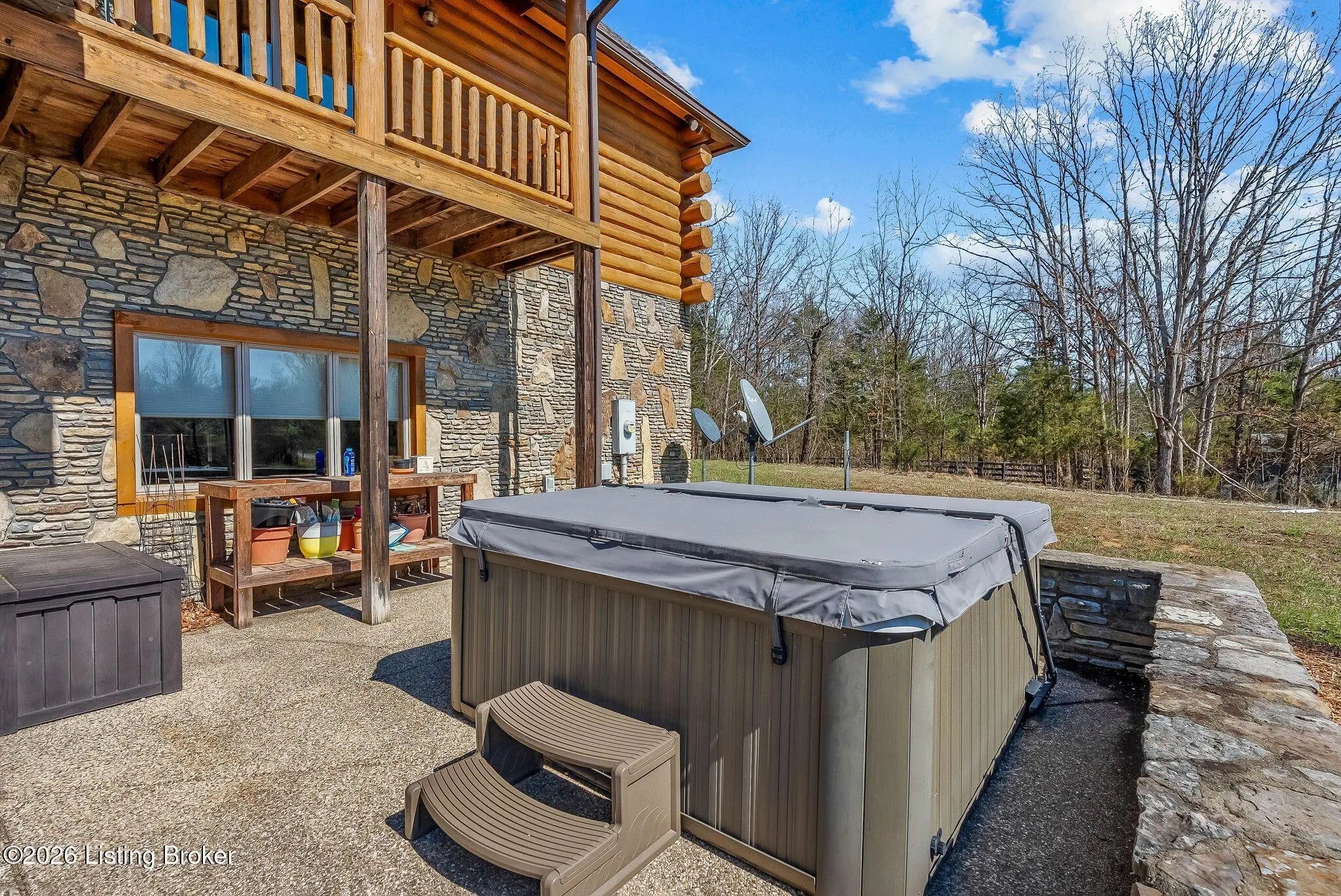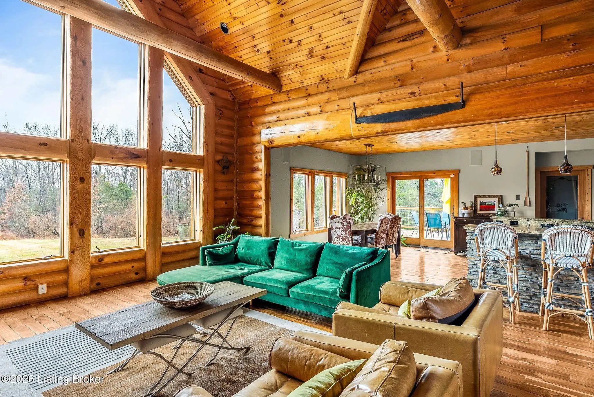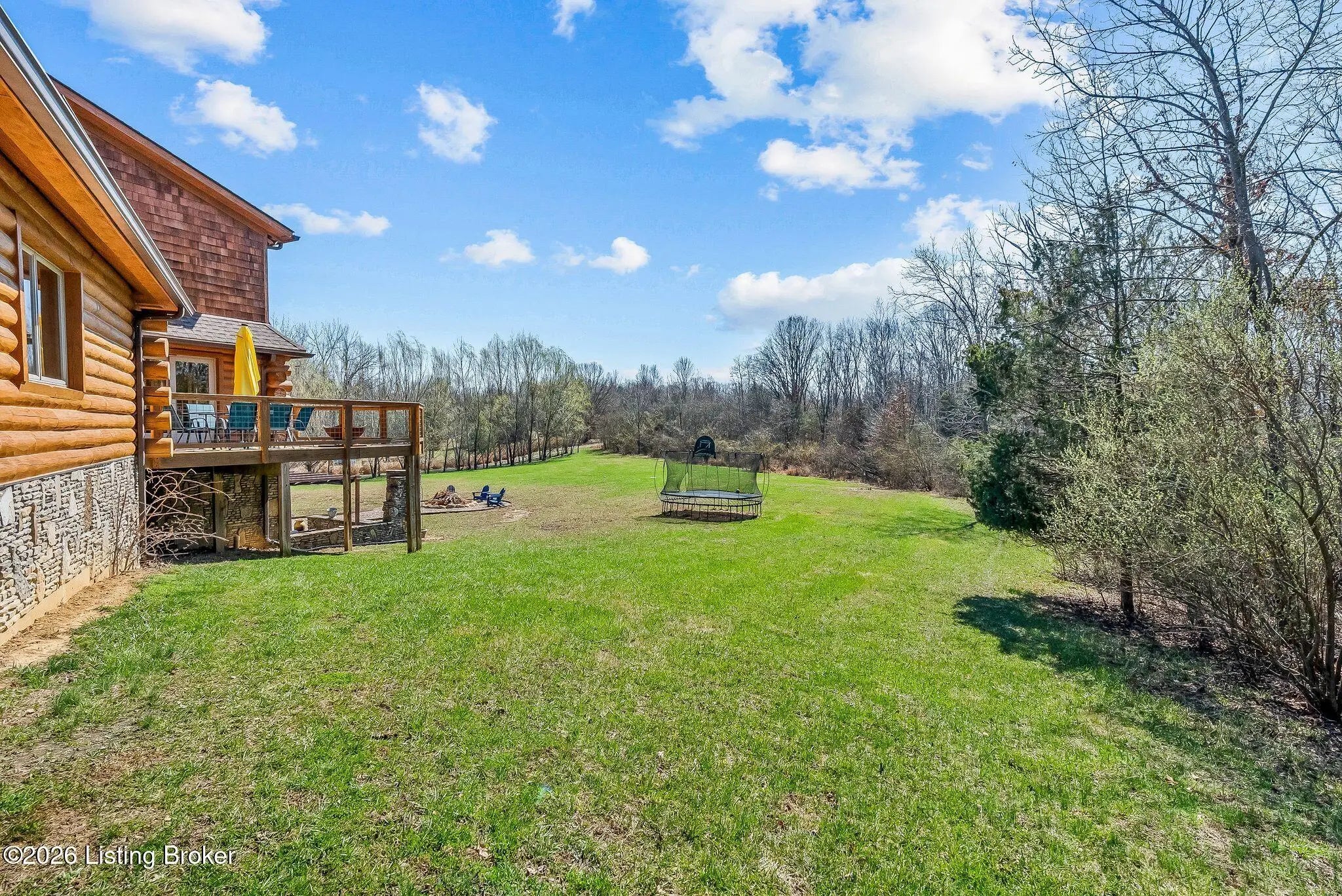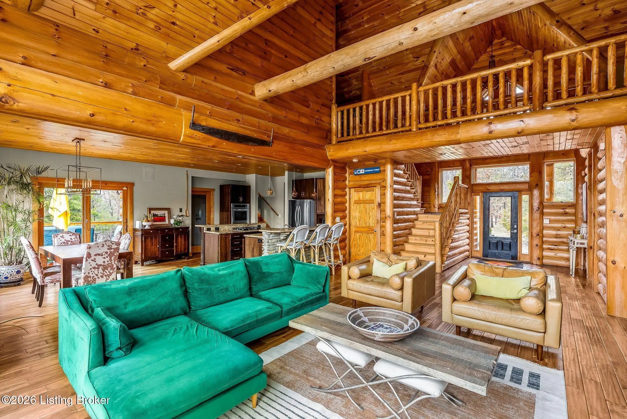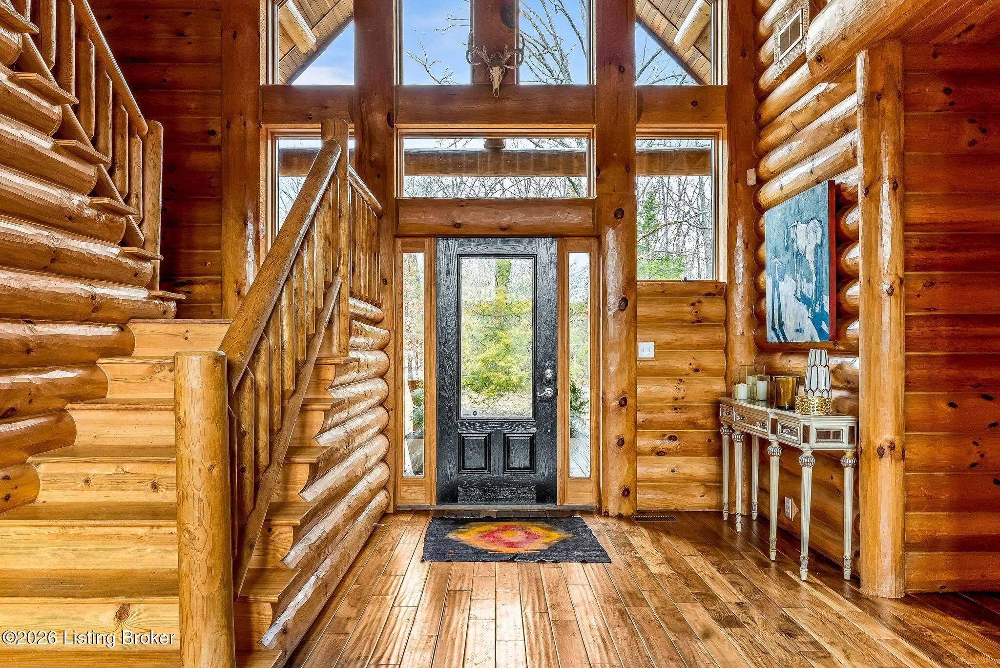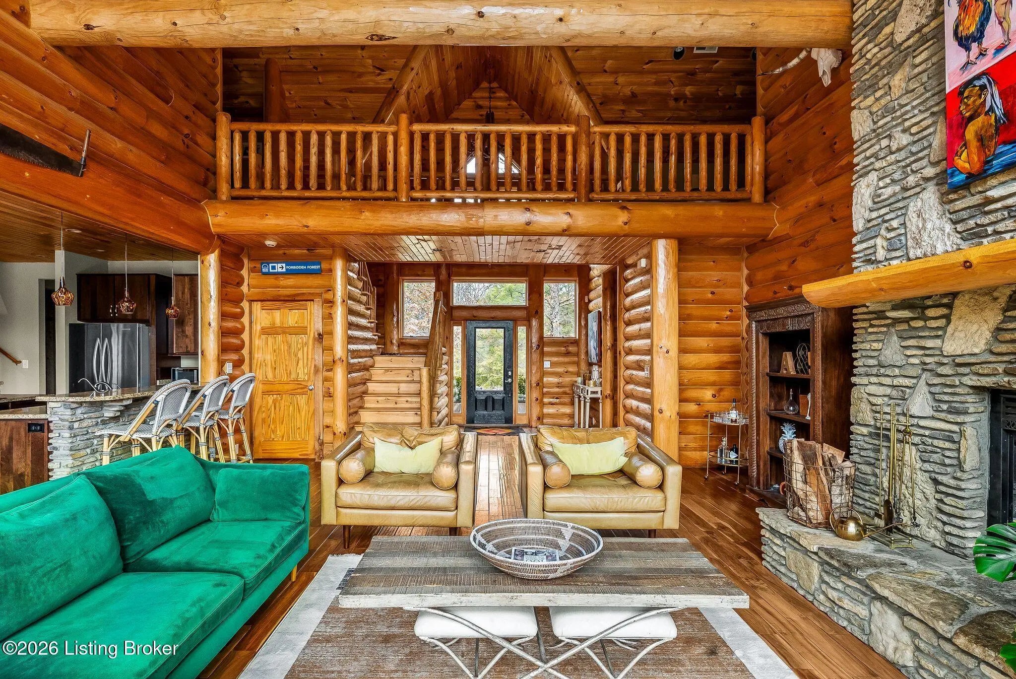 Welcome to 2212 Ballard School Rd in LaGrange, a spectacular custom-built log estate set on 16 private acres with breathtaking views of woods and pasture in every direction. Tucked ¼ mile off the main road, this property offers exceptional privacy while still being just minutes from LaGrange shopping, dining, and I-71. Step inside to a breathtaking great room defined by a dramatic 2.5-story vaulted ceiling and an expansive A-frame wall of windows that fills the space with sunlight and captures sweeping views of the peaceful surroundings. Extraordinary, handcrafted stone masonry anchors the room with a beautiful fireplace and continues throughout both the interior and exterior of the home, highlighting the craftsmanship of this one-of-a-kind property. Acacia wood floors run through the entry, great room, kitchen, and primary suite, adding warmth and character. The first-floor primary suite offers a relaxing retreat with a trey ceiling, sitting area, dual walk-in closets, and private deck overlooking the rear property. The spacious bath includes dual vanity, large tub and walk in shower creating a comfortable and functional layout. Designed for everyday living and entertaining, the kitchen opens to the dining and living areas and includes an oversized pantry, mudroom, and convenient laundry access with direct entry to the oversized two-car garage. Built-in speakers enhance both the kitchen and outdoor deck spaces. Off the dining area, a large deck provides the perfect setting for enjoying the surrounding countryside. Upstairs, you'll find four generously sized bedrooms, including one with a private balcony overlooking the front of the property and another with an en-suite bath. The upper level also features a loft and an additional full bathroom. The finished walkout lower level offers additional living and entertaining space, featuring a bar area and a beautifully crafted hearth with a wood stove, along with doors that open to the rear patio and outdoor gathering area. An additional 1,600+ square feet of unfinished basement provide excellent expansion potential, including two framed and electrically wired rooms ready to be finished and plumbing already installed for a future basement bathroom. Outdoor living is equally impressive with five patios and decks, including the private primary suite balcony. The property also features an outdoor firepit, stone pizza oven, outdoor grilling area, deer stands, dog kennels, and even an ATV included with the property, making the acreage a true outdoor playground. Recent improvements include newly stripped and resealed logs along the rear of the home and rebuilt balcony railings. The home is also equipped with dual geothermal heat pump systems and a whole-house Culligan water filtration system with separate drinking water filtration including a new water heater (2025). With 16 acres of rolling land, partial woods, expansive views, and unmatched privacy, this extraordinary property offers the perfect blend of rustic elegance, modern efficiency, and convenient location. A rare opportunity to own this one-of-a-kind property that offers privacy, character, and incredible craftsmanship while still being conveniently located near LaGrange amenities.
