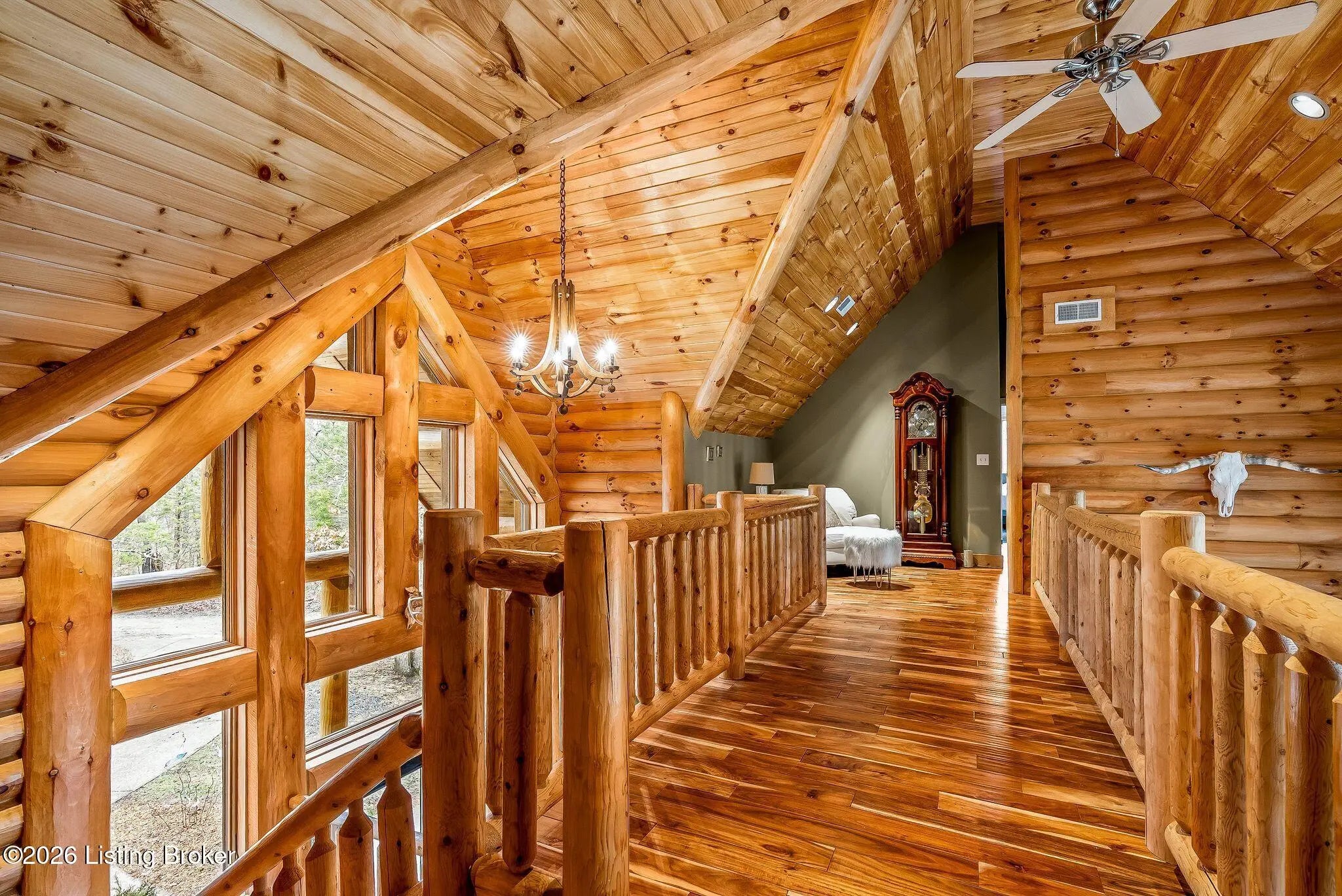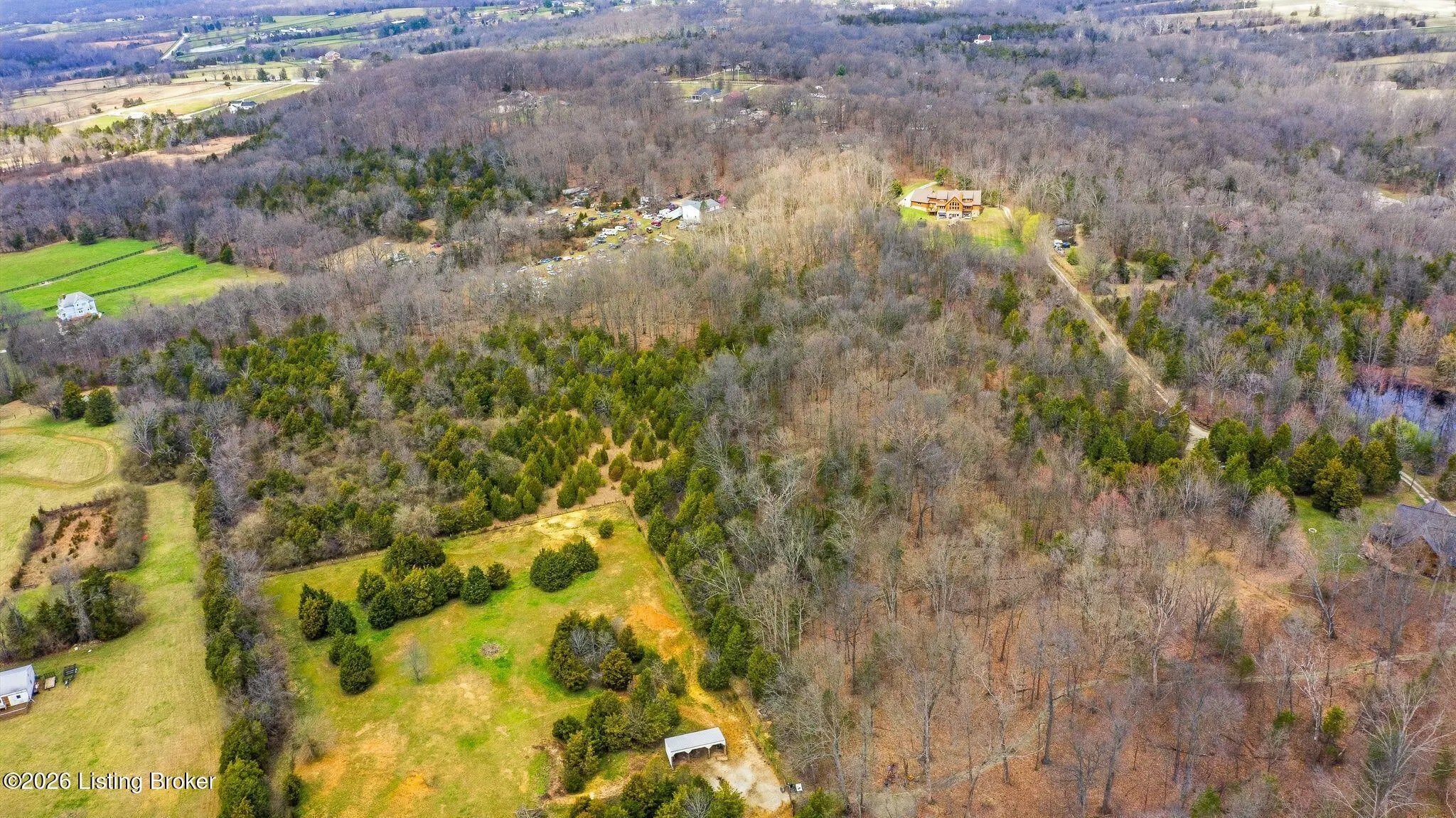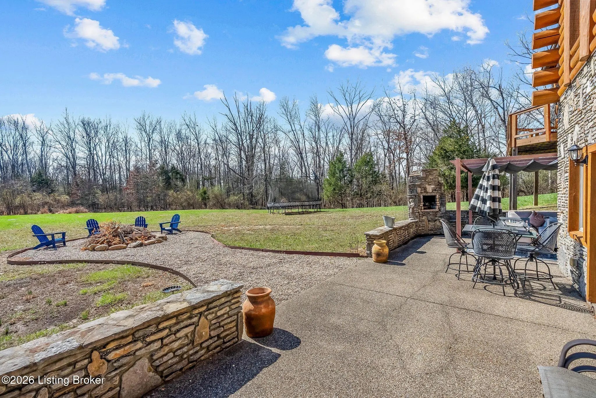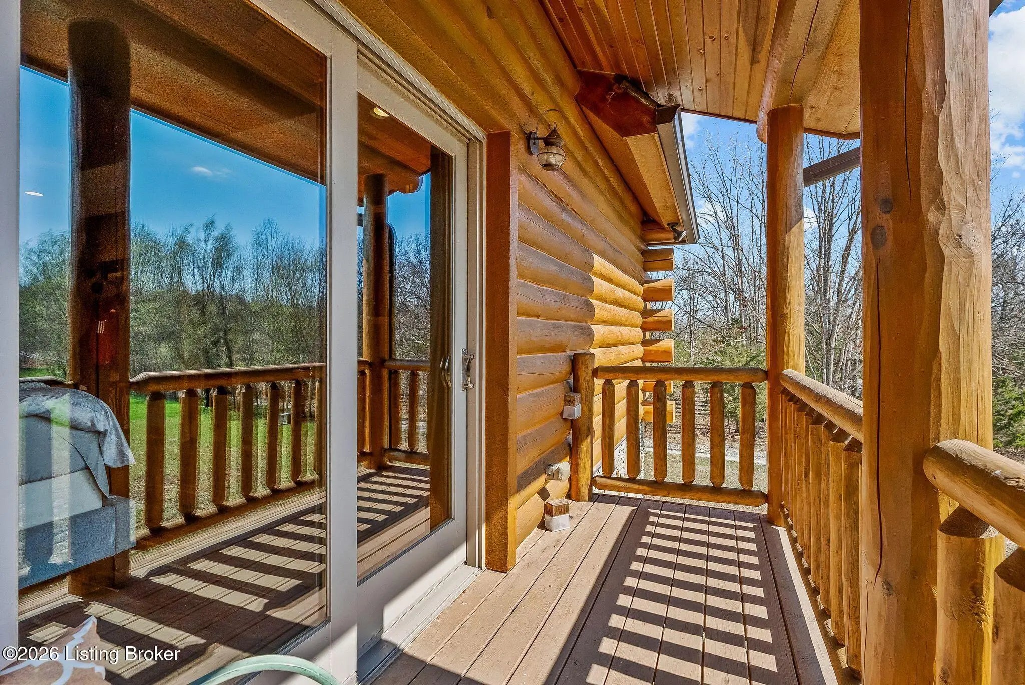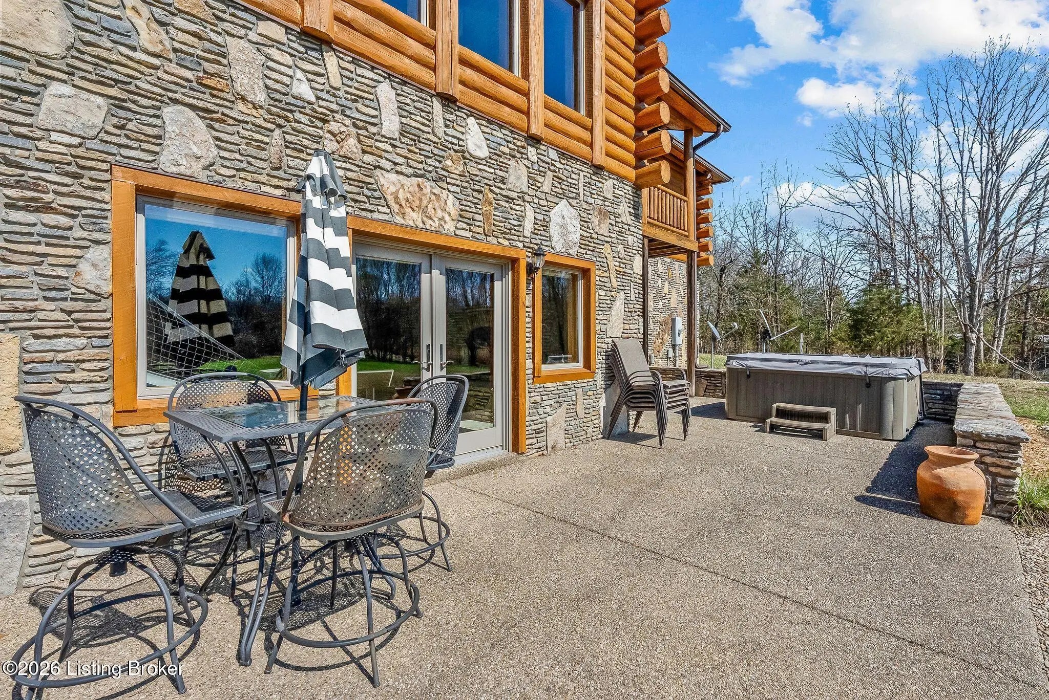 Welcome to 2212 Ballard School Rd in LaGrange, a spectacular custom-built log estate set on 16 private acres with breathtaking views of woods and pasture in every direction. Tucked ¼ mile off the main road, this property offers exceptional privacy while still being just minutes from LaGrange shopping, dining, and I-71. Step inside to a breathtaking great room defined by a dramatic 2.5-story vaulted ceiling and an expansive A-frame wall of windows that fills the space with sunlight and captures sweeping views of the peaceful surroundings. Extraordinary, handcrafted stone masonry anchors the room with a beautiful fireplace and continues throughout both the interior and exterior of the home, highlighting the craftsmanship of this one-of-a-kind property. Acacia wood floors run through the entry, great room, kitchen, and primary suite, adding warmth and character. The first-floor primary suite offers a relaxing retreat with a trey ceiling, sitting area, dual walk-in closets, and private deck overlooking the rear property. The spacious bath includes dual vanity, large tub and walk in shower creating a comfortable and functional layout. Designed for everyday living and entertaining, the kitchen opens to the dining and living areas and includes an oversized pantry, mudroom, and convenient laundry access with direct entry to the oversized two-car garage. Built-in speakers enhance both the kitchen and outdoor deck spaces. Off the dining area, a large deck provides the perfect setting for enjoying the surrounding countryside. Upstairs, you'll find four generously sized bedrooms, including one with a private balcony overlooking the front of the property and another with an en-suite bath. The upper level also features a loft and an additional full bathroom. The finished walkout lower level offers additional living and entertaining space, featuring a bar area and a beautifully crafted hearth with a wood stove, along with doors that open to the rear patio and outdoor gathering area. An additional 1,600+ square feet of unfinished basement provide excellent expansion potential, including two framed and electrically wired rooms ready to be finished and plumbing already installed for a future basement bathroom. Outdoor living is equally impressive with five patios and decks, including the private primary suite balcony. The property also features an outdoor firepit, stone pizza oven, outdoor grilling area, deer stands, dog kennels, and even an ATV included with the property, making the acreage a true outdoor playground. Recent improvements include newly stripped and resealed logs along the rear of the home and rebuilt balcony railings. The home is also equipped with dual geothermal heat pump systems and a whole-house Culligan water filtration system with separate drinking water filtration including a new water heater (2025). With 16 acres of rolling land, partial woods, expansive views, and unmatched privacy, this extraordinary property offers the perfect blend of rustic elegance, modern efficiency, and convenient location. A rare opportunity to own this one-of-a-kind property that offers privacy, character, and incredible craftsmanship while still being conveniently located near LaGrange amenities.