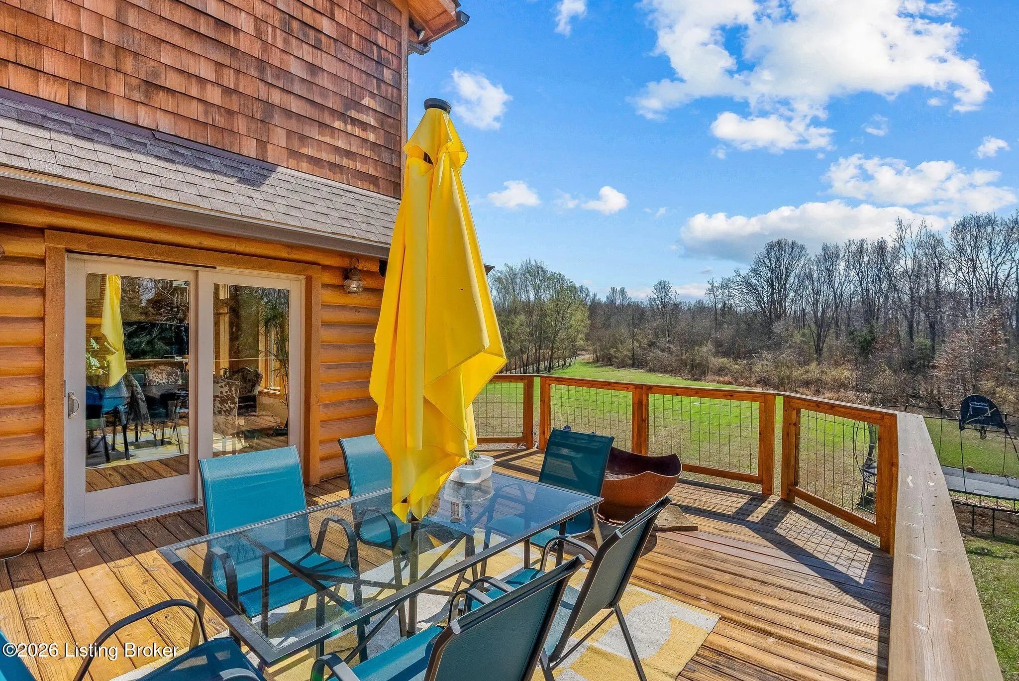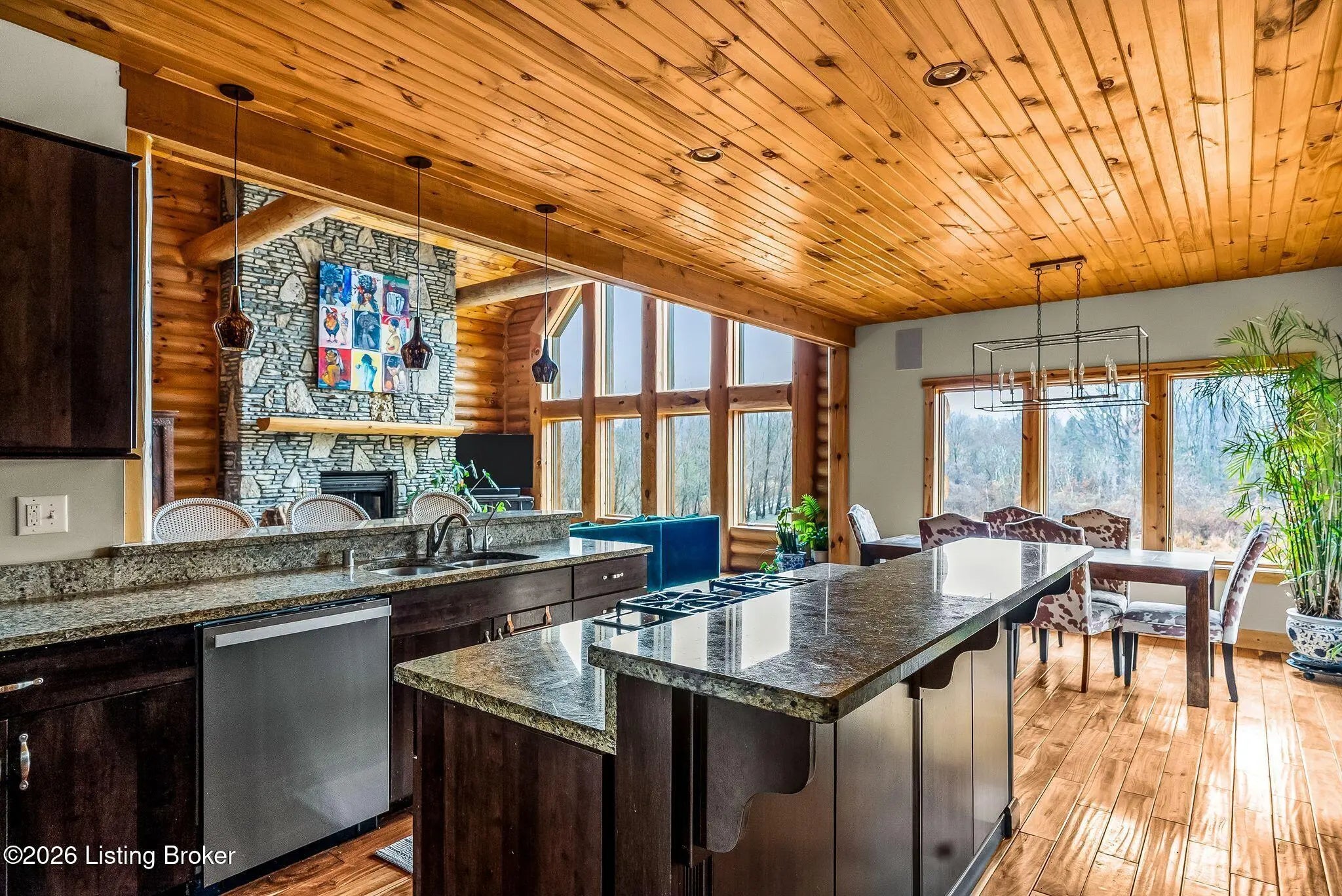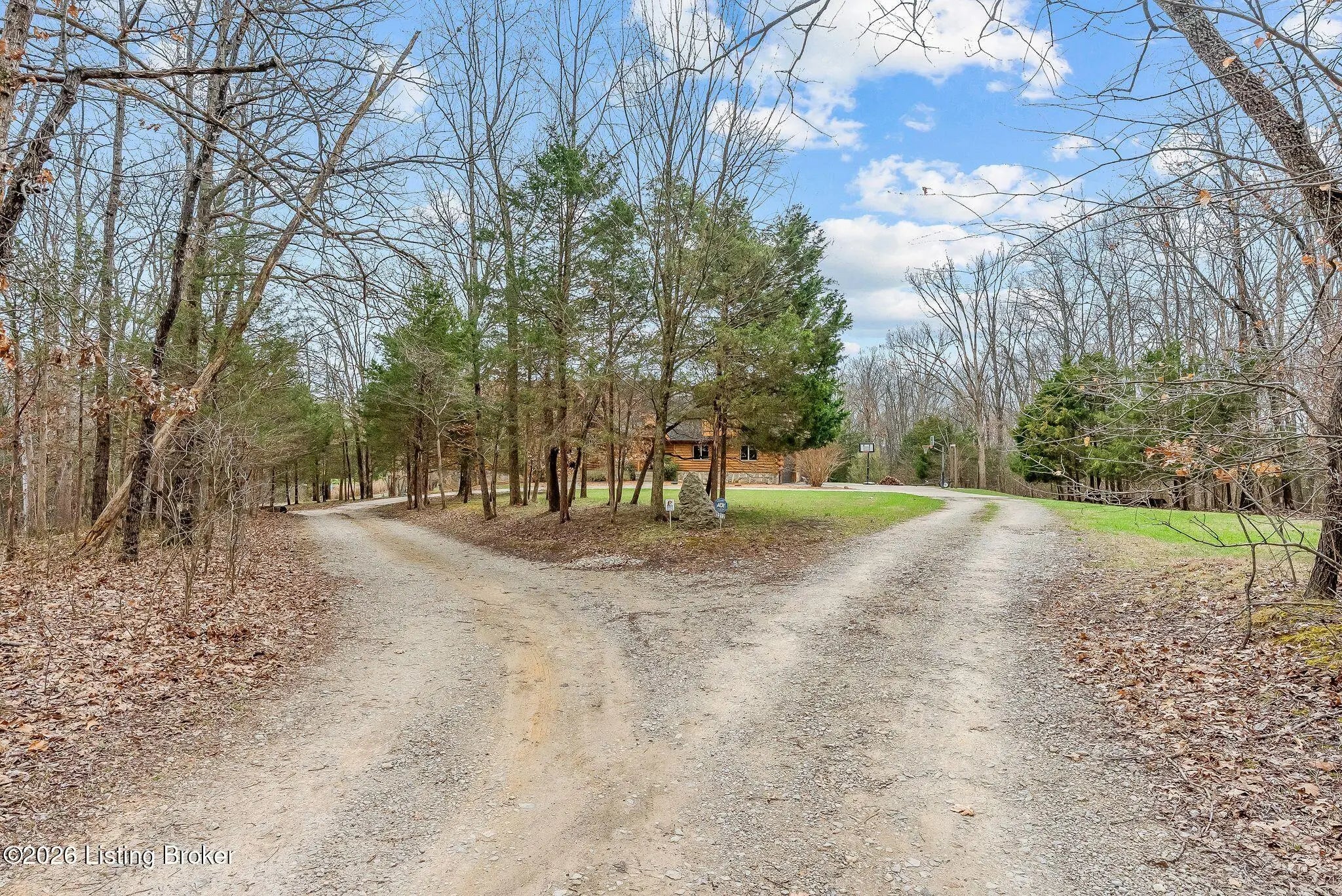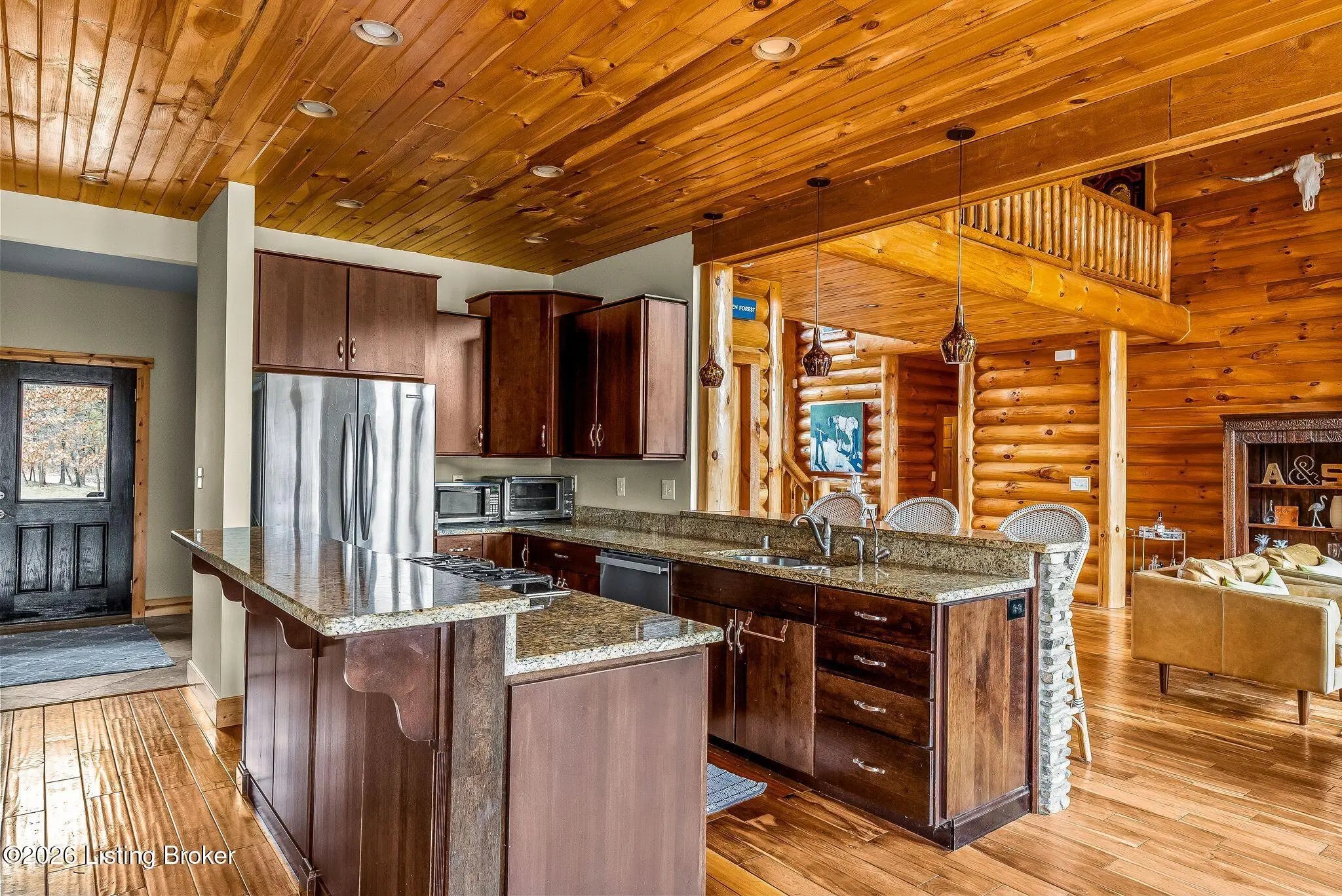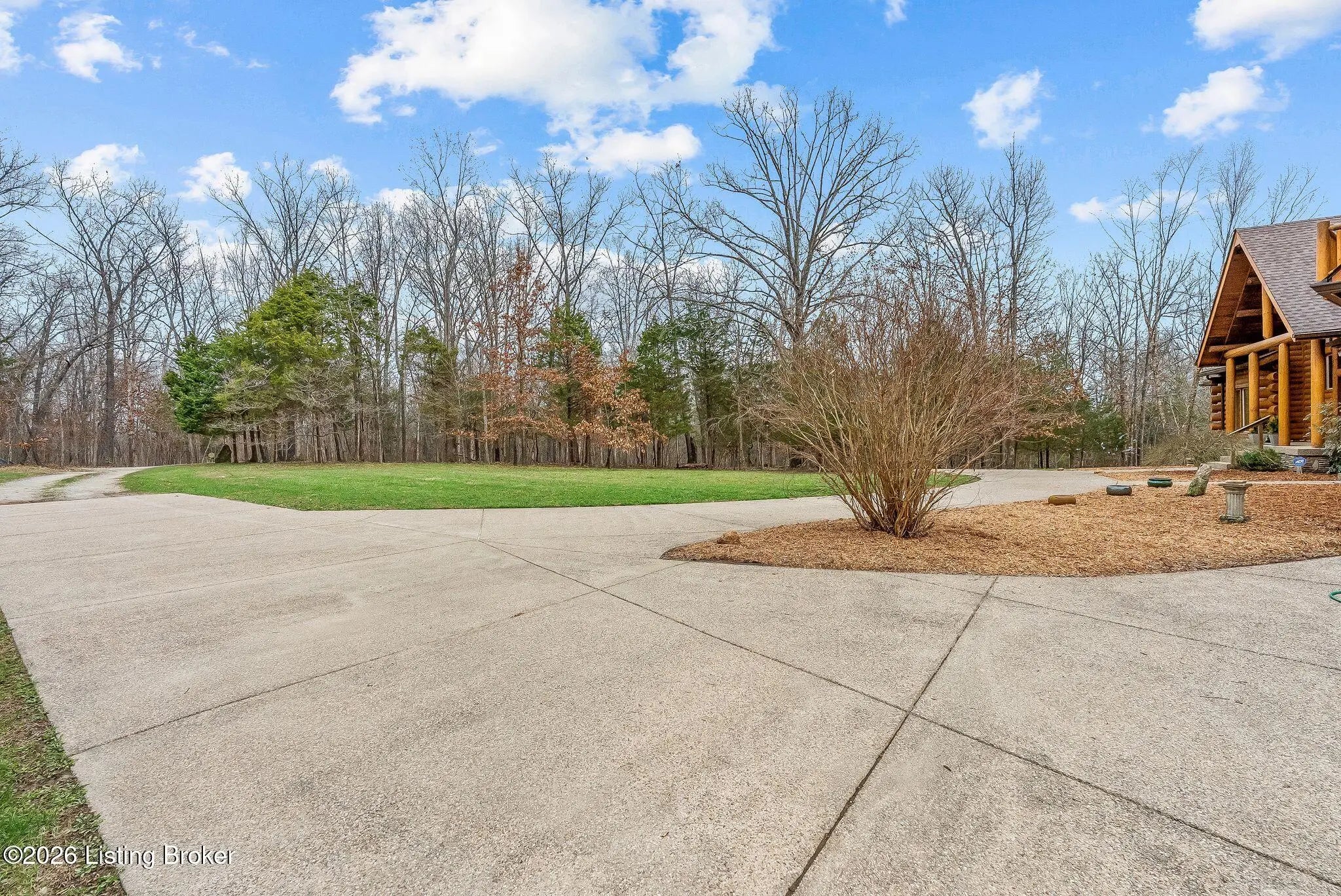 Welcome to 2212 Ballard School Rd in LaGrange, a spectacular custom-built log estate set on 16 private acres with breathtaking views of woods and pasture in every direction. Tucked ¼ mile off the main road, this property offers exceptional privacy while still being just minutes from LaGrange shopping, dining, and I-71. Step inside to a breathtaking great room defined by a dramatic 2.5-story vaulted ceiling and an expansive A-frame wall of windows that fills the space with sunlight and captures sweeping views of the peaceful surroundings. Extraordinary, handcrafted stone masonry anchors the room with a beautiful fireplace and continues throughout both the interior and exterior of the home, highlighting the craftsmanship of this one-of-a-kind property. Acacia wood floors run through the entry, great room, kitchen, and primary suite, adding warmth and character. The first-floor primary suite offers a relaxing retreat with a trey ceiling, sitting area, dual walk-in closets, and private deck overlooking the rear property. The spacious bath includes dual vanity, large tub and walk in shower creating a comfortable and functional layout. Designed for everyday living and entertaining, the kitchen opens to the dining and living areas and includes an oversized pantry, mudroom, and convenient laundry access with direct entry to the oversized two-car garage. Built-in speakers enhance both the kitchen and outdoor deck spaces. Off the dining area, a large deck provides the perfect setting for enjoying the surrounding countryside. Upstairs, you'll find four generously sized bedrooms, including one with a private balcony overlooking the front of the property and another with an en-suite bath. The upper level also features a loft and an additional full bathroom. The finished walkout lower level offers additional living and entertaining space, featuring a bar area and a beautifully crafted hearth with a wood stove, along with doors that open to the rear patio and outdoor gathering area. An additional 1,600+ square feet of unfinished basement provide excellent expansion potential, including two framed and electrically wired rooms ready to be finished and plumbing already installed for a future basement bathroom. Outdoor living is equally impressive with five patios and decks, including the private primary suite balcony. The property also features an outdoor firepit, stone pizza oven, outdoor grilling area, deer stands, dog kennels, and even an ATV included with the property, making the acreage a true outdoor playground. Recent improvements include newly stripped and resealed logs along the rear of the home and rebuilt balcony railings. The home is also equipped with dual geothermal heat pump systems and a whole-house Culligan water filtration system with separate drinking water filtration including a new water heater (2025). With 16 acres of rolling land, partial woods, expansive views, and unmatched privacy, this extraordinary property offers the perfect blend of rustic elegance, modern efficiency, and convenient location. A rare opportunity to own this one-of-a-kind property that offers privacy, character, and incredible craftsmanship while still being conveniently located near LaGrange amenities.