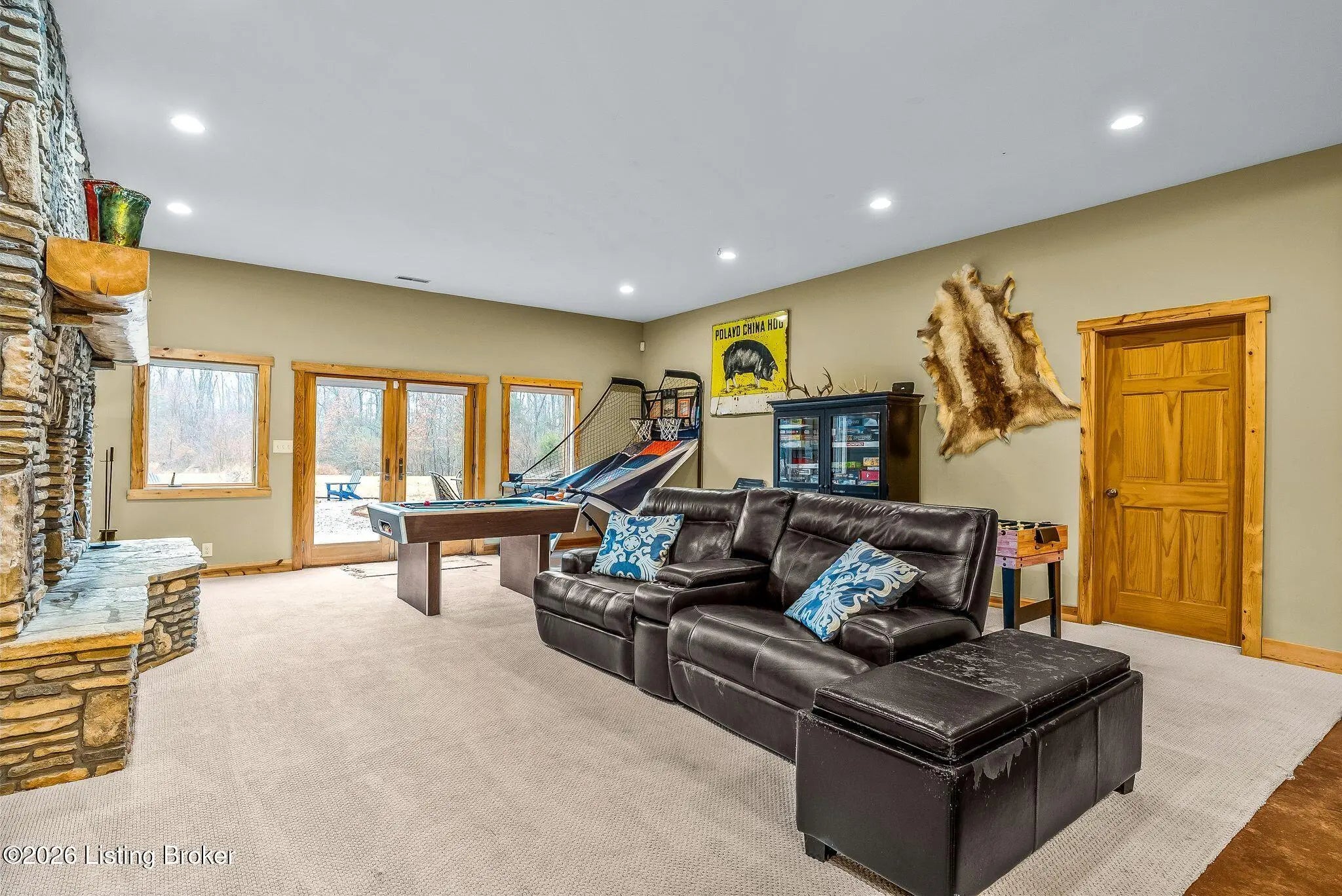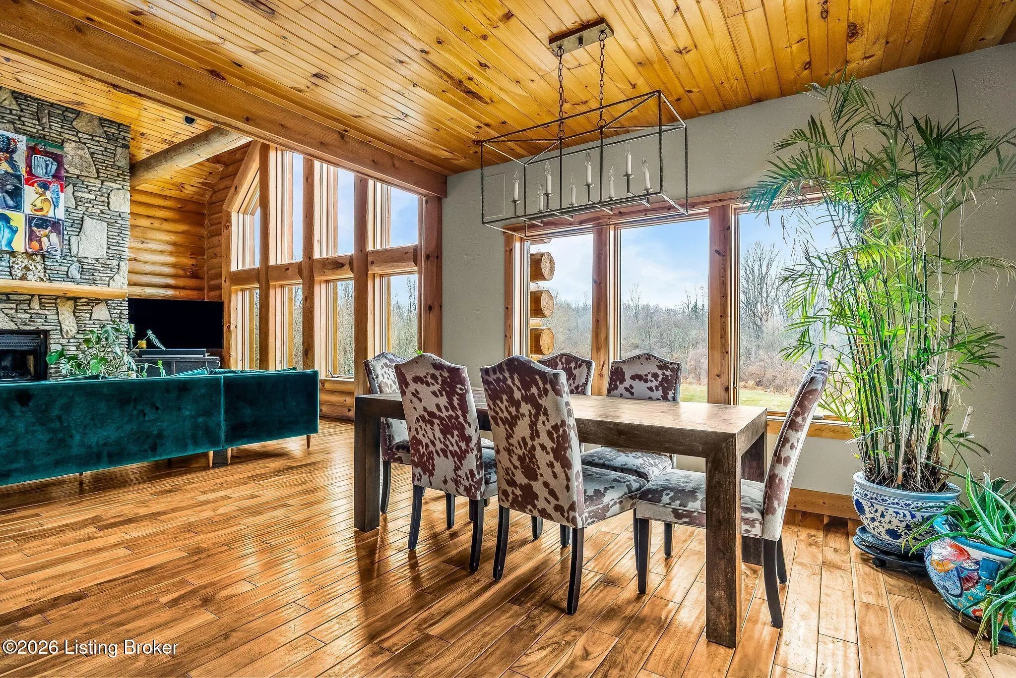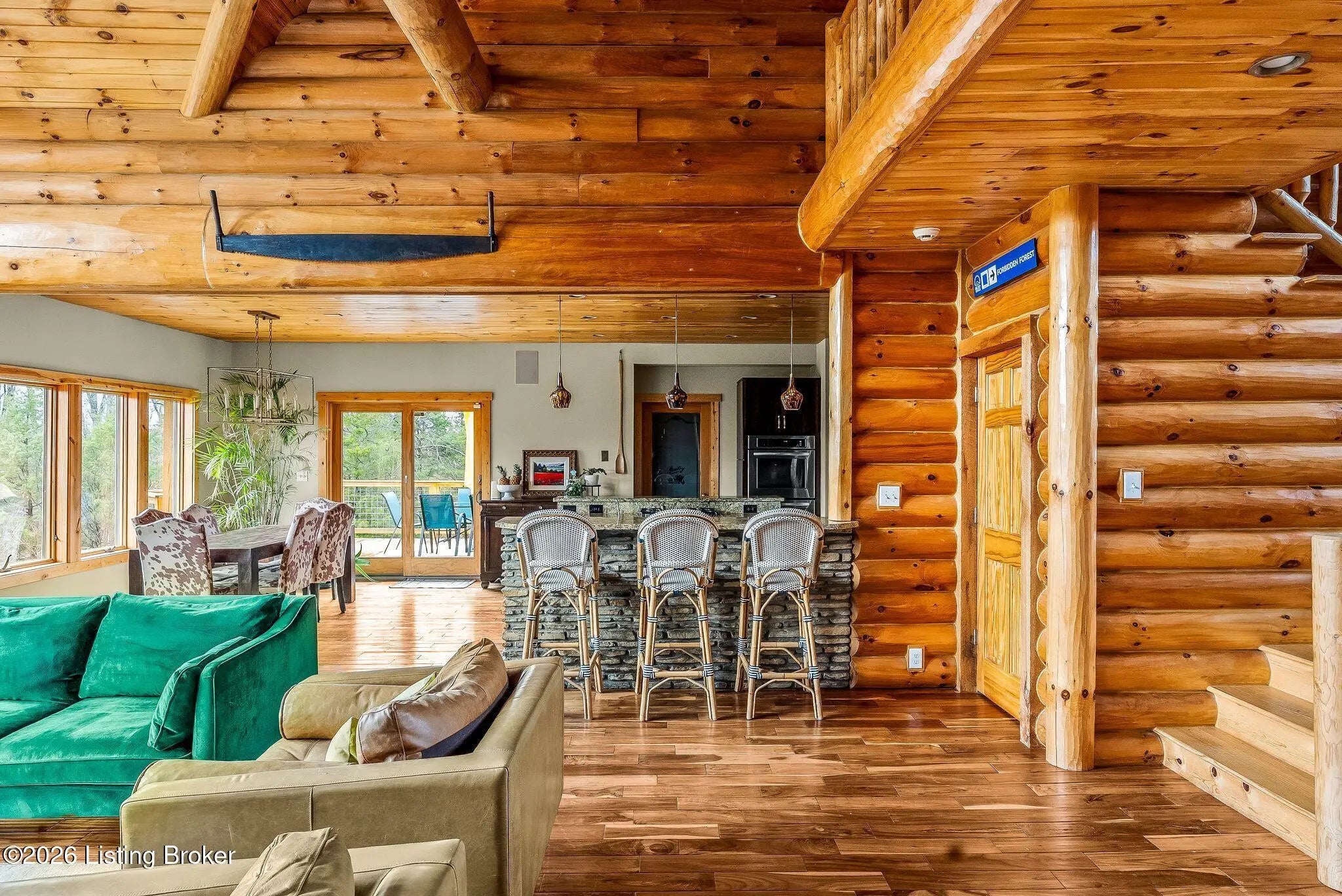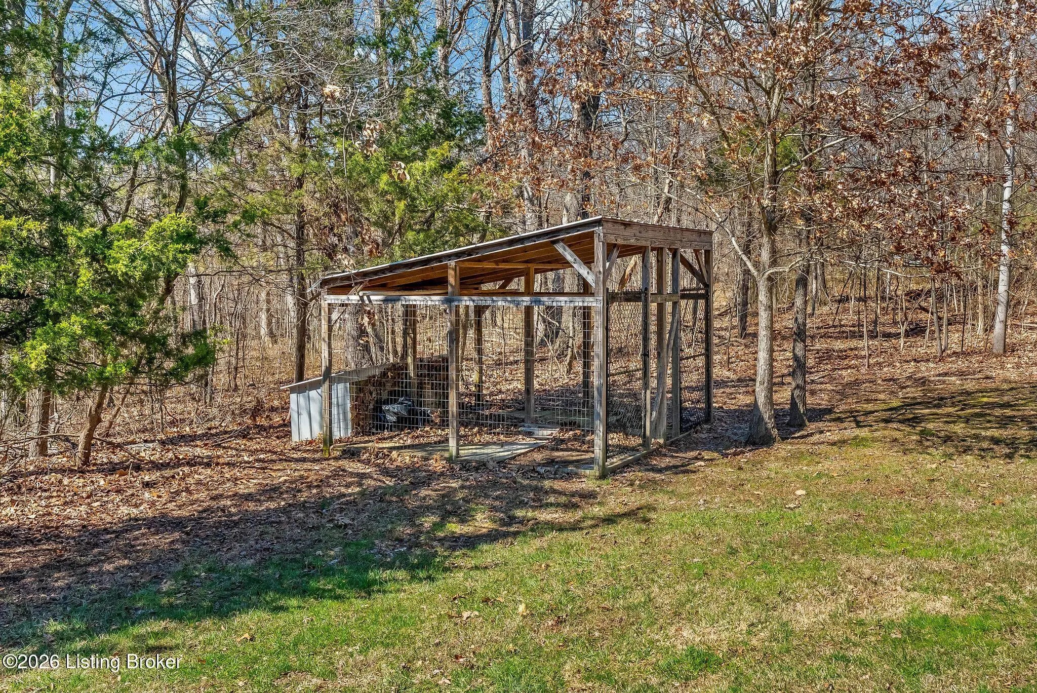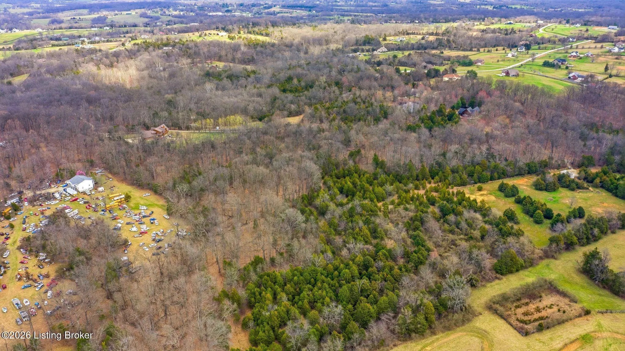 Welcome to 2212 Ballard School Rd in LaGrange, a spectacular custom-built log estate set on 16 private acres with breathtaking views of woods and pasture in every direction. Tucked ¼ mile off the main road, this property offers exceptional privacy while still being just minutes from LaGrange shopping, dining, and I-71. Step inside to a breathtaking great room defined by a dramatic 2.5-story vaulted ceiling and an expansive A-frame wall of windows that fills the space with sunlight and captures sweeping views of the peaceful surroundings. Extraordinary, handcrafted stone masonry anchors the room with a beautiful fireplace and continues throughout both the interior and exterior of the home, highlighting the craftsmanship of this one-of-a-kind property. Acacia wood floors run through the entry, great room, kitchen, and primary suite, adding warmth and character. The first-floor primary suite offers a relaxing retreat with a trey ceiling, sitting area, dual walk-in closets, and private deck overlooking the rear property. The spacious bath includes dual vanity, large tub and walk in shower creating a comfortable and functional layout. Designed for everyday living and entertaining, the kitchen opens to the dining and living areas and includes an oversized pantry, mudroom, and convenient laundry access with direct entry to the oversized two-car garage. Built-in speakers enhance both the kitchen and outdoor deck spaces. Off the dining area, a large deck provides the perfect setting for enjoying the surrounding countryside. Upstairs, you'll find four generously sized bedrooms, including one with a private balcony overlooking the front of the property and another with an en-suite bath. The upper level also features a loft and an additional full bathroom. The finished walkout lower level offers additional living and entertaining space, featuring a bar area and a beautifully crafted hearth with a wood stove, along with doors that open to the rear patio and outdoor gathering area. An additional 1,600+ square feet of unfinished basement provide excellent expansion potential, including two framed and electrically wired rooms ready to be finished and plumbing already installed for a future basement bathroom. Outdoor living is equally impressive with five patios and decks, including the private primary suite balcony. The property also features an outdoor firepit, stone pizza oven, outdoor grilling area, deer stands, dog kennels, and even an ATV included with the property, making the acreage a true outdoor playground. Recent improvements include newly stripped and resealed logs along the rear of the home and rebuilt balcony railings. The home is also equipped with dual geothermal heat pump systems and a whole-house Culligan water filtration system with separate drinking water filtration including a new water heater (2025). With 16 acres of rolling land, partial woods, expansive views, and unmatched privacy, this extraordinary property offers the perfect blend of rustic elegance, modern efficiency, and convenient location. A rare opportunity to own this one-of-a-kind property that offers privacy, character, and incredible craftsmanship while still being conveniently located near LaGrange amenities.