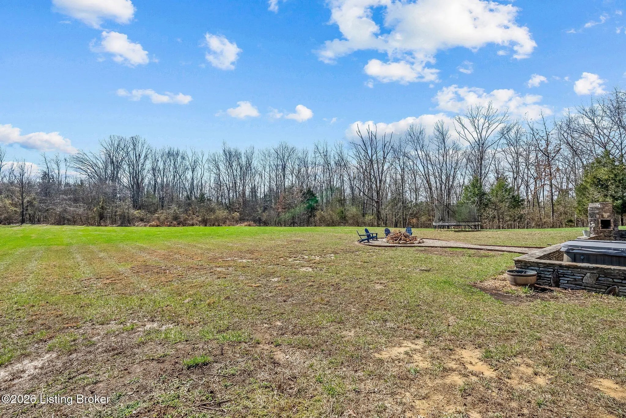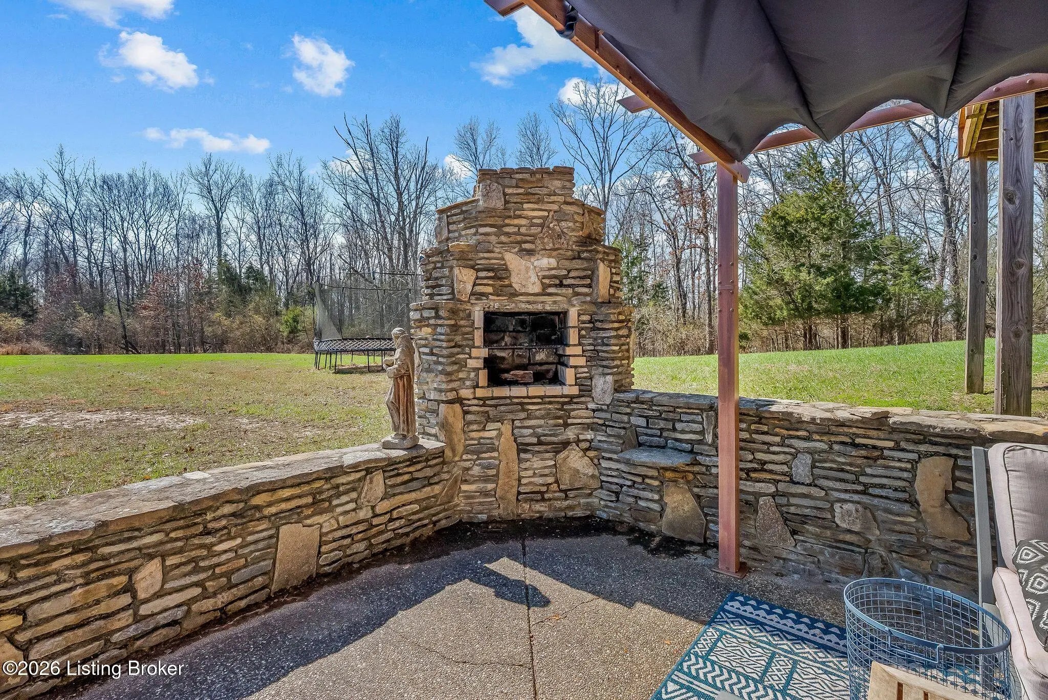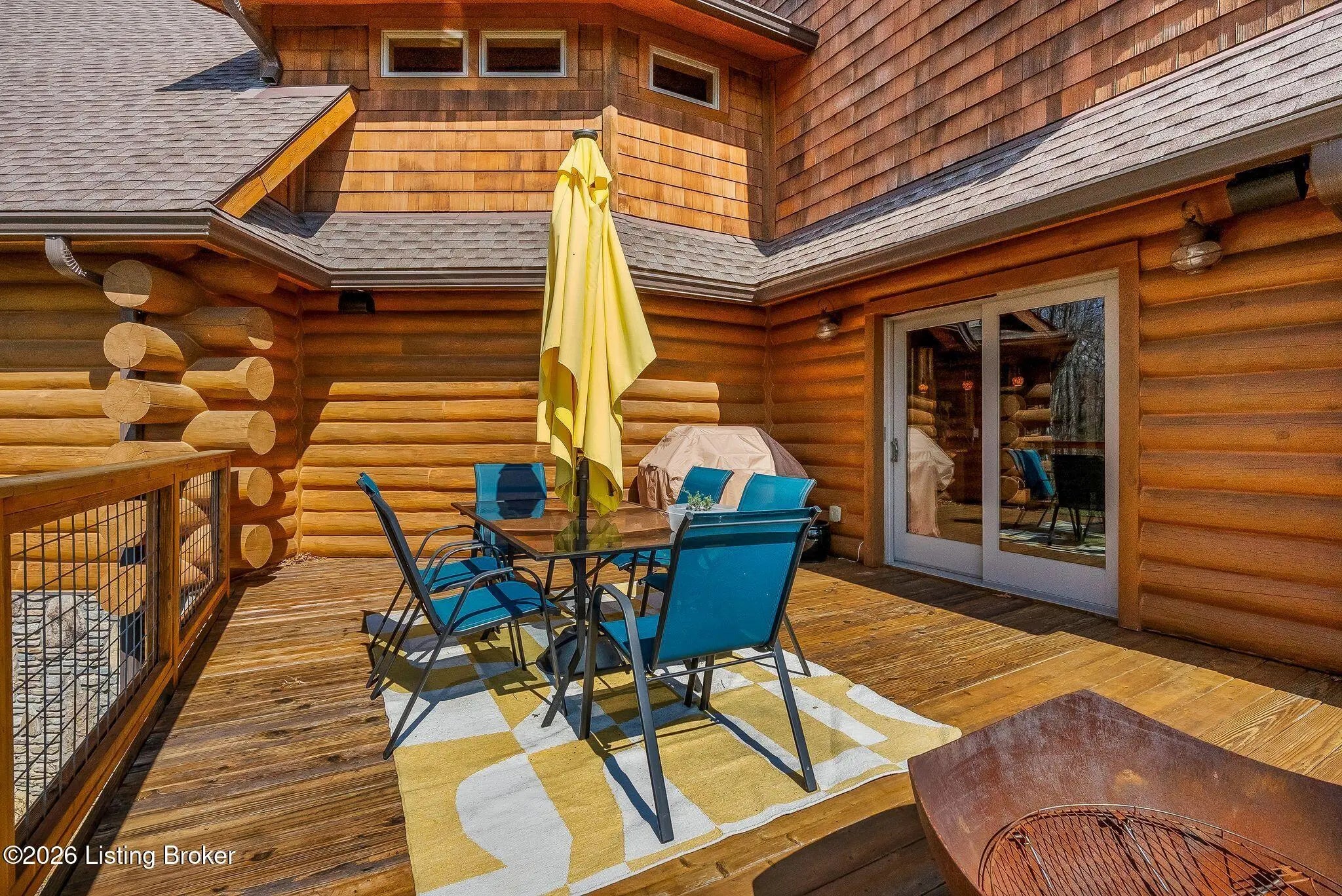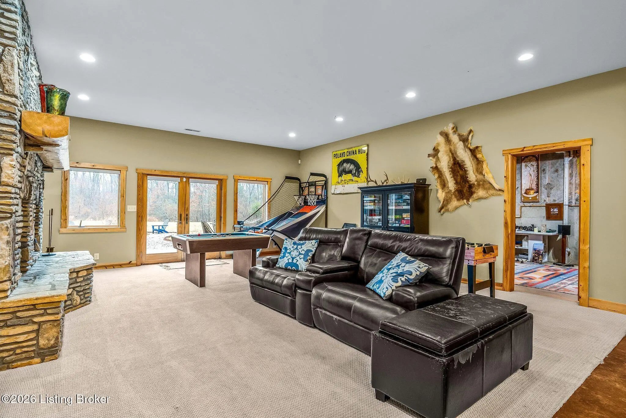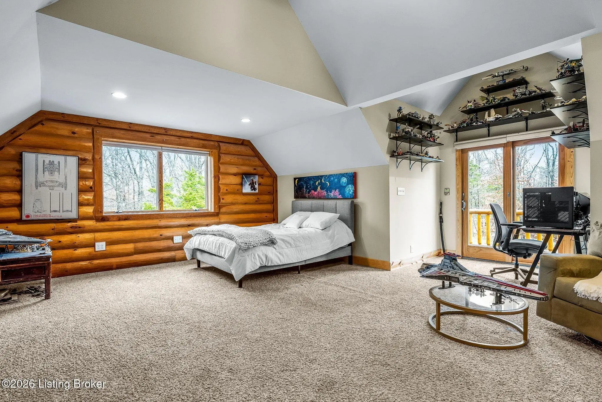 Welcome to 2212 Ballard School Rd in LaGrange, a spectacular custom-built log estate set on 16 private acres with breathtaking views of woods and pasture in every direction. Tucked ¼ mile off the main road, this property offers exceptional privacy while still being just minutes from LaGrange shopping, dining, and I-71. Step inside to a breathtaking great room defined by a dramatic 2.5-story vaulted ceiling and an expansive A-frame wall of windows that fills the space with sunlight and captures sweeping views of the peaceful surroundings. Extraordinary, handcrafted stone masonry anchors the room with a beautiful fireplace and continues throughout both the interior and exterior of the home, highlighting the craftsmanship of this one-of-a-kind property. Acacia wood floors run through the entry, great room, kitchen, and primary suite, adding warmth and character. The first-floor primary suite offers a relaxing retreat with a trey ceiling, sitting area, dual walk-in closets, and private deck overlooking the rear property. The spacious bath includes dual vanity, large tub and walk in shower creating a comfortable and functional layout. Designed for everyday living and entertaining, the kitchen opens to the dining and living areas and includes an oversized pantry, mudroom, and convenient laundry access with direct entry to the oversized two-car garage. Built-in speakers enhance both the kitchen and outdoor deck spaces. Off the dining area, a large deck provides the perfect setting for enjoying the surrounding countryside. Upstairs, you'll find four generously sized bedrooms, including one with a private balcony overlooking the front of the property and another with an en-suite bath. The upper level also features a loft and an additional full bathroom. The finished walkout lower level offers additional living and entertaining space, featuring a bar area and a beautifully crafted hearth with a wood stove, along with doors that open to the rear patio and outdoor gathering area. An additional 1,600+ square feet of unfinished basement provide excellent expansion potential, including two framed and electrically wired rooms ready to be finished and plumbing already installed for a future basement bathroom. Outdoor living is equally impressive with five patios and decks, including the private primary suite balcony. The property also features an outdoor firepit, stone pizza oven, outdoor grilling area, deer stands, dog kennels, and even an ATV included with the property, making the acreage a true outdoor playground. Recent improvements include newly stripped and resealed logs along the rear of the home and rebuilt balcony railings. The home is also equipped with dual geothermal heat pump systems and a whole-house Culligan water filtration system with separate drinking water filtration including a new water heater (2025). With 16 acres of rolling land, partial woods, expansive views, and unmatched privacy, this extraordinary property offers the perfect blend of rustic elegance, modern efficiency, and convenient location. A rare opportunity to own this one-of-a-kind property that offers privacy, character, and incredible craftsmanship while still being conveniently located near LaGrange amenities.