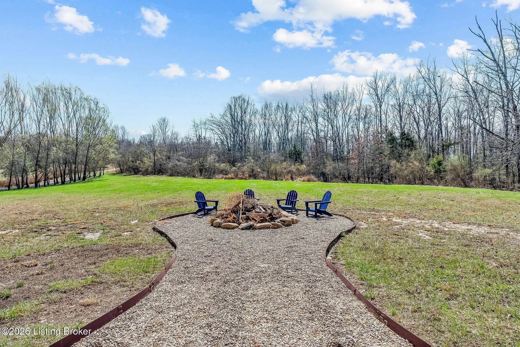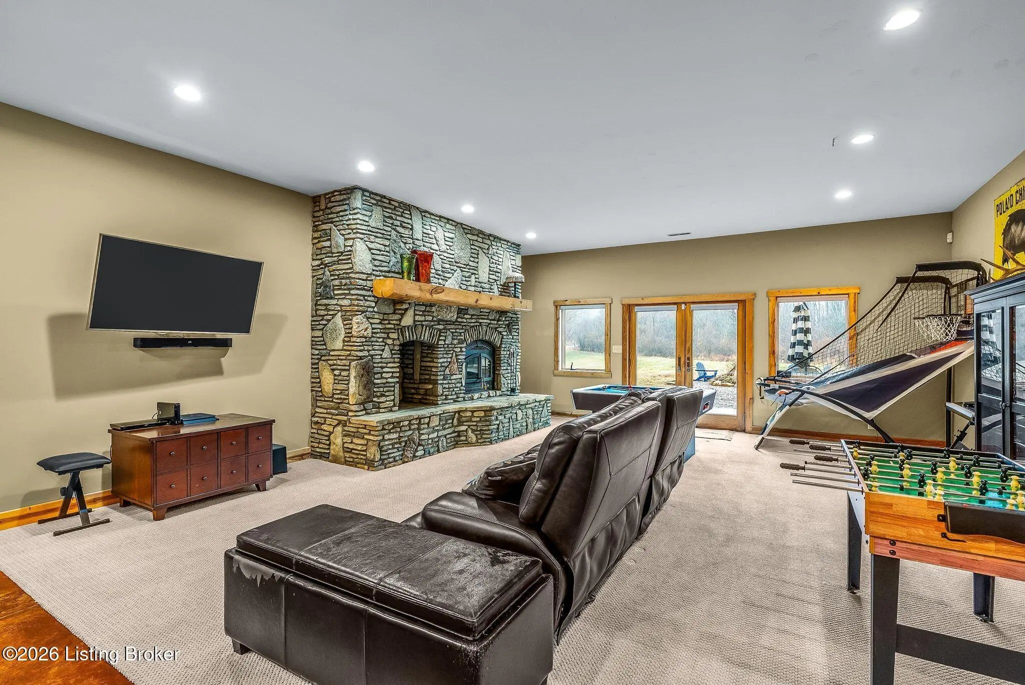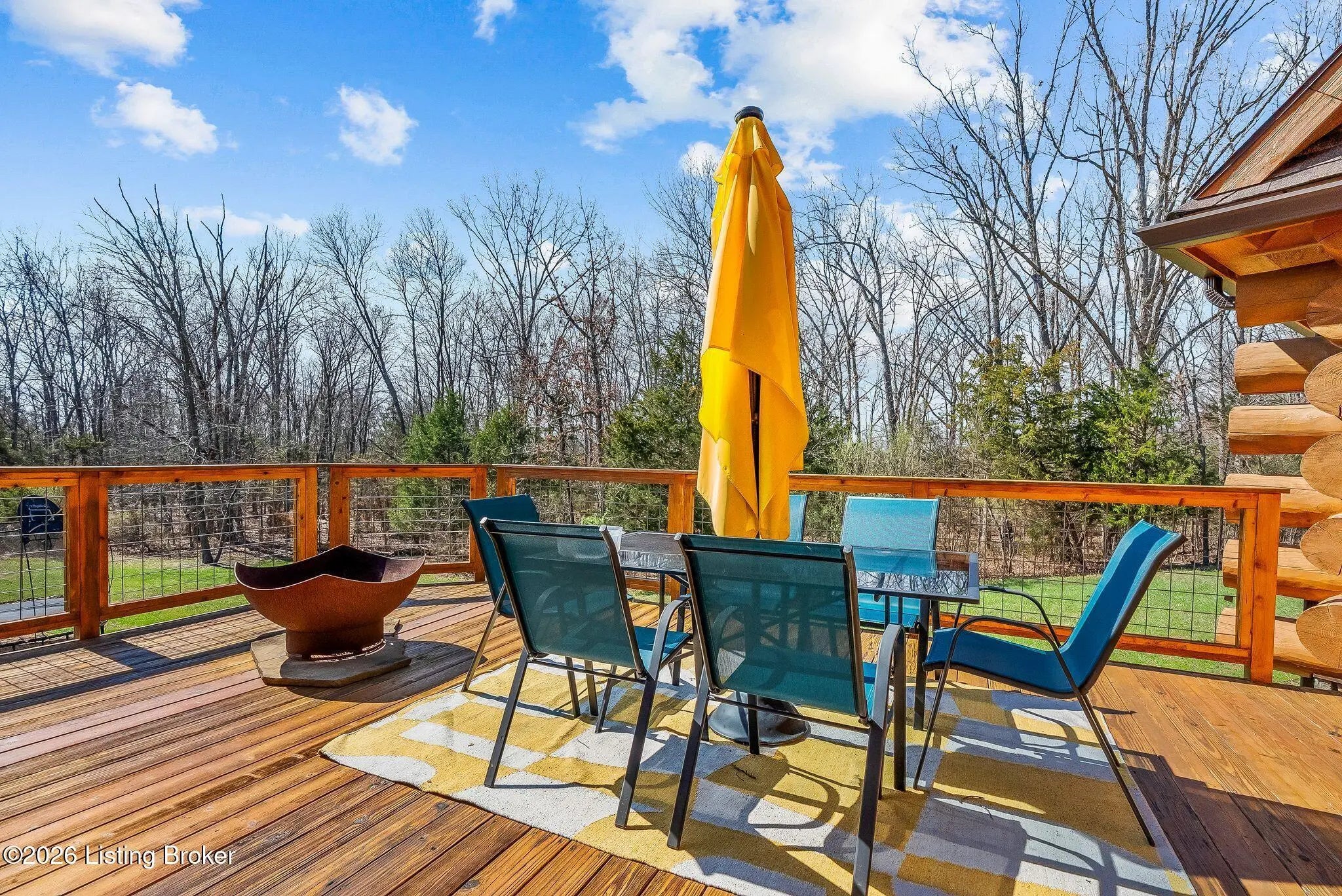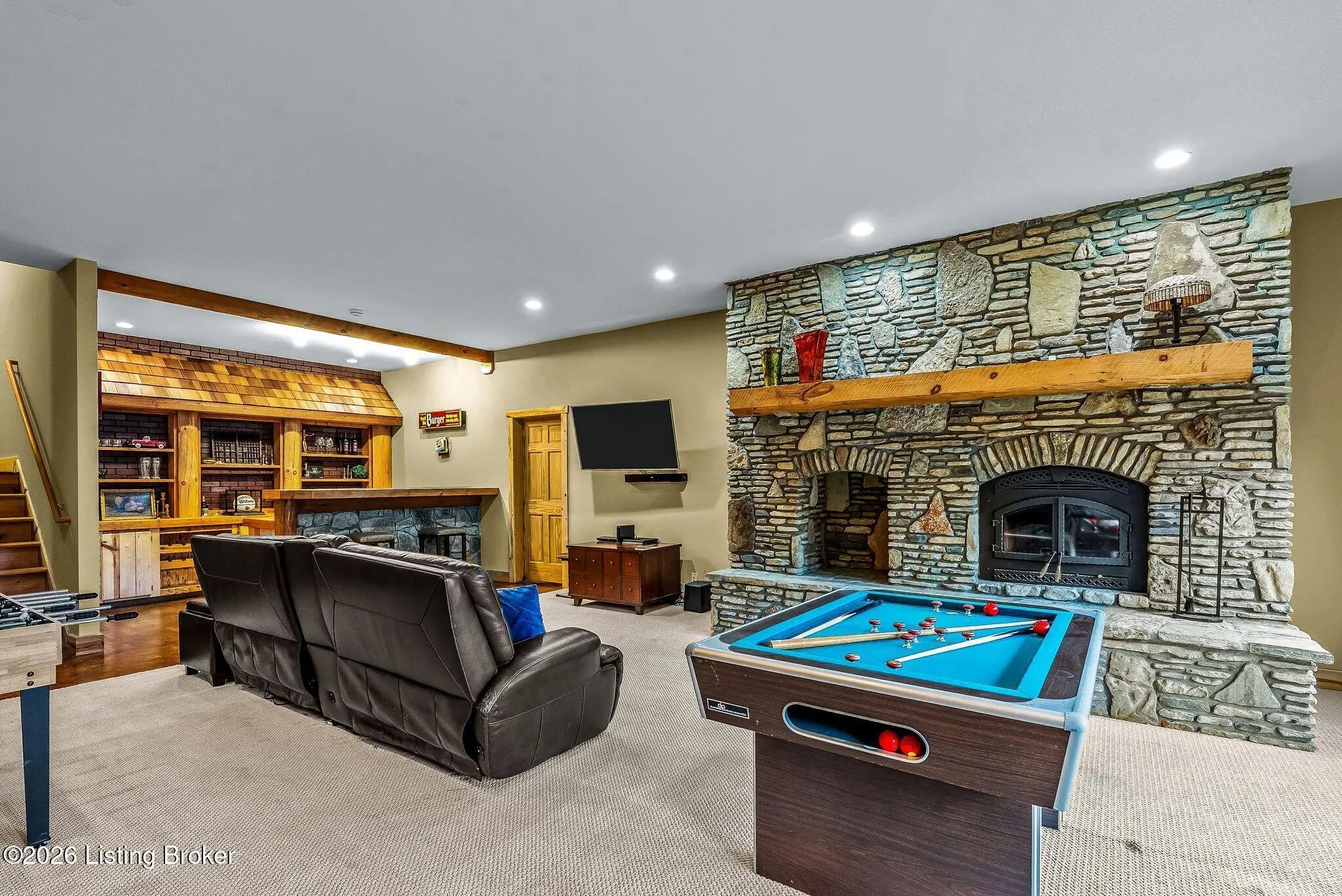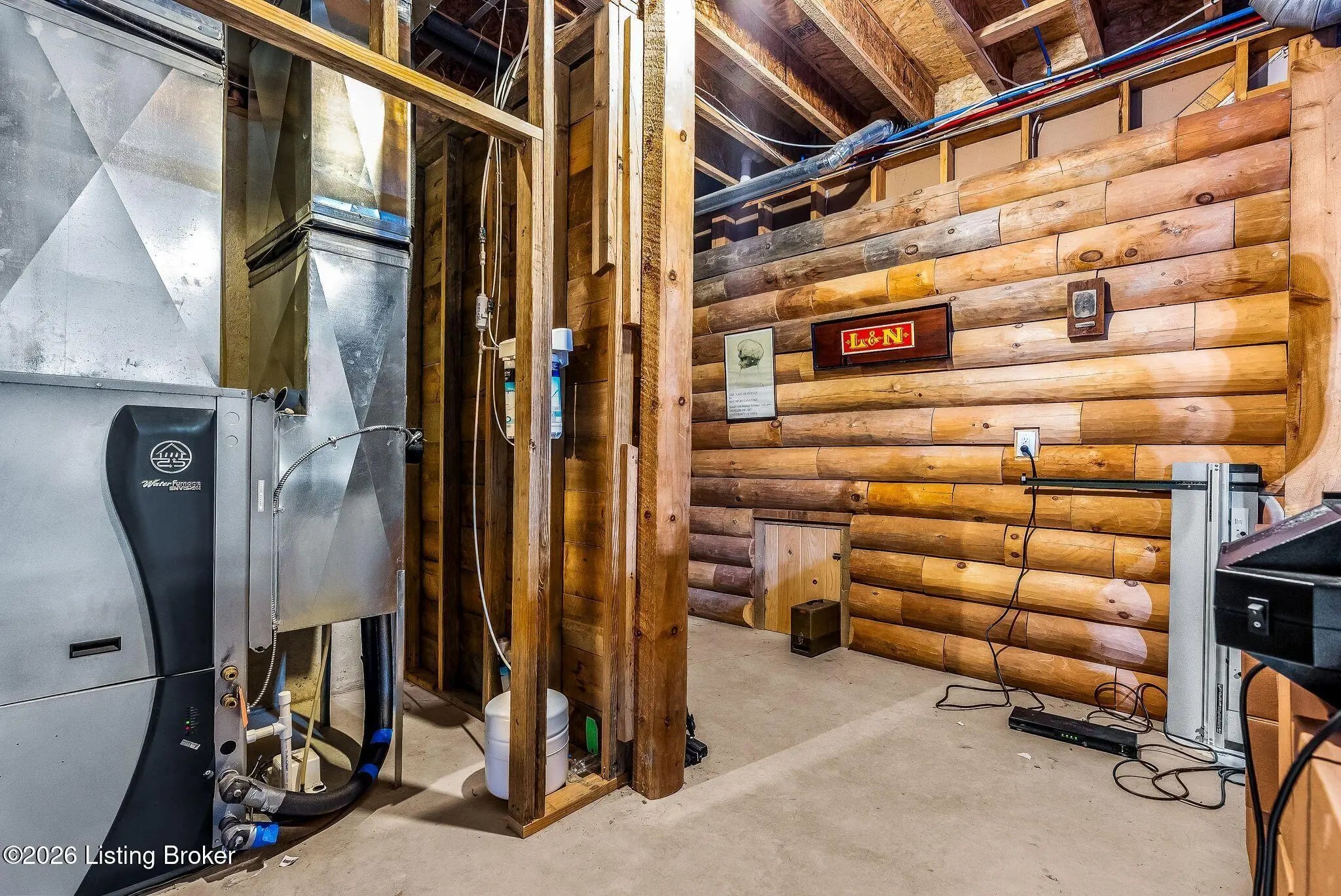Welcome to 2212 Ballard School Rd in LaGrange, a spectacular custom-built log estate set on 16 private acres with breathtaking views of woods and pasture in every direction. Tucked ¼ mile off the main road, this property offers exceptional privacy while still being just minutes from LaGrange shopping, dining, and I-71. Step inside to a breathtaking great room defined by a dramatic 2.5-story vaulted ceiling and an expansive A-frame wall of windows that fills the space with sunlight and captures sweeping views of the peaceful surroundings. Extraordinary, handcrafted stone masonry anchors the room with a beautiful fireplace and continues throughout both the interior and exterior of the home, highlighting the craftsmanship of this one-of-a-kind property. Acacia wood floors run through the entry, great room, kitchen, and primary suite, adding warmth and character. The first-floor primary suite offers a relaxing retreat with a trey ceiling, sitting area, dual walk-in closets, and private deck overlooking the rear property. The spacious bath includes dual vanity, large tub and walk in shower creating a comfortable and functional layout. Designed for everyday living and entertaining, the kitchen opens to the dining and living areas and includes an oversized pantry, mudroom, and convenient laundry access with direct entry to the oversized two-car garage. Built-in speakers enhance both the kitchen and outdoor deck spaces. Off the dining area, a large deck provides the perfect setting for enjoying the surrounding countryside. Upstairs, you'll find four generously sized bedrooms, including one with a private balcony overlooking the front of the property and another with an en-suite bath. The upper level also features a loft and an additional full bathroom. The finished walkout lower level offers additional living and entertaining space, featuring a bar area and a beautifully crafted hearth with a wood stove, along with doors that open to the rear patio and outdoor gathering area. An additional 1,600+ square feet of unfinished basement provide excellent expansion potential, including two framed and electrically wired rooms ready to be finished and plumbing already installed for a future basement bathroom. Outdoor living is equally impressive with five patios and decks, including the private primary suite balcony. The property also features an outdoor firepit, stone pizza oven, outdoor grilling area, deer stands, dog kennels, and even an ATV included with the property, making the acreage a true outdoor playground. Recent improvements include newly stripped and resealed logs along the rear of the home and rebuilt balcony railings. The home is also equipped with dual geothermal heat pump systems and a whole-house Culligan water filtration system with separate drinking water filtration including a new water heater (2025). With 16 acres of rolling land, partial woods, expansive views, and unmatched privacy, this extraordinary property offers the perfect blend of rustic elegance, modern efficiency, and convenient location. A rare opportunity to own this one-of-a-kind property that offers privacy, character, and incredible craftsmanship while still being conveniently located near LaGrange amenities.