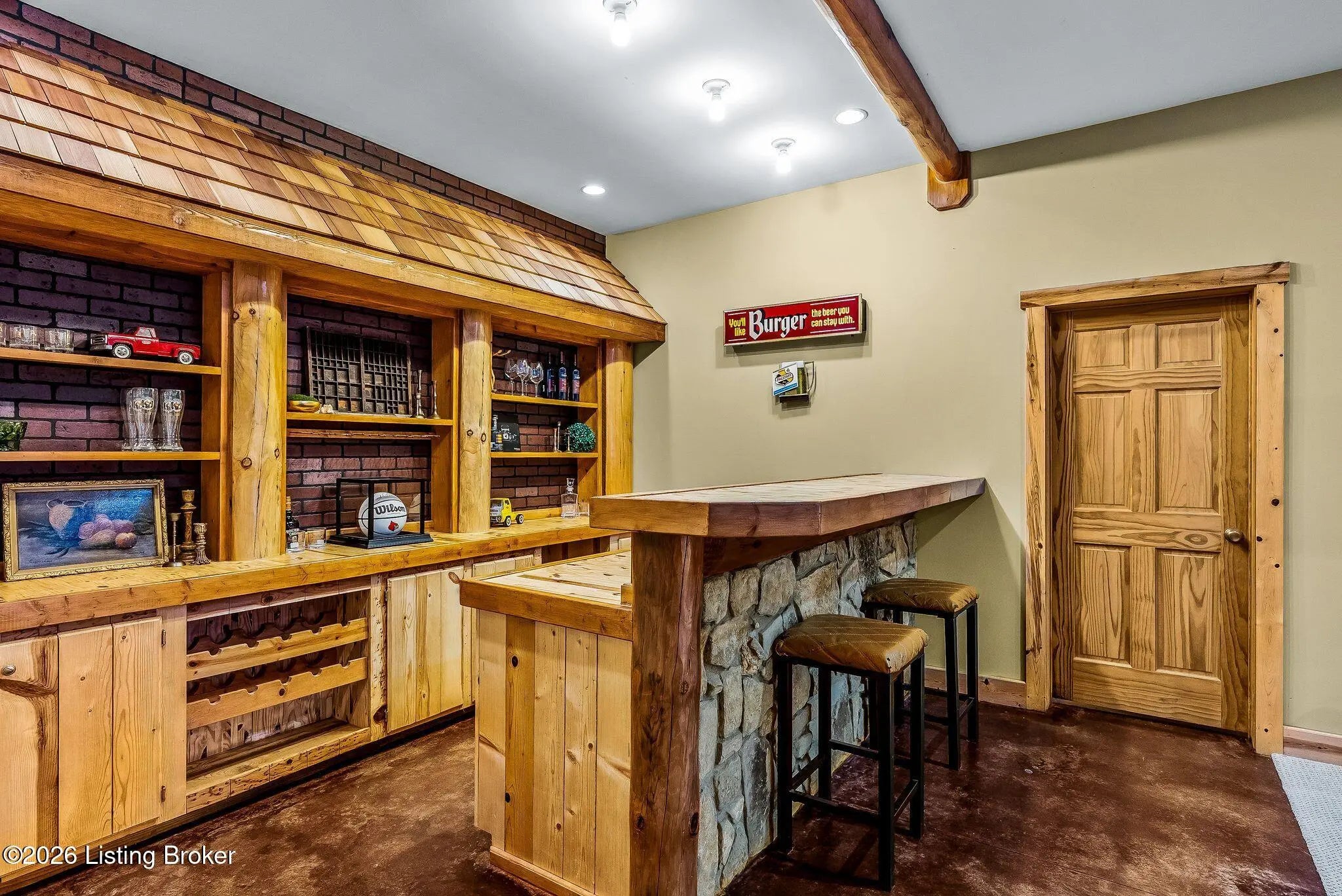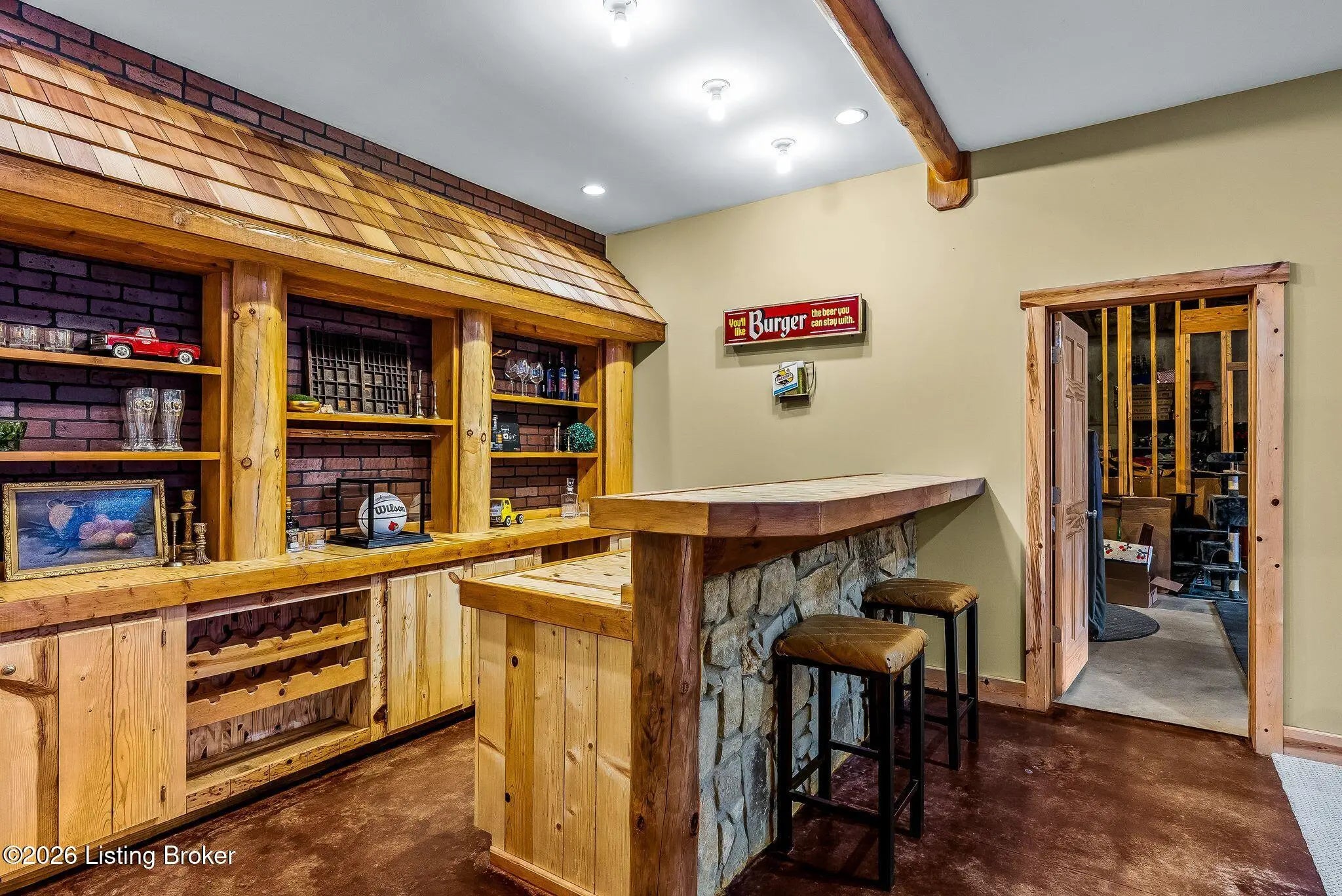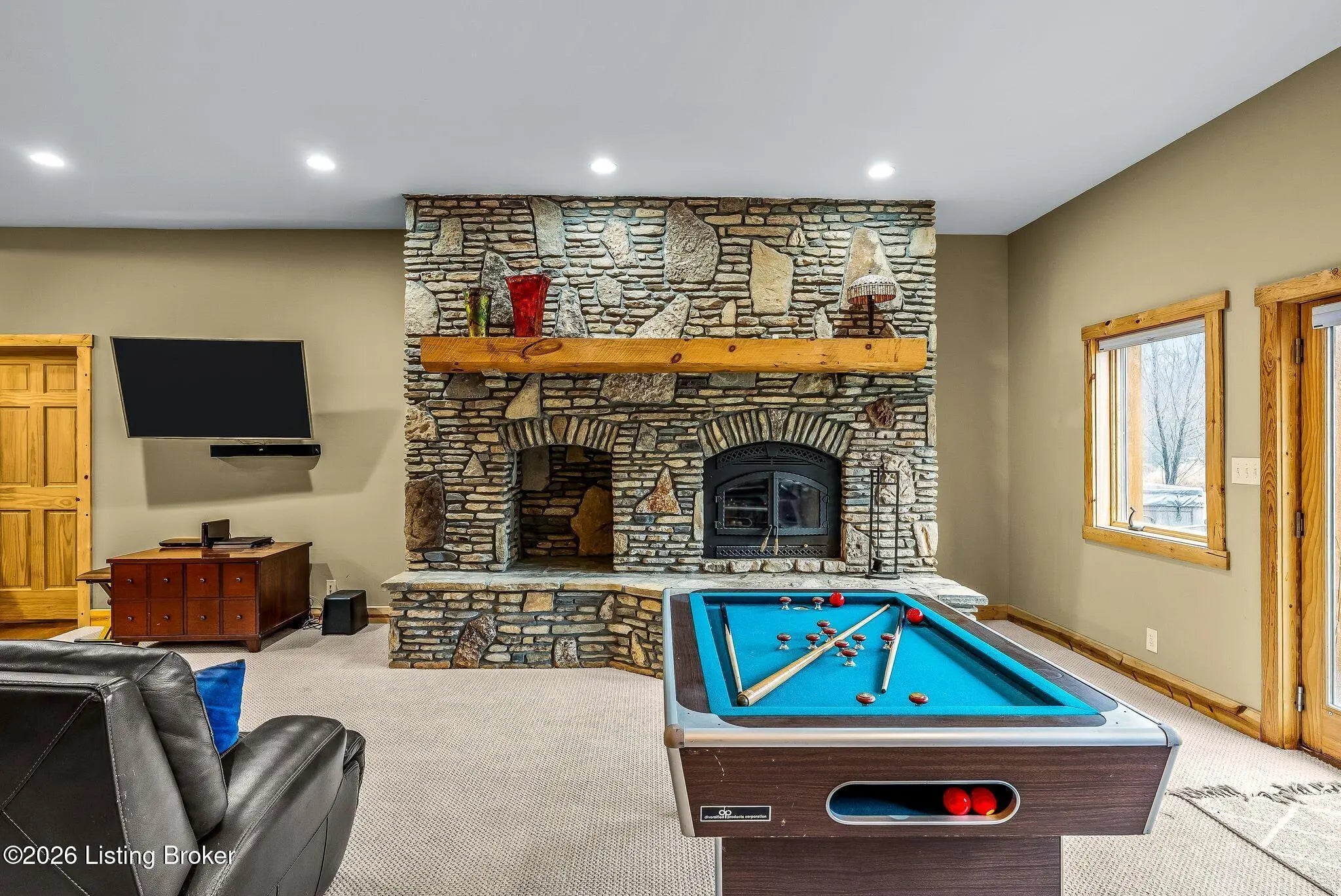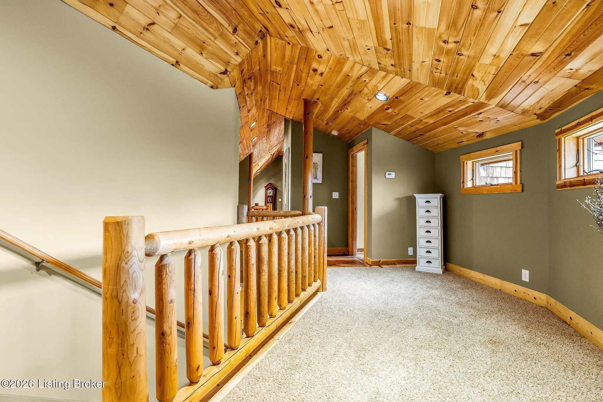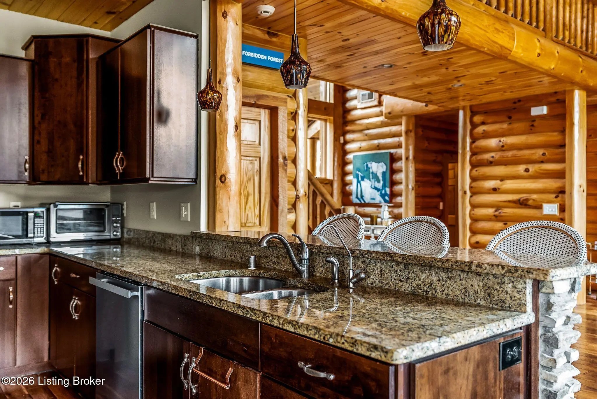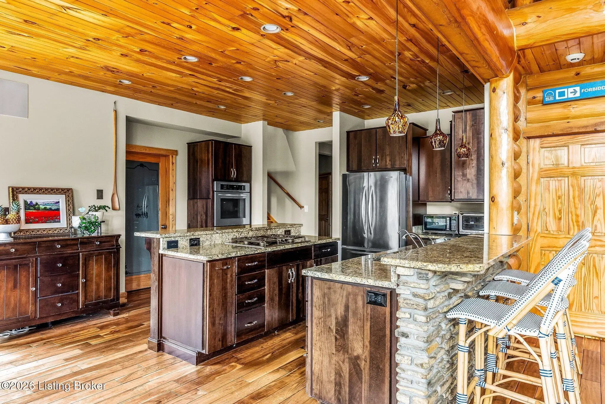 Welcome to 2212 Ballard School Rd in LaGrange, a spectacular custom-built log estate set on 16 private acres with breathtaking views of woods and pasture in every direction. Tucked ¼ mile off the main road, this property offers exceptional privacy while still being just minutes from LaGrange shopping, dining, and I-71. Step inside to a breathtaking great room defined by a dramatic 2.5-story vaulted ceiling and an expansive A-frame wall of windows that fills the space with sunlight and captures sweeping views of the peaceful surroundings. Extraordinary, handcrafted stone masonry anchors the room with a beautiful fireplace and continues throughout both the interior and exterior of the home, highlighting the craftsmanship of this one-of-a-kind property. Acacia wood floors run through the entry, great room, kitchen, and primary suite, adding warmth and character. The first-floor primary suite offers a relaxing retreat with a trey ceiling, sitting area, dual walk-in closets, and private deck overlooking the rear property. The spacious bath includes dual vanity, large tub and walk in shower creating a comfortable and functional layout. Designed for everyday living and entertaining, the kitchen opens to the dining and living areas and includes an oversized pantry, mudroom, and convenient laundry access with direct entry to the oversized two-car garage. Built-in speakers enhance both the kitchen and outdoor deck spaces. Off the dining area, a large deck provides the perfect setting for enjoying the surrounding countryside. Upstairs, you'll find four generously sized bedrooms, including one with a private balcony overlooking the front of the property and another with an en-suite bath. The upper level also features a loft and an additional full bathroom. The finished walkout lower level offers additional living and entertaining space, featuring a bar area and a beautifully crafted hearth with a wood stove, along with doors that open to the rear patio and outdoor gathering area. An additional 1,600+ square feet of unfinished basement provide excellent expansion potential, including two framed and electrically wired rooms ready to be finished and plumbing already installed for a future basement bathroom. Outdoor living is equally impressive with five patios and decks, including the private primary suite balcony. The property also features an outdoor firepit, stone pizza oven, outdoor grilling area, deer stands, dog kennels, and even an ATV included with the property, making the acreage a true outdoor playground. Recent improvements include newly stripped and resealed logs along the rear of the home and rebuilt balcony railings. The home is also equipped with dual geothermal heat pump systems and a whole-house Culligan water filtration system with separate drinking water filtration including a new water heater (2025). With 16 acres of rolling land, partial woods, expansive views, and unmatched privacy, this extraordinary property offers the perfect blend of rustic elegance, modern efficiency, and convenient location. A rare opportunity to own this one-of-a-kind property that offers privacy, character, and incredible craftsmanship while still being conveniently located near LaGrange amenities.