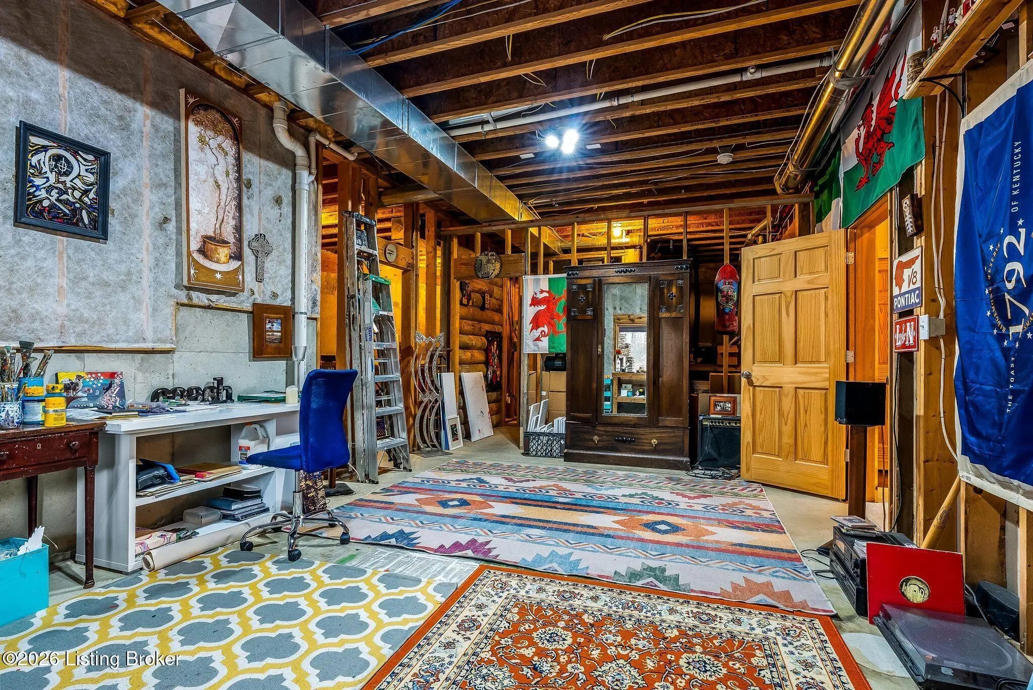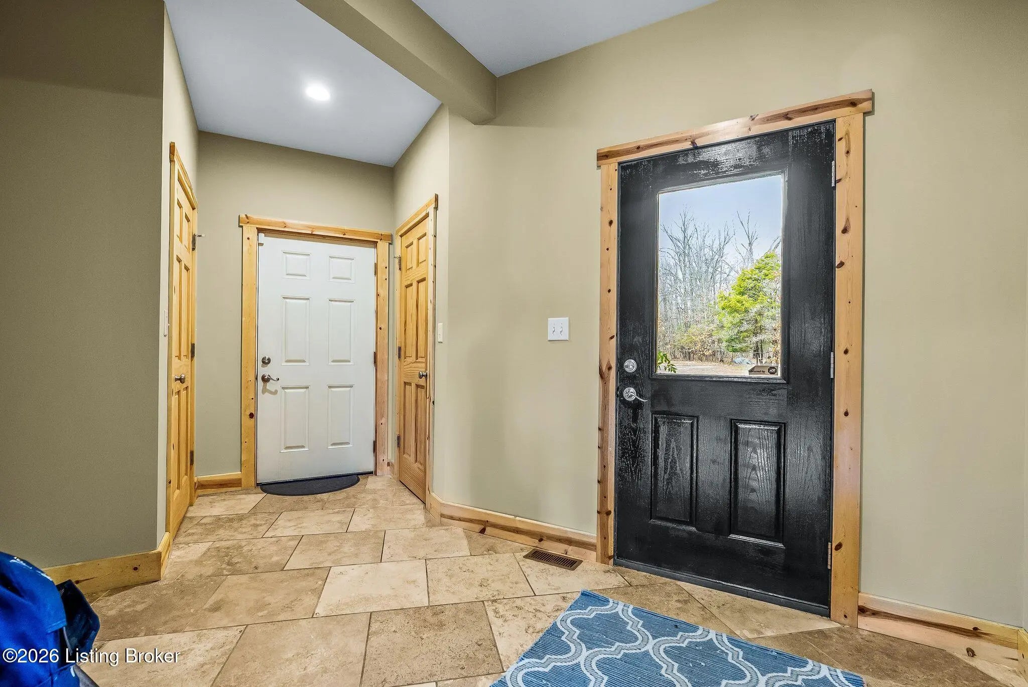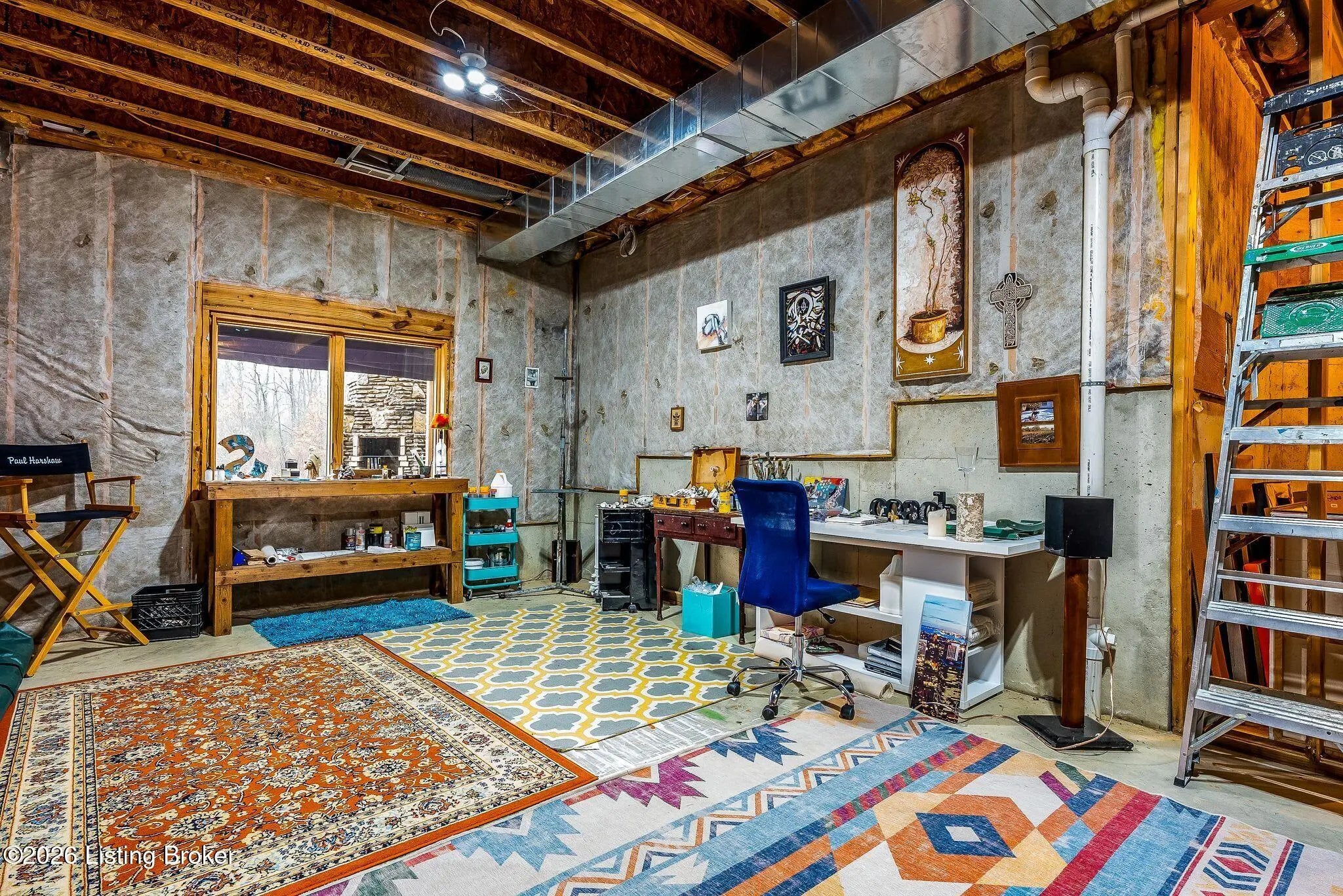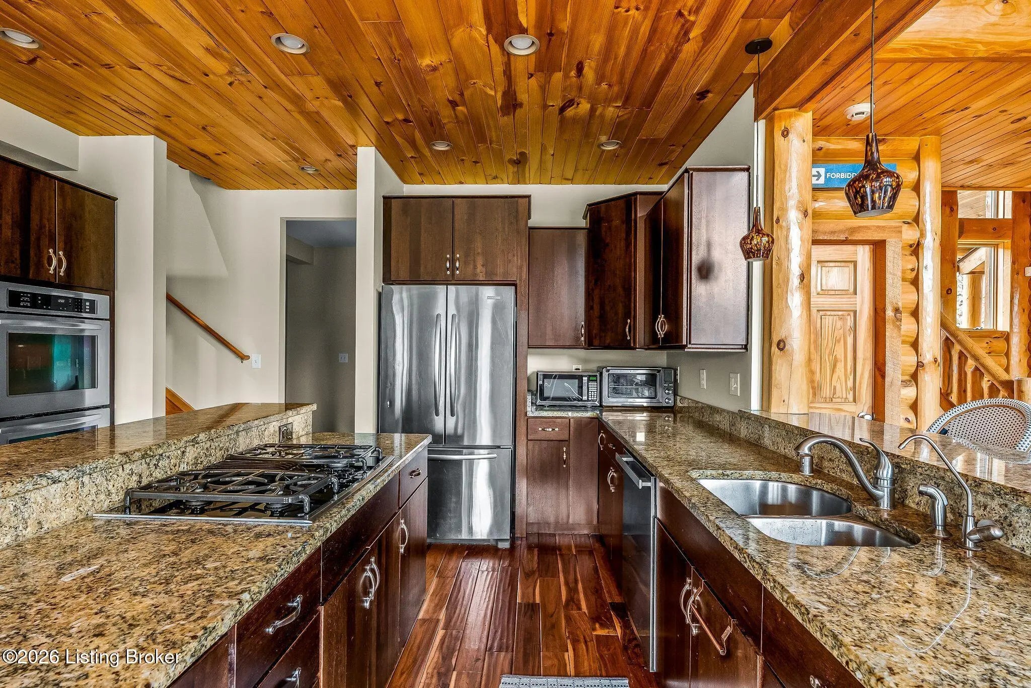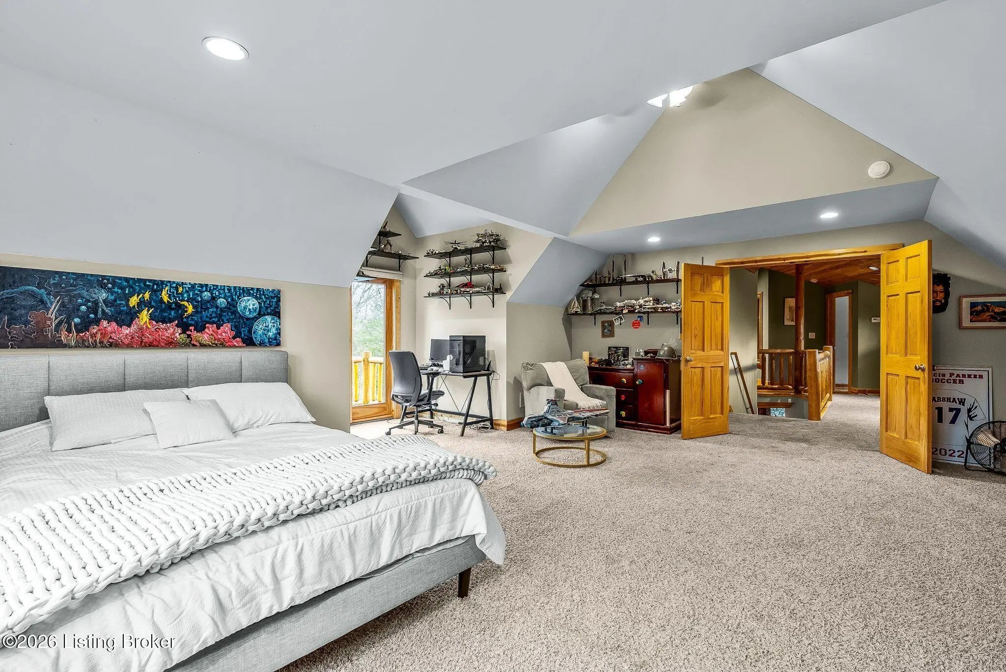 Welcome to 2212 Ballard School Rd in LaGrange, a spectacular custom-built log estate set on 16 private acres with breathtaking views of woods and pasture in every direction. Tucked ¼ mile off the main road, this property offers exceptional privacy while still being just minutes from LaGrange shopping, dining, and I-71. Step inside to a breathtaking great room defined by a dramatic 2.5-story vaulted ceiling and an expansive A-frame wall of windows that fills the space with sunlight and captures sweeping views of the peaceful surroundings. Extraordinary, handcrafted stone masonry anchors the room with a beautiful fireplace and continues throughout both the interior and exterior of the home, highlighting the craftsmanship of this one-of-a-kind property. Acacia wood floors run through the entry, great room, kitchen, and primary suite, adding warmth and character. The first-floor primary suite offers a relaxing retreat with a trey ceiling, sitting area, dual walk-in closets, and private deck overlooking the rear property. The spacious bath includes dual vanity, large tub and walk in shower creating a comfortable and functional layout. Designed for everyday living and entertaining, the kitchen opens to the dining and living areas and includes an oversized pantry, mudroom, and convenient laundry access with direct entry to the oversized two-car garage. Built-in speakers enhance both the kitchen and outdoor deck spaces. Off the dining area, a large deck provides the perfect setting for enjoying the surrounding countryside. Upstairs, you'll find four generously sized bedrooms, including one with a private balcony overlooking the front of the property and another with an en-suite bath. The upper level also features a loft and an additional full bathroom. The finished walkout lower level offers additional living and entertaining space, featuring a bar area and a beautifully crafted hearth with a wood stove, along with doors that open to the rear patio and outdoor gathering area. An additional 1,600+ square feet of unfinished basement provide excellent expansion potential, including two framed and electrically wired rooms ready to be finished and plumbing already installed for a future basement bathroom. Outdoor living is equally impressive with five patios and decks, including the private primary suite balcony. The property also features an outdoor firepit, stone pizza oven, outdoor grilling area, deer stands, dog kennels, and even an ATV included with the property, making the acreage a true outdoor playground. Recent improvements include newly stripped and resealed logs along the rear of the home and rebuilt balcony railings. The home is also equipped with dual geothermal heat pump systems and a whole-house Culligan water filtration system with separate drinking water filtration including a new water heater (2025). With 16 acres of rolling land, partial woods, expansive views, and unmatched privacy, this extraordinary property offers the perfect blend of rustic elegance, modern efficiency, and convenient location. A rare opportunity to own this one-of-a-kind property that offers privacy, character, and incredible craftsmanship while still being conveniently located near LaGrange amenities.