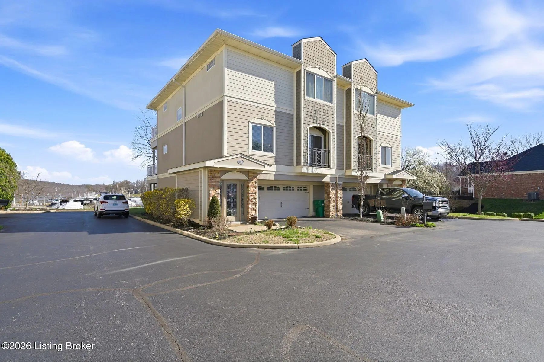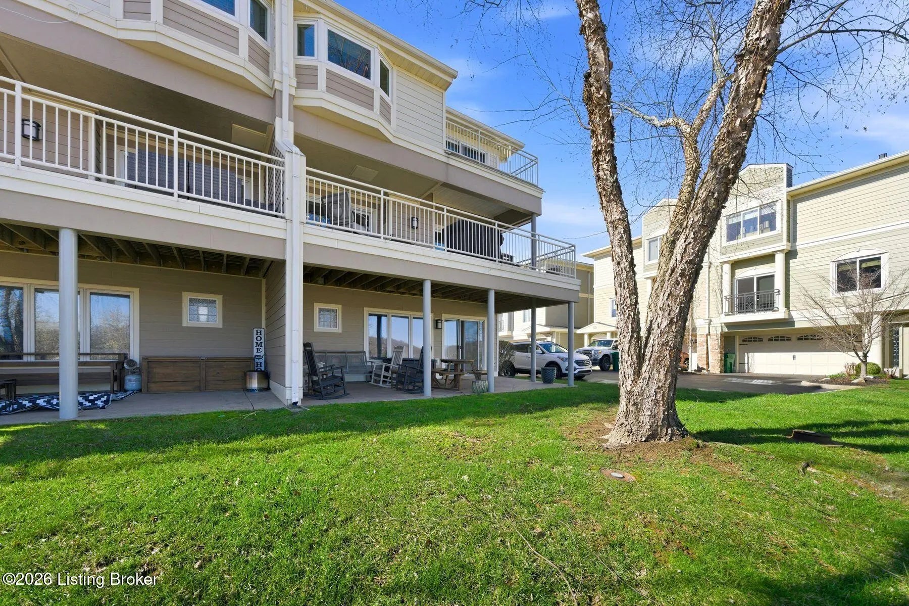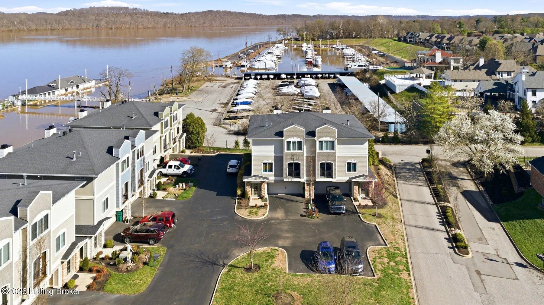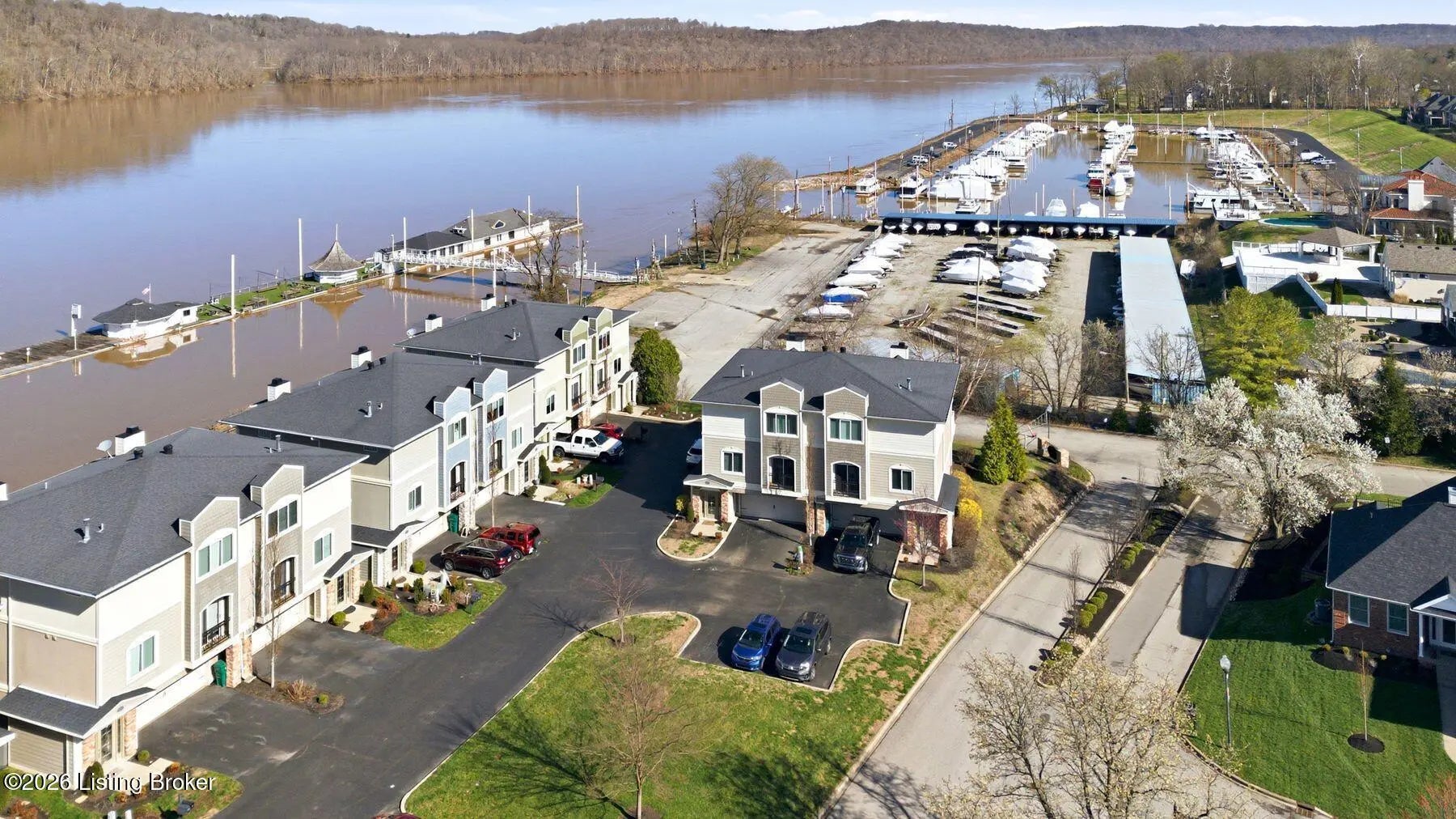 Welcome to Rose Island Riverside, where you can enjoy luxury living on the river without the need for flood insurance. Perched on a scenic hillside, this immaculate, move-in ready three-story condo blends thoughtful design with everyday functionality. Each spacious bedroom features its own private en-suite, offering comfort and privacy for family and guests alike. Every level boasts its own patio or balcony, perfect for relaxing while taking in breathtaking water views. The expansive family room is ideal for entertaining, seamlessly flowing into a beautifully appointed kitchen complete with granite countertops, ample cabinetry, and generous workspace. Perfect for any home chef! A designer Arteriors pendant light adds a touch of elevated style and warmth. The third floor offers a versatile sitting area along with two bedrooms, each featuring walk-in closets, providing flexible living options for guests, office space, or additional lounging. The primary suite is a true retreat, highlighted by a spa-like jetted tub and large windows overlooking the river. Enjoy the convenience of nearby attractions including Creasey Mahan Nature Preserve and Hermitage Farm, all just a short drive away. Schedule your private showing today and experience elevated riverfront living at its finest
