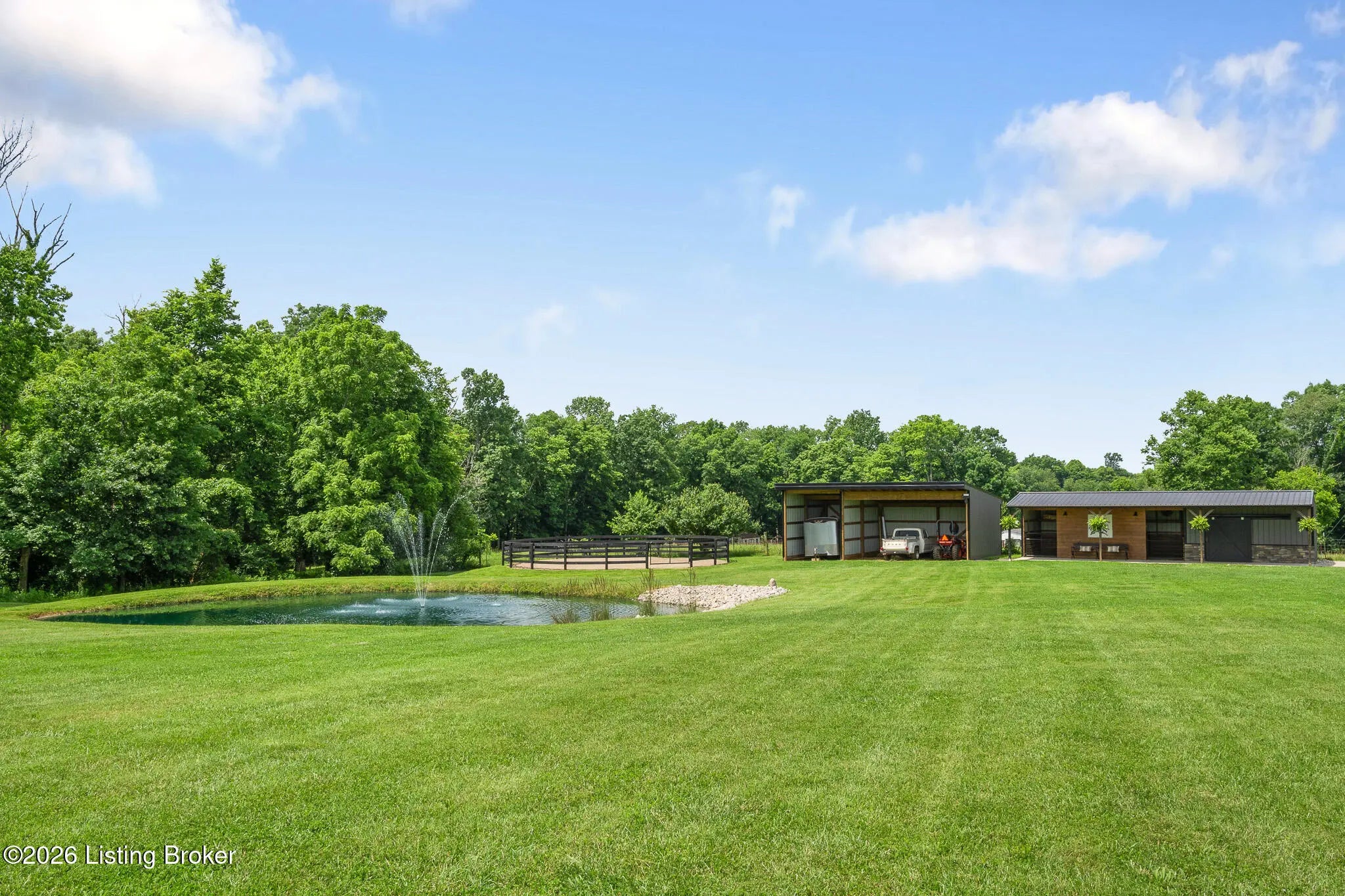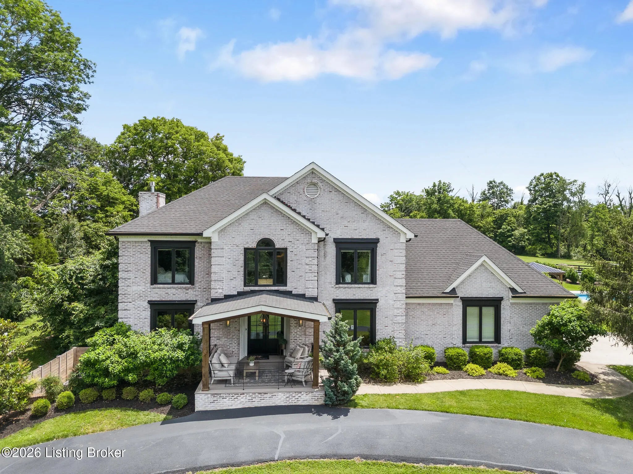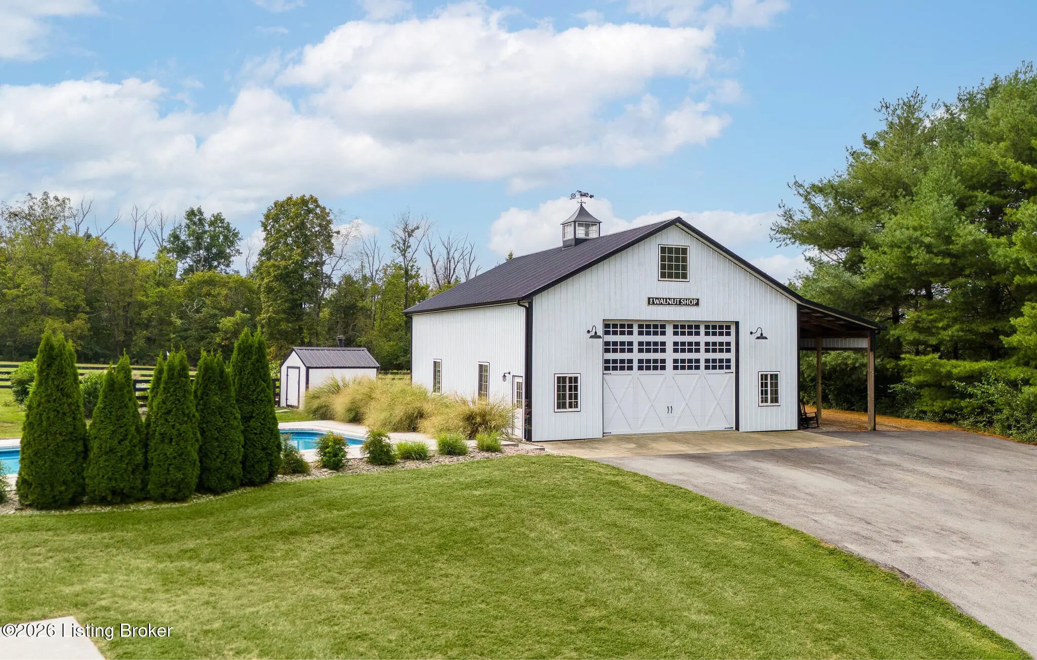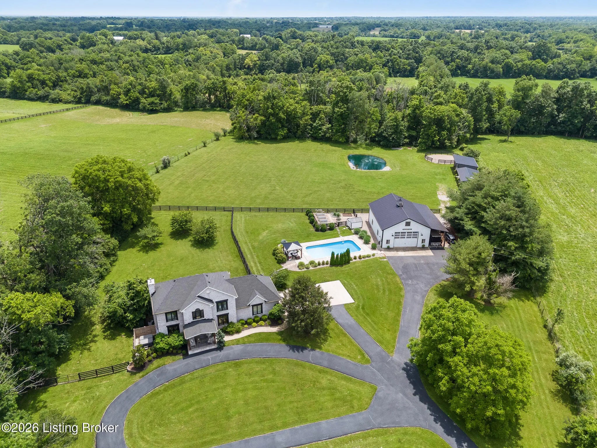 Peace & tranquility await you at this private 10-acre country estate! At Walnut Hill, you'll discover groves of trees, rolling fields, ponds and Kentucky black board fences that create this one-of-a kind property. Located near the charming town of Simpsonville, this stellar property is mere minutes from restaurants, cafes, boutiques & The Outlets of the Bluegrass. Enter through the stately gate and travel down the winding tree lined driveway where you will approach a stunning custom home perched in the center of the estate, where total privacy and vast countryside views abound. This beautifully remodeled four bedroom, three-and-a-half-bath home has an open floor plan, abundance of natural light and finished walk-out lower level. An inviting front porch with seating area welcomes you into a spectacularly designed interior with high-end finishes throughout. The home boasts luxuries such as built-in cabinetry, quartz countertops, designer appliances and beverages fridges, laundry centers, and cedar beamed vaulted ceilings on multiple levels. Step outside to your private backyard retreat featuring multiple decks, a large in-ground pool, gazebo, hot tub, garden area and oversized fire pit. An entertainer's paradise! A spacious 50x36 shop is finished with 200-amp electrical service, 50-amp RV hook ups and water. The building would easily convert into an additional barn, workshop, guest home or pickleball court. The possibilities are endless! Walnut Hill is set up for horse lovers. A stylish barn boasts two oversized stalls and a large tack room. In addition, two run-in stalls with small paddocks provide additional turn-out space. All stalls are equipped with automatic waterers, lighting & fans. Other features include a 45' round training pen, grooming station and large equipment building (36'x20) for all of your storage needs. The back paddock has been used for grazing, as well as a short golf course. Natural beauty abounds on this incredible property, with two ponds to enjoy fishing and a water feature, a seasonal creek with bridge & walking trails through mature groves of trees. Only 25 minutes to downtown Louisville & airport, Walnut Hill is the perfect place for peaceful country living, with access to all of the city's events and amenities. This is truly a rare opportunity to own a slice of Bluegrass paradise.
