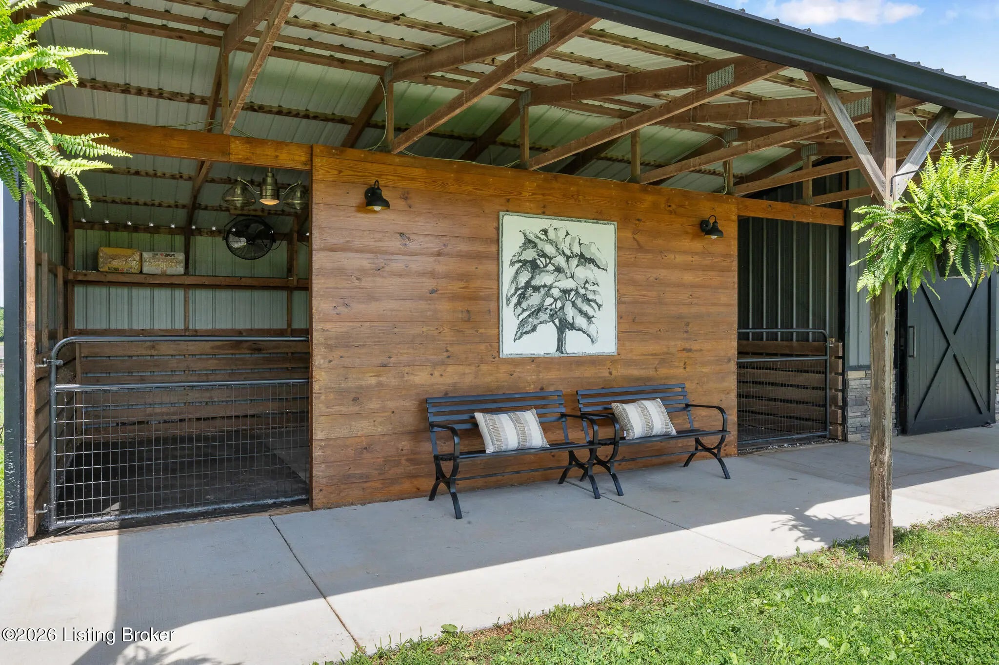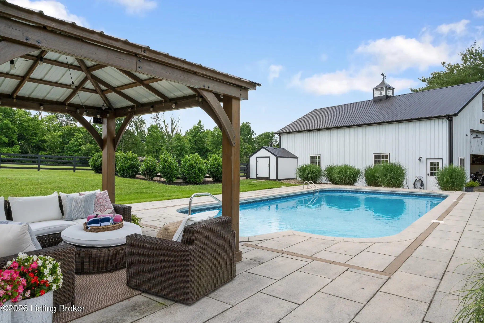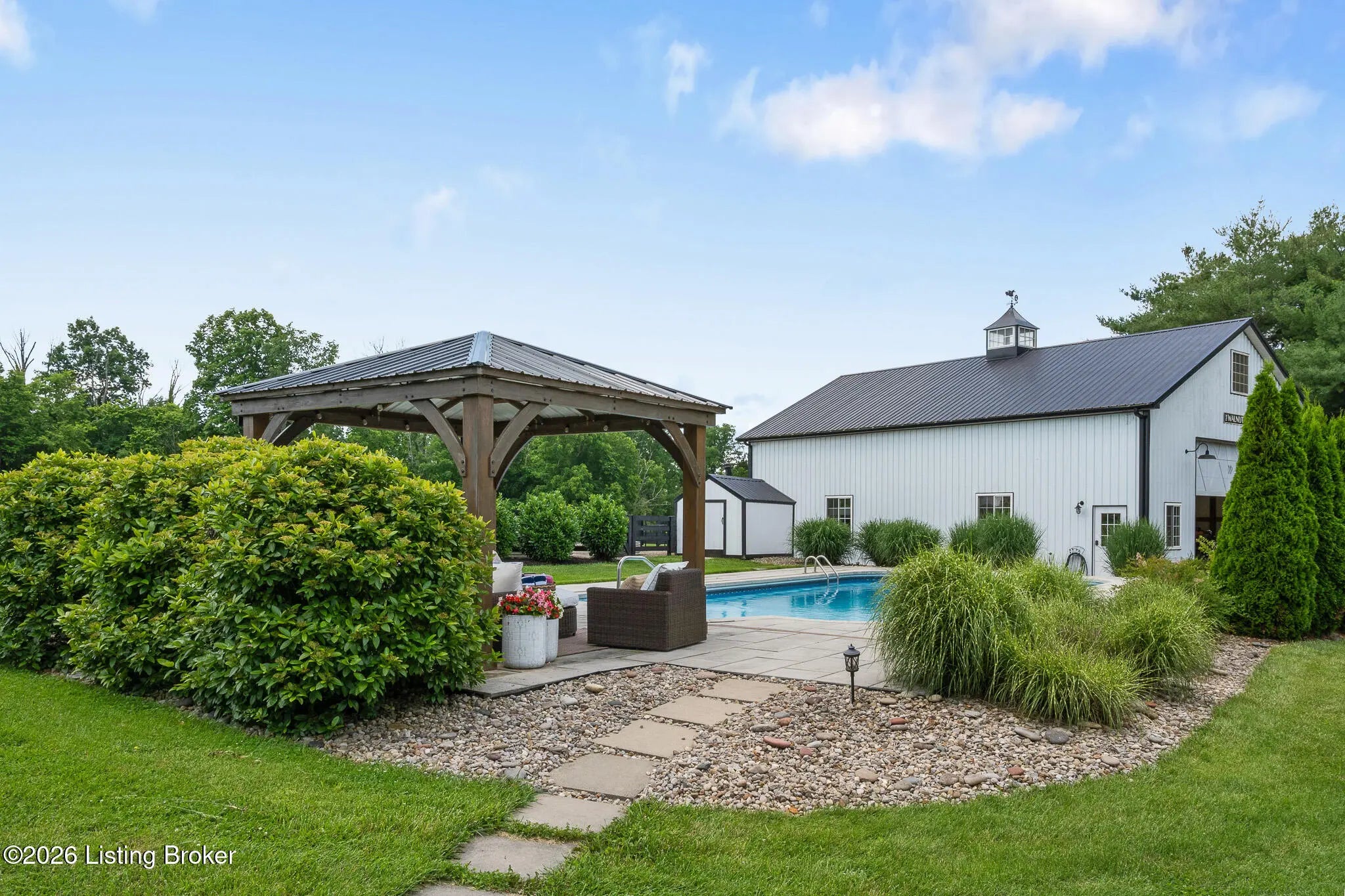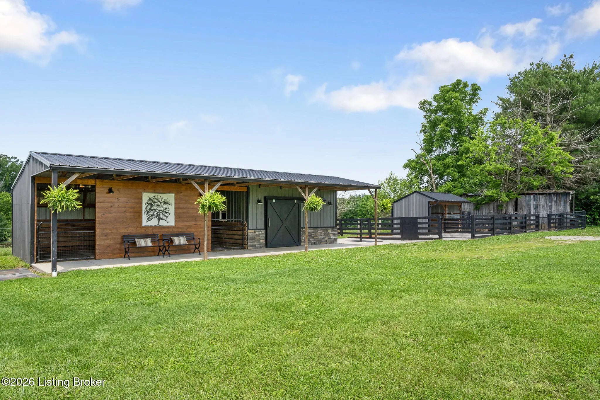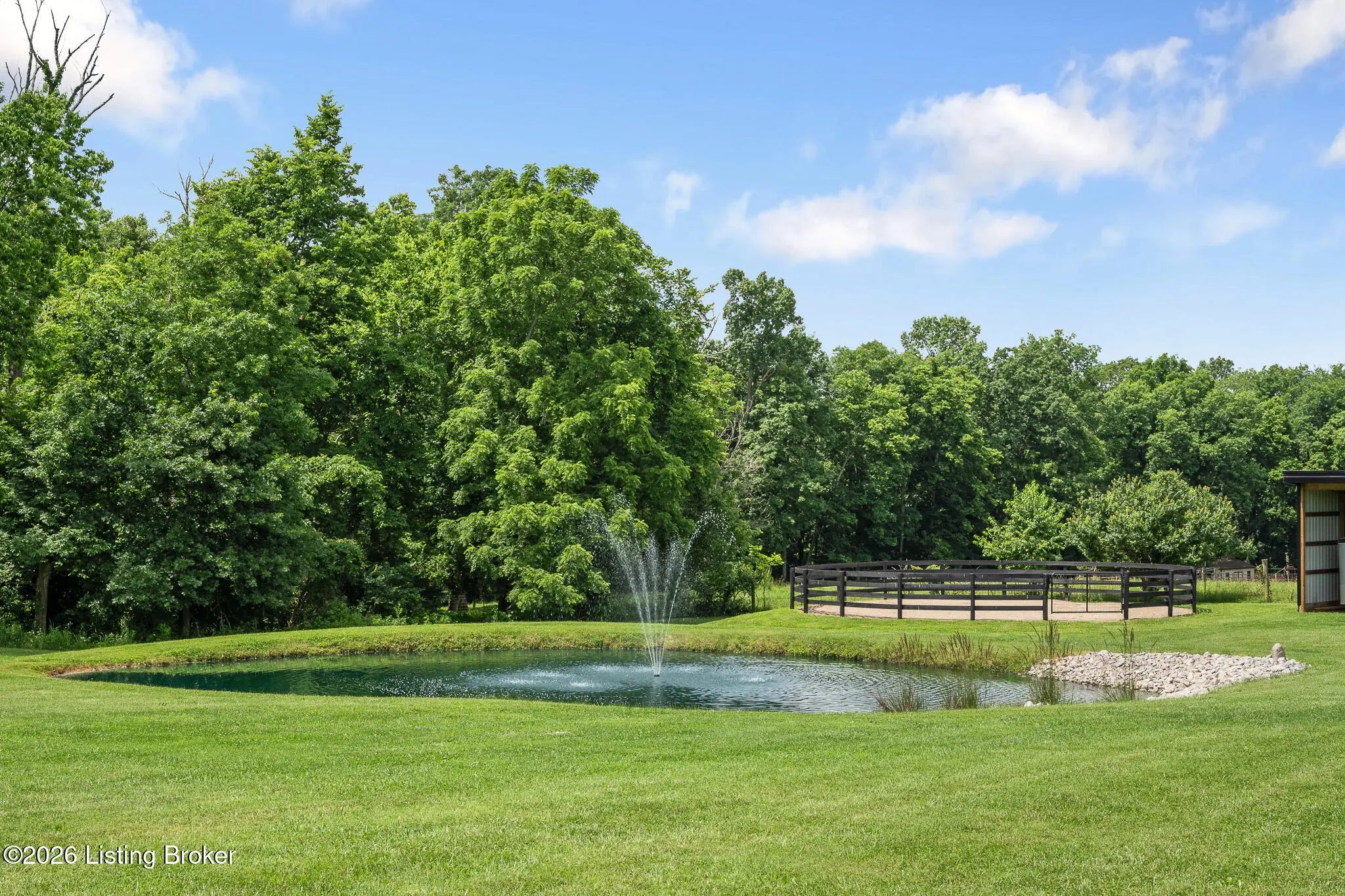 Peace & tranquility await you at this private 10-acre country estate! At Walnut Hill, you'll discover groves of trees, rolling fields, ponds and Kentucky black board fences that create this one-of-a kind property. Located near the charming town of Simpsonville, this stellar property is mere minutes from restaurants, cafes, boutiques & The Outlets of the Bluegrass. Enter through the stately gate and travel down the winding tree lined driveway where you will approach a stunning custom home perched in the center of the estate, where total privacy and vast countryside views abound. This beautifully remodeled four bedroom, three-and-a-half-bath home has an open floor plan, abundance of natural light and finished walk-out lower level. An inviting front porch with seating area welcomes you into a spectacularly designed interior with high-end finishes throughout. The home boasts luxuries such as built-in cabinetry, quartz countertops, designer appliances and beverages fridges, laundry centers, and cedar beamed vaulted ceilings on multiple levels. Step outside to your private backyard retreat featuring multiple decks, a large in-ground pool, gazebo, hot tub, garden area and oversized fire pit. An entertainer's paradise! A spacious 50x36 shop is finished with 200-amp electrical service, 50-amp RV hook ups and water. The building would easily convert into an additional barn, workshop, guest home or pickleball court. The possibilities are endless! Walnut Hill is set up for horse lovers. A stylish barn boasts two oversized stalls and a large tack room. In addition, two run-in stalls with small paddocks provide additional turn-out space. All stalls are equipped with automatic waterers, lighting & fans. Other features include a 45' round training pen, grooming station and large equipment building (36'x20) for all of your storage needs. The back paddock has been used for grazing, as well as a short golf course. Natural beauty abounds on this incredible property, with two ponds to enjoy fishing and a water feature, a seasonal creek with bridge & walking trails through mature groves of trees. Only 25 minutes to downtown Louisville & airport, Walnut Hill is the perfect place for peaceful country living, with access to all of the city's events and amenities. This is truly a rare opportunity to own a slice of Bluegrass paradise.