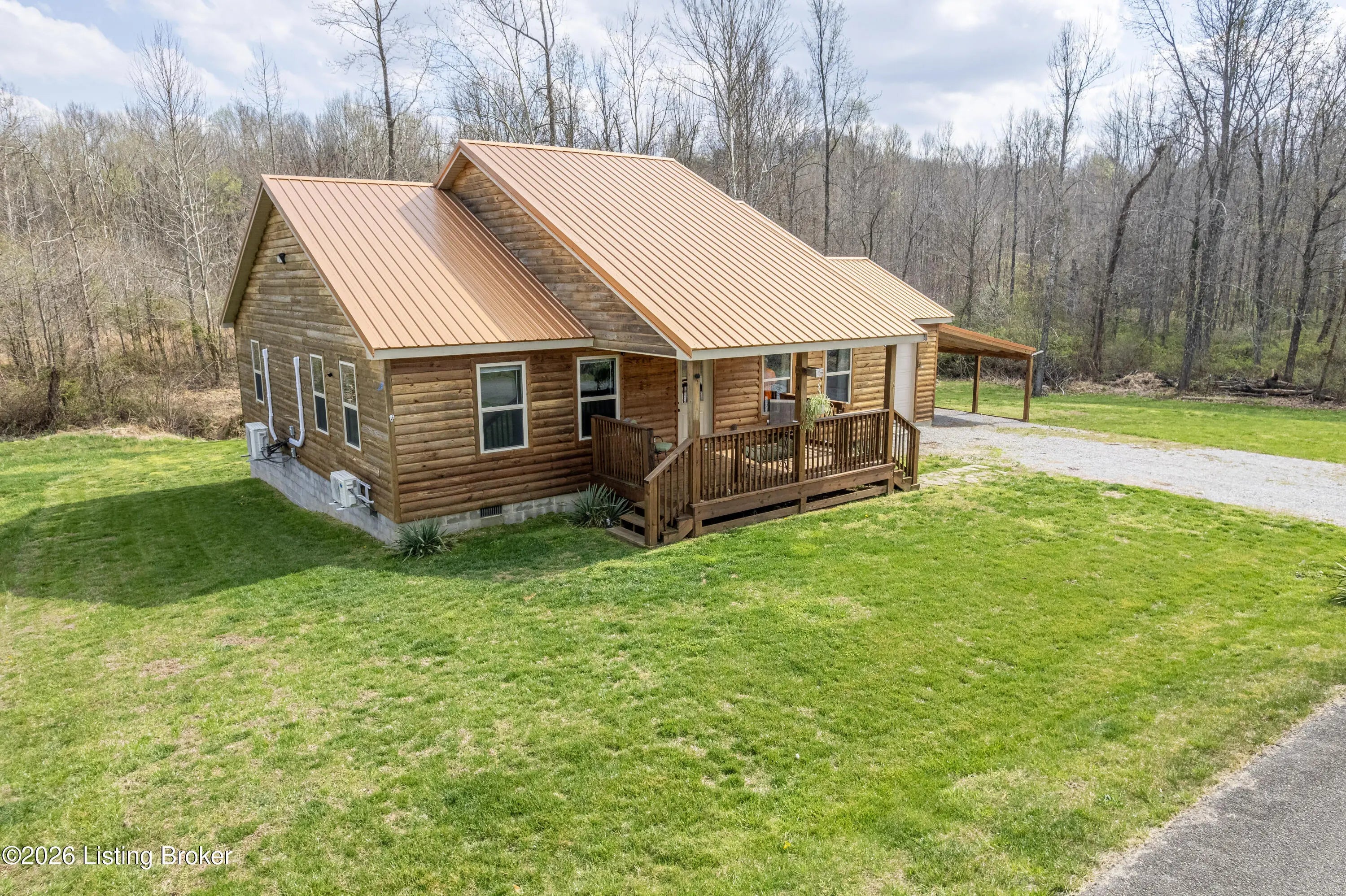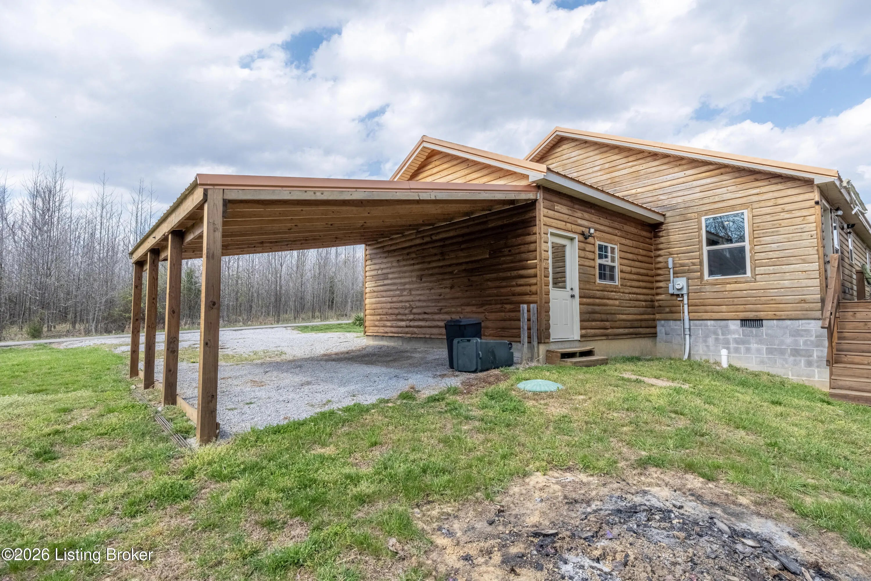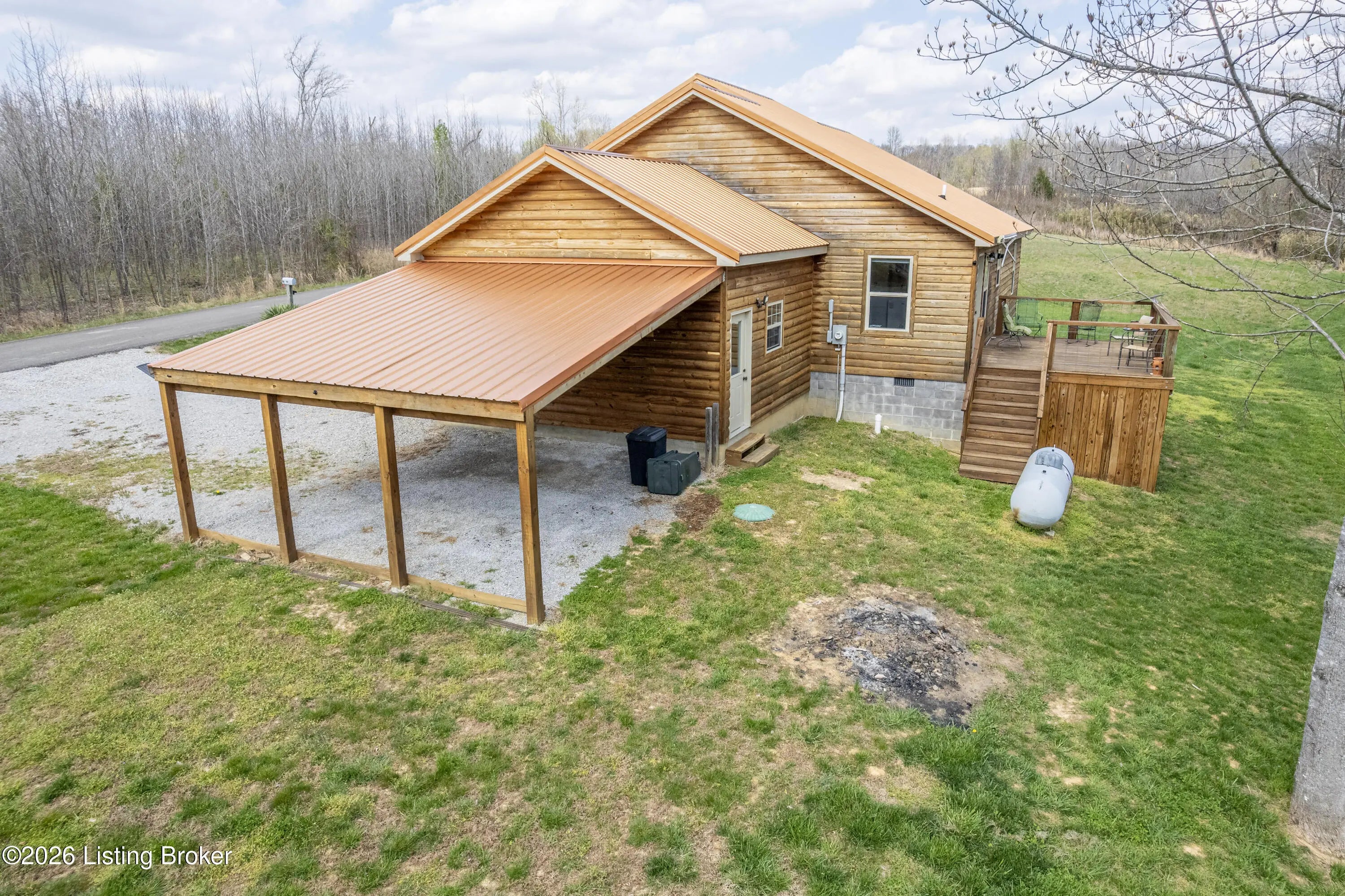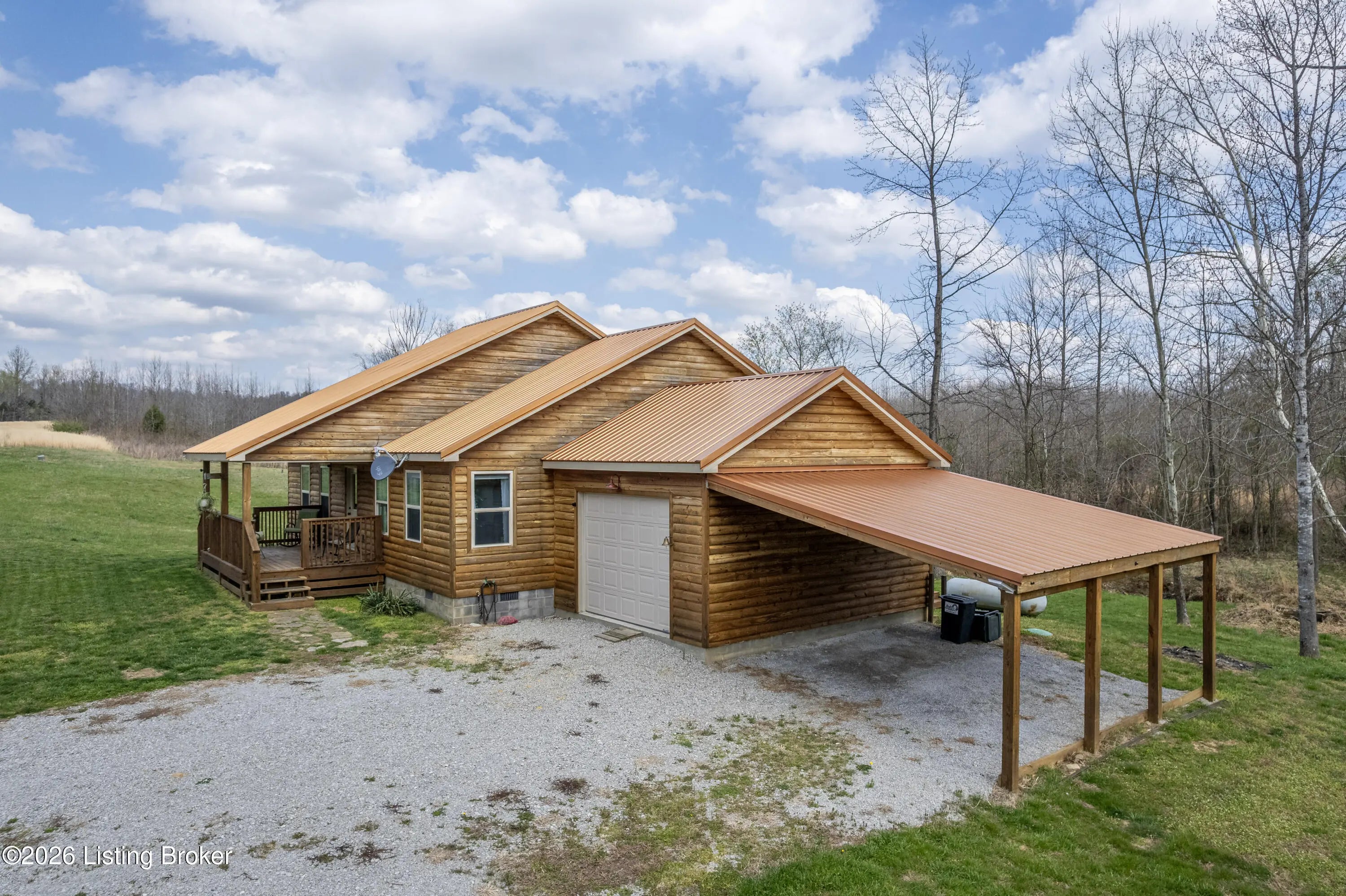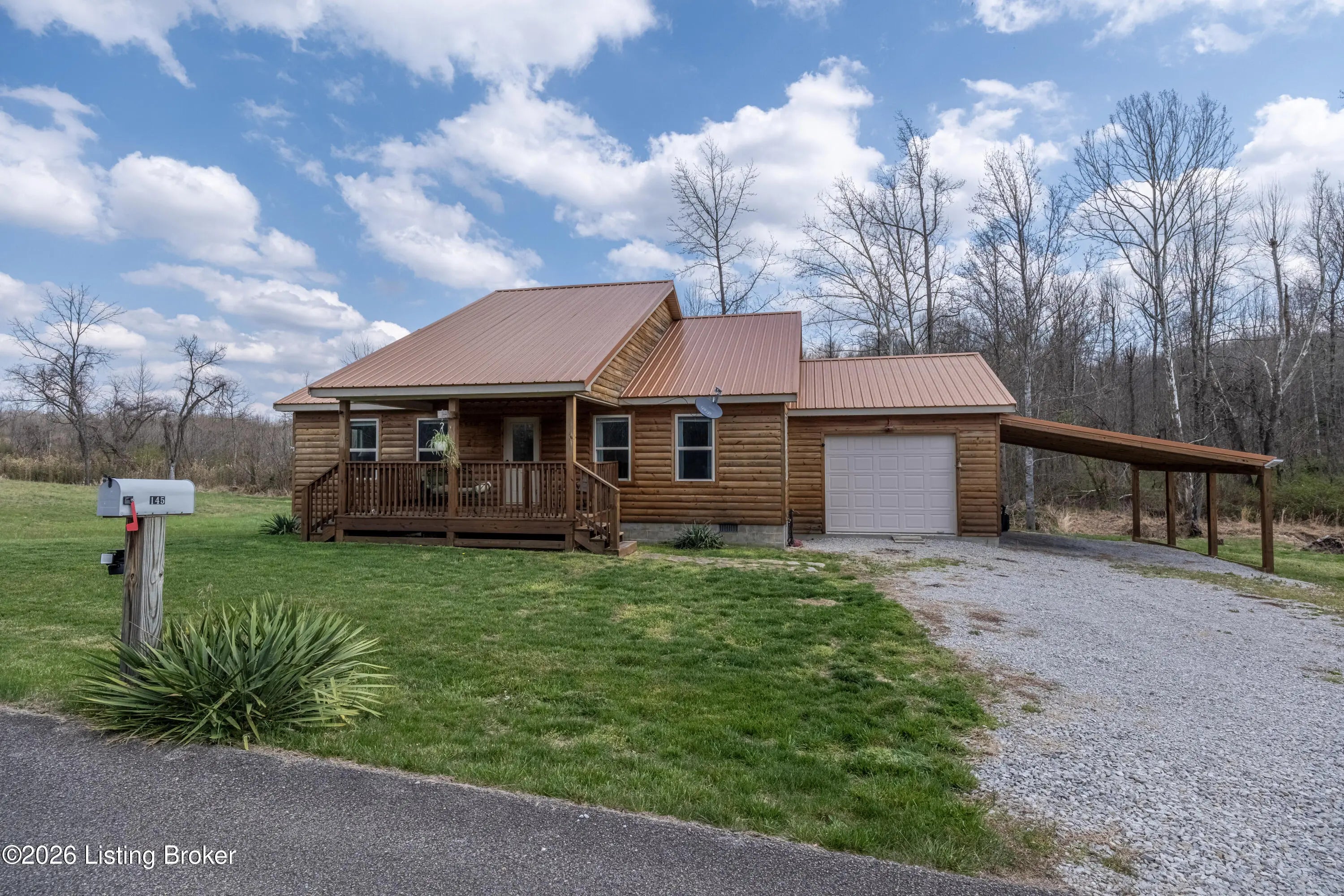 Located in the Green Farms subdivision beside Lafayette Golf Course, 145 Loyd Circle offers a quiet country setting with the convenience of being just minutes from Rough River Lake. Sitting on two lots totaling approximately 1.04 acres, this property provides extra space, flexibility, and privacy that's hard to find in this area. Amish built in 2020, the home offers 1,520 square feet with a large open layout that connects the kitchen and living room into one comfortable, functional space. The kitchen features ample cabinet storage and room to spread out, making it easy to handle everyday living or hosting. LVP flooring runs throughout the main living areas, with tile flooring in the bathroom for durability and easy maintenance. The primary bedroom is oversized with a large closet and direct access to a spacious primary bath. A second full bathroom adds convenience for guests or additional flexibility. A second spacious bedroom could be used as a multi-purpose room, big enough to host an office and bedroom furniture. Outside, the home features log siding, a covered front porch, an attached 1-car garage, and a 2-car carport. There is also additional storage space under the back deck for lawn equipment and tools. The two-lot setup gives you room to expand, build, or simply enjoy the extra space. By car, you're approximately 3 minutes to Lafayette Golf Course and Falls of Rough Resort, 10 minutes to Rough River Dam State Resort Park and the state boat ramp, and about 14 minutes to Nick's Boat Dock. Leitchfield is about 25-30 minutes away, and Hardinsburg is roughly 25 minutes. If you've been looking for a newer, low-maintenance home near Rough River Lake with extra space, a quiet setting, and the ability to get on the golf course or on the water within minutes, this property is worth a look.