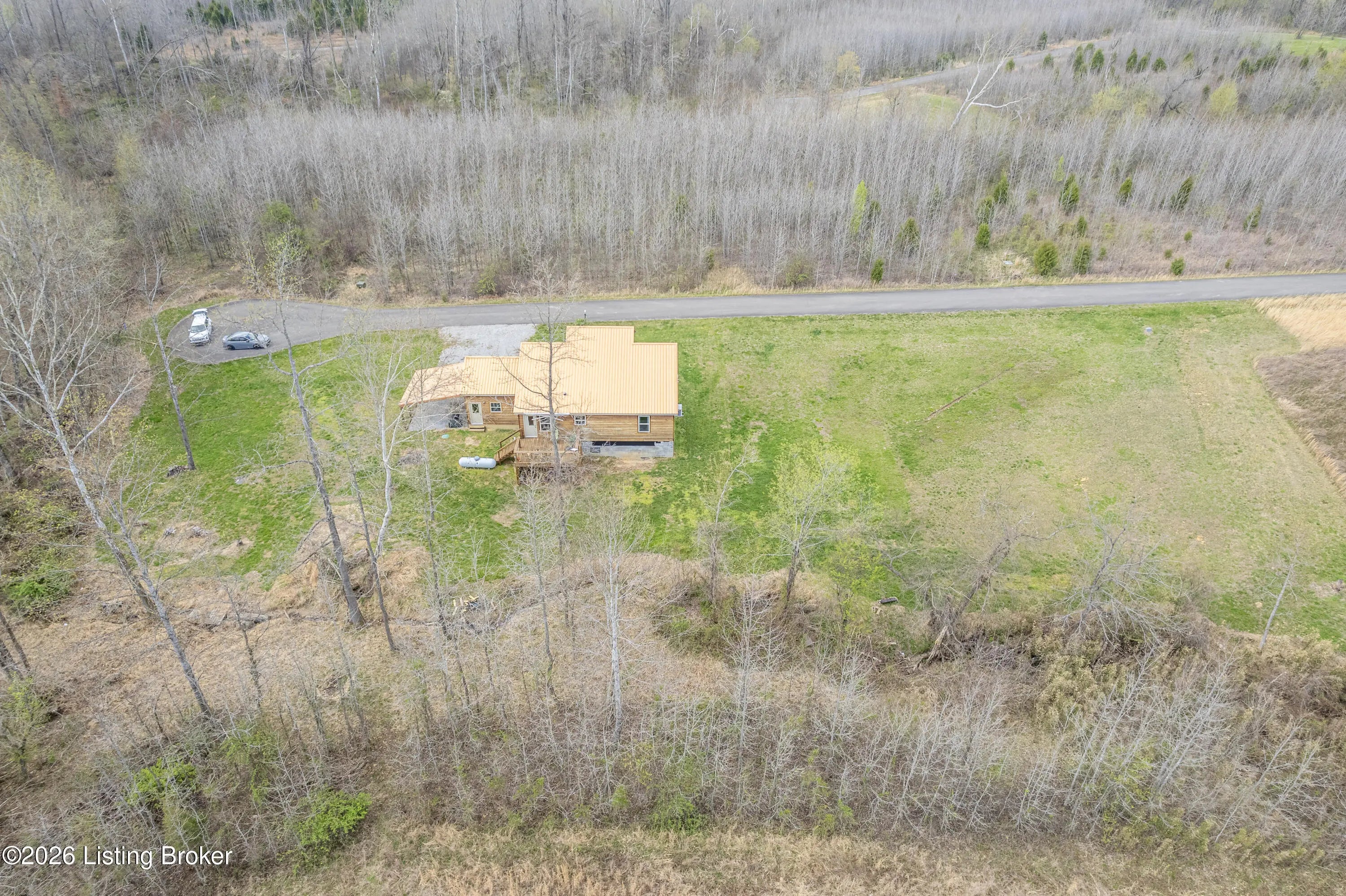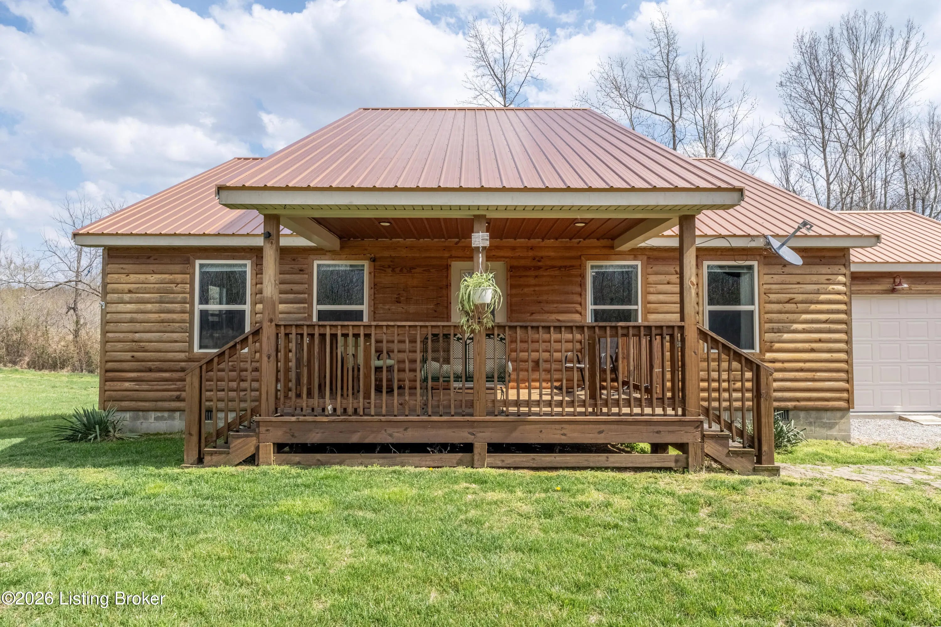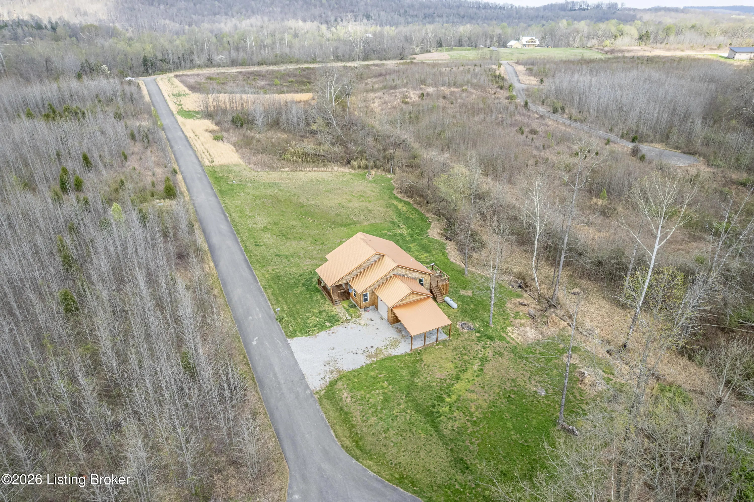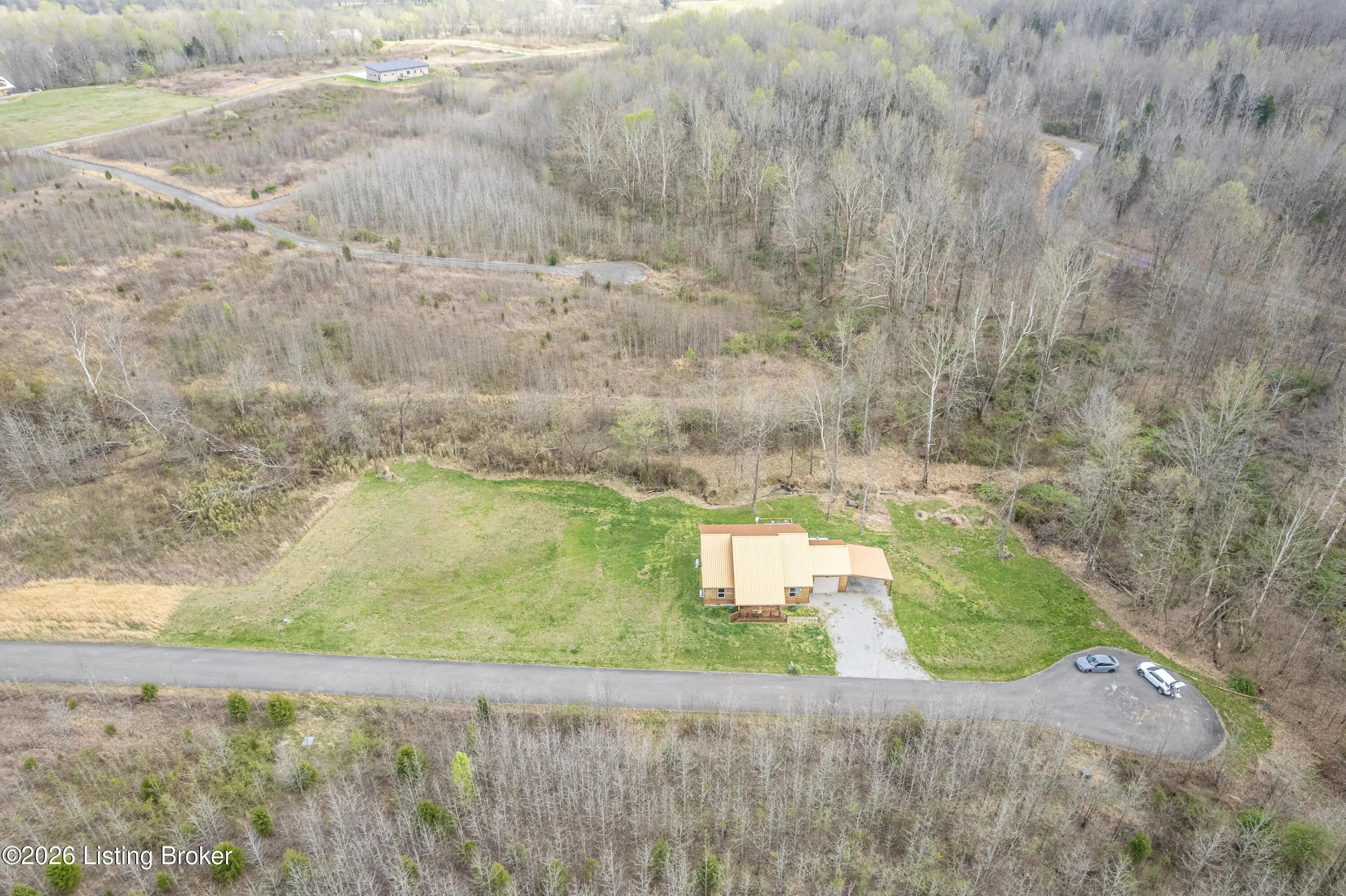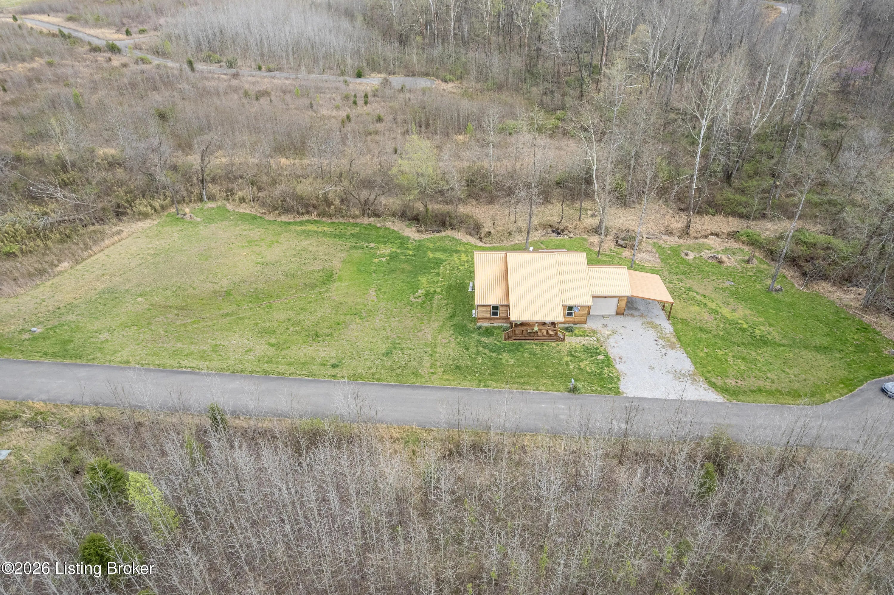 Located in the Green Farms subdivision beside Lafayette Golf Course, 145 Loyd Circle offers a quiet country setting with the convenience of being just minutes from Rough River Lake. Sitting on two lots totaling approximately 1.04 acres, this property provides extra space, flexibility, and privacy that's hard to find in this area. Amish built in 2020, the home offers 1,520 square feet with a large open layout that connects the kitchen and living room into one comfortable, functional space. The kitchen features ample cabinet storage and room to spread out, making it easy to handle everyday living or hosting. LVP flooring runs throughout the main living areas, with tile flooring in the bathroom for durability and easy maintenance. The primary bedroom is oversized with a large closet and direct access to a spacious primary bath. A second full bathroom adds convenience for guests or additional flexibility. A second spacious bedroom could be used as a multi-purpose room, big enough to host an office and bedroom furniture. Outside, the home features log siding, a covered front porch, an attached 1-car garage, and a 2-car carport. There is also additional storage space under the back deck for lawn equipment and tools. The two-lot setup gives you room to expand, build, or simply enjoy the extra space. By car, you're approximately 3 minutes to Lafayette Golf Course and Falls of Rough Resort, 10 minutes to Rough River Dam State Resort Park and the state boat ramp, and about 14 minutes to Nick's Boat Dock. Leitchfield is about 25-30 minutes away, and Hardinsburg is roughly 25 minutes. If you've been looking for a newer, low-maintenance home near Rough River Lake with extra space, a quiet setting, and the ability to get on the golf course or on the water within minutes, this property is worth a look.