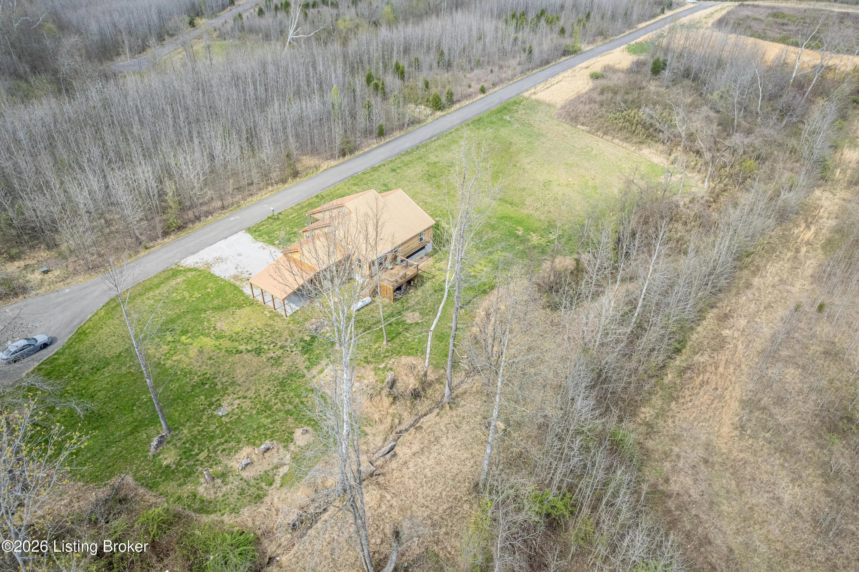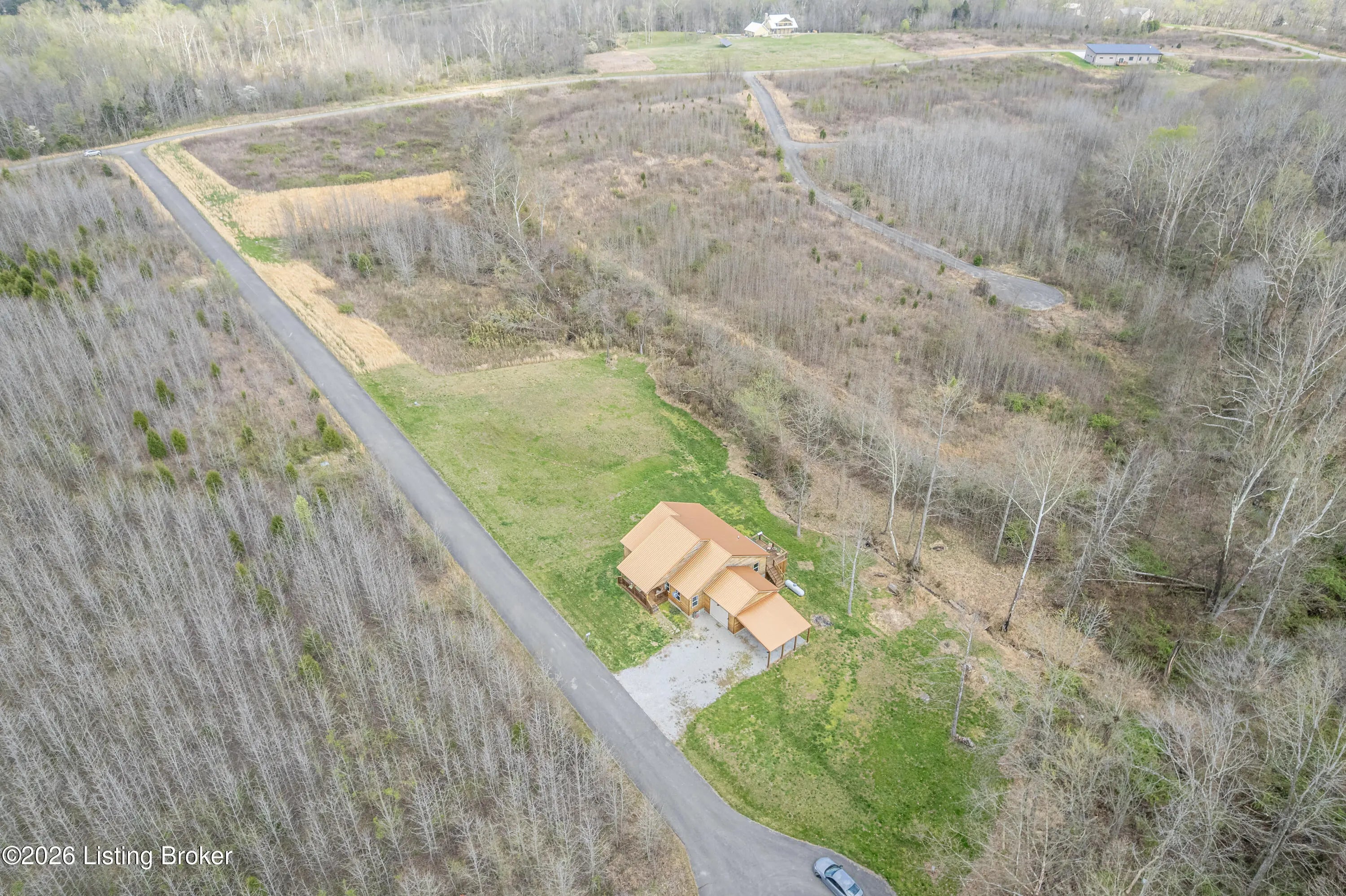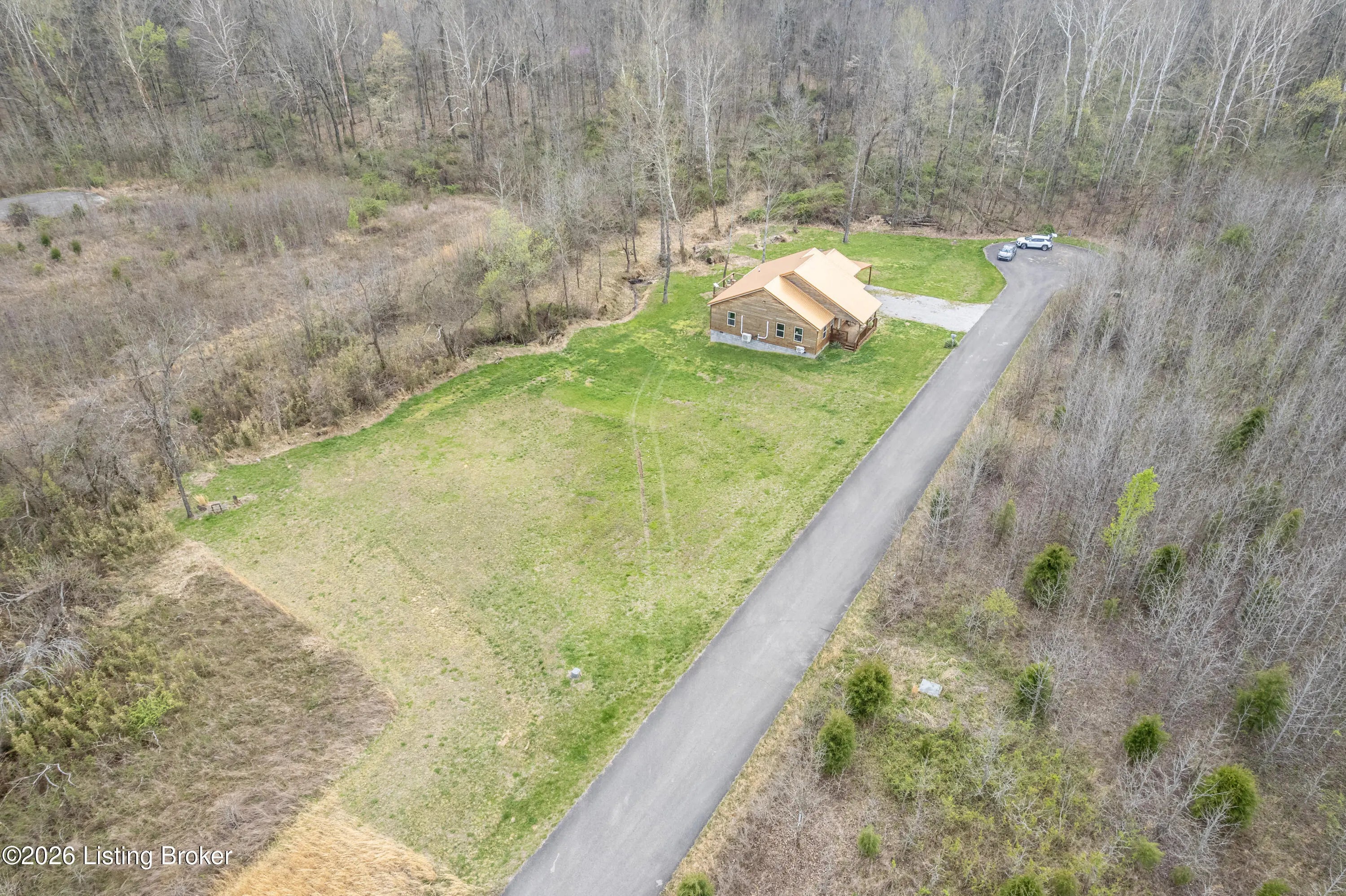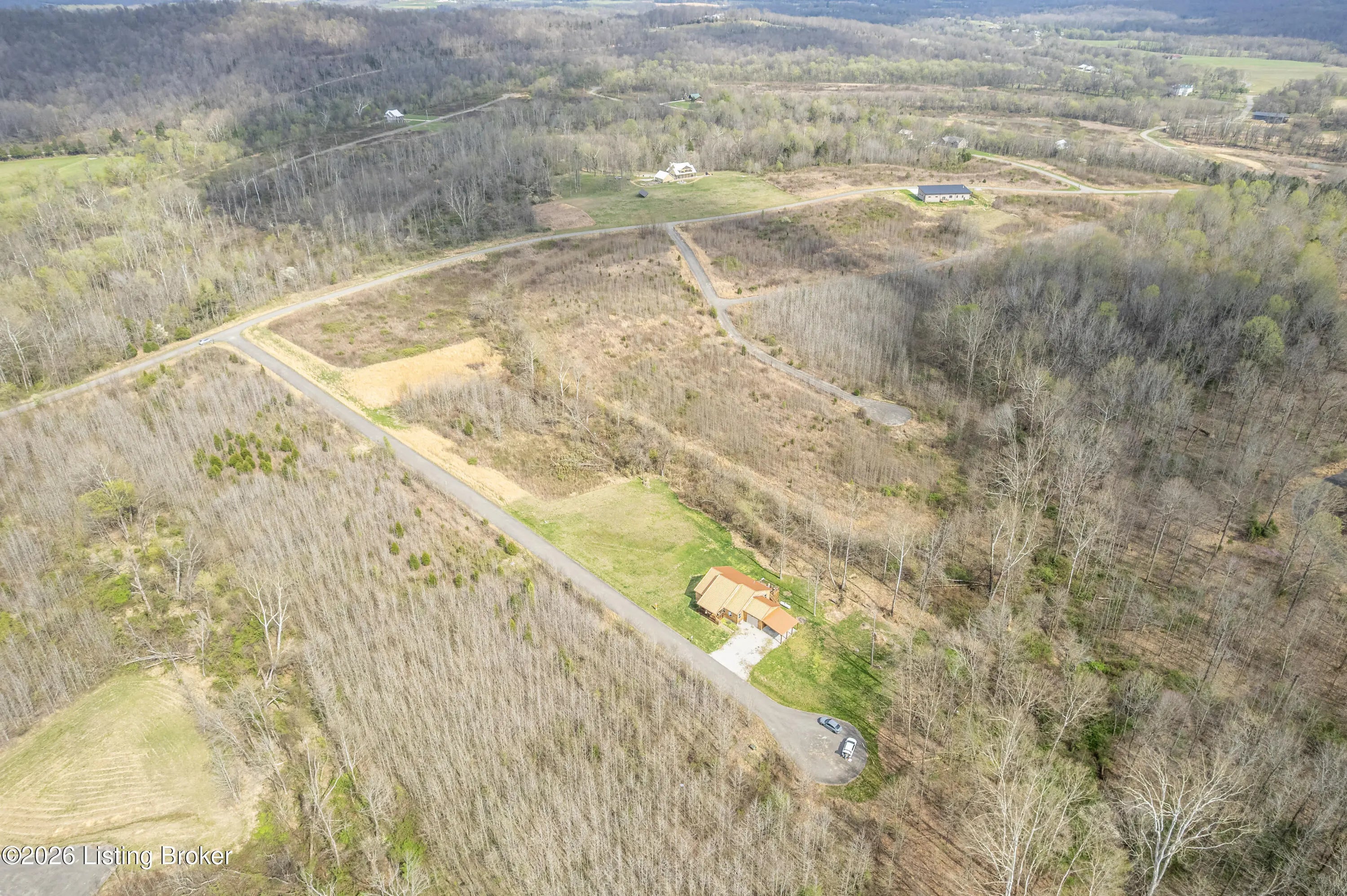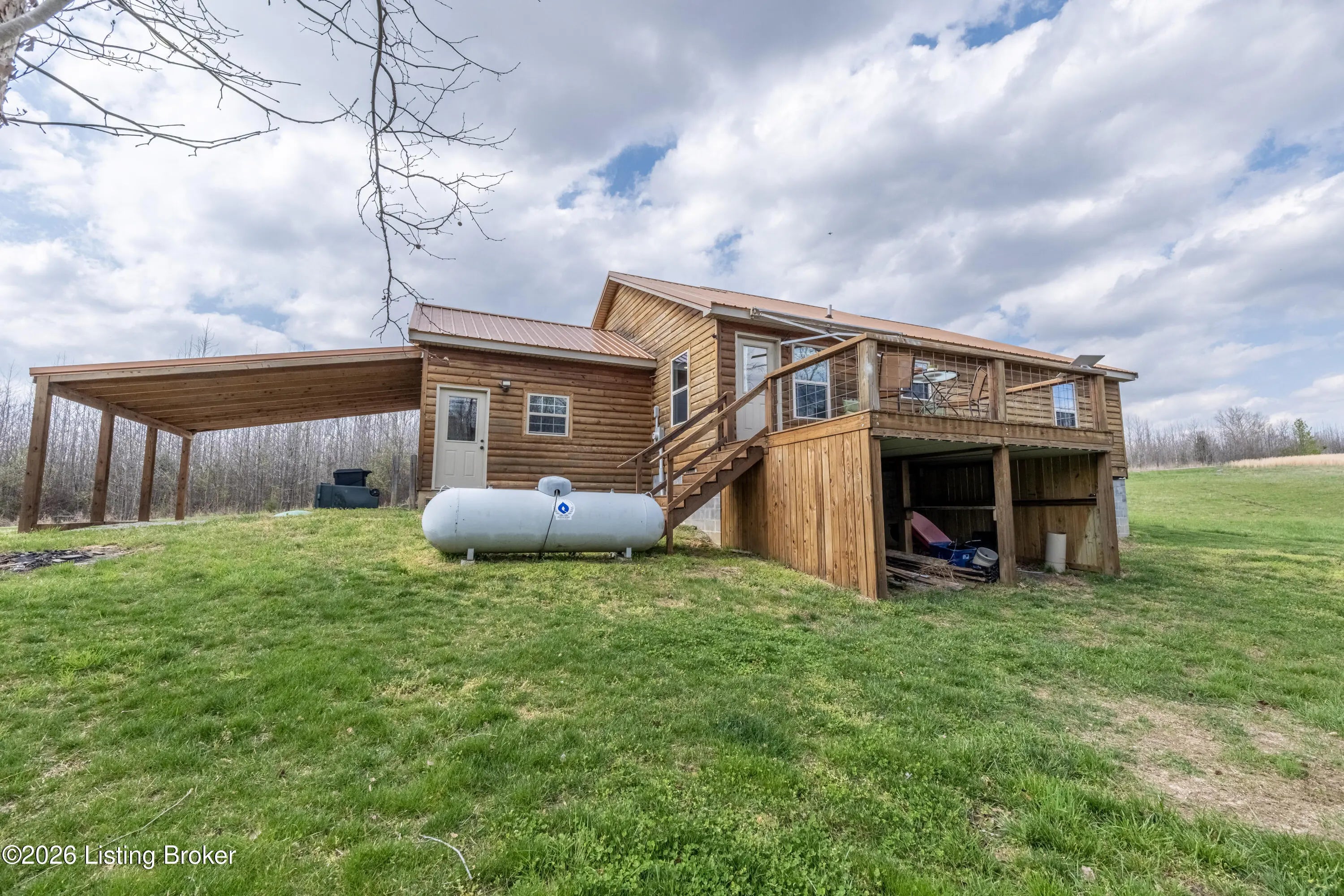 Located in the Green Farms subdivision beside Lafayette Golf Course, 145 Loyd Circle offers a quiet country setting with the convenience of being just minutes from Rough River Lake. Sitting on two lots totaling approximately 1.04 acres, this property provides extra space, flexibility, and privacy that's hard to find in this area. Amish built in 2020, the home offers 1,520 square feet with a large open layout that connects the kitchen and living room into one comfortable, functional space. The kitchen features ample cabinet storage and room to spread out, making it easy to handle everyday living or hosting. LVP flooring runs throughout the main living areas, with tile flooring in the bathroom for durability and easy maintenance. The primary bedroom is oversized with a large closet and direct access to a spacious primary bath. A second full bathroom adds convenience for guests or additional flexibility. A second spacious bedroom could be used as a multi-purpose room, big enough to host an office and bedroom furniture. Outside, the home features log siding, a covered front porch, an attached 1-car garage, and a 2-car carport. There is also additional storage space under the back deck for lawn equipment and tools. The two-lot setup gives you room to expand, build, or simply enjoy the extra space. By car, you're approximately 3 minutes to Lafayette Golf Course and Falls of Rough Resort, 10 minutes to Rough River Dam State Resort Park and the state boat ramp, and about 14 minutes to Nick's Boat Dock. Leitchfield is about 25-30 minutes away, and Hardinsburg is roughly 25 minutes. If you've been looking for a newer, low-maintenance home near Rough River Lake with extra space, a quiet setting, and the ability to get on the golf course or on the water within minutes, this property is worth a look.