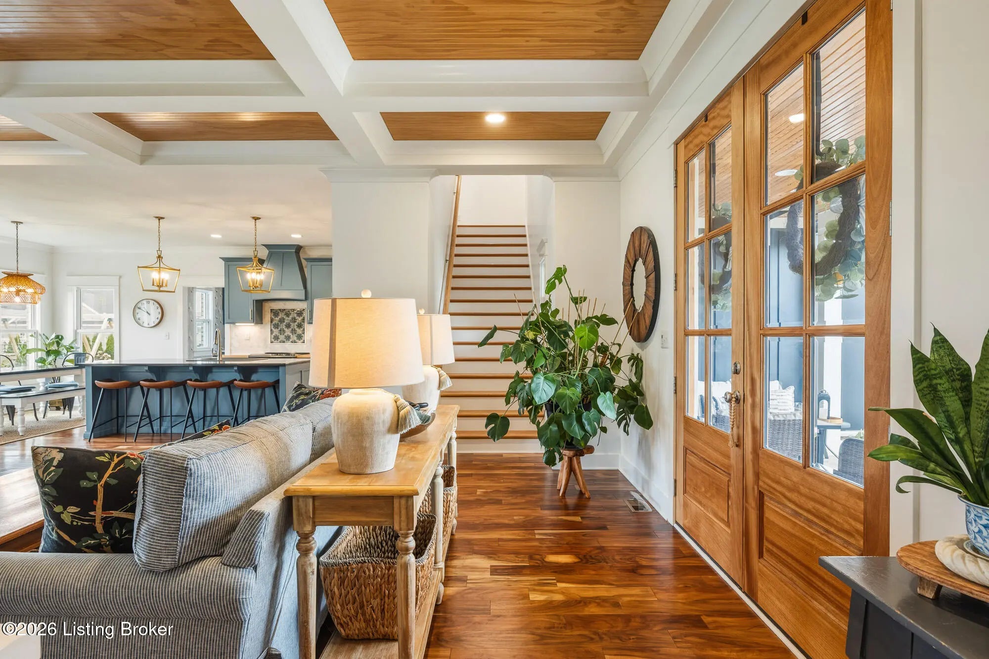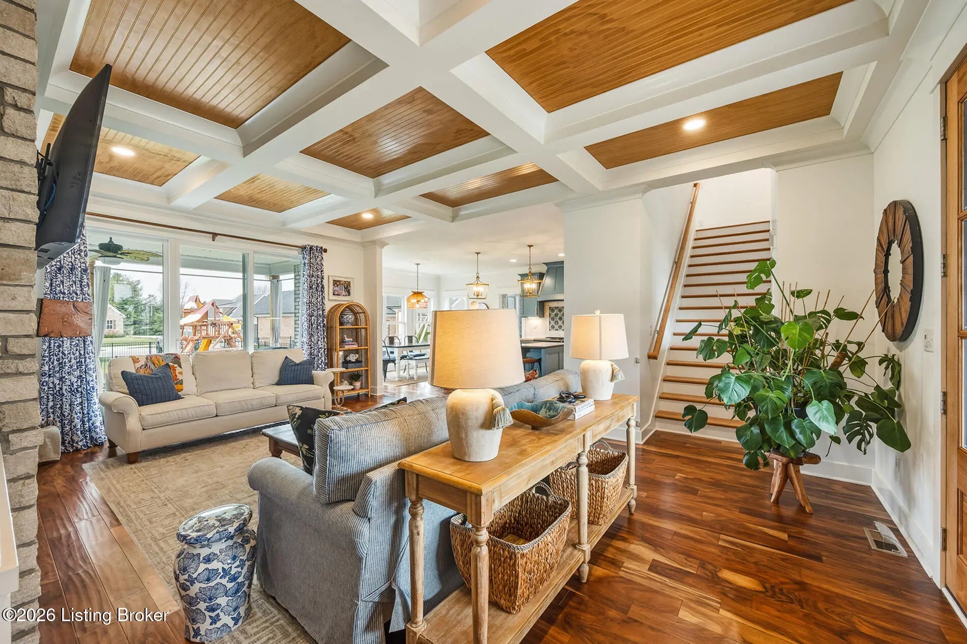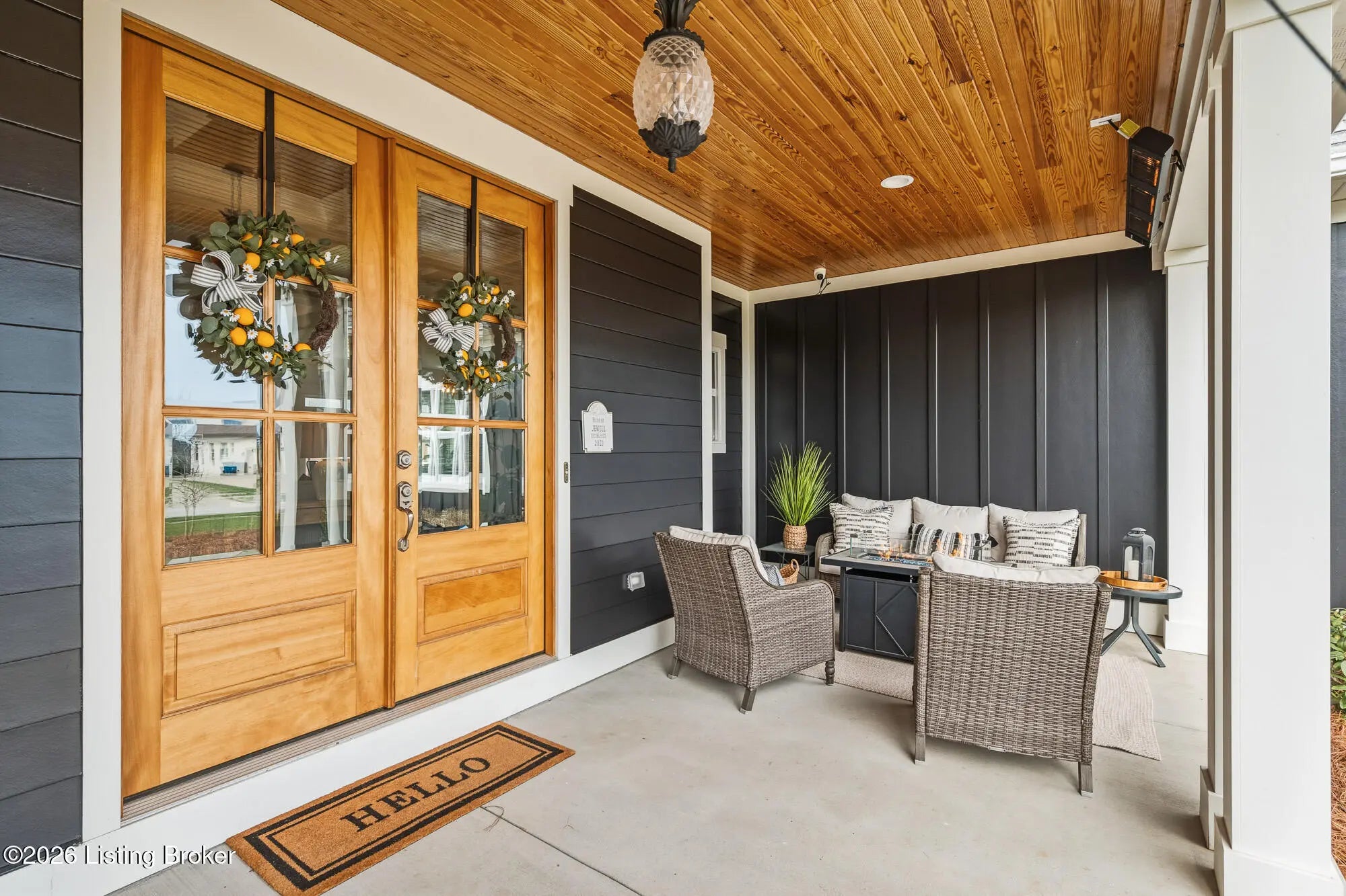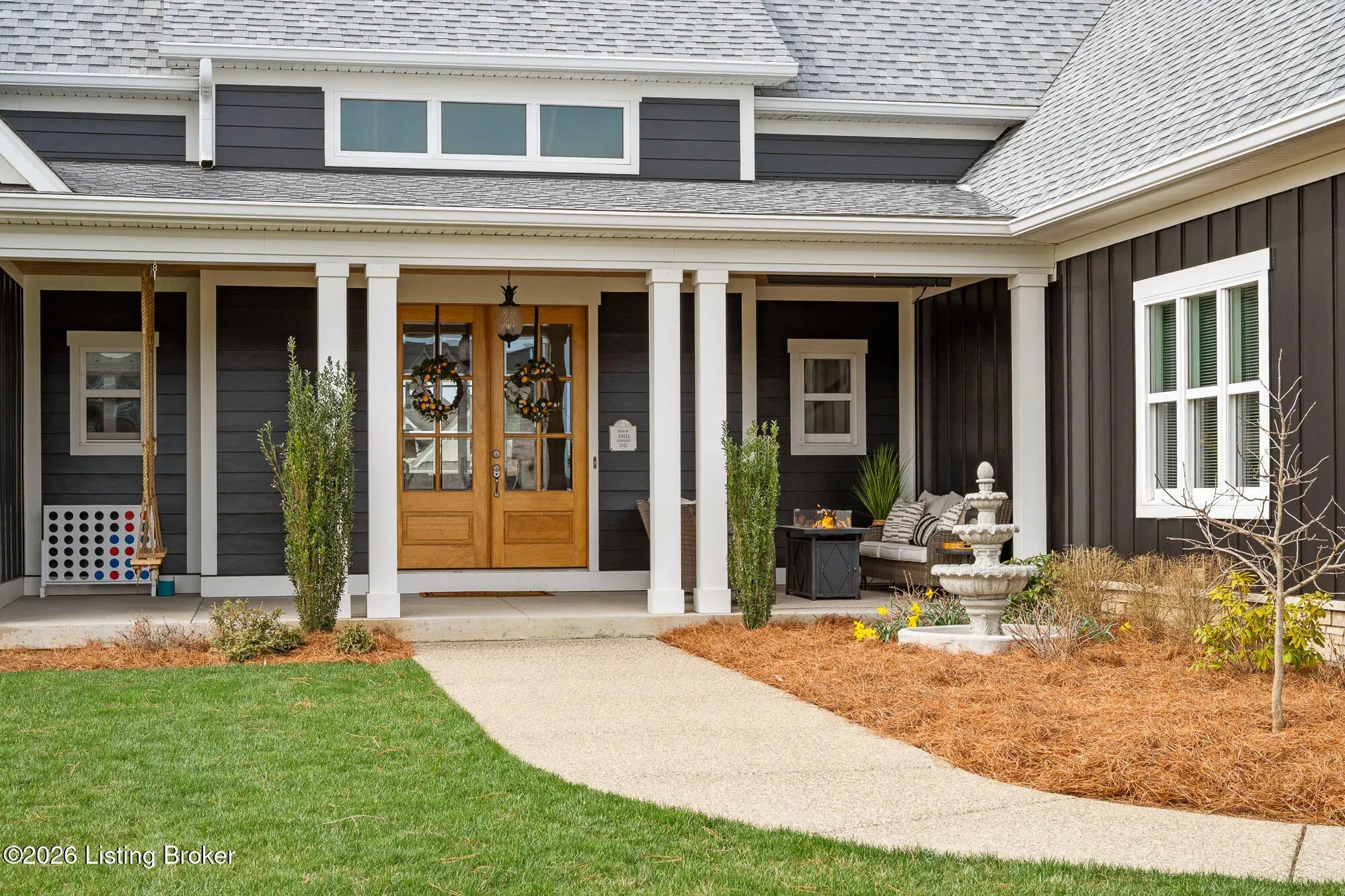 Welcome to 6370 Clore Lane. Custom built by TJM Custom Homes in 2020, this stunning 6-bedroom, 4.5 bath residence offers over 2800 sq/ft above grade and is ideally situated in the highly desirable Brentwood neighborhood. A brick exterior and a freshly painted decorator front façade set the tone, while the expansive front porch—complete with porch swings, a fire pit, ample seating, and an overhead electric heater—creates a year round outdoor retreat that's as inviting as it is impressive. Inside, the open floor plan is thoughtfully designed for everyday comfort and seamless entertaining. The gourmet kitchen features extended height custom cabinetry, a dedicated bar area with a mini fridge, a coffee station, and a spacious walk in pantry. Adjacent to the 3 car garage, you'll find a large laundry room and a custom built in storage bench with individualized cubbies to keep everything organized. The main level primary suite is a private sanctuary, offering vaulted ceilings, direct access to the backyard and hot tub, heated bathroom floors, a deep soaking tub, a walk in tile shower with multiple shower heads, dual vanities, and a generous walk in closet. Upstairs, four sizable bedrooms—each with large closets—provide plenty of space. Two share a Jack and Jill bath, while the remaining two are served by a separate full hallway bath. The partially finished basement extends your living space with an additional family room, a full bathroom, a sixth bedroom, and abundant storage. Unfinished areas offer future expansion potential. Tucked discreetly beneath the front porch and accessible in the basement is a rare and valuable feature: a true safe room and storm shelter. This home is fully wired for modern living, with CAT6 Ethernet in every room, PoE wireless access point ready, and a closed circuit security system requiring no outside subscription. The covered rear porch overlooks a flat backyard and a private hot tub that remains with the property. Beautifully maintained, move in ready, and filled with thoughtful upgrades—this home checks every box.
