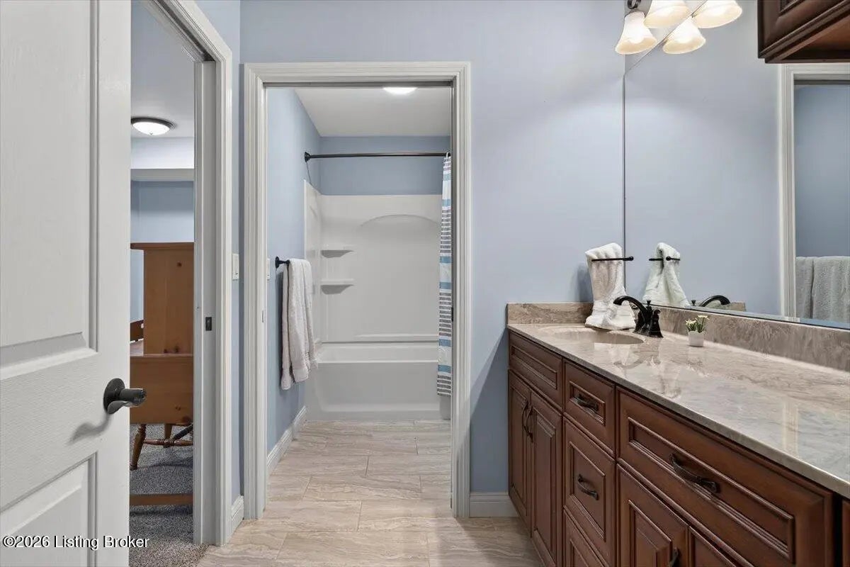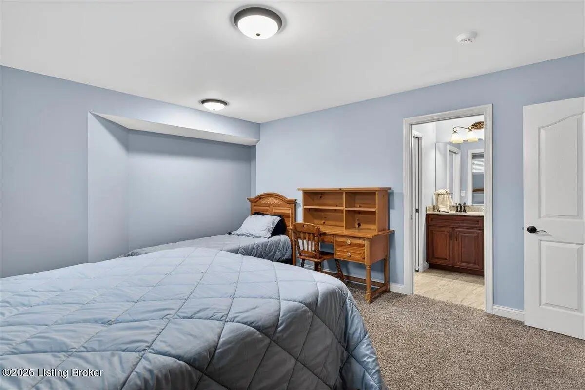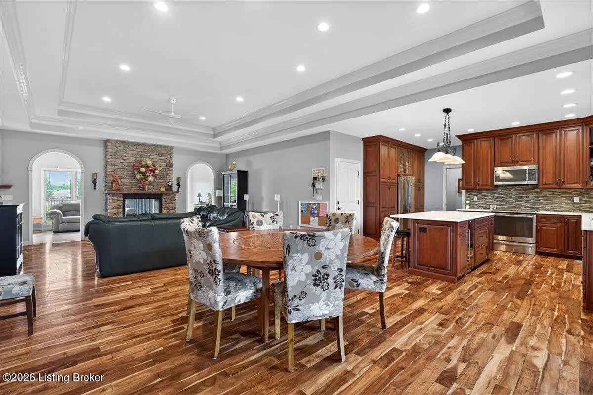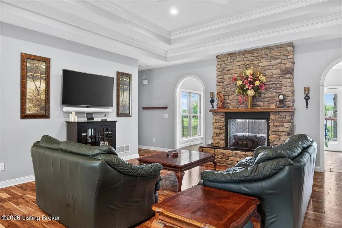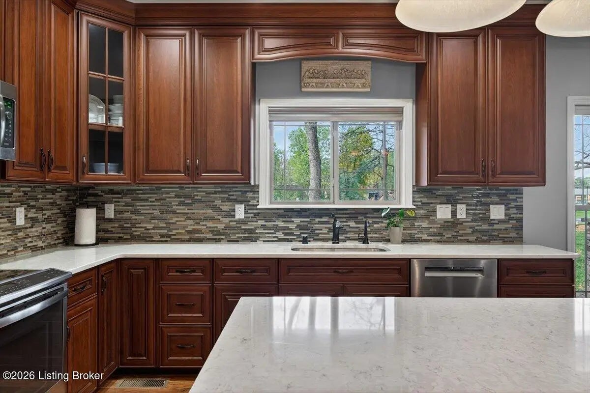 This beautiful custom brick and stone ranch is ready to welcome its next owner! The main living area features an open floor plan, highlighted by a stunning kitchen with Amish-built cherry cabinetry and large island with elegant marble countertops. The home offers 3 bedrooms and 3.5 baths, along with three additional finished rooms in the basement currently being used as bedrooms—providing plenty of flexible space. The primary suite includes a beautiful bathroom with a zero-entry shower tiled to the ceiling and walk-in closet, while the first floor offers ADA-compliant doorways for added accessibility. You'll love the warmth of Bruce hardwood floors, the convenience of first-floor laundry, and the comfort of a see-through gas fireplace shared between the great room and sunroom. The finished basement is easily accessible from two staircases and includes a large storage area. Additional features include a spacious 2.5 car garage, a central vacuum system, two gas hot water heaters, a welcoming front porch, and a large back deck—perfect for relaxing or entertaining. This home truly combines quality craftsmanship, thoughtful design, and versatile living space!