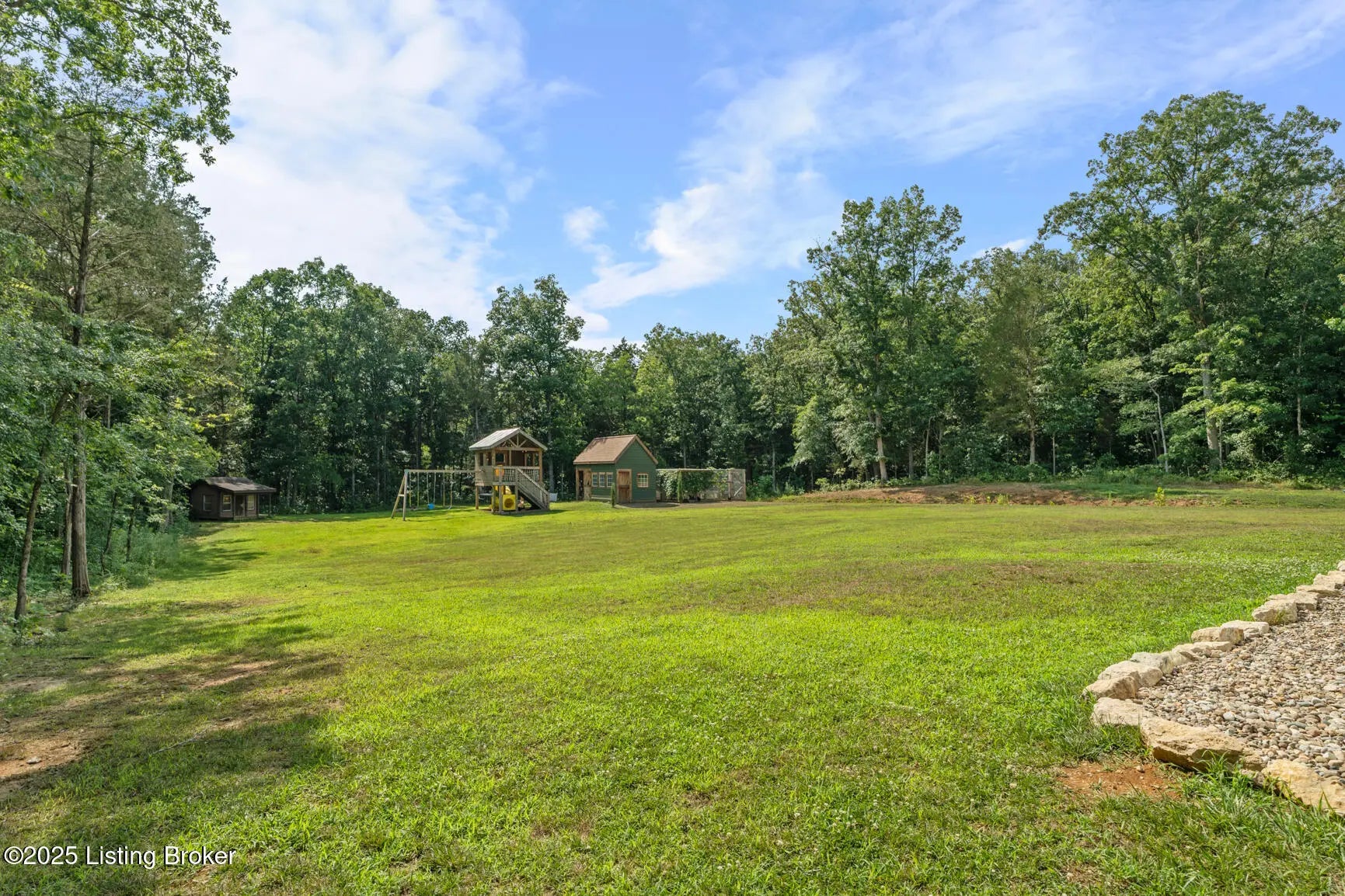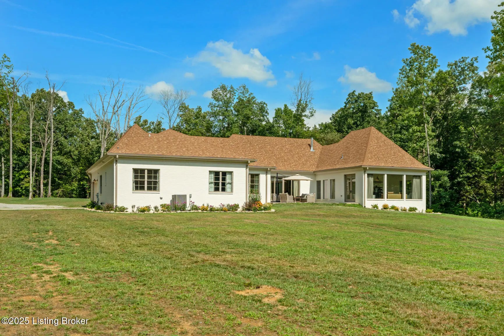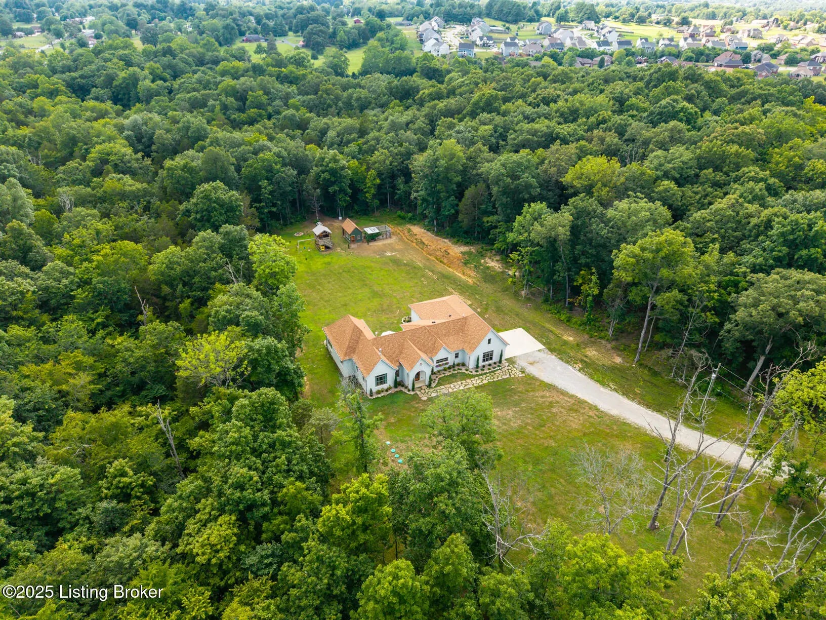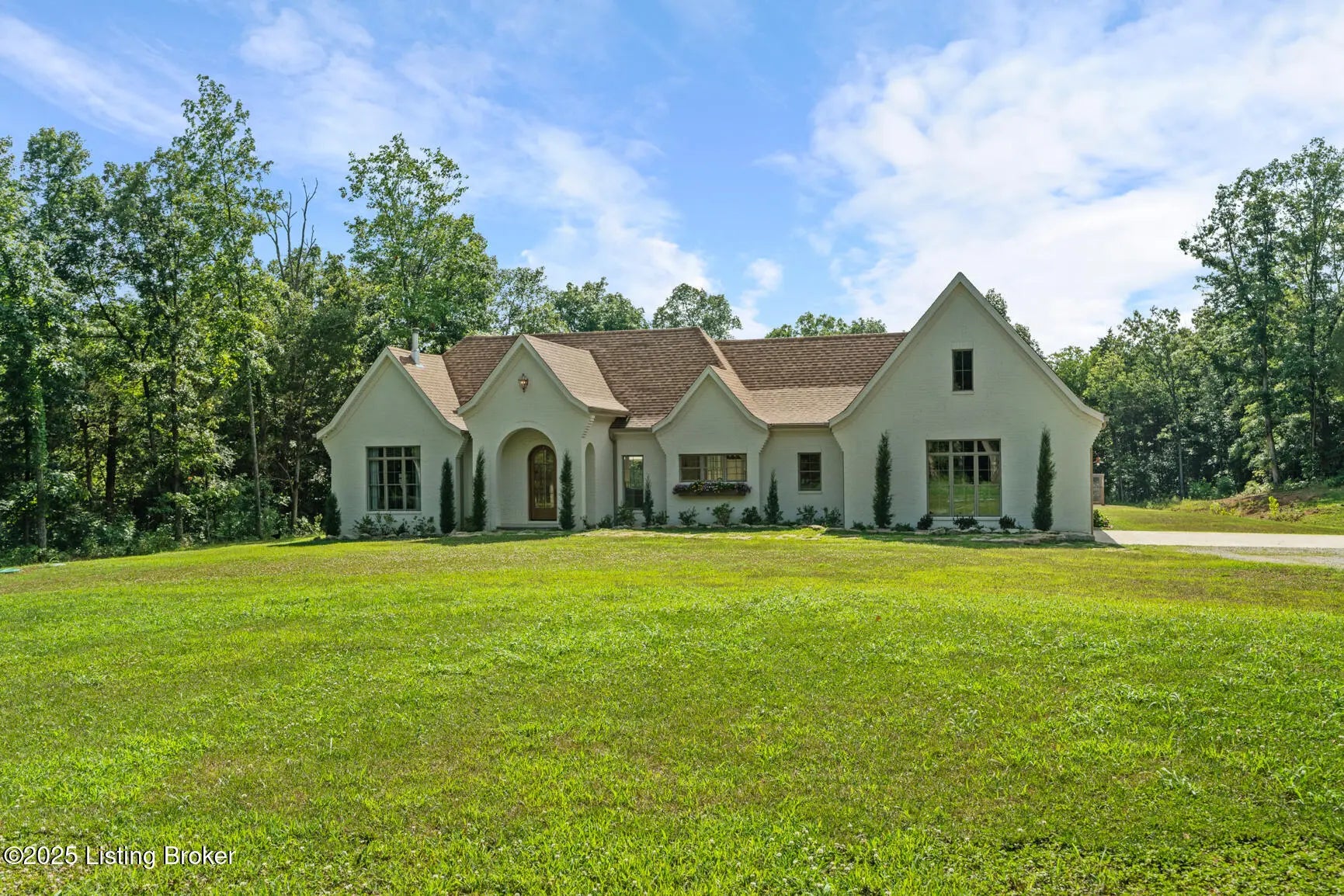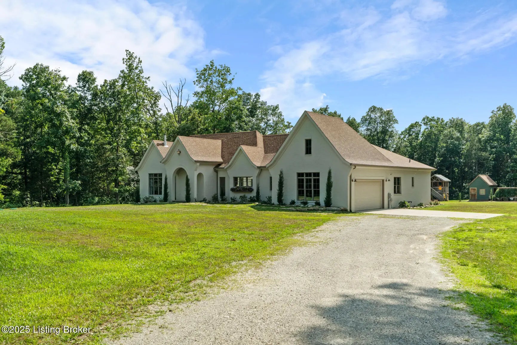 Welcome to this stunning, custom-built cottage-style retreat nestled on 8.4 acres of private, wooded land. Country living, yet just minutes from shopping, dining, and everyday amenities. Built in 2022, this 3,334 sq. ft. home is the perfect balance of modern craftsmanship and timeless charm with 4-5 bedrooms and spacious living throughout. From the moment you arrive, you'll appreciate the long, gated driveway that offers both privacy and security. A stone walkway leads to a beautiful arched front door and into a bricked foyer, setting the tone for the custom finishes inside. The vaulted great room is both cozy and grand, with a white shiplap ceiling and beams, wide-plank oak floors, and a floor-to-ceiling stone fireplace as its focal point. The large windows and gorgeous 8ft glass doors let in tons of natural light and lead to a large concrete patio. The heart of the home is the chef's kitchen, featuring a six-burner gas range with two convection ovens and a stove top griddle, a pot filer faucet, granite countertops, a tiled backsplash, custom range hood, and a farmhouse sink framed by oversized windows. A massive (4.2x10.2) marble island includes lots of seating space and tons of cabinet storage below. Just off the kitchen is an adorable walk-in pantry with an abundance of cabinetry, butcher block countertops, and a charming six-lite wood door. Enjoy all your meals in the large dining area that looks out into the back property. The dream laundry/mudroom has a wall cubby with seating and storage, lots of cabinets and 2 butcher-block counters. The laundry/mud room is conveniently located coming in from the garage. The luxurious primary suite is a true retreat, with vaulted shiplap ceilings and beams, oversized windows, and a spa-like ensuite bathroom. Enjoy a soaking tub, walk-in tiled shower, double custom vanity, and a huge walk-in closet, all set on elegant travertine flooring. Tucked into a peaceful corner of the home is a dedicated coffee room, surrounded by floor-to-ceiling windows that frame views of the backyard and woods. With its own door to the patio, it's the perfect place to start your morning or unwind at the end of the day. This home features 4 large bedrooms, plus a versatile 5th room currently used as a playroom/study includes wall-to-wall built-ins, dual closets, and a private door leading to the back patio which makes it perfect for an additional bedroom. A split-bedroom layout provides excellent privacy, with a full hall bath offering double sinks, a custom-built vanity, and a large double closet. A linen closet in the hall for extra storage. The home also has an Aquasana OptimH20 Whole House Filter. Some of the Outdoor Highlights include: 8.4 private acres lined by woods. Two playhouses, including one with a slide and swings. Large chicken coop (chickens can stay if desired) Space for gardening, recreation, or simply enjoying peaceful country living. This one-of-a-kind home offers the best of both worlds: refined luxury and rustic charm, privacy and proximity. Whether you're raising a family, entertaining guests, or simply looking for a serene place to call home, this property is a rare find and an exceptional opportunity.